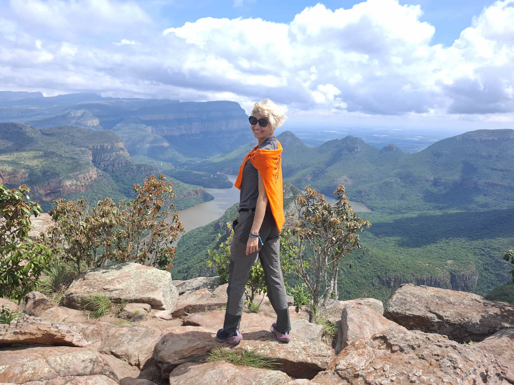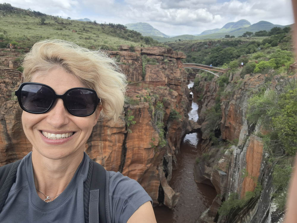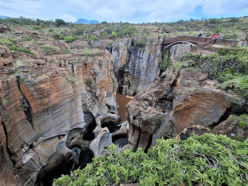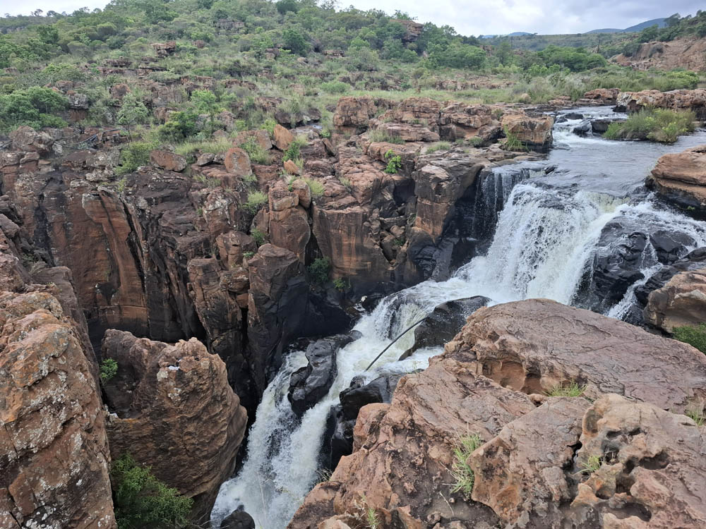 Zaczęliśmy od odwiedzenia wodospadu Berlin Falls. Nazwano go tak na cześć niemieckich osadników, poszukiwaczy złota. Później był przepiękny punkt widokowy Three Rondavels. Zielony kanion Blyde River i sama wijąca się niczym wstążka rzeka wzbudziły wiele zachwytów. Oczy i achy kontynuowaliśmy przy Burke’s Luck Potoles. Ironiczna nazwa „szczęśliwe dziury Burke’a” odnosi się do pechowego poszukiwacza złota, który w okolicy spędził całe życie na szukaniu kruszcu, bez skutku. Jak na ironię niedługo po jego śmierci w okolicy znaleziono złoto i to w dużych ilościach. Łączące się tu dwie rzeki oraz osad i kamienie, które nanosi woda, bajecznie wyrzeźbiły kanion.