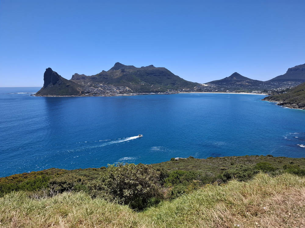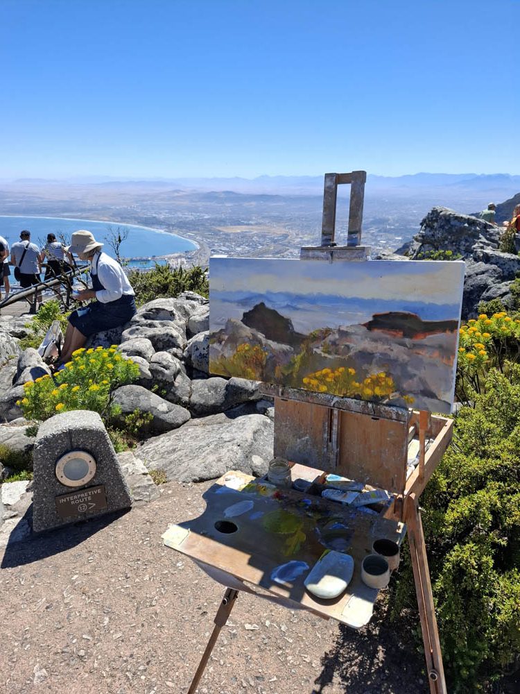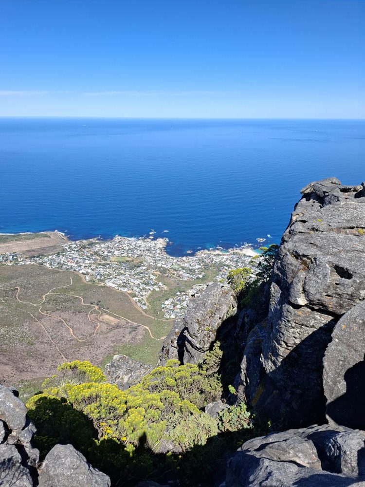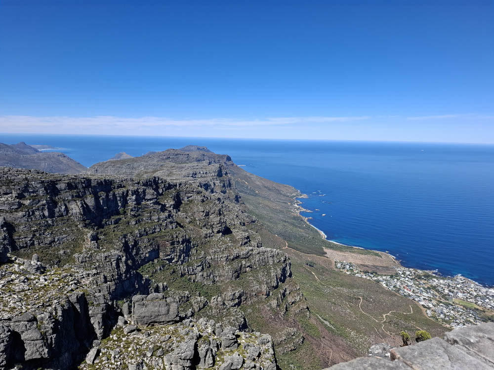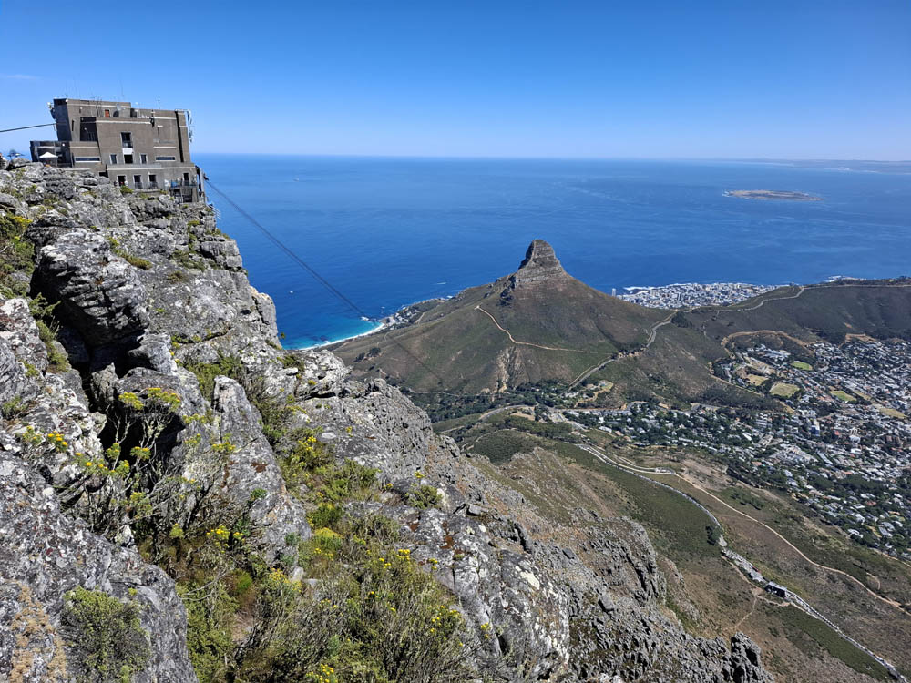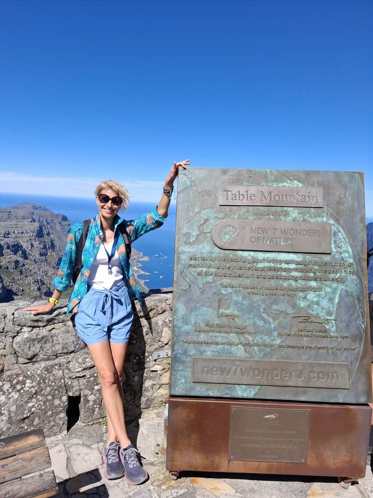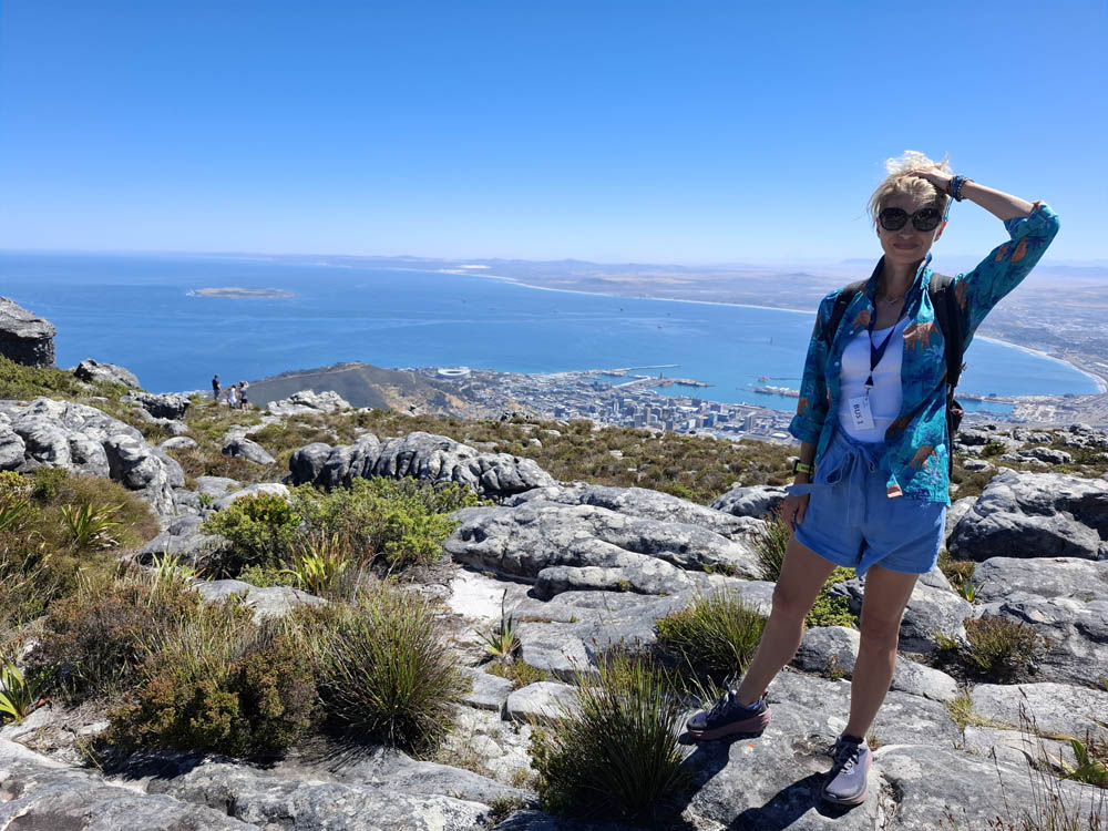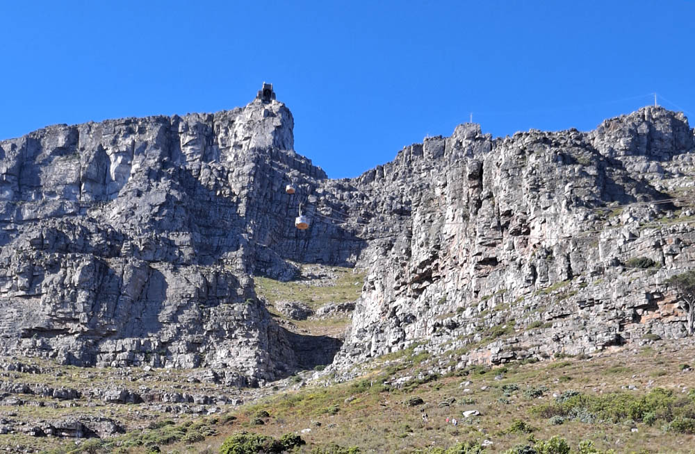 Ostatni etap naszej podróży to Kapsztad. Zwiedzanie jego okolic jest uzależnione od pogody. Przy silnych wiatrach nie kursuje kolejka na Górę Stołową, a droga wzdłuż wybrzeża też bywa zamykana. My mamy szczęście do dobrej aury. Rano piękne słońce, wiatr nieduży. W pierwszej kolejności pojechaliśmy więc zaliczyć największą atrakcję miasta – wjazd kolejką linową na Table Mountain. Na parkingu byliśmy kilka minut po ósmej rano. W ostatnich dniach wagoniki nie kursowały więc dziś do wejścia ustawiło się wielu chętnych. Mimo wczesnej pory panował duży upał. Miejsce, gdzie stali turyści było zadaszone, a z rozprowadzonych nad naszymi głowami wężyków padała chłodząca mgiełka. Po godzinnym staniu w końcu wjechaliśmy na górę. Obeszliśmy jej płaski szczyt, podziwiając panoramiczne widoki. Gdy zjeżdżaliśmy zauważyliśmy na zboczu góry pożar. To bardzo niebezpieczne, przy silnym wietrze w krótkim czasie potrafi płonąć cała góra. Zanim zjechaliśmy przybyły już wozy strażackie.