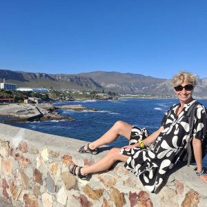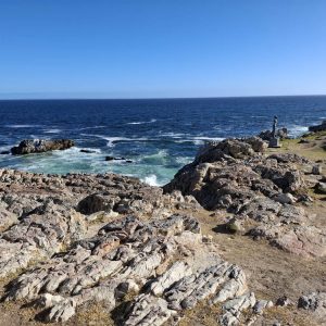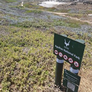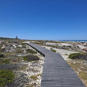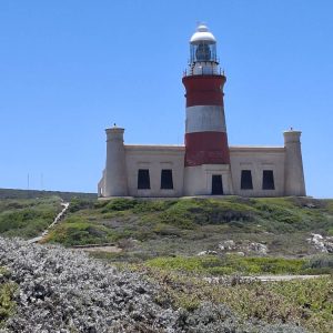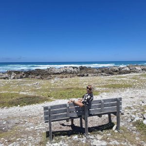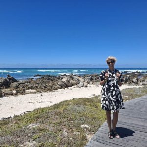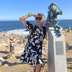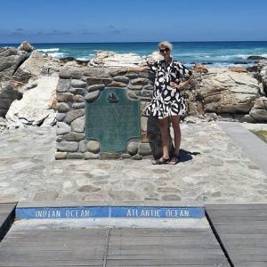 Nasza podróż ponownie skierowała się na wybrzeże. Tym razem pojechaliśmy zobaczyć Cape Agulhas, inaczej Przylądek Igielny. Jest to najdalej na południe wysunięty skrawek Afryki. Zatrzymaliśmy się przy starej latarni morskiej i po drewnianych podestach poszliśmy na spacer wzdłuż wybrzeża. Kolory są tu obłędne. Piękny błękit nieba, szmaragdowo turkusowe wody oceanu, przesuszona słońcem zieleń traw i sukulentów. Doszliśmy do symbolicznej makiety Afryki i przecinającej jej stalowej blachy w miejscu południowego krańca kontynentu. Powierzchnia podłoża odzwierciedlała mapę Afryki, wyrównaną z kompasem, tworząc falującą powierzchnię, po której można było chodzić. Były na niej zaznaczone najwyższe szczyty Afryki. Stanęłam jedną nogą na wierzchołku Kilimandżaro.