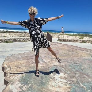 Nasza podróż ponownie skierowała się na wybrzeże. Tym razem pojechaliśmy zobaczyć Cape Agulhas, inaczej Przylądek Igielny. Jest to najdalej na południe wysunięty skrawek Afryki. Zatrzymaliśmy się przy starej latarni morskiej i po drewnianych podestach poszliśmy na spacer wzdłuż wybrzeża. Kolory są tu obłędne. Piękny błękit nieba, szmaragdowo turkusowe wody oceanu, przesuszona słońcem zieleń traw i sukulentów. Doszliśmy do symbolicznej makiety Afryki i przecinającej jej stalowej blachy w miejscu południowego krańca kontynentu. Powierzchnia podłoża odzwierciedlała mapę Afryki, wyrównaną z kompasem, tworząc falującą powierzchnię, po której można było chodzić. Były na niej zaznaczone najwyższe szczyty Afryki. Stanęłam jedną nogą na wierzchołku Kilimandżaro.