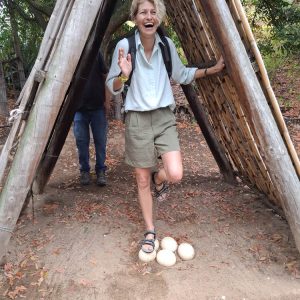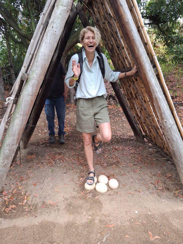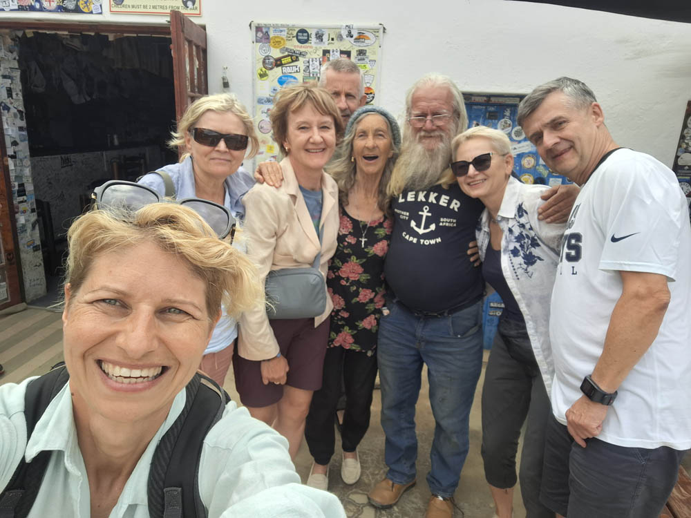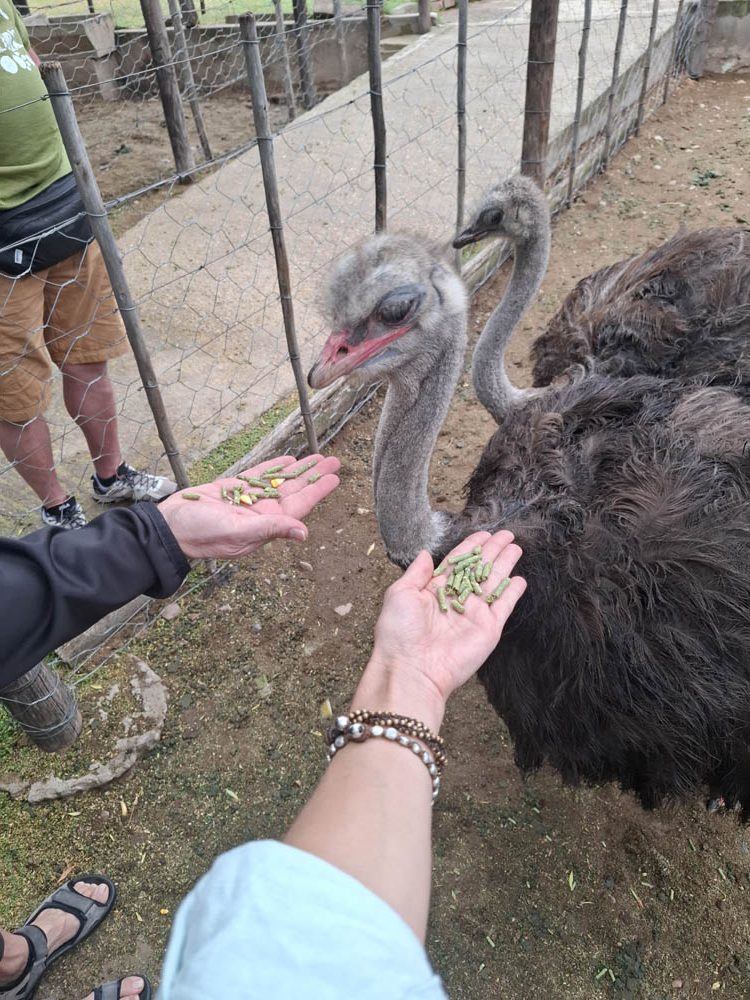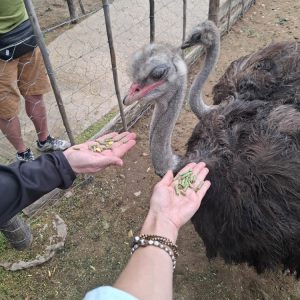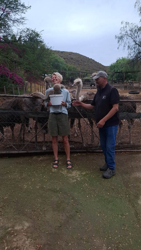 Kolejnego dnia pojechaliśmy na pokazową farmę strusi. Mieliśmy świetnego przewodnika, który nas po niej oprowadził opowiadając o życiu tych zwierząt i ich hodowli. Półpustynny rejon Małego Karoo, w którym przebywaliśmy obfituje w farmy strusi. Hoduje się je tu dla mięsa, skóry, piór. Dawniej kilogram piór strusia stanowił równowartość kilograma złota. Pióra są towarem eksportowym, służą do ozdób, między innymi nadal są wykorzystywane w produkcji strojów na karnawał w Brazylii. Skóra strusia jest podobno jedną z najbardziej wytrzymałych, po skórze kangura. Sprawdzę, bo kupiłam sobie pasek. Zaliczyliśmy spacer po farmie i masaż szyi wykonany przez te wielkie ptaki. Było bardzo wesoło.