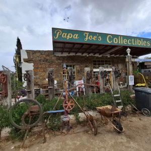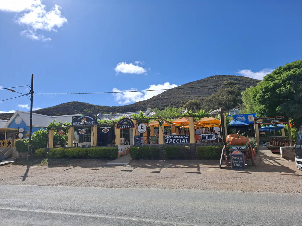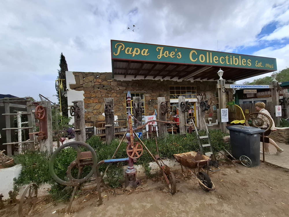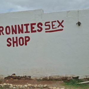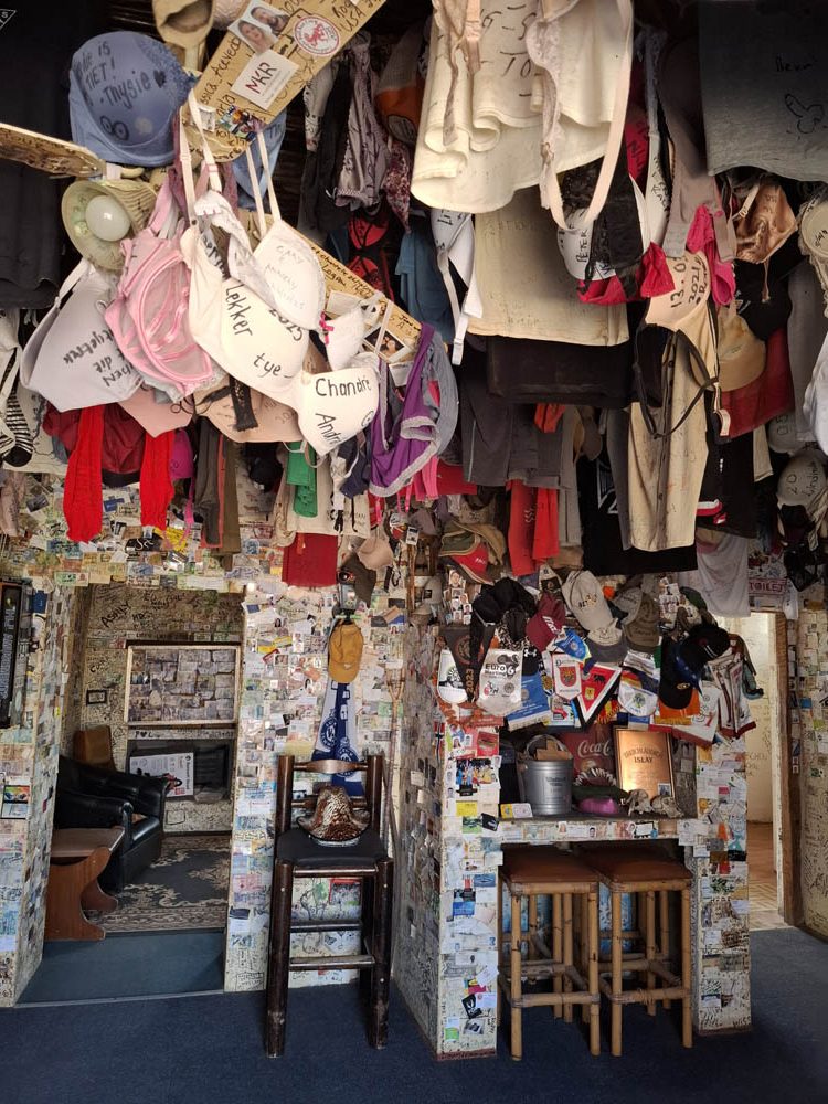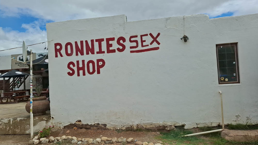 Później ruszyliśmy piękną trasą Route 62, porównywaną do amerykańskiej Route 66. Droga prosta jak z bicza strzelił. Zatrzymaliśmy się w kultowym przydrożnym barze – Ronnies SexShop. Dawniej był tu sklep. Ktoś dla żartu dodał dopisek „sex” i tak miejsce zaczęło przyciągać masy turystów. Odwiedzający zaczęli zostawiać fanty, ubrania, banknoty, naklejać naklejki, zostawiać napisy na ścianach. Po niemal 30 latach miejsce stanowi niezły zbiór gadżetów. Wszustkie one zostawione były przez przejezdnych. My też nakleiliśmy naklejkę „kiribati” i dodatkowo zostawiłam firmową koszulkę z logo.
