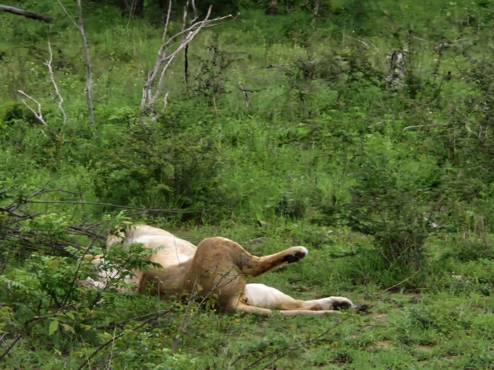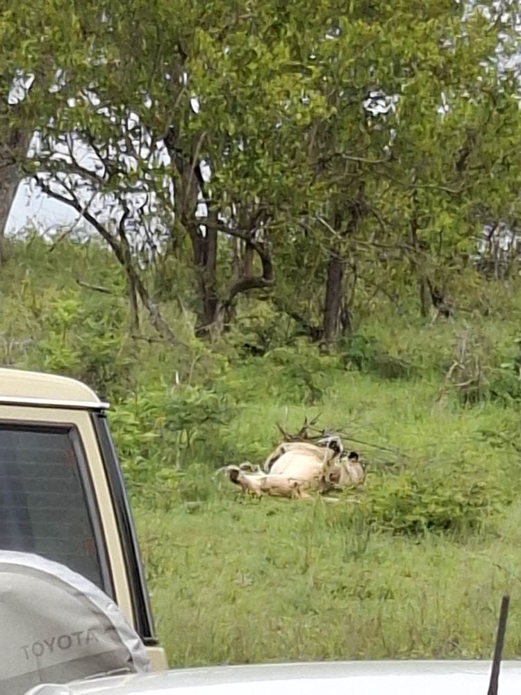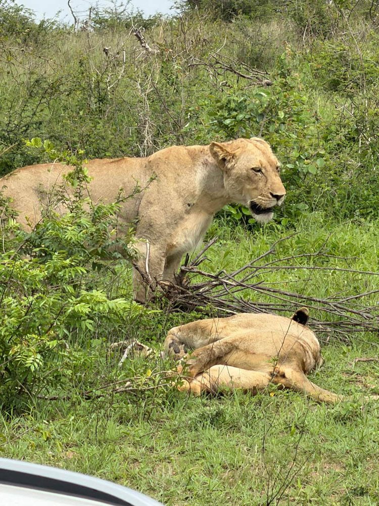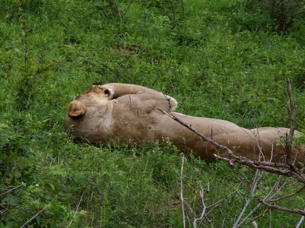 Było też stado czterech lwic. Leżały niemal przy drodze, brzuchem do góry. Spały, strzygąc uszami. Czasem któraś leniwie podnosiła łeb i rzucała nam leniwe spojrzenie. Staliśmy przy nich dość długo. Kiedy słońce zaczęło mocniej grzać i wtedy przeniosły się w cień drzew. Były piękne.