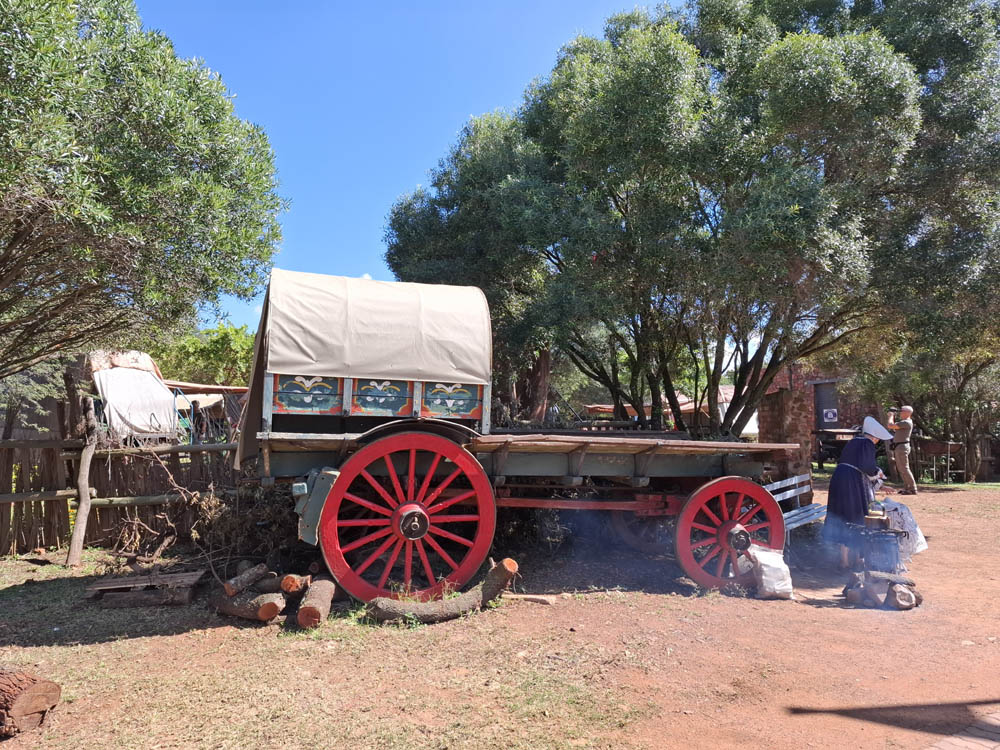 Zaparkowaliśmy naszego busa i najpierw przeszliśmy po małym ogrodzie. Przy wejściu pani ubrana w tradycyjny burski strój z tamtej epoki częstowała burską kawą. Pośród drzew ustawione były wozy, którymi Burowie w latach 30tych XIX wieku wyruszyli całymi rodzinami ze swoich pierwotnie zajmowanych ziem (okolice dzisiejszego Kapsztadu) na północny wschód. Do wędrówki zmusiły ich rządy i prawo ustanowione przez Brytyjczyków, którzy przejęli władzę nad kolonią po 1820 roku. Burowie wyruszyli na poszukiwanie nowych terenów, na których mogliby założyć swoje farmy i żyć wg własnych zasad. W swej wędrówce natrafili na rdzenne plemiona Zulusów, z którymi stoczyli bitwę ( byl to rewanż za wcześniejszą zasadzkę i zdradę, której dopuścili się Zulusi wobec nich). W wieczór poprzedzający bitwę, Burowie modlili się o wygraną, zawierzając jej wynik Bogu. Wygrali, bez ofiar, za to po stronie Zulusów śmierć poniosło kilka tysiecy wojowników… Pomnik został odsłonięty 111 lat po tej wygranej (w 1949 r, w czasach apartheidu). Dla jednych powód do radości i chwały, dla innych ( ludności czarnoskórej) symbol opresji i uciemiężenia.