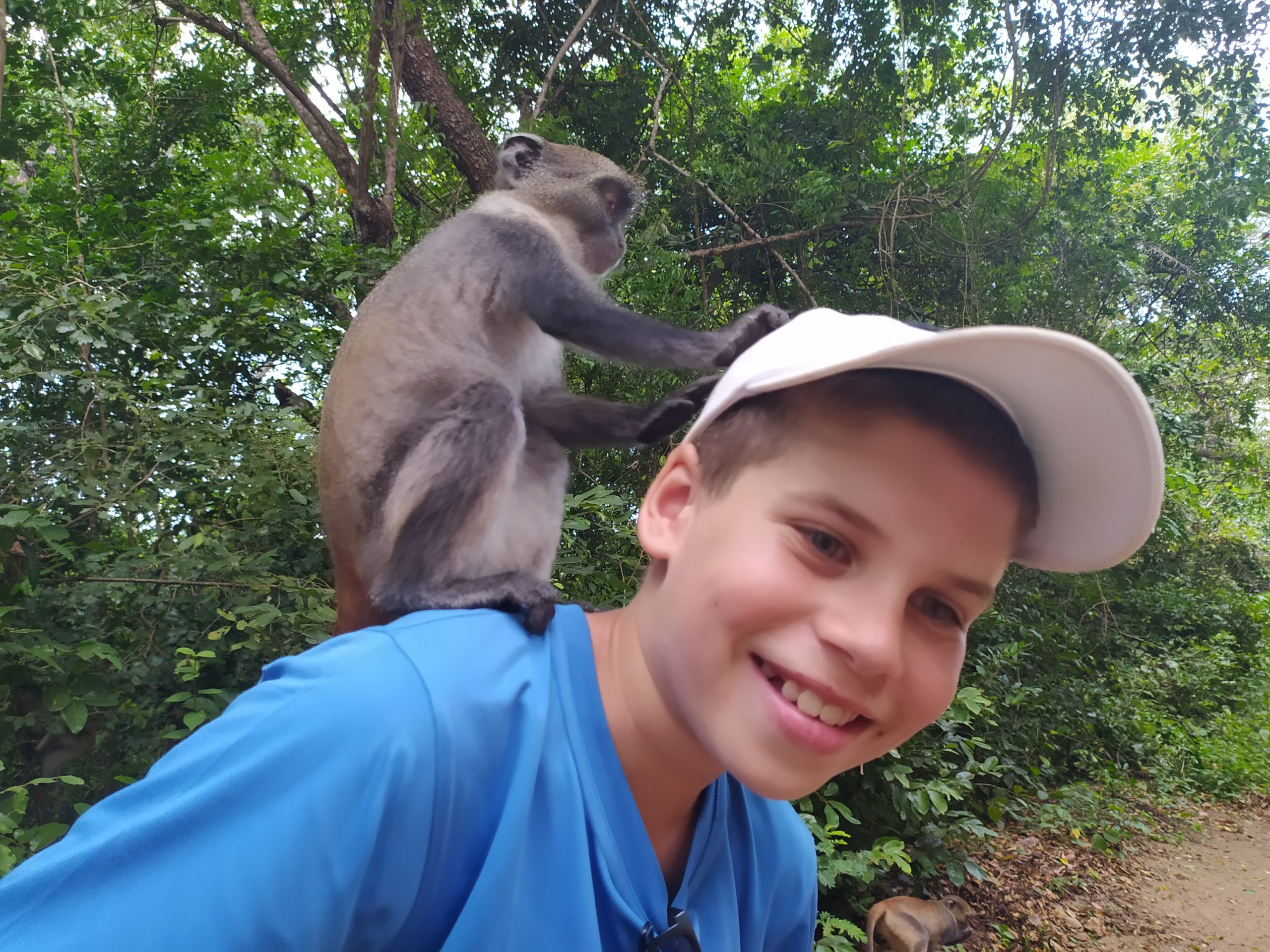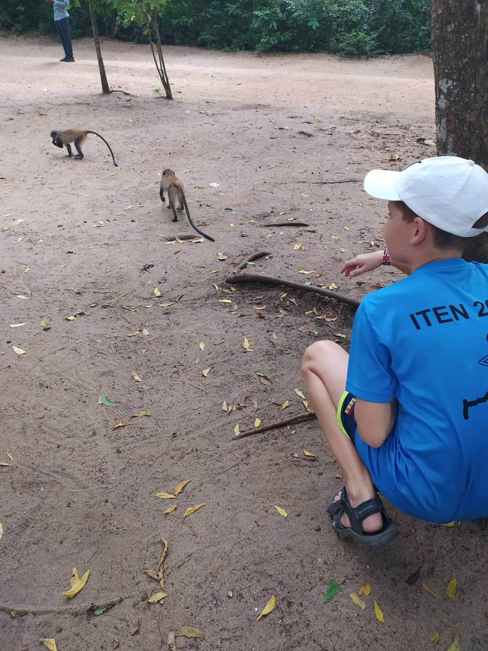 Ponieważ jazda na motorze jest szybsza, czekaliśmy jeszcze na miejscu na chłopaków kilka minut. Oni po drodze kupili banany dla małp. Te gromadnie czekały przy bramie wejściowej, rzucając się dosłownie na wchodzących turystów, którzy mieli w rękach owoce. Bez ogródek wskakiwały na plecy, ramiona, głowę, brały banana i zeskakiwały. Na yacoola wskoczył największy osobnik, nasz przewodnik powiedział, że to był boss tego stada.