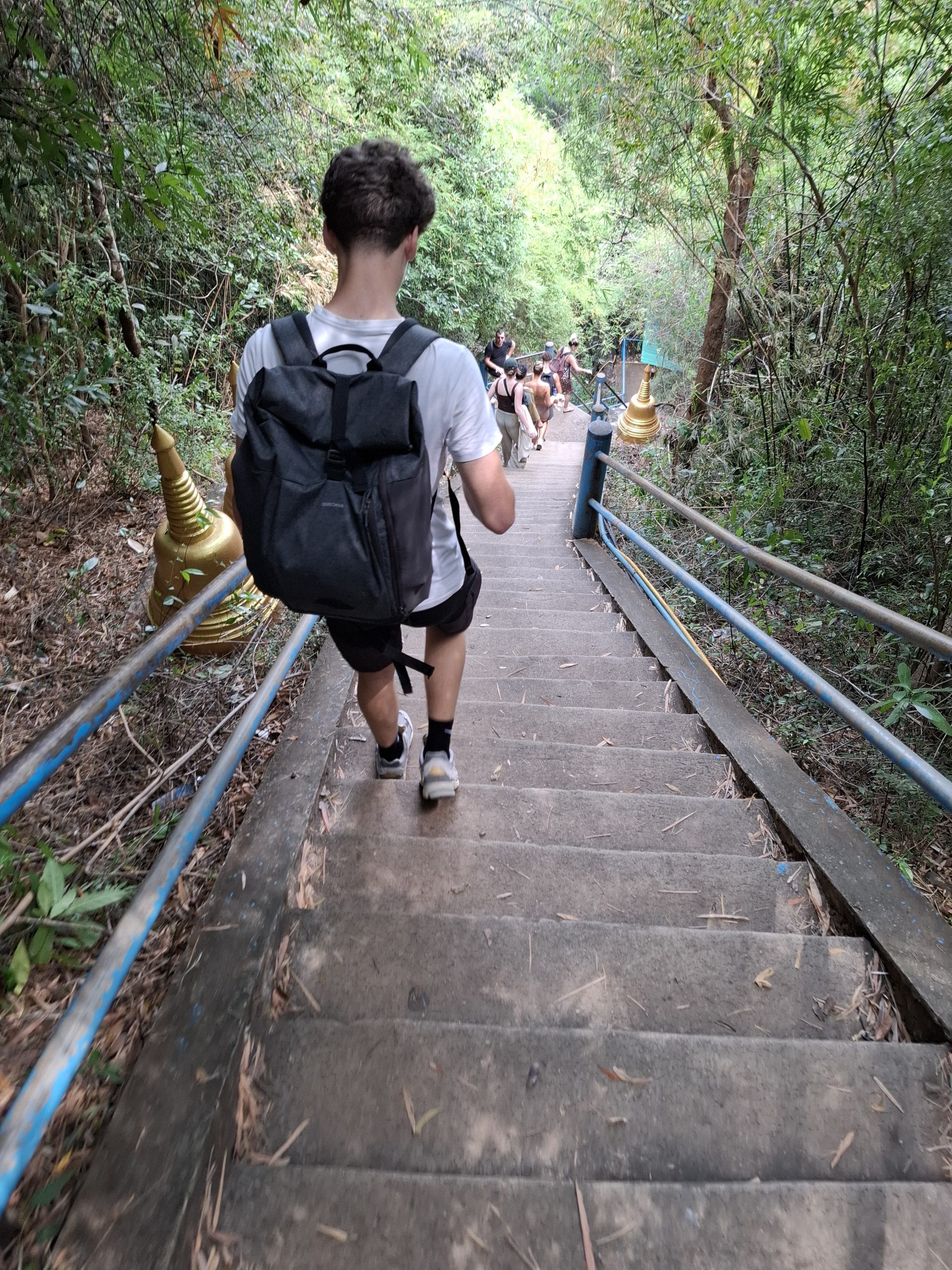 Początkowo stopnie były bardzo niskie, prawie płaskie. Potem miejscami były tak wysokie jak moja noga od stopy do kolana. Do tego bardzo strome. Tajowie są dużo niżsi niż my, więc im te stopnie to pewnie do połowy uda miejscami sięgały 😉 Fantastyczne, panoramiczne widoki ze szczytu na okolicę.