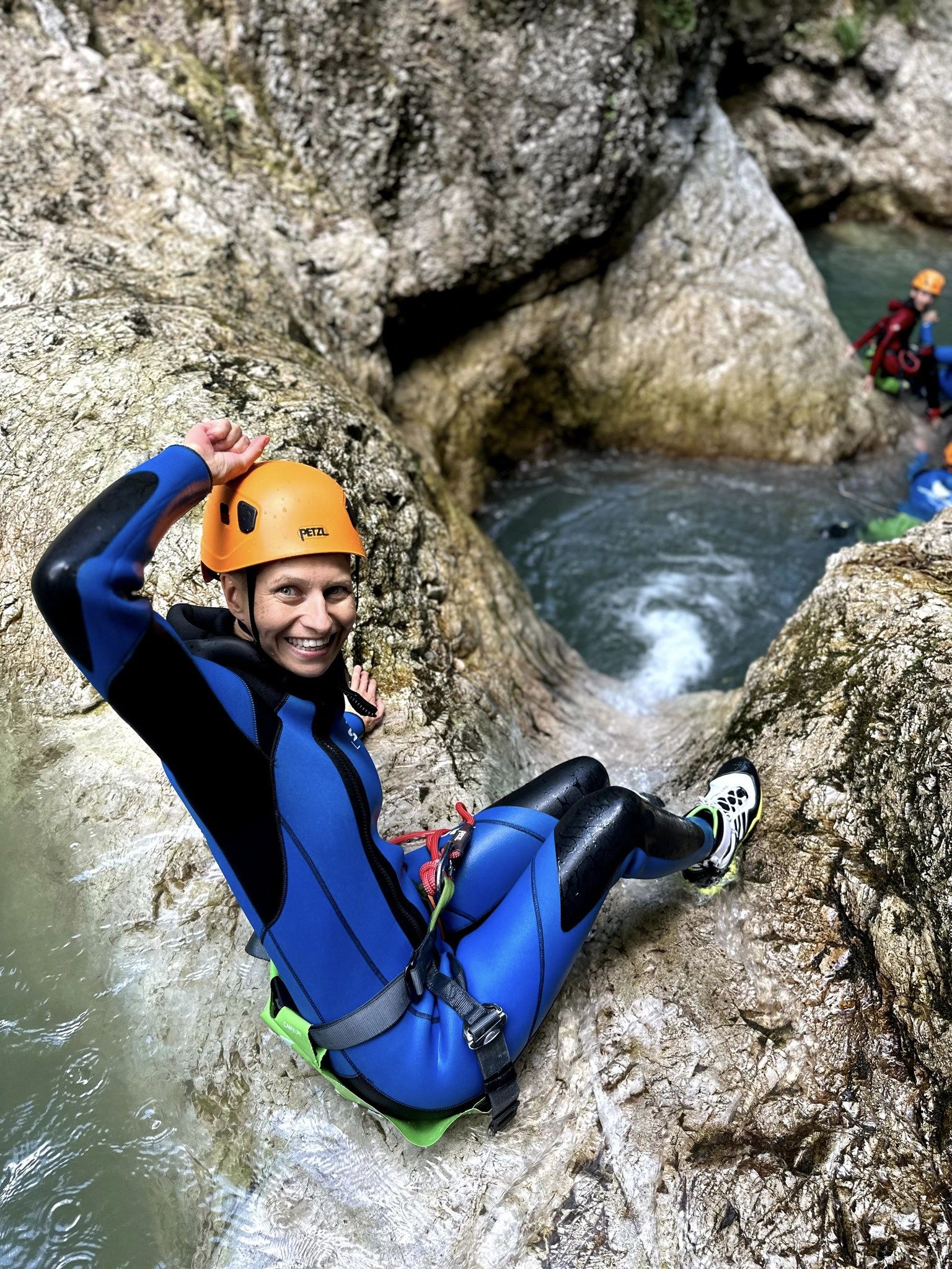 Ruszyliśmy vanem na miejsce startu. Stamtąd niosąc nasze pianki i resztę sprzętu na plecach maszerowaliśmy około 20-30 min pod górę. Była to niezła rozgrzewka, bo podejście było całkiem strome, a temperatura już grubo powyżej 20 st. W górze kanionu, ubraliśmy pianki, wszyscy już byliśmy tą akcją nieźle zziajani i upoceni 😉 Sara udzieliła nam krótkiego instruktażu z zasad bezpieczeństwa. Weszliśmy do wody i przy jej wskazówkach zaczęliśmy pokonywać kolejne przeszkody. Czasem trzeba było ześlizgnąć się po skale do naturalnego basenu, czasem do niego zeskoczyć, a czasem Sara opuszczała nas tam po linie. Był też fragment przypominający chodzenie po ferratach, gdzie przypinaliśmy się karabińczykami do stalowych lin. Naprawdę było sporo akcji. Trasę kończył kilkunastu metrowy wodospad. Z pierwszej jego części Sara opuszczała nas wzdłuż wody po linie i zjazd kończył się swobodnym opadnięciem ( z zaskoczenia) do wody z kilku metrów. Ostatni etap trzeba było pokonać skokiem do naturalnego basenu. Fantastyczna sprawa, choć ja przy skokach miałam stracha i w dwóch przypadkach skorzystałam z alternatywy, schodząc po skale przy użyciu liny i obchodząc uskok bokiem skały.