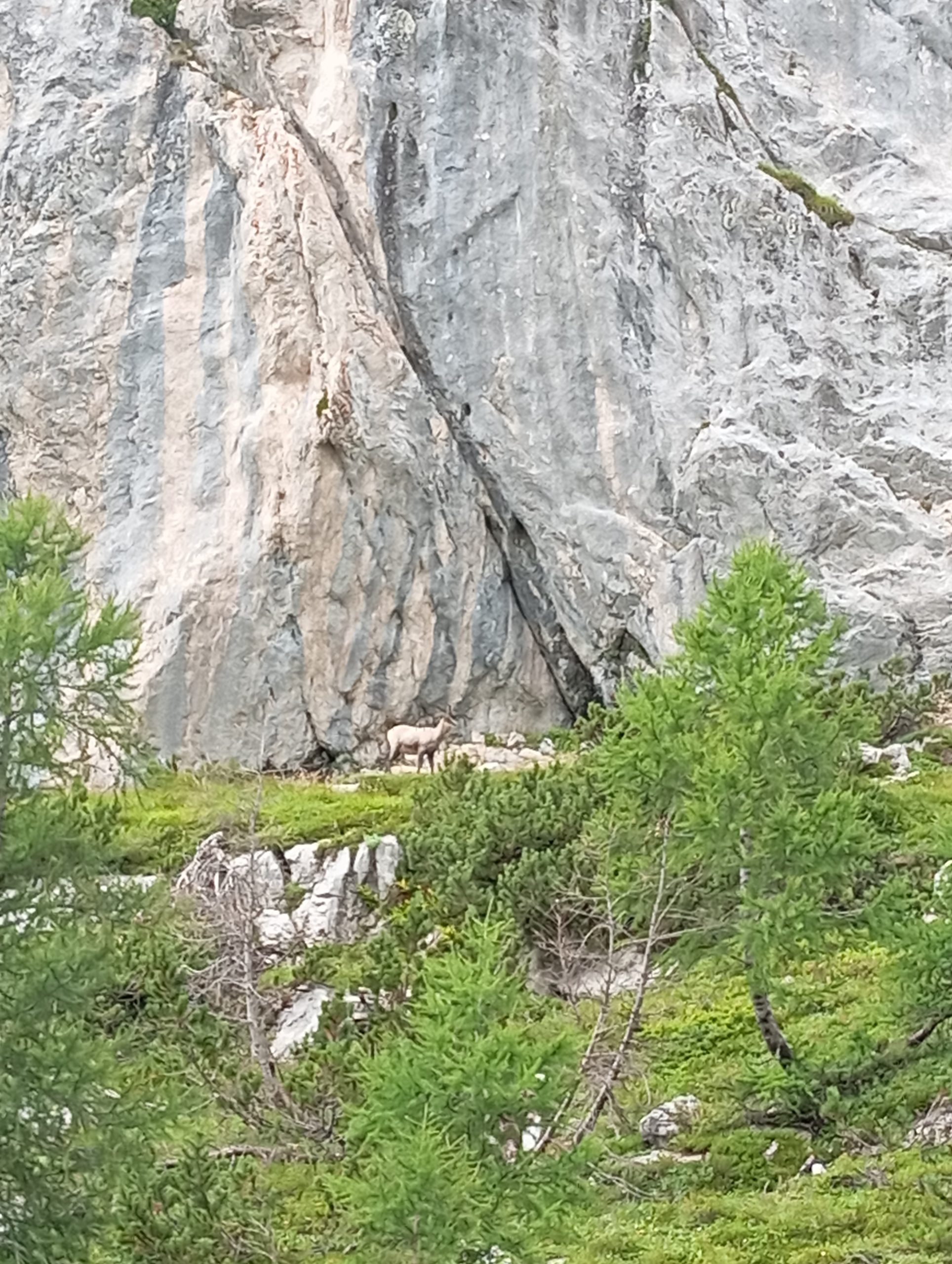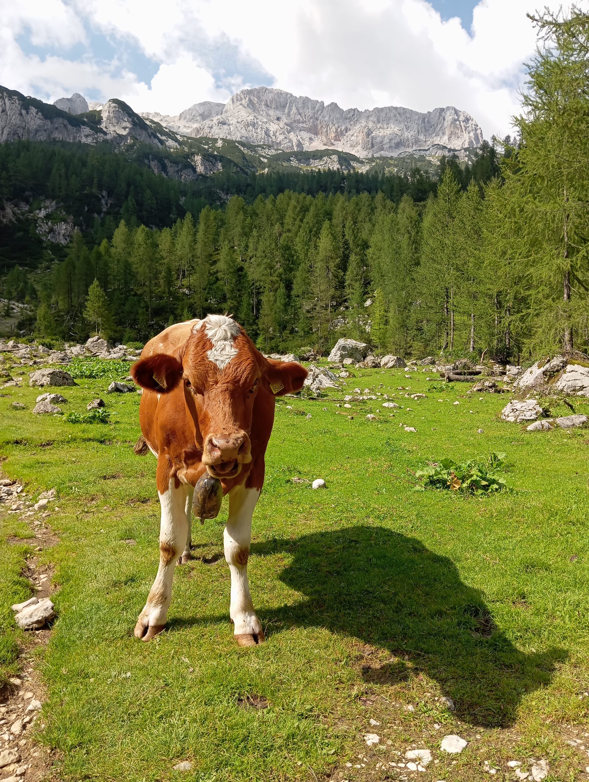 Po około godzinie jazdy dojechaliśmy do końca leśnej drogi. Na prowizorycznym leśnym parkingu było sporo aut. Czytałam wcześniej o kilku drogach na Triglav i ta od polany Krma była polecana jako mniej wymagająca, bez podejść ferratami. Pierwszy kilometr szliśmy przez las szutrową w miarę płaską ścieżką. Później szlak zaczął się piąć mocniej w górę. Droga była wysypana kamieniami, mniejszymi i większymi. Stopy dość głęboko w nich grzązły. Wrażenie jakby się szło plażą pod górę. Między drzewami widzieliśmy sarnę z młodym. Potem na grani skały kozicę. Na łące pasły się krowy z wielkimi dzwonkami u szyi, jak w reklamie Milki. Tylko świstaka brakowało 😉