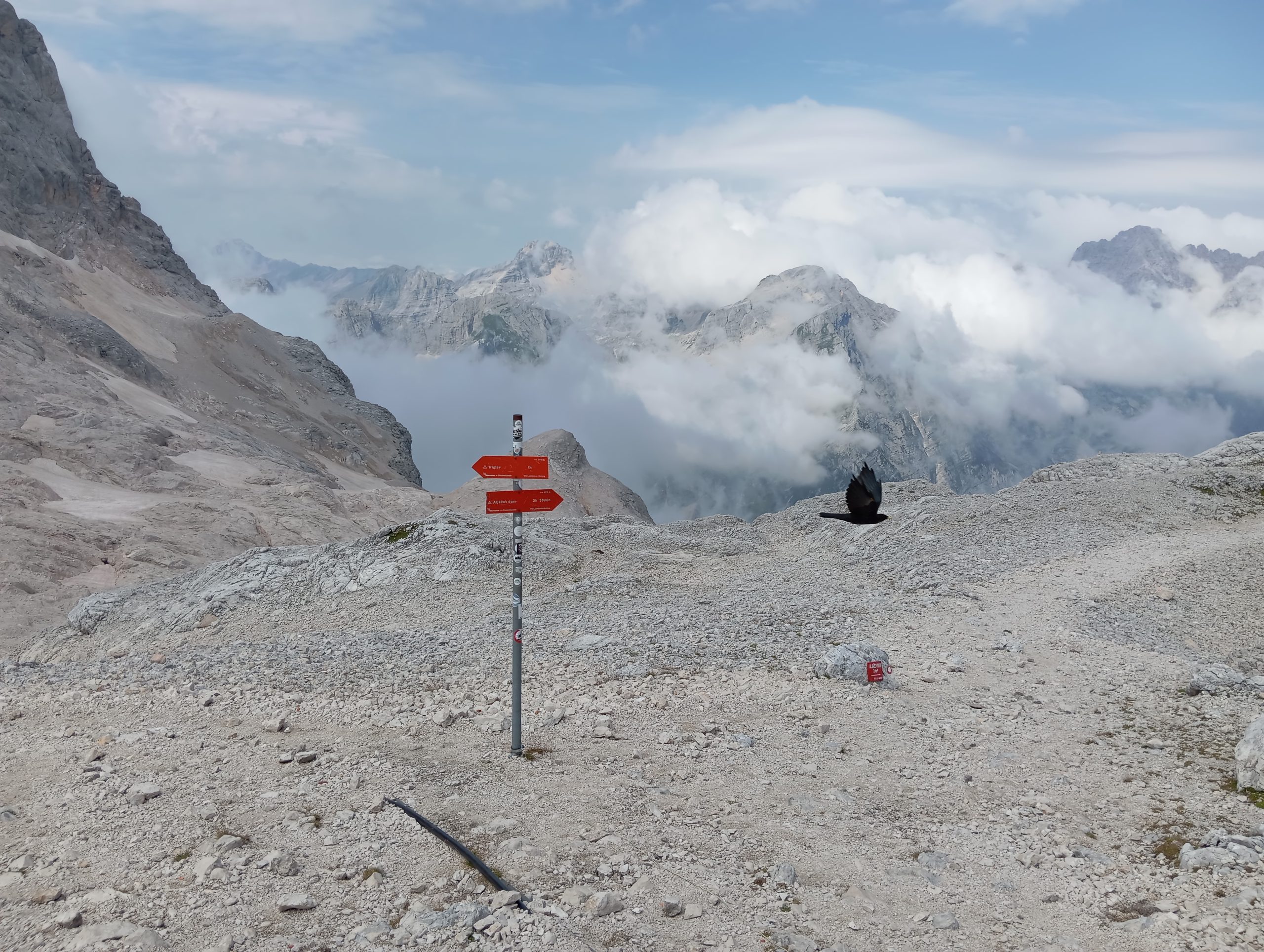 Im wyżej tym mniej roślinności. Początkowo szliśmy w chmurach, rozwiały się na wysokości ponad 2000 m. Czasem spotykaliśmy innych turystów, ale generalnie było pusto. Janek narzucił mocne tempo, nikt z idących nas nie wyprzedził ani pod górę, ani potem przy schodzeniu. Na około 2200 npm widzieliśmy już Triglav jak na dłoni. Robi wrażenie. Stanęliśmy na małym rozdrożu, gdzie drogowskaz pokazał, że do schroniska Triglavski Dom na Kredenicy zostało nam jeszcze 30 minut marszu. Kamyki usypywały się spod nóg, trzeba było uważać, by się nie poślizgnąć, zwłaszcza potem przy schodzeniu.