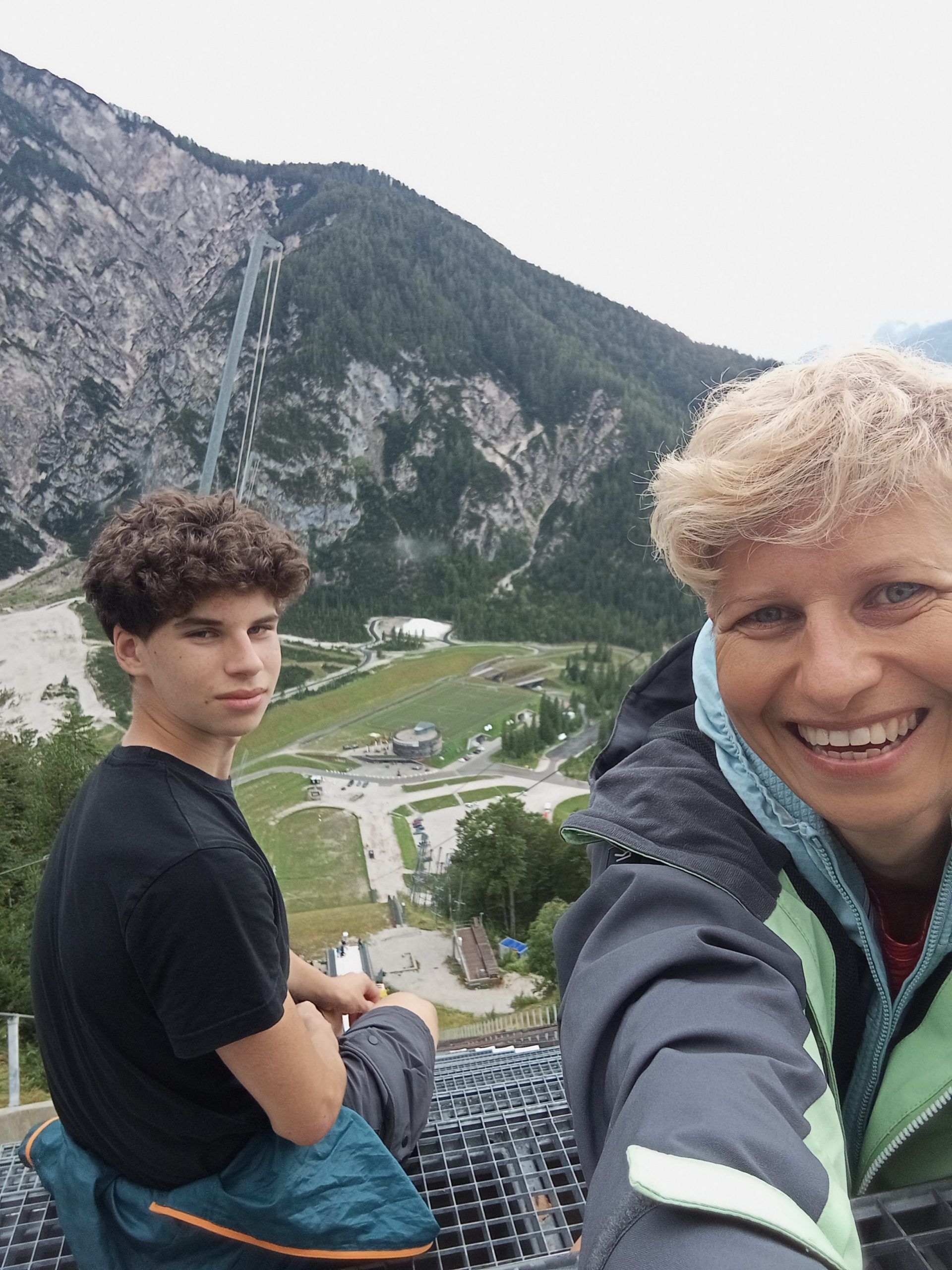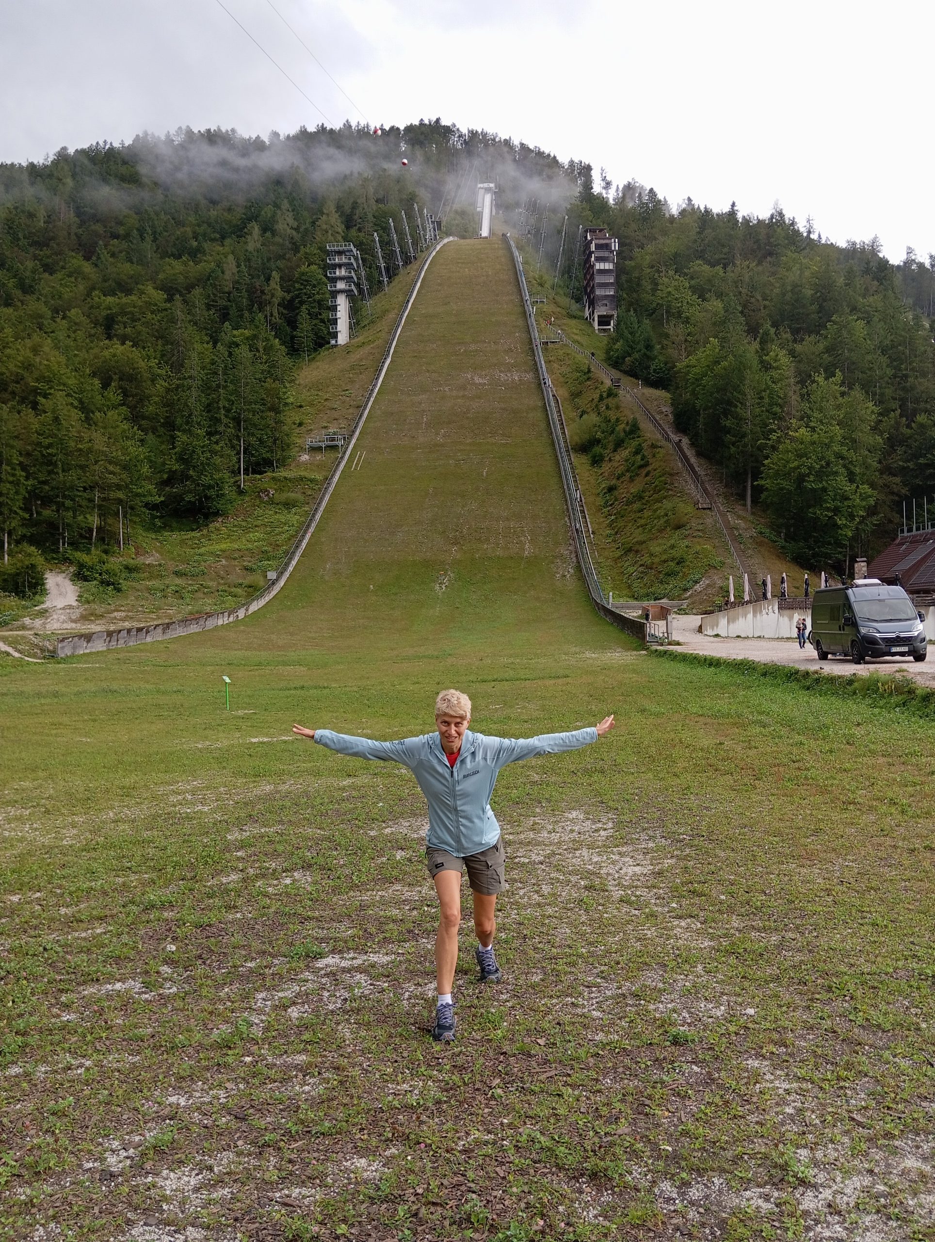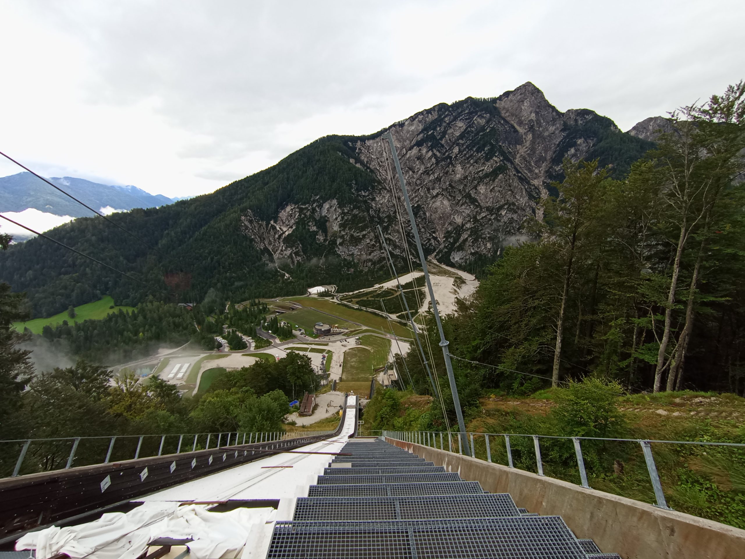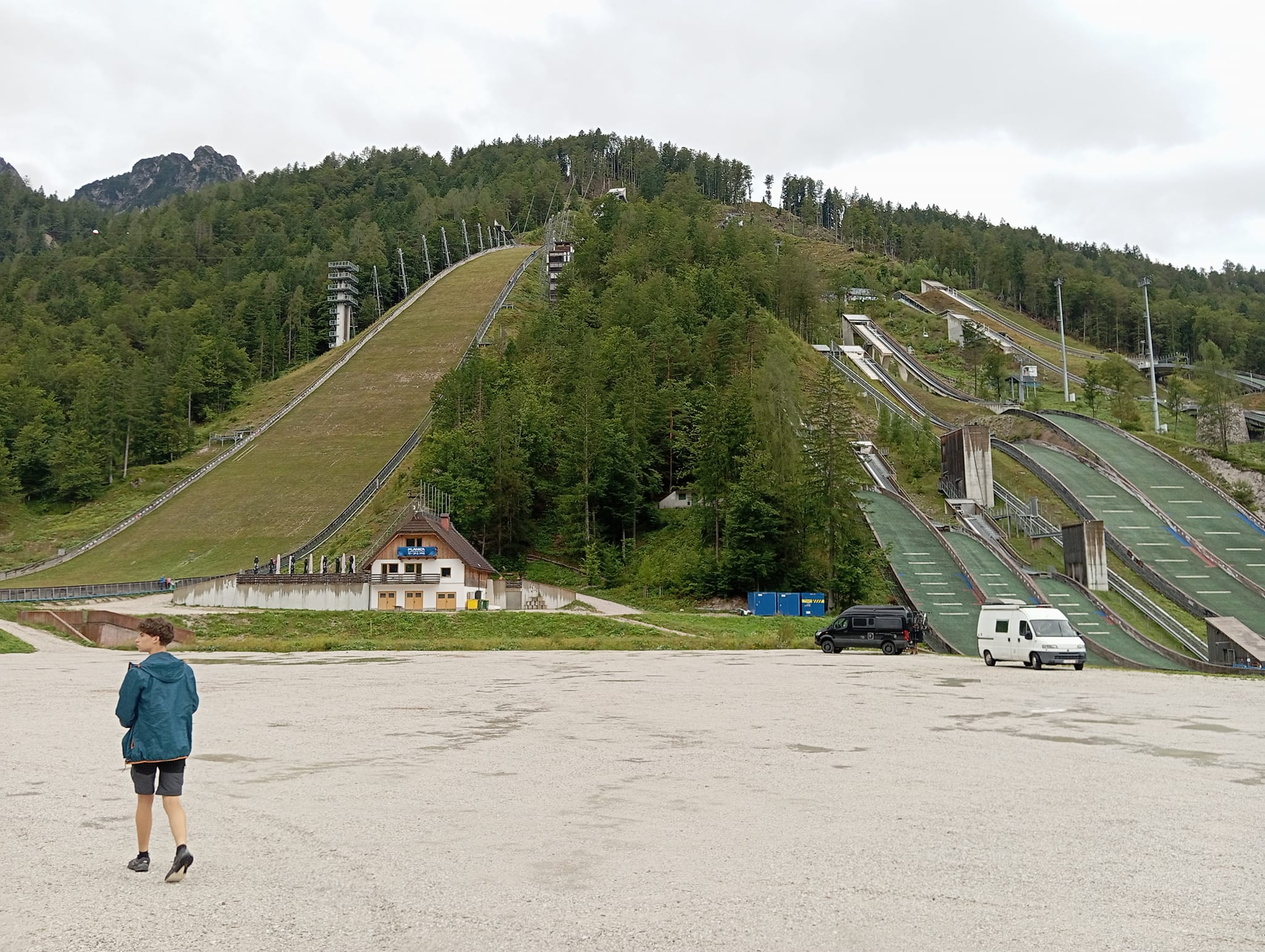 Dalej pojechaliśmy do Planicy, zobaczyć słynną skocznię, gdzie rozgrywane są zawody w lotach narciarskich. Obiekt składa się z wielu różnej wielkości skoczni, ale ta właściwa jest po prostu gigantyczna. Weszliśmy na jej szczyt, po metalowych schodkach, które w pewnym momencie prowadziły stromo w górę. Na szczycie spojrzeliśmy na pionowy rozbieg w dół. Szczerze podziwiam odwagę skoczków.