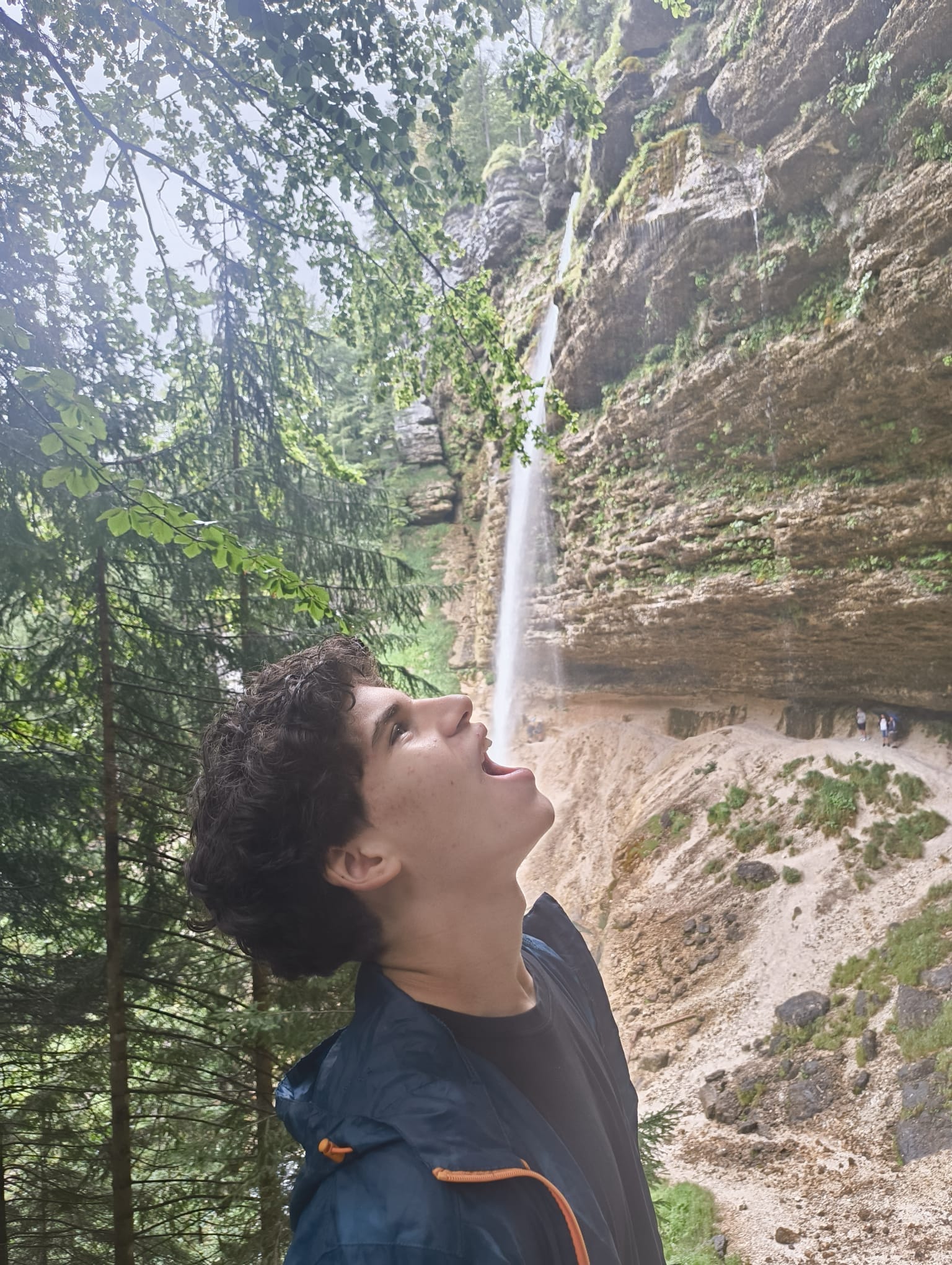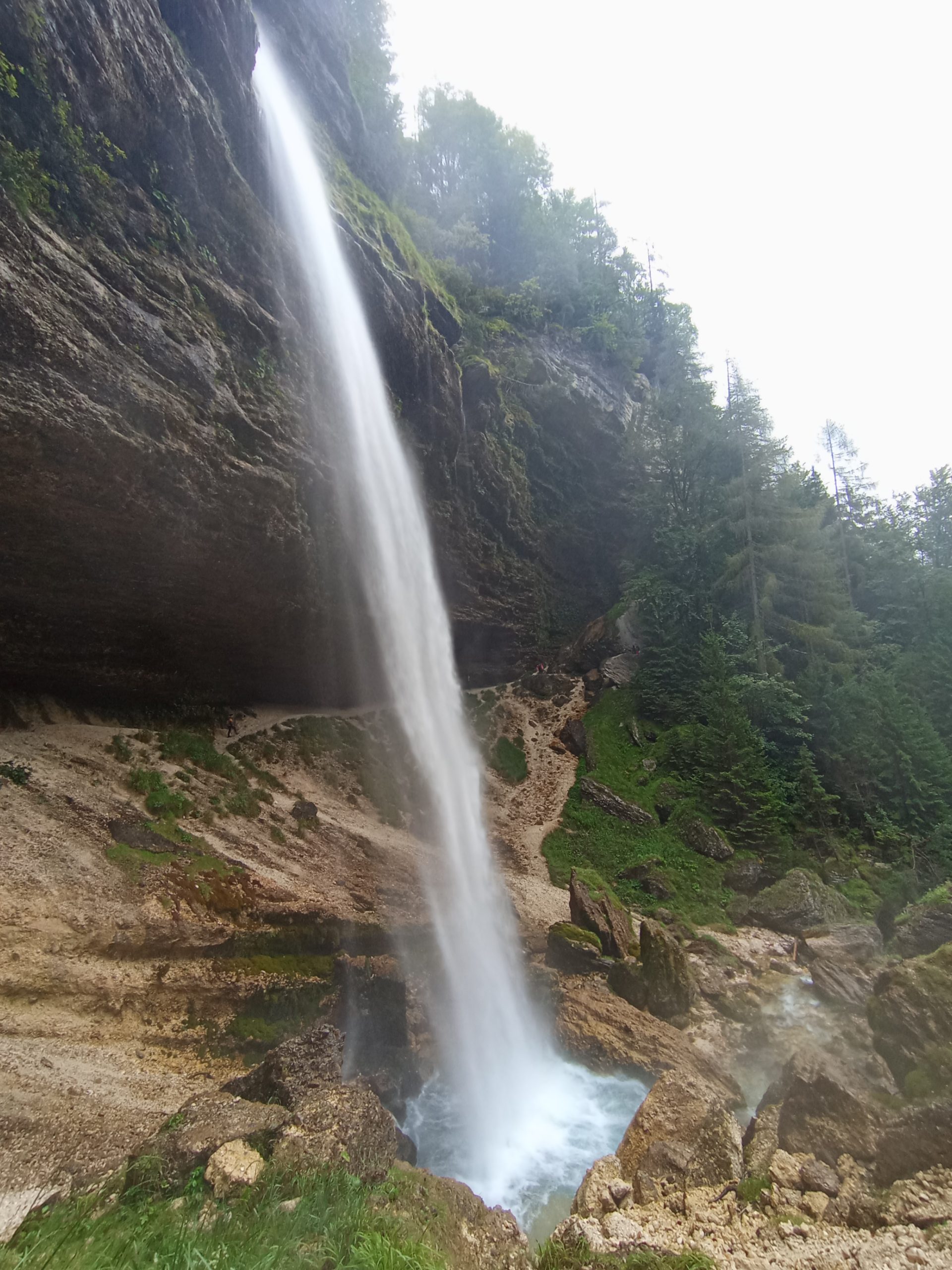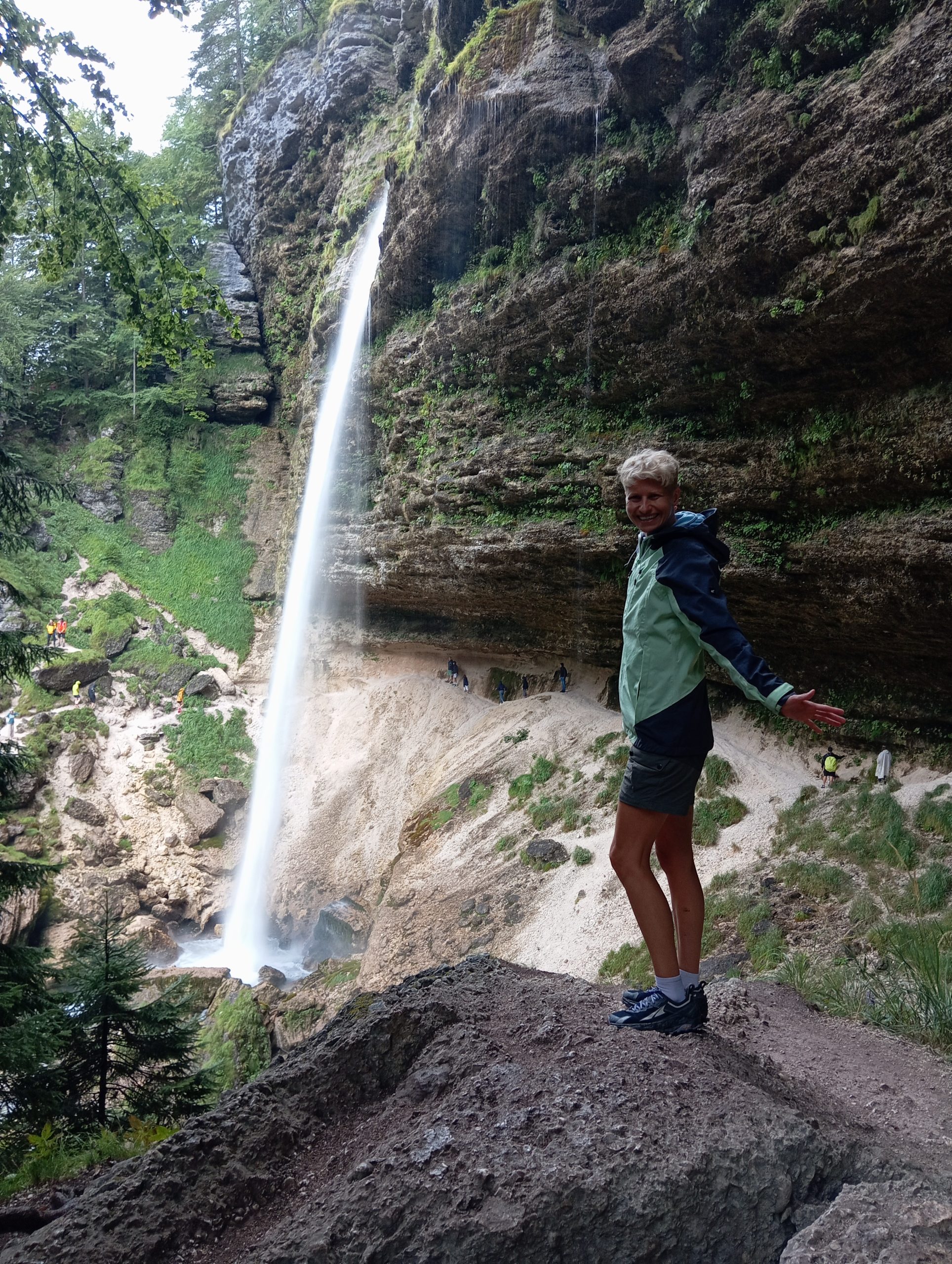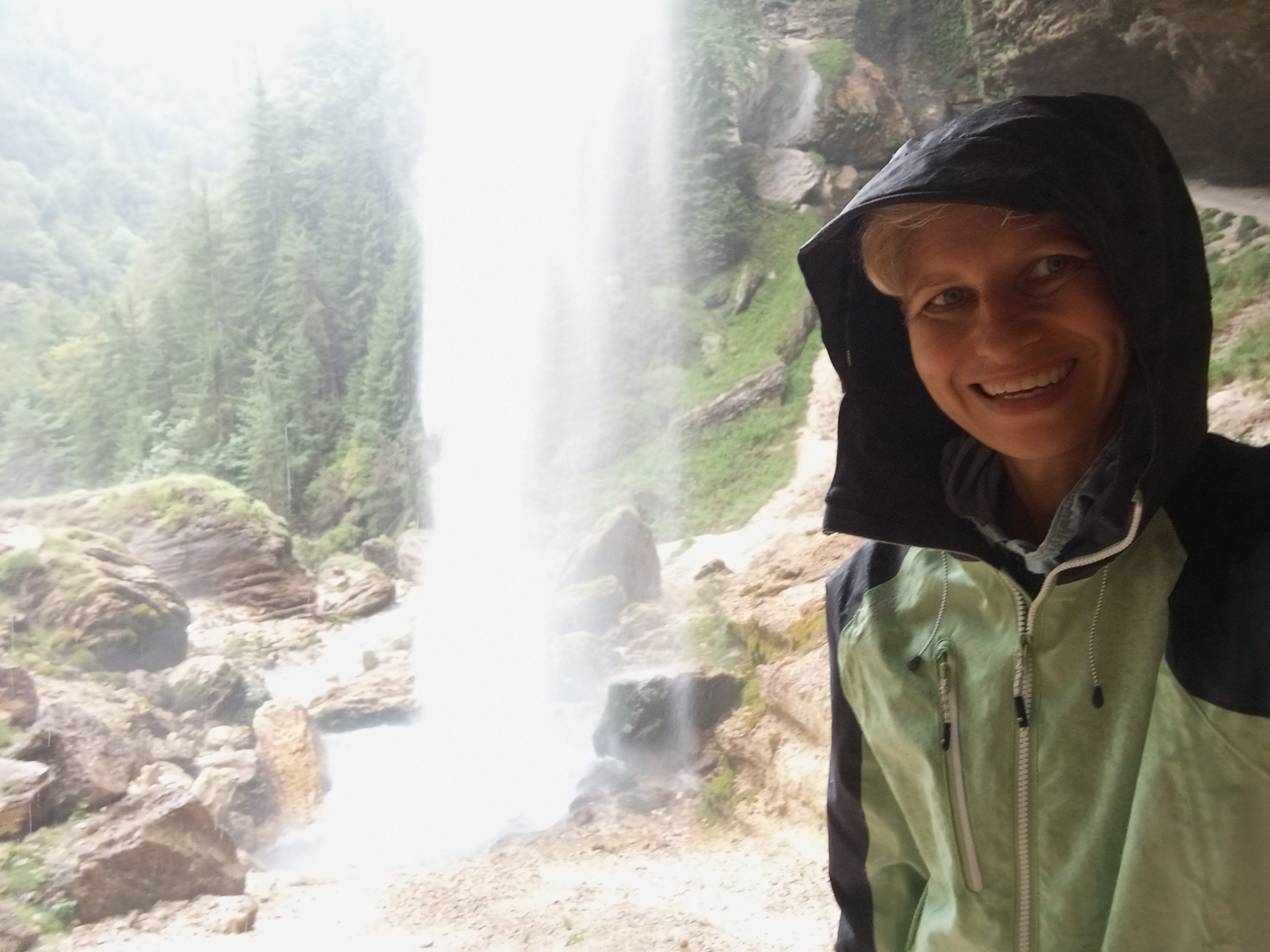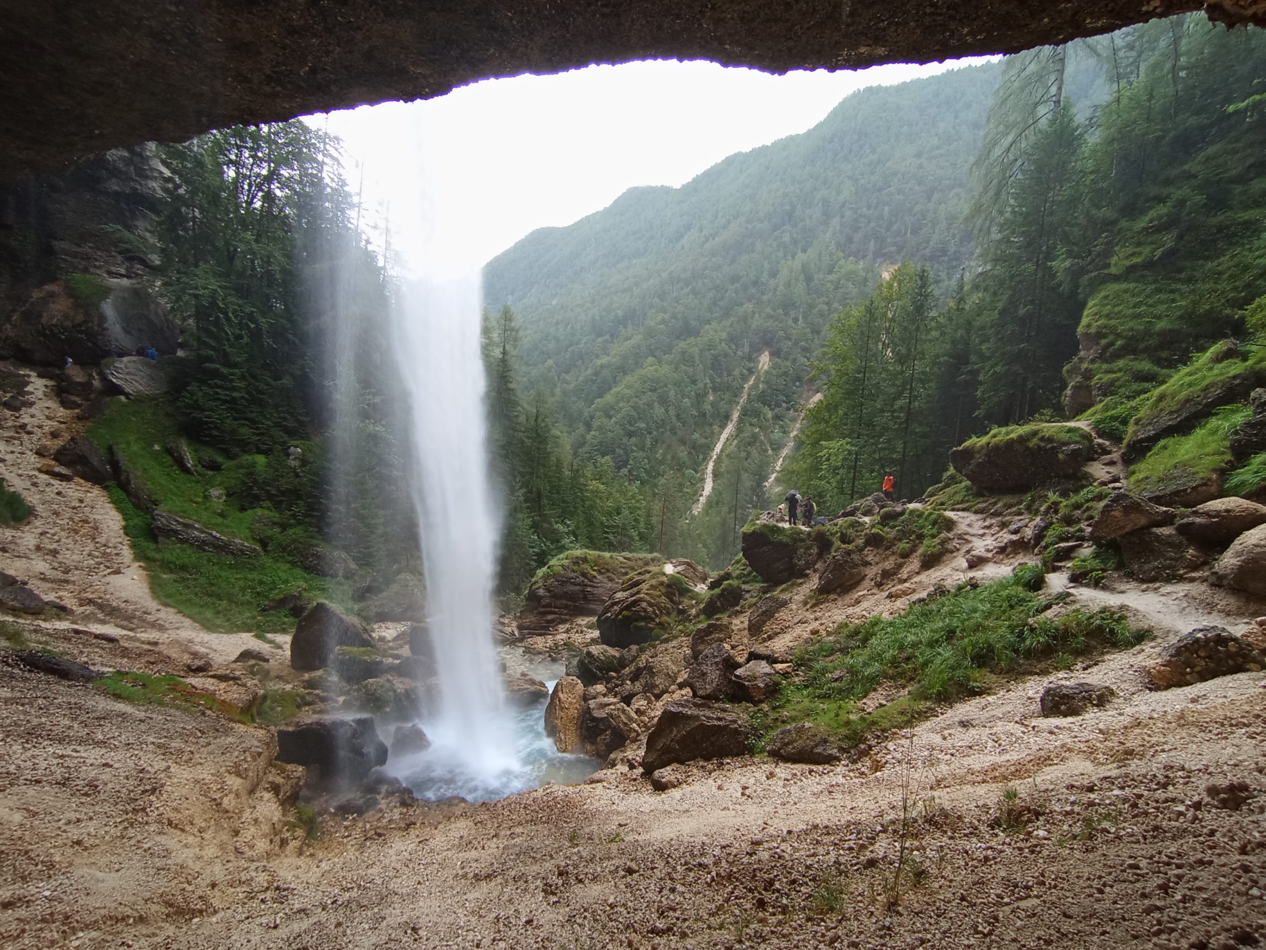 Zaparkowaliśmy w pobliżu wodospadu Pericnik. Krótki, około kilometrowy spacer pod górę i już przy nim byliśmy. Wrażenie super! Zwłaszcza, że za wodospadem jest wydrążona w skale wnęka, którą można obejść wodospad od tyłu. Popstrykaliśmy mnóstwo zdjęć i filmów i wróciliśmy do auta. I wtedy Janka przyjaciel wysłał mu zdjęcie, że też tu był i zrobił z ojcem sesję mniej oczywistą. Spodobał nam się ten pomysł. Rzuciłam hasło, to co idziemy tam drugi raz? I o dziwo zamiast sprzeciwu był entuzjazm. I weź tu zrozum nastolatka. Drugi raz Janek narzucił jeszcze szybsze tempo i pod wodospad prawie wbiegliśmy. Kolejne fotki i trucht w dół.