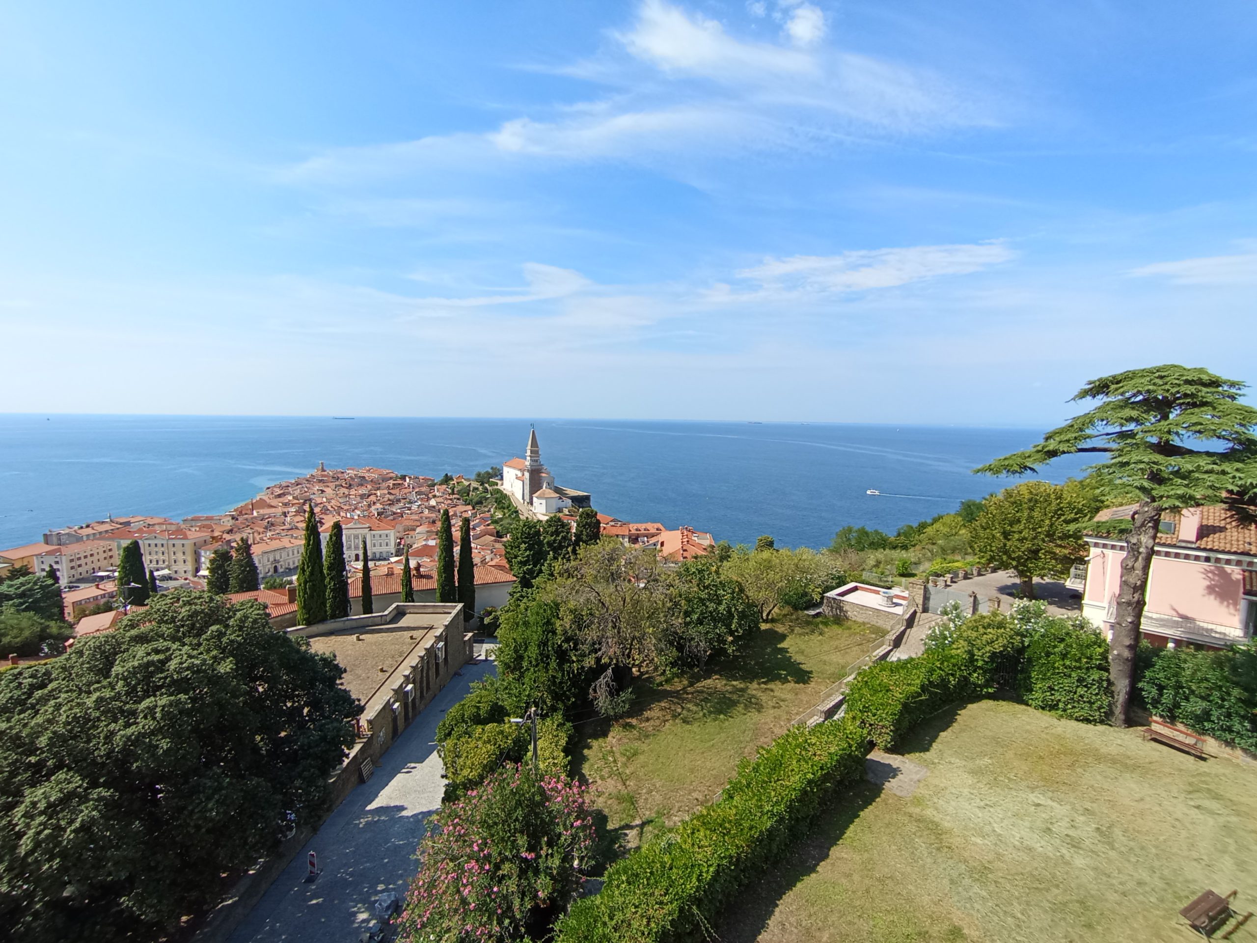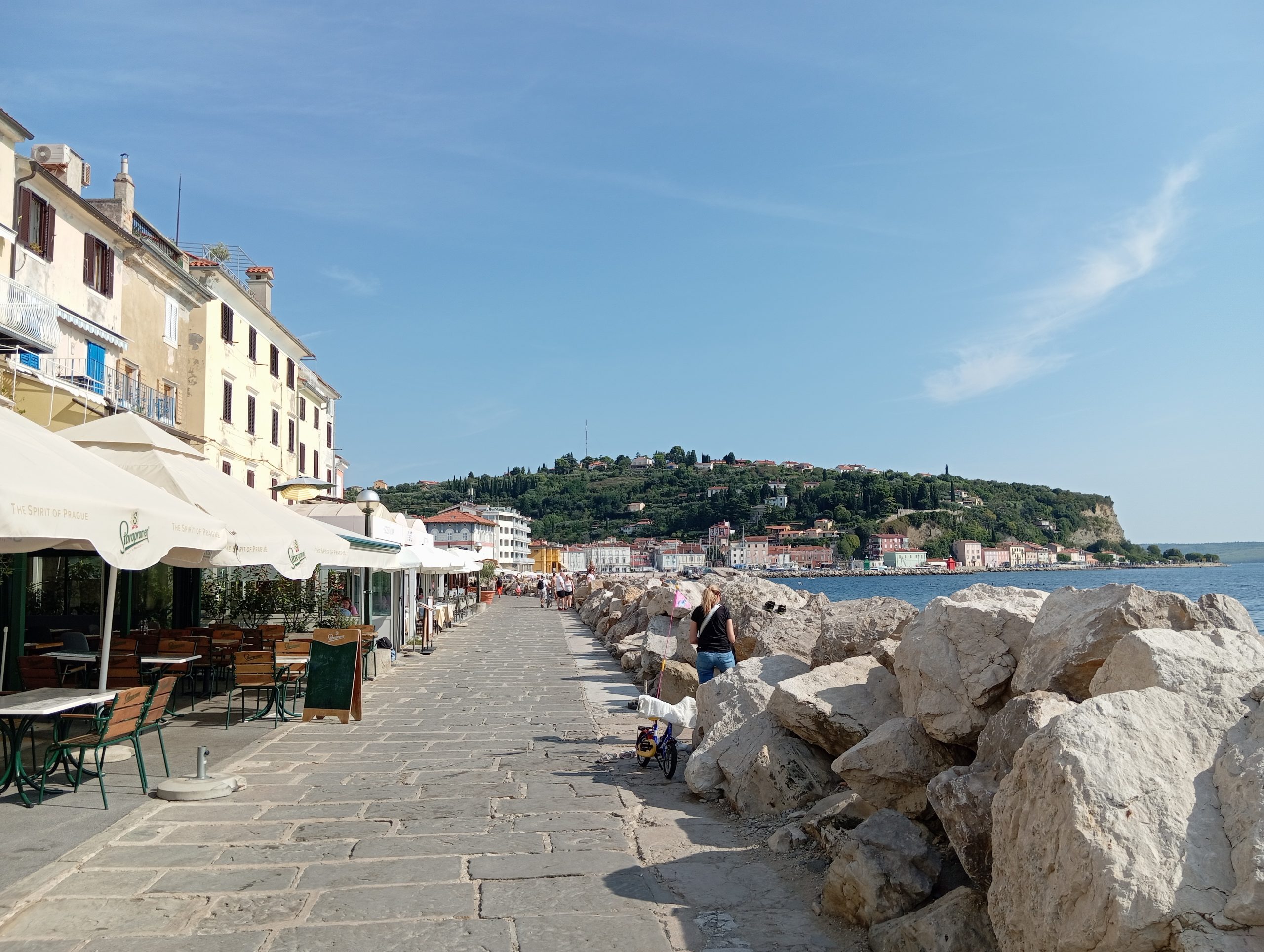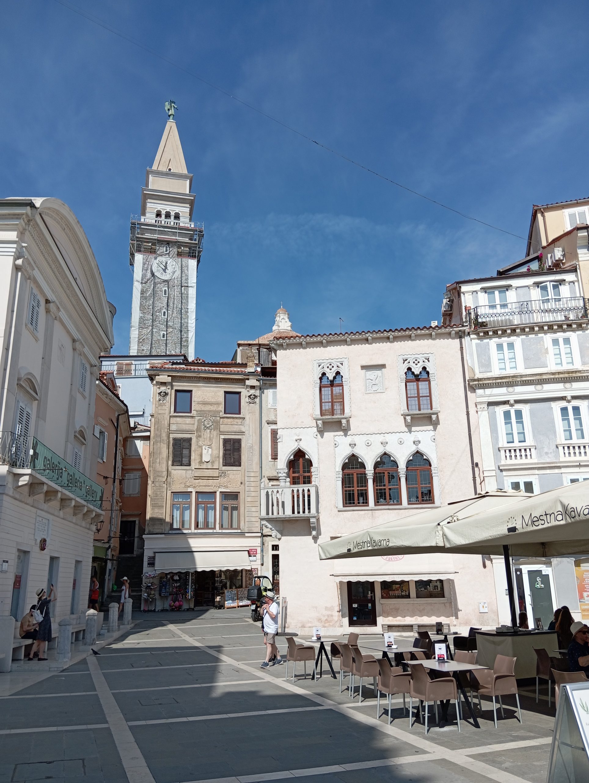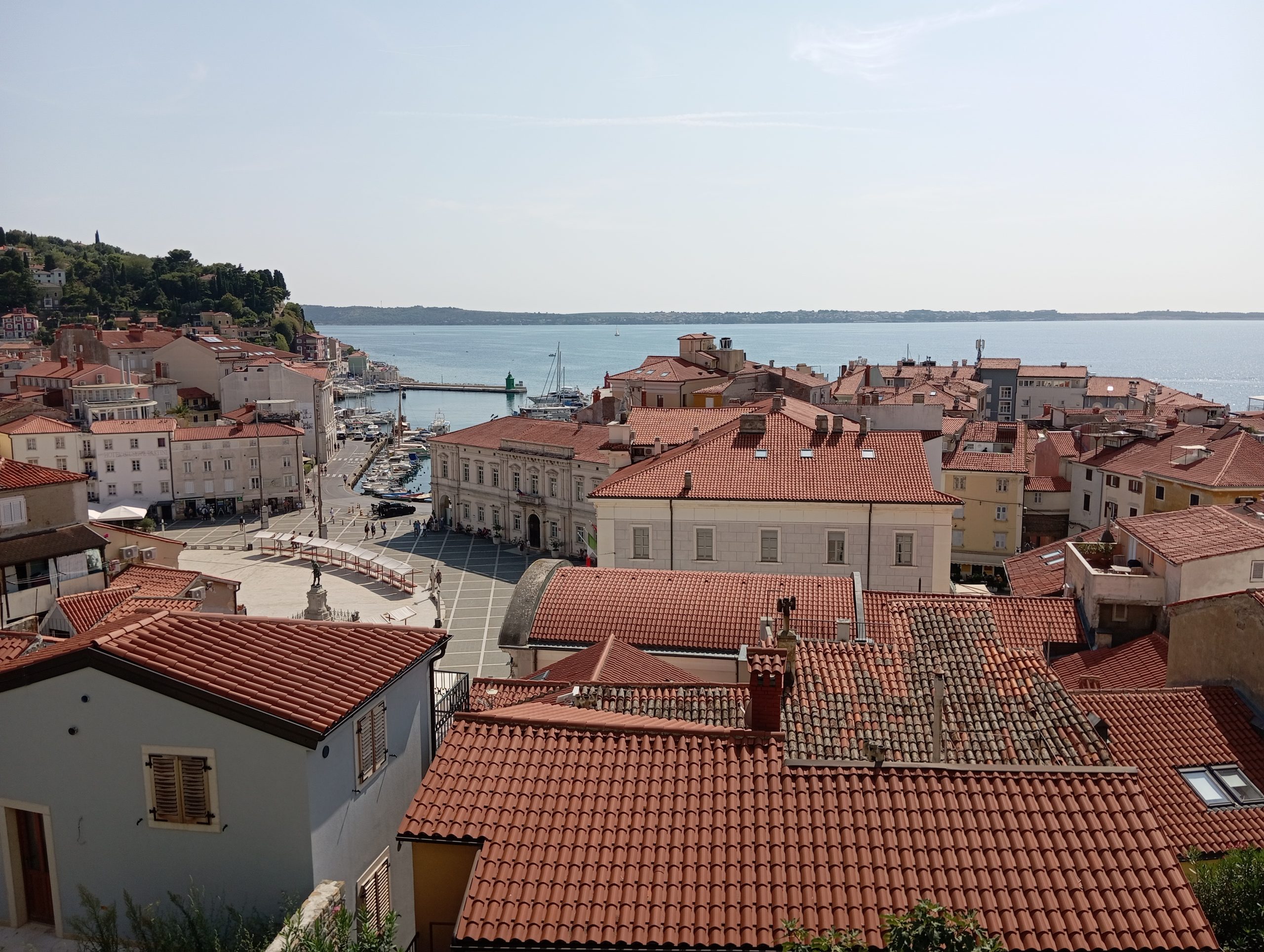 Dalej pojechaliśmy do Piranu. Chwilę zajęło nam znalezienie parkingu, gdzie byłoby wolne miejsce. Udało się zaparkować na wzgórzu, skąd spacerem zeszliśmy do centrum nadmorskiego miasteczka. Tłumy na parkingach jakoś nie przekładają się tu na odczuwanie tłumów w centrach tych miasteczek. Oczywiście są turyści, ale nie ma problemu ze znalezieniem wolnego stolika w kawiarni czy knajpie, czy miejsca na plaży. Nie ma też wrażenia chodzenia w korku ludzi.