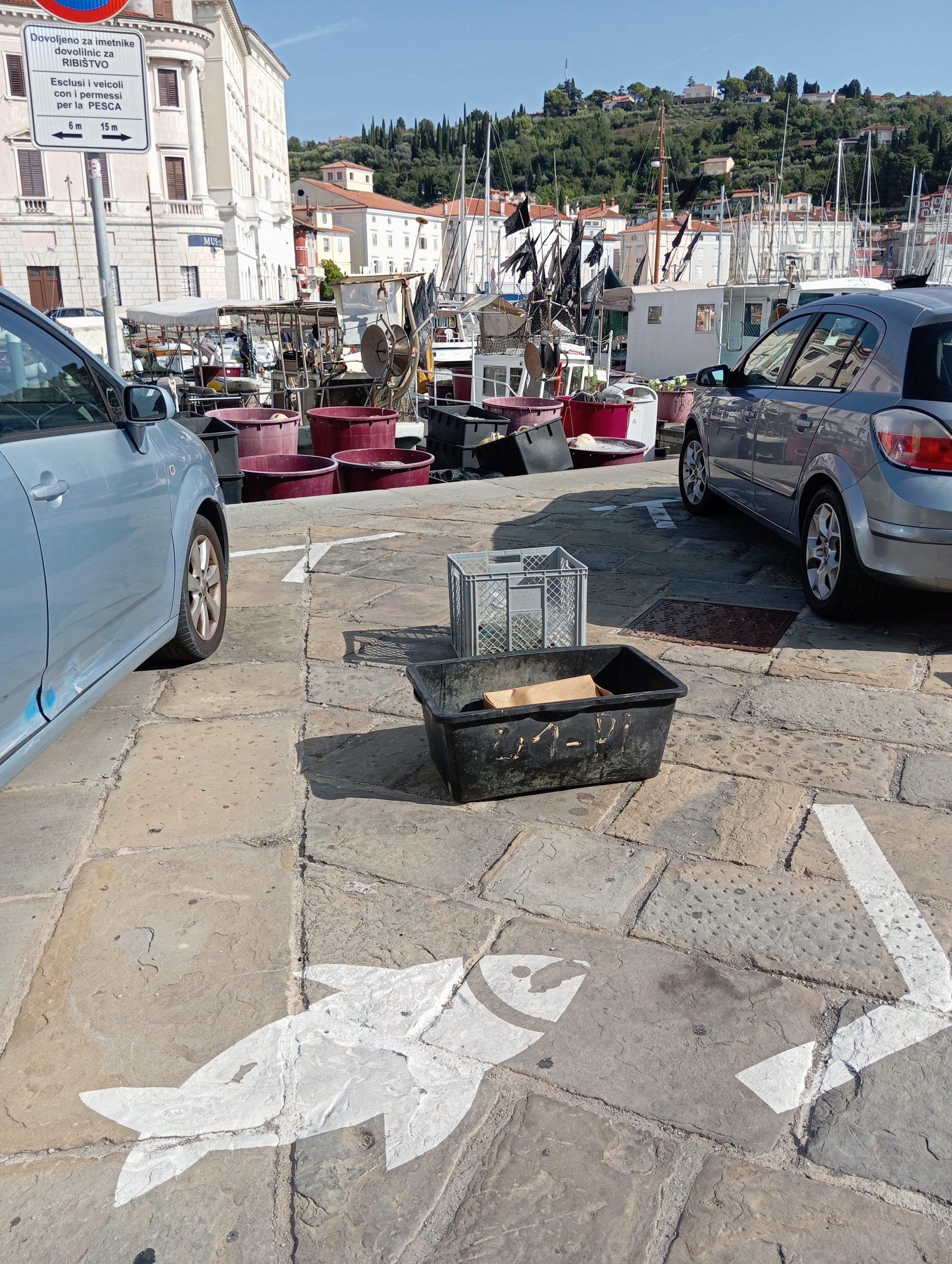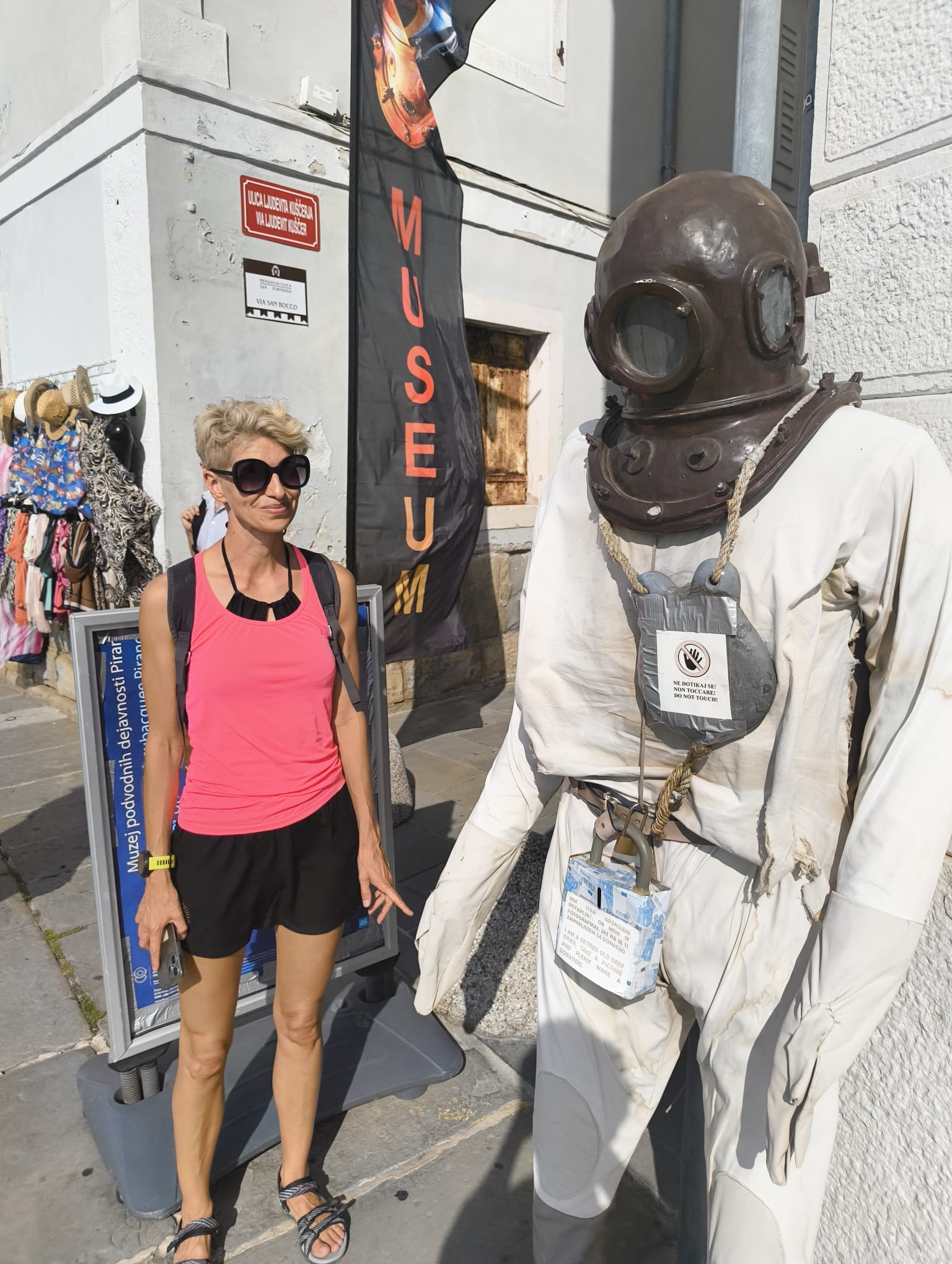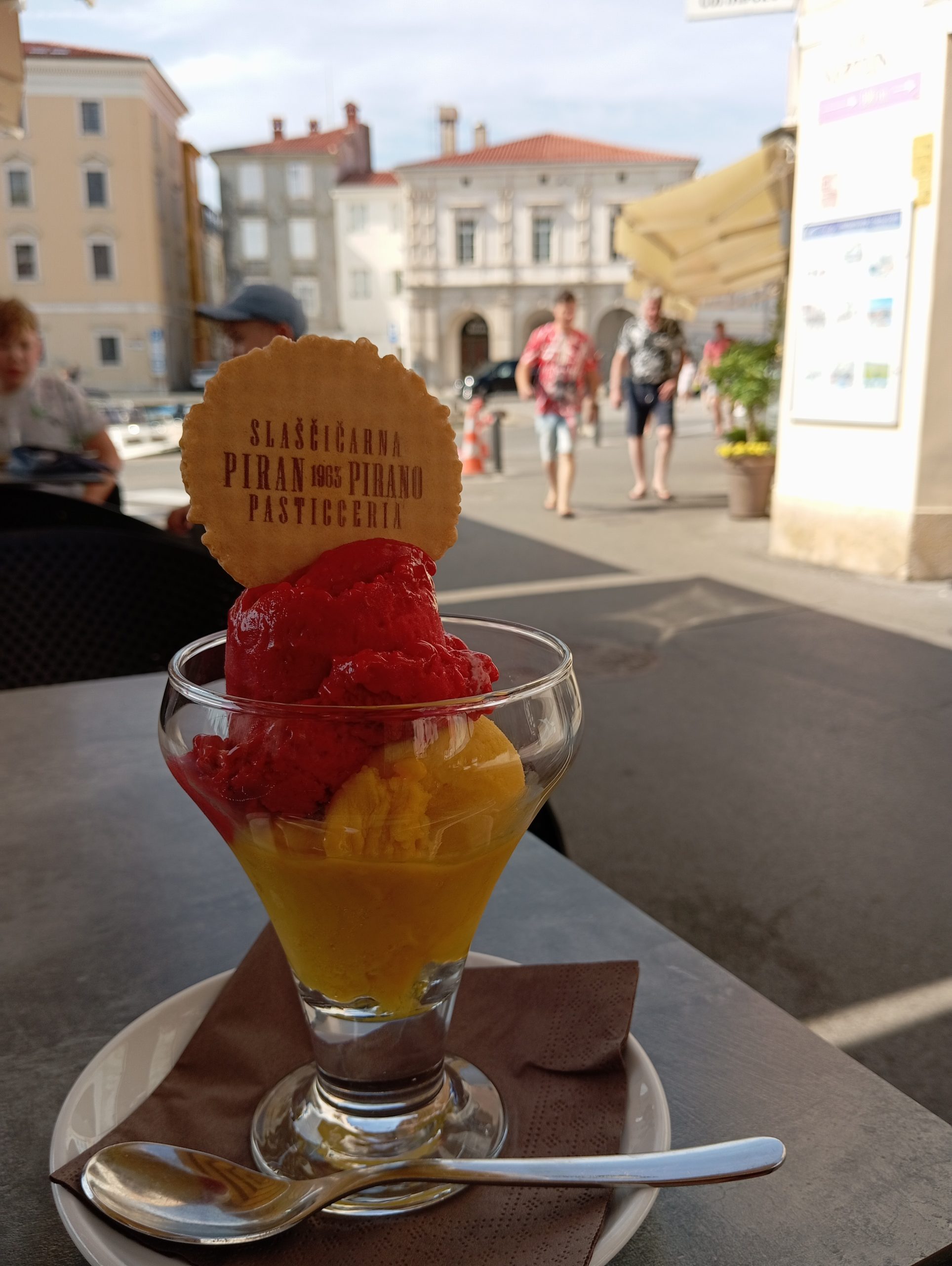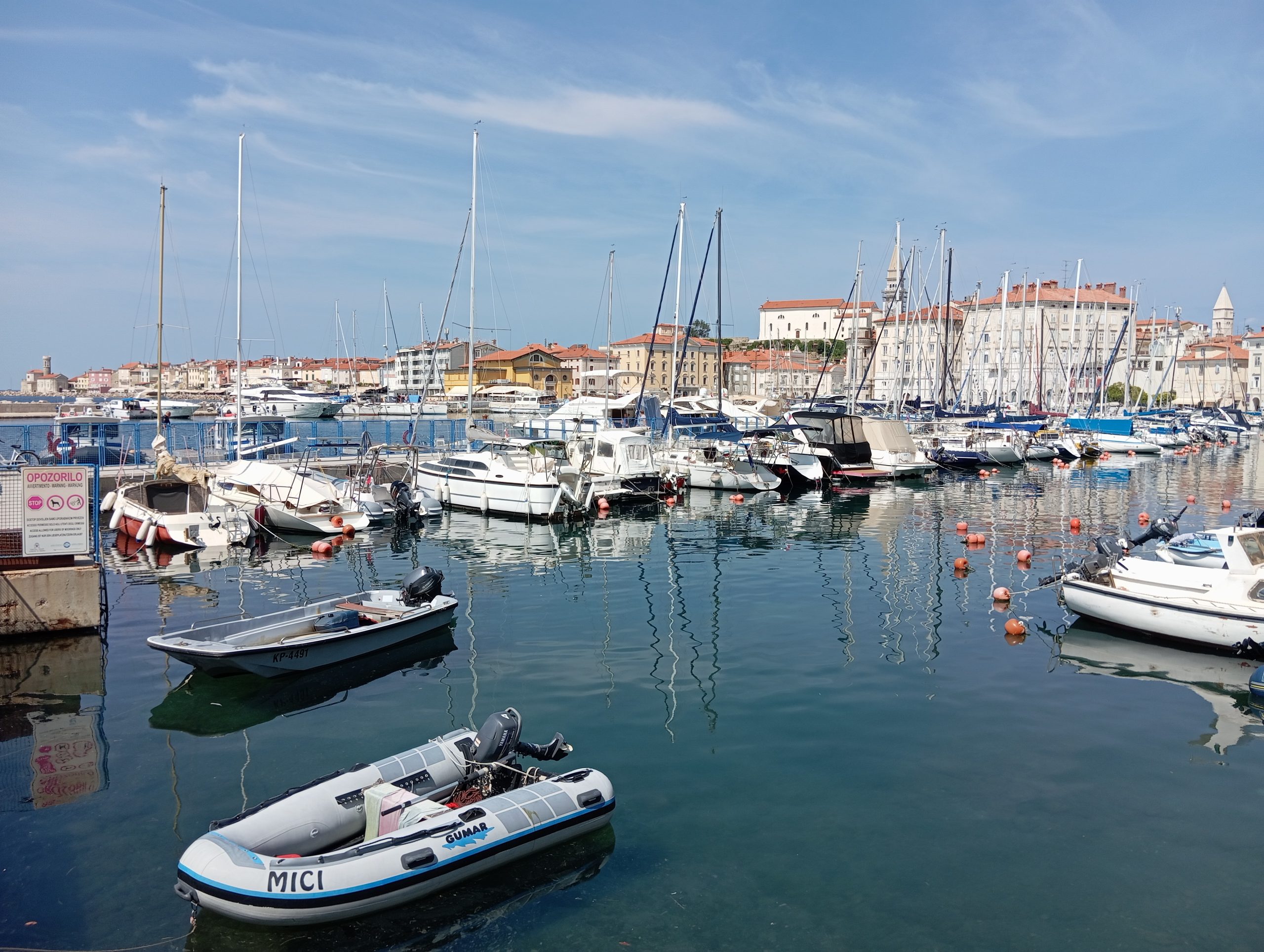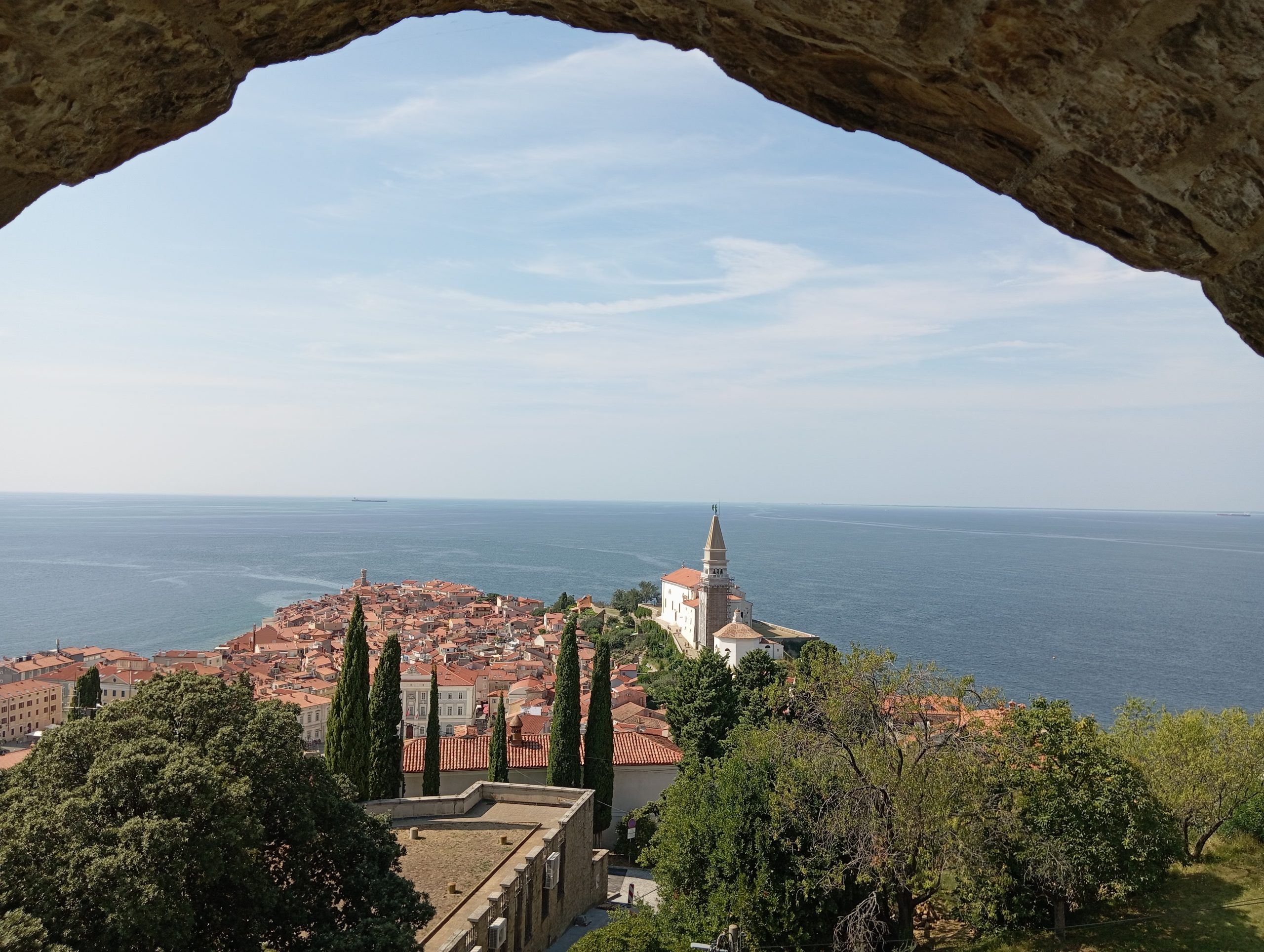 Dalej pojechaliśmy do Piranu. Chwilę zajęło nam znalezienie parkingu, gdzie byłoby wolne miejsce. Udało się zaparkować na wzgórzu, skąd spacerem zeszliśmy do centrum nadmorskiego miasteczka. Tłumy na parkingach jakoś nie przekładają się tu na odczuwanie tłumów w centrach tych miasteczek. Oczywiście są turyści, ale nie ma problemu ze znalezieniem wolnego stolika w kawiarni czy knajpie, czy miejsca na plaży. Nie ma też wrażenia chodzenia w korku ludzi.