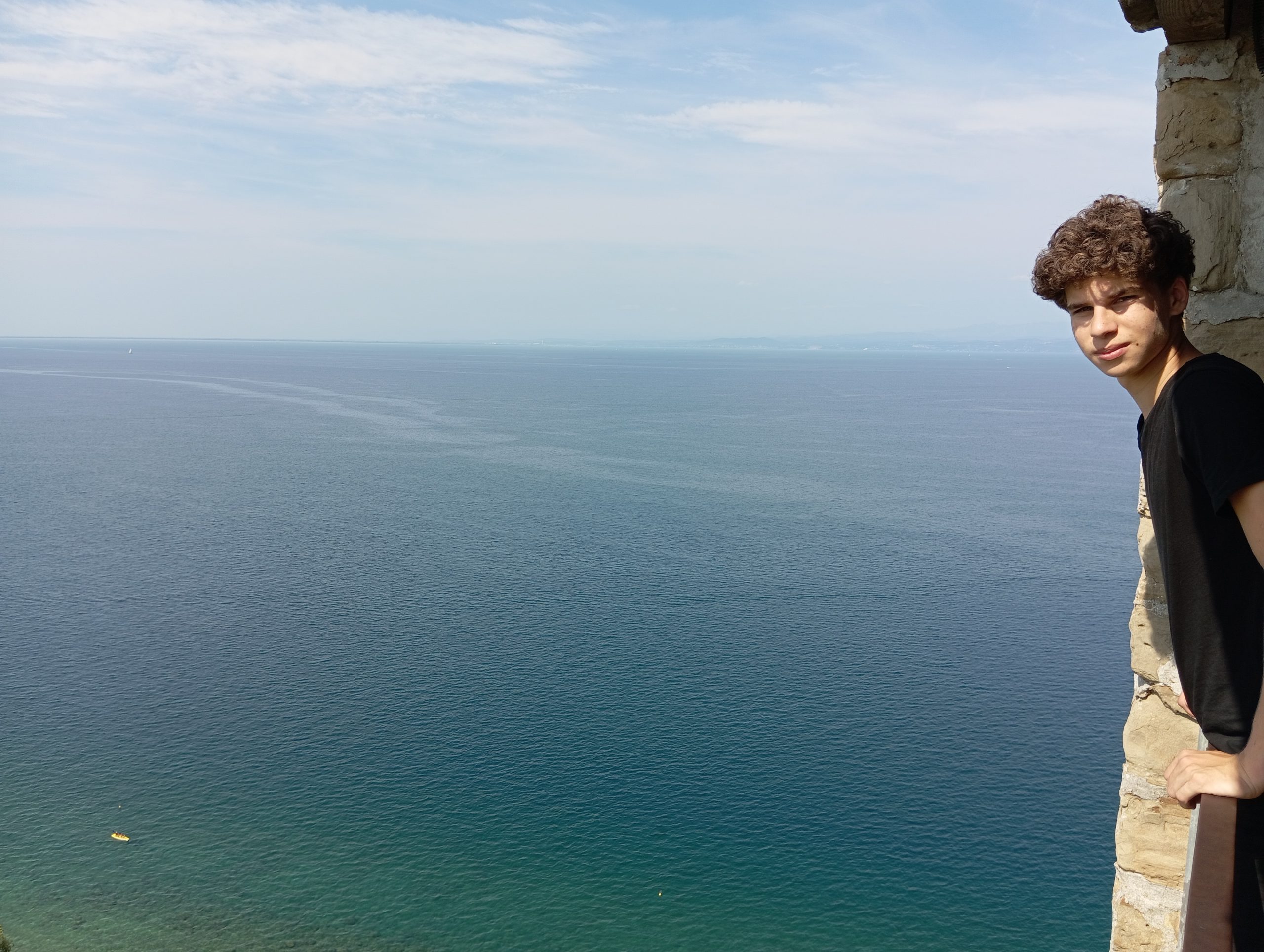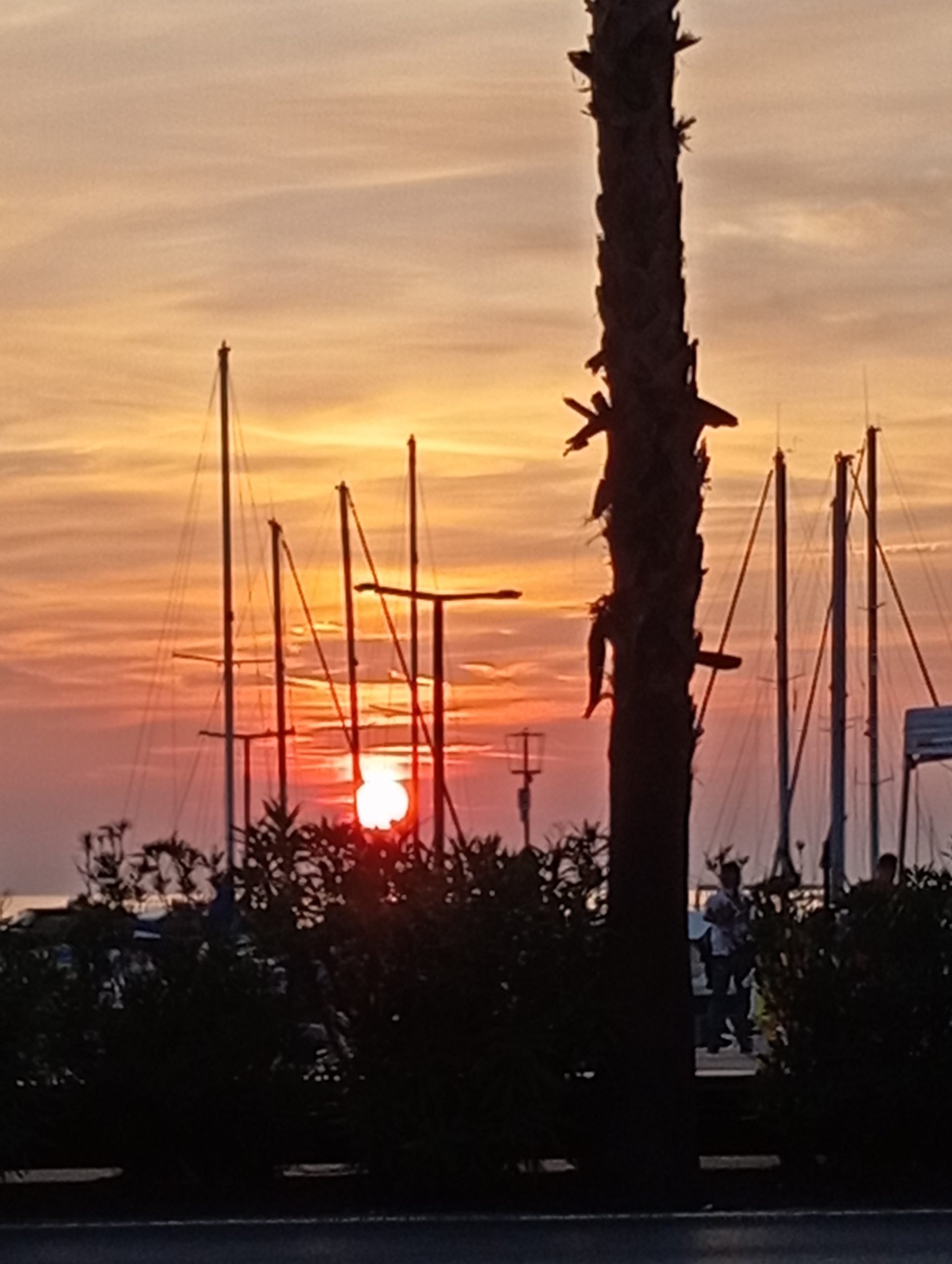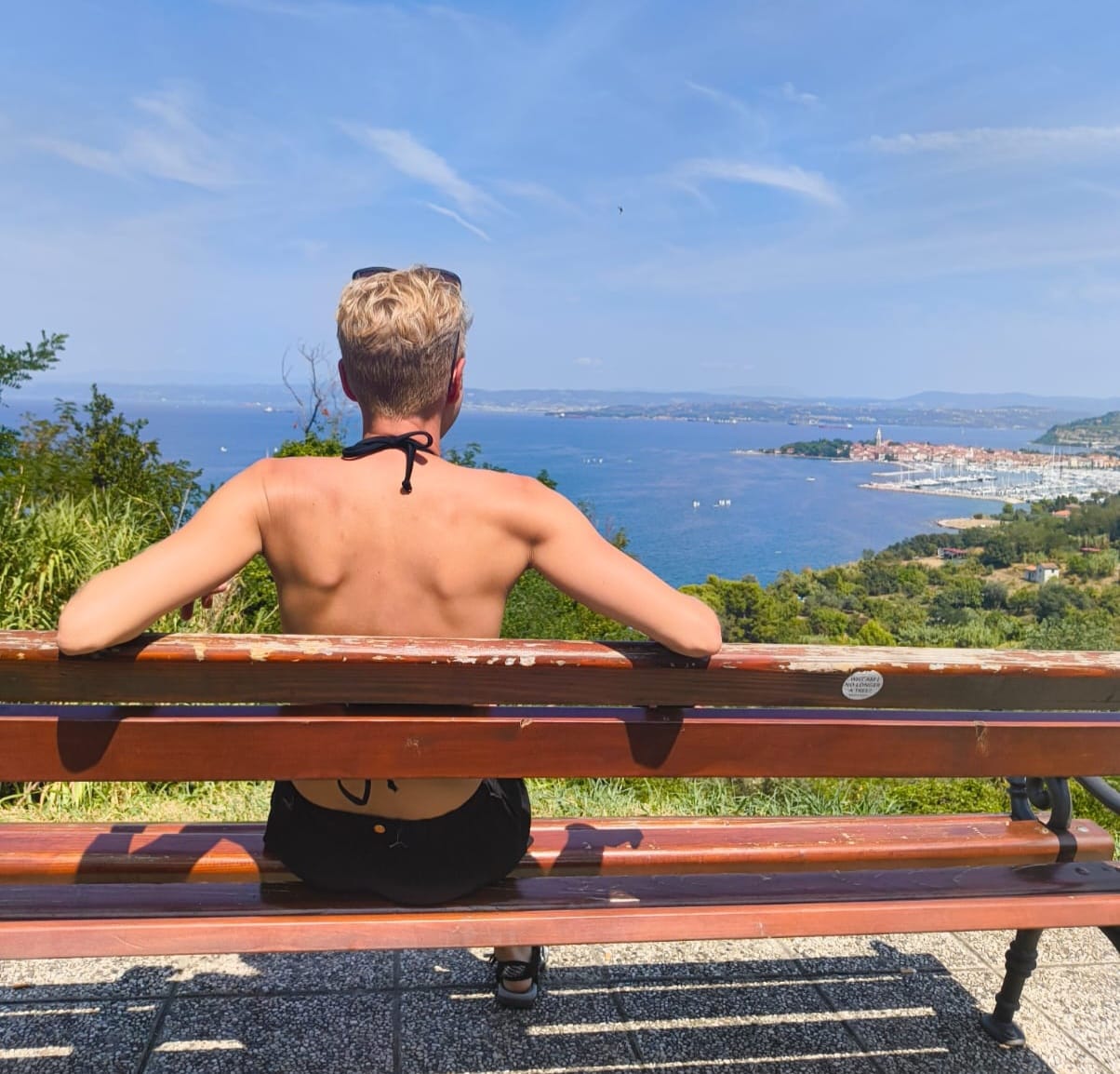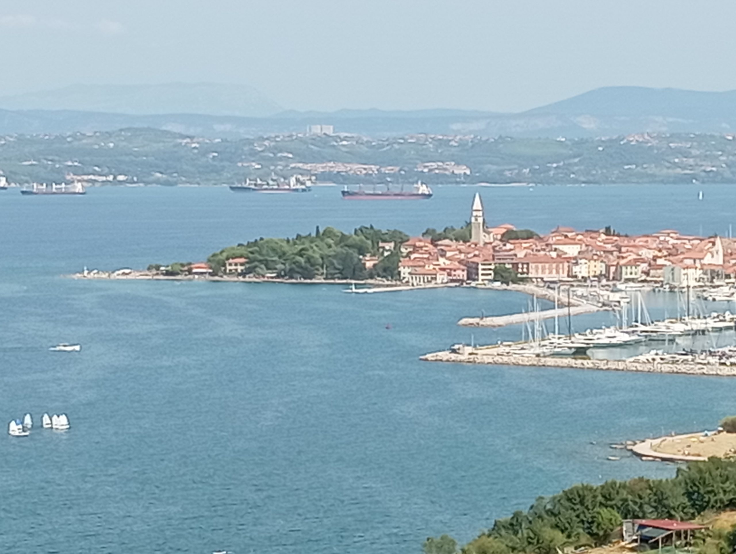 Zatrzymaliśmy się w miasteczku Isola. Weszliśmy na wieżę kościoła, skąd rozpościerał się widok na dachy budynków i marinę. Potem kąpiel w morzu i chwila na leżenie. Nie ma tu typowych plaż. Ludzie leżą na betonowych promenadach, na ławkach, albo na trawiastych skwerkach obok. Każdy szuka cienia, bo słońce mocno grzeje.