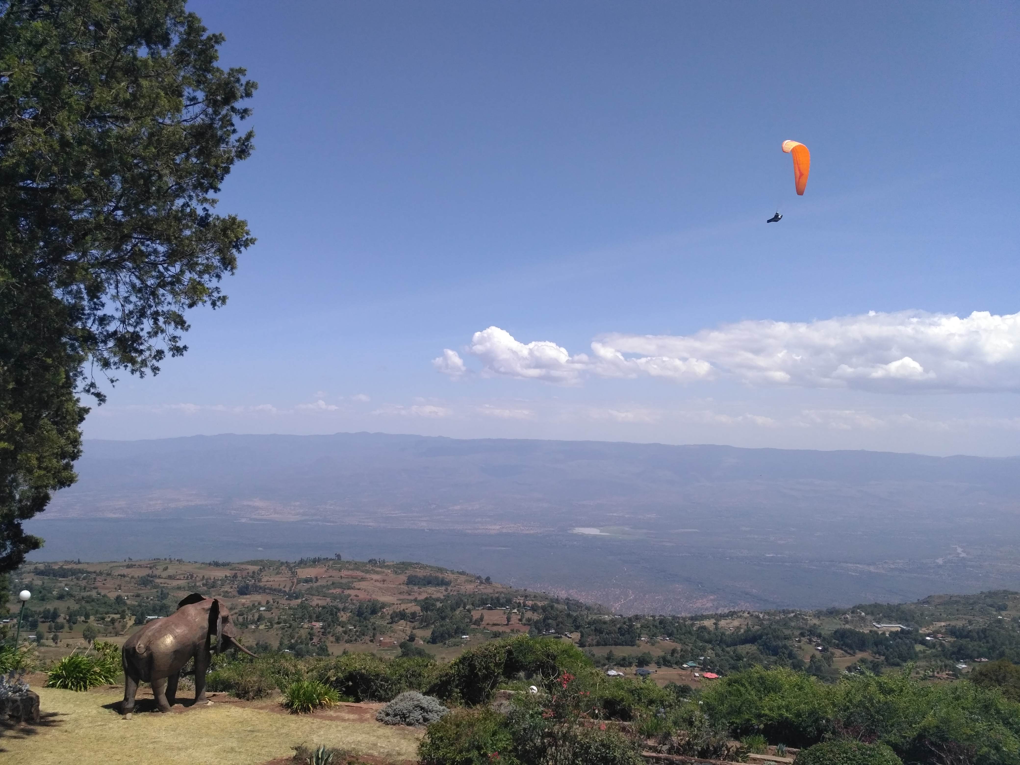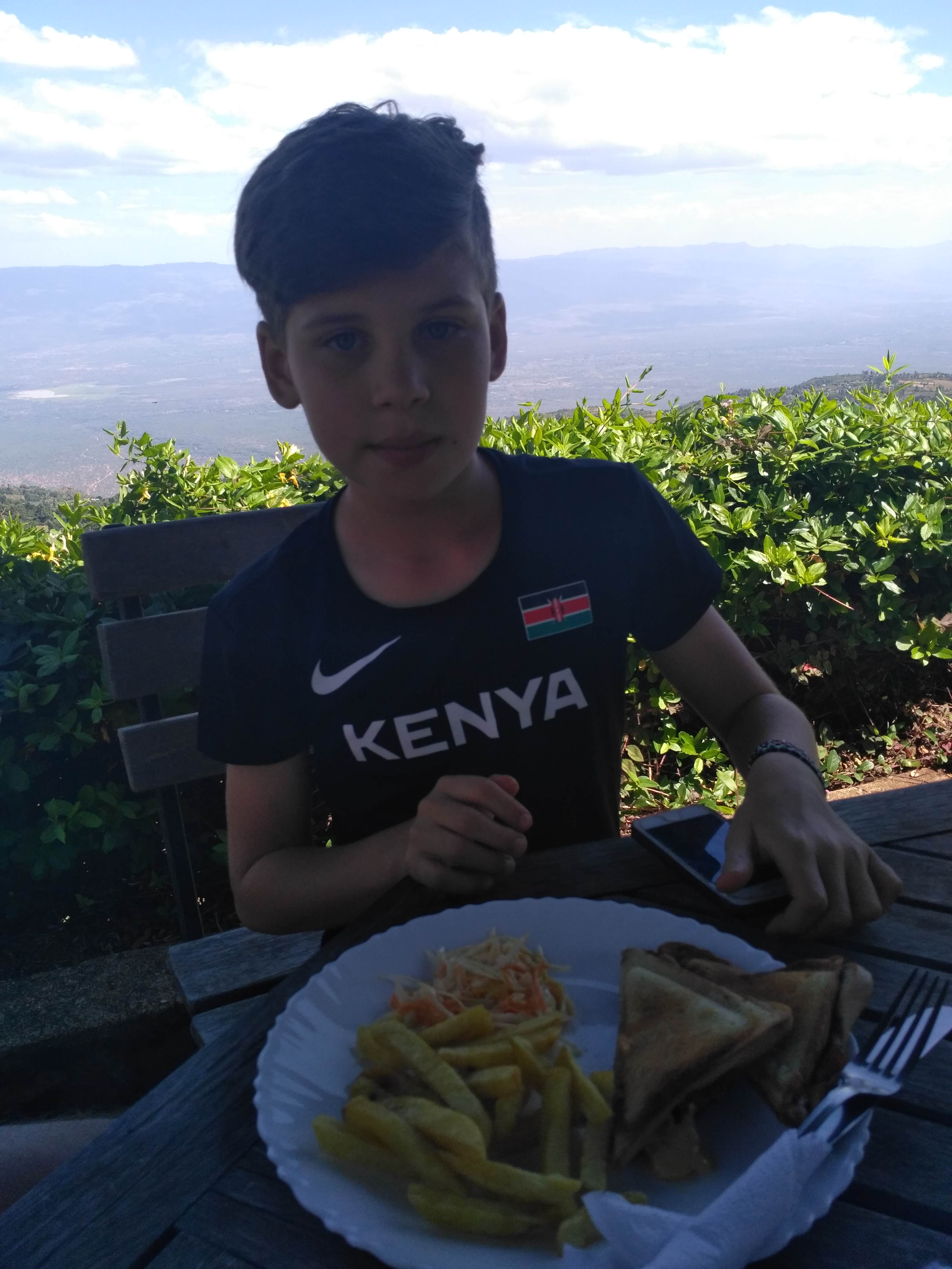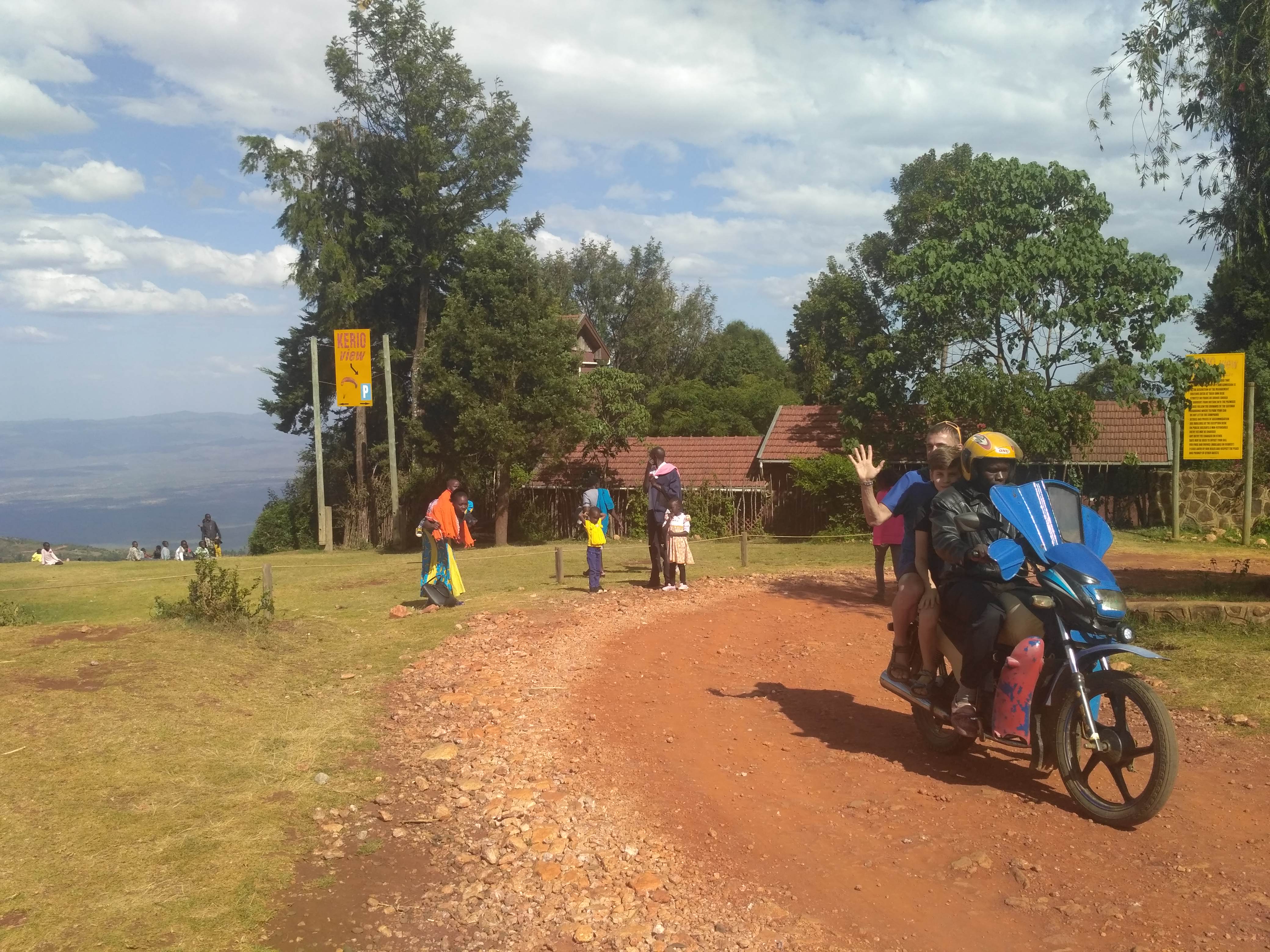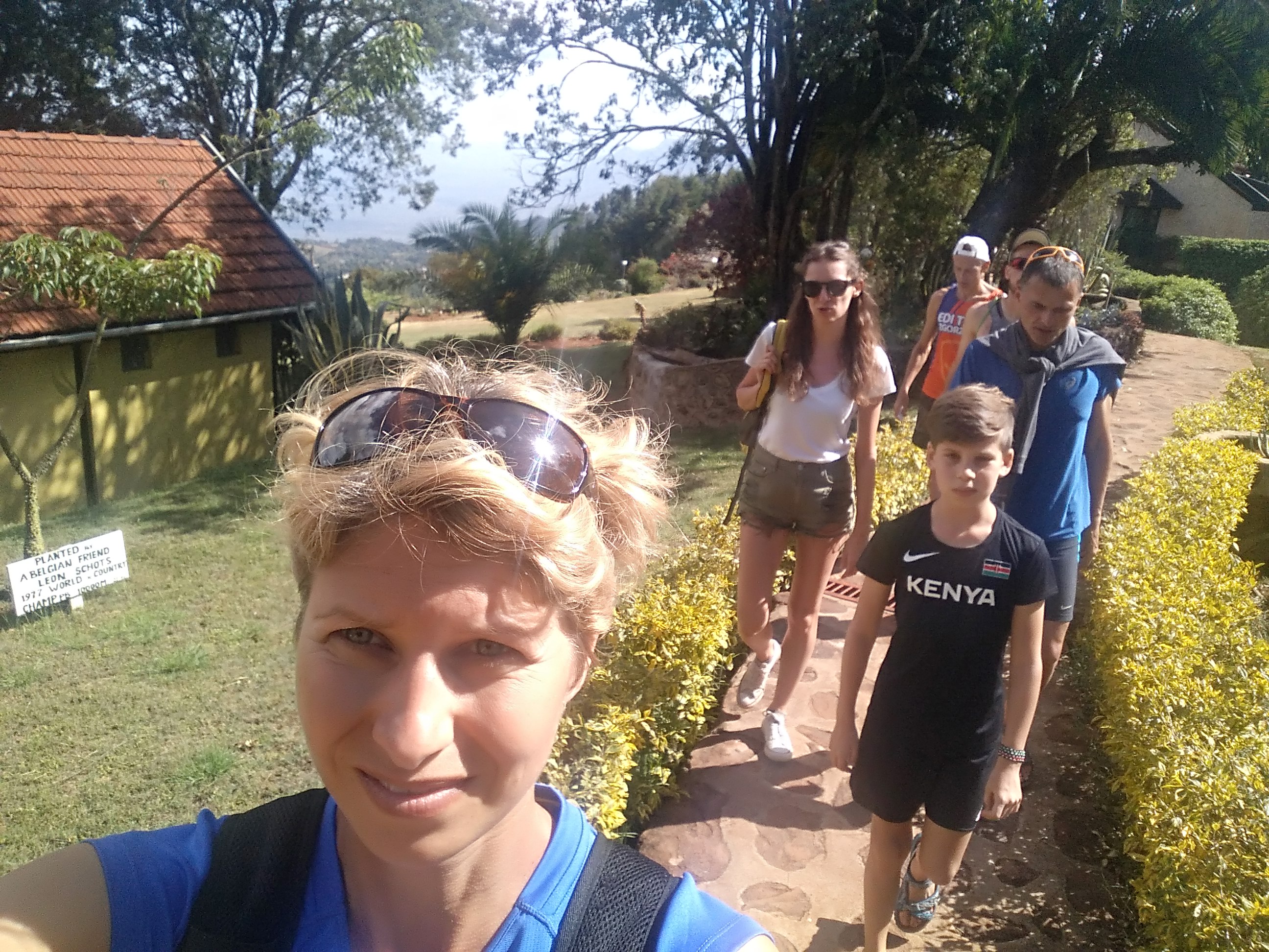 Monika z Bartkiem poszli od rana do Kerio View. Bartek na punkcie widokowym zrobił swój jogowy trening. Towarzyszyła mu gromada dzieciaków. Koło południa dołączyliśmy do nich na kawę. Do tej pory to jedyne miejsce, gdzie można się napić parzonej kawy, nie rozpuszczalnej z saszetki. Hotel pełen był gości. Poza obcokrajowcami sporo było też Kenijczyków. Najwidoczniej przyjeżdżają tu na niedzielny spacer i obiad. Każdy z nas przekąsił małe co nieco i ruszyliśmy z powrotem, by zdążyć na popołudniową jogę. Jacek z Jankiem wsiedli na motor, reszta ruszyła piechotą.
