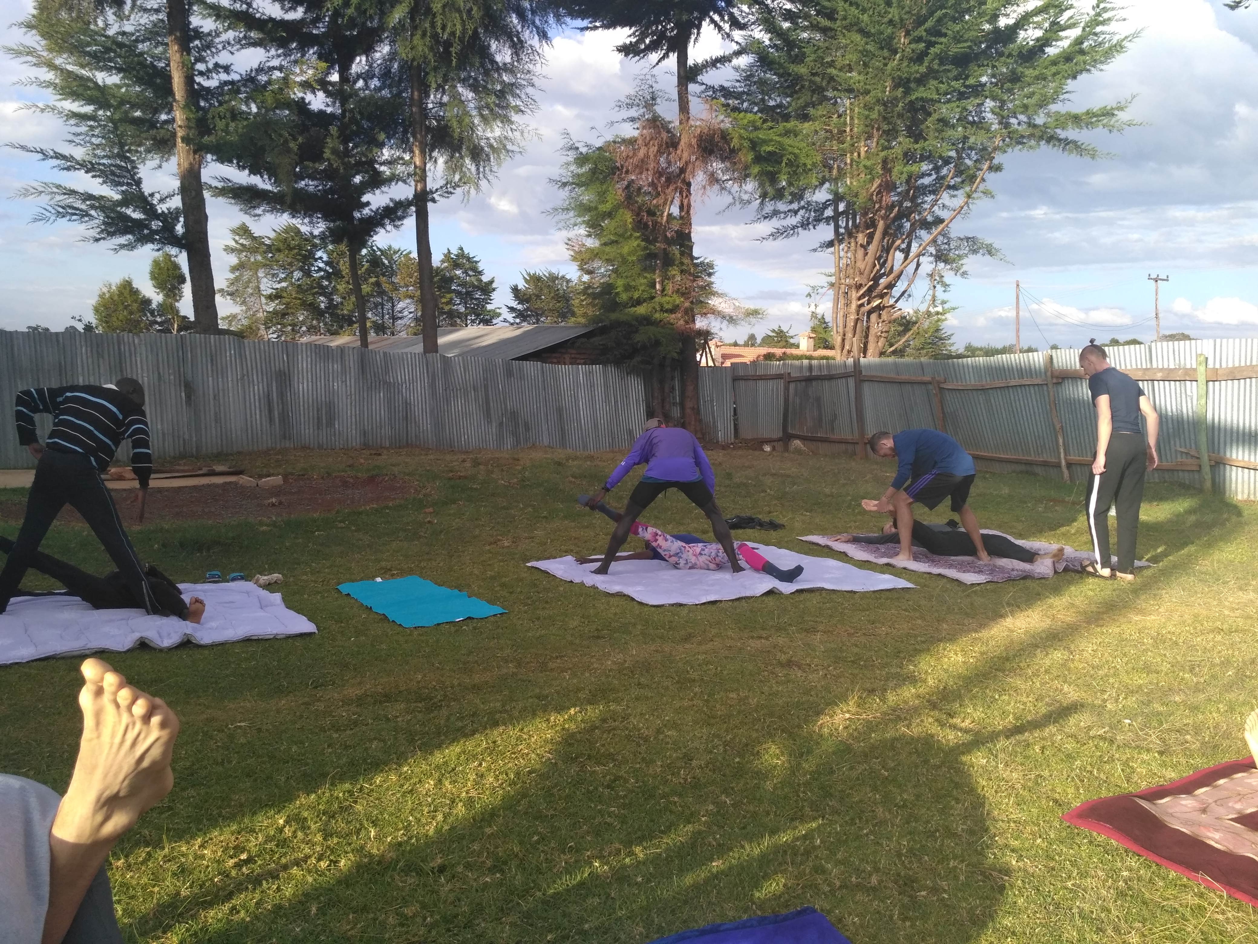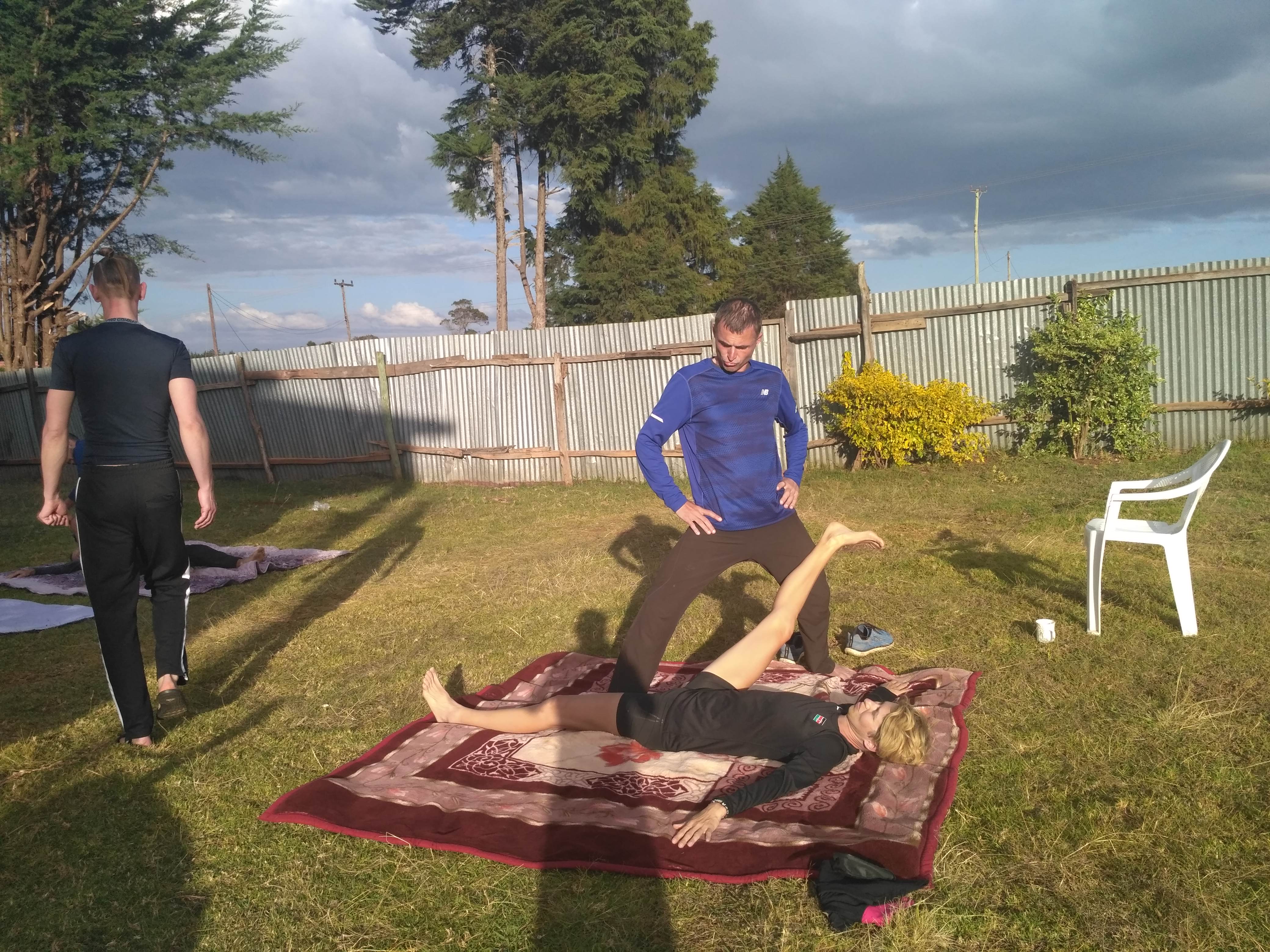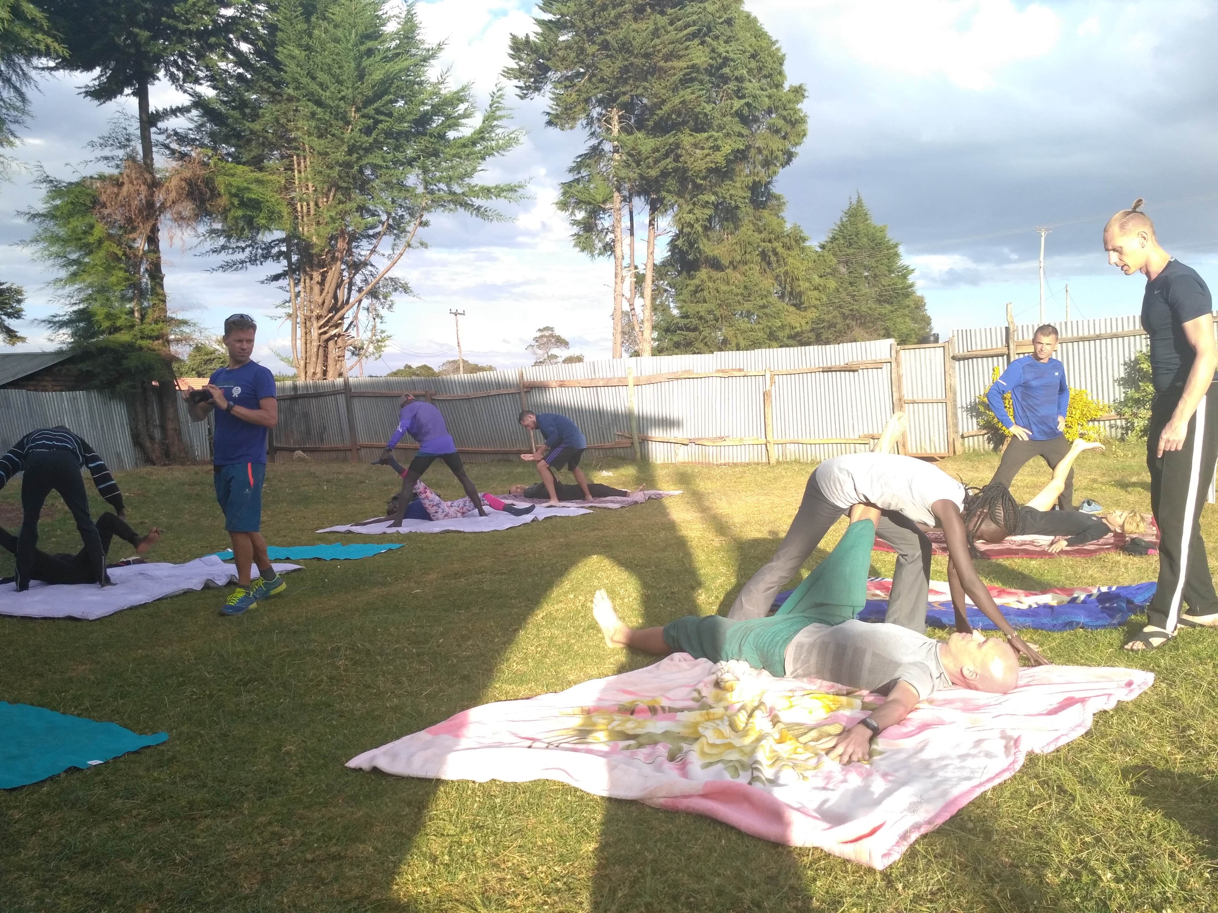 Na jodze Bartek trochę nam dziś odpuścił. Poza kilkoma ćwiczeniami na mięśnie głębokie resztę zajęć spędziliśmy ćwicząc w parach. Była kupa śmiechu. Daniel miał do pary dziewczynę z Ugandy. Gladys trenuje do biegów na 400 metrów. Nie patyczkowała się z Danielem, gdy przyszło do rozciągania nóg. Na hasło siawassana, wszyscy szybko wskoczyli pod koce. Bardzo lubimy ten moment treningu.