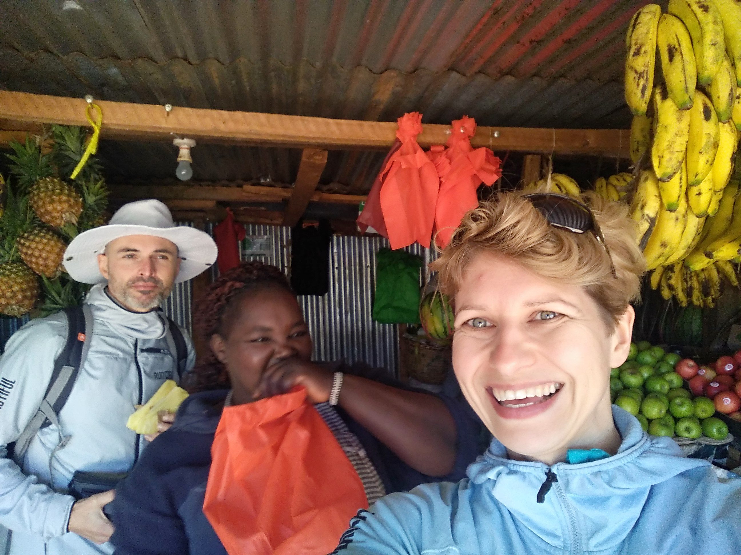 Wymieniliśmy w banku USD na szylingi i od razu zrobiliśmy zakupy owocowe. Zapakowaliśmy cały plecak bananami, mango, awokado, papają, do tego siatka owoców passion. W centrum dołączył do nas Meshack. Wyściskaliśmy się, a jednocześnie miałam wrażenie jakbym widziała go wczoraj. Szybko minął ten rok… W drodze do domu zaszliśmy do supermarketu prowadzonego przez hinduskie małżeństwo. Właściciel od razu mnie poznał, mimo innej fryzury niż w ubiegłym roku. Jacka nie rozpoznał, dopiero jak ten zdjął swój kapelusz, w którym chodzi dumnie po wsi niczym brat Colm. Yacool zapuścił brodę na wyjazd, by dodać sobie więcej powagi i poważania w oczach Kenijczyków. Czy to działa nie wiem, na pewno jest trudniej rozpoznawalny.