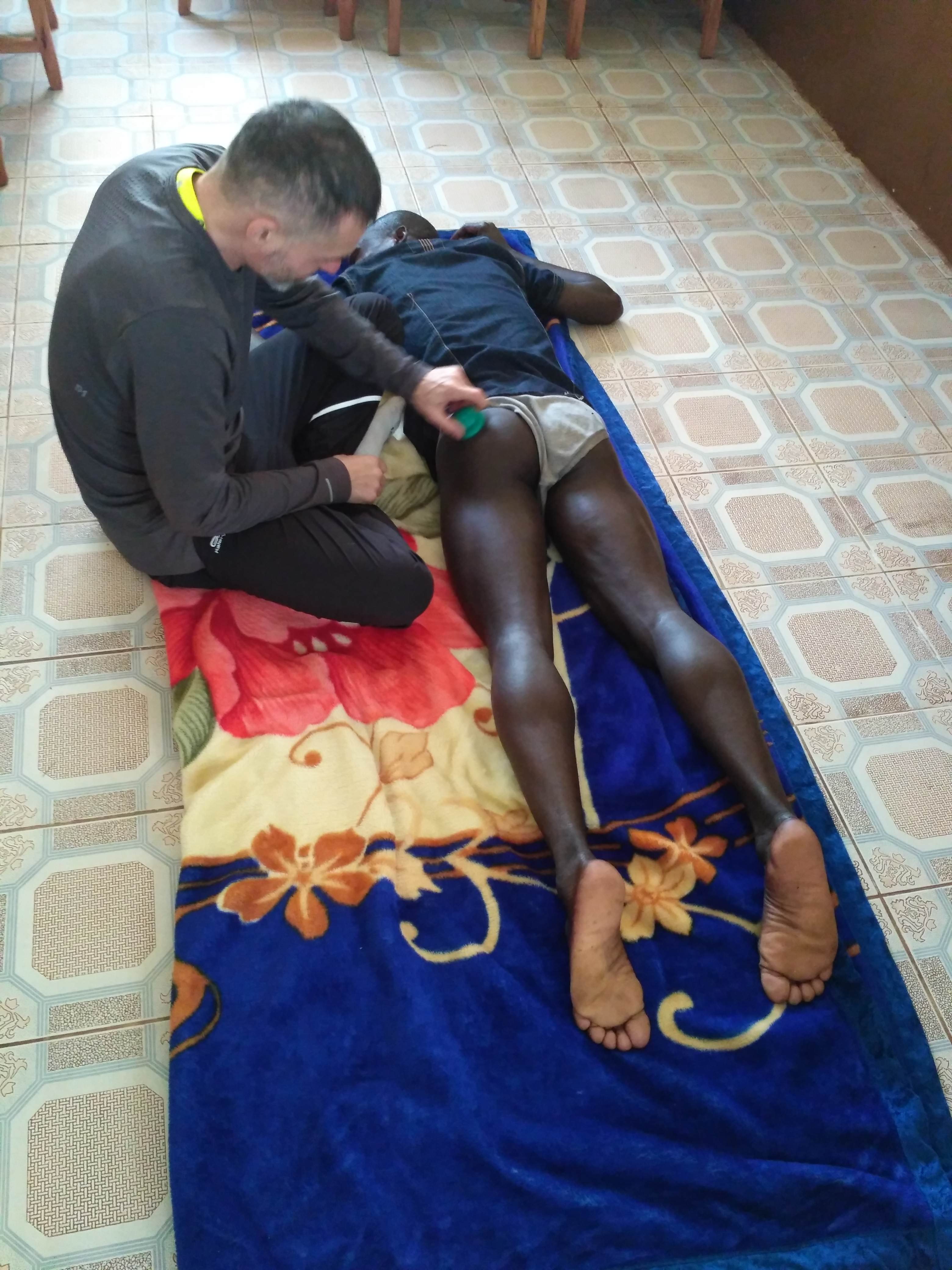 Potem yacool pokazał mu ostatni ze swoich filmików, na którym Sebastian prezentował ćwiczenia z torowania powięzi. I przystąpili do delikatnych ćwiczeń. Na koniec yacool zrobił mu masaż, użył też bańki chińskiej i uczył Meshacka oddychania przeponą. Z tym miał największy problem, by to załapać. Zaczął ziewać i się pożegnaliśmy. On poszedł do domu z zamiarem zrobienia drugiego lekkiego rozbiegania, a my do Keellu – hotelu Wilsona Kipsanga, odwiedzić znajomą ekipę.
