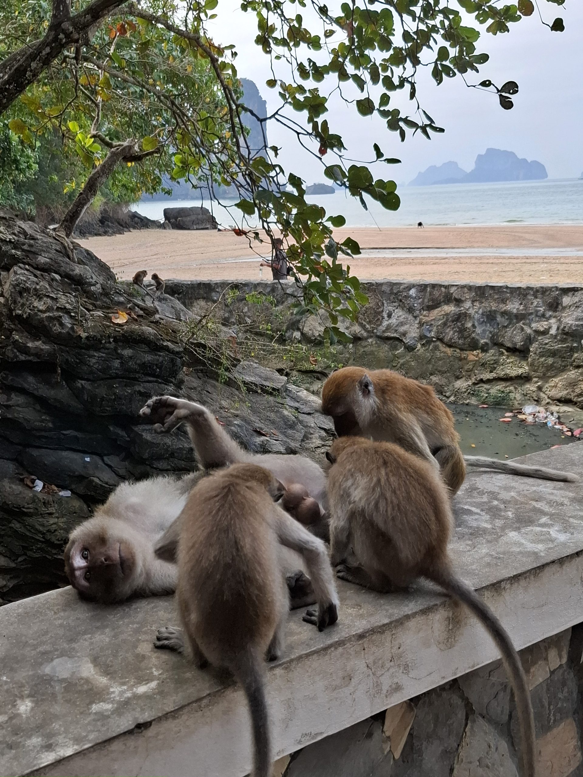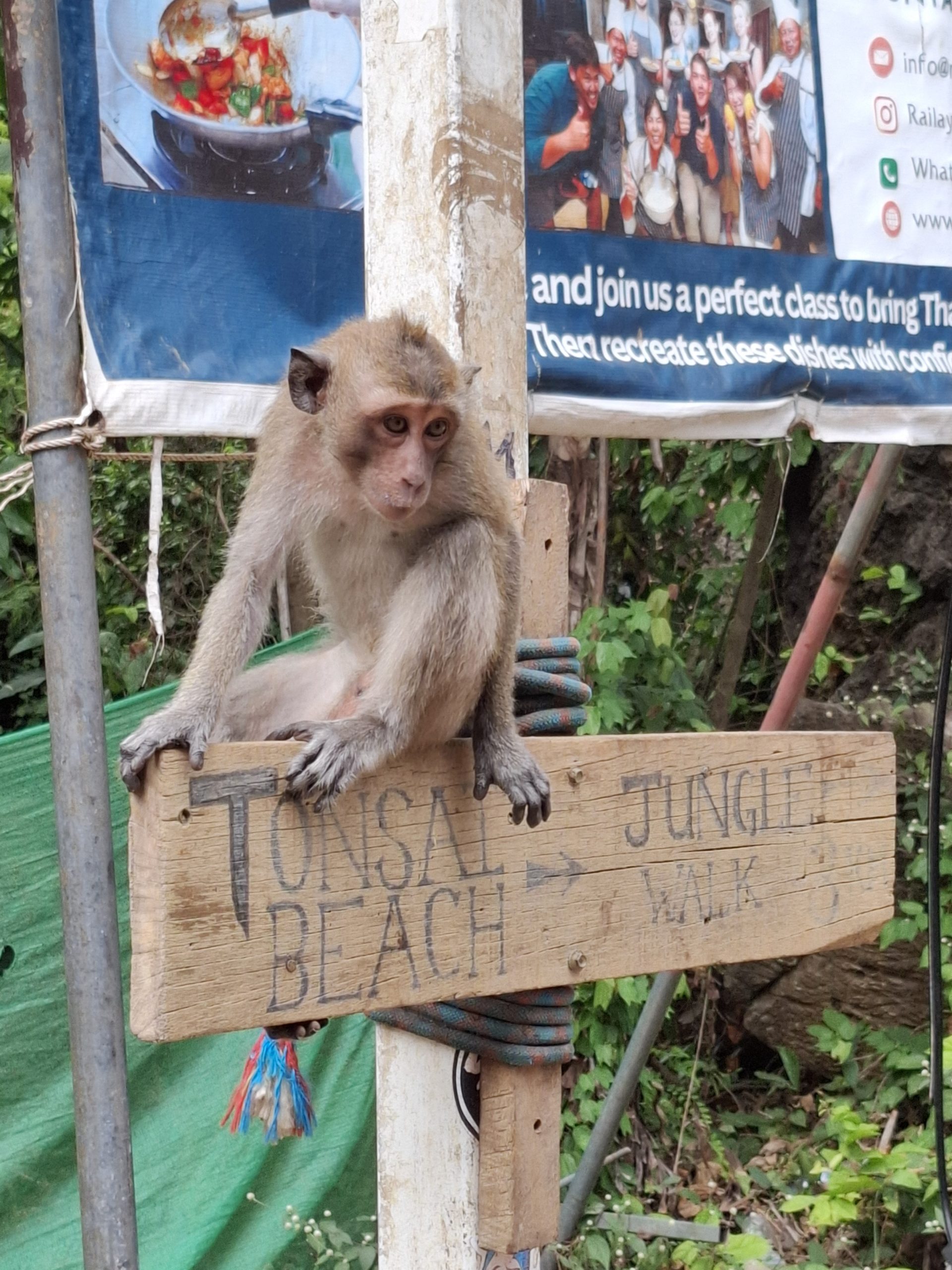 Poszłam wzdłuż morza, w drugą stronę zatoki. Główna droga skręcała w głąb lądu, a promenada ciągnęła się dalej wzdłuż wybrzeża. Tu też są restauracje i hotele, ale jako że nie ma ulicy od tej strony, to jest spokojniej. Doszłam do końca plaży. Zaczynał się tam „monkey trail”. Faktycznie było sporo małp. Droga prowadziła po drewnianych schodach w górę wzgórza do kolejnej zatoki. Mimo wczesnej godziny, było już gorąco. Wilgotność powietrza jest tu potworna.