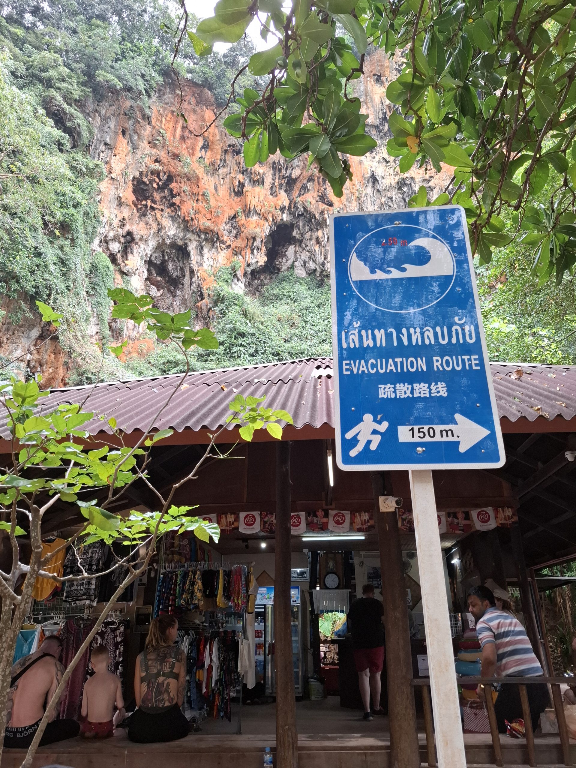 Na półwyspie jest punkt widokowy, z którego można zobaczyć obie plaże – zachodnią i wschodnią. Oczywiście chciałam tam wejść. Szlak był bardzo stromy, skały wyślizgane. W Europie zrobiliby tu pewnie ferratę z systemem mocowań. Tu była lina do podciągania się. Byłam w sandałach i nie czułam się bezpiecznie zawróciłam, a Janek poszedł do końca i pstryknął z góry zdjęcie. W wielu miejscach na wybrzeżu spotykamy tablicę wskazujące kierunek ewakuacji na wypadek tsunami. Są też duże tablice z instrukcją jak wygląda tsunami i co je poprzedza, jak się zachować. W naszej miejscowości wieczorami są takie imprezy z muzyką na żywo, że nikt by raczej nic nie usłyszał i nie zobaczył… Nasz pokój w hotelu jest na 4 piętrze, prawdę mówiąc to miało dla mnie znaczenie, gdy wybierałam nocleg.