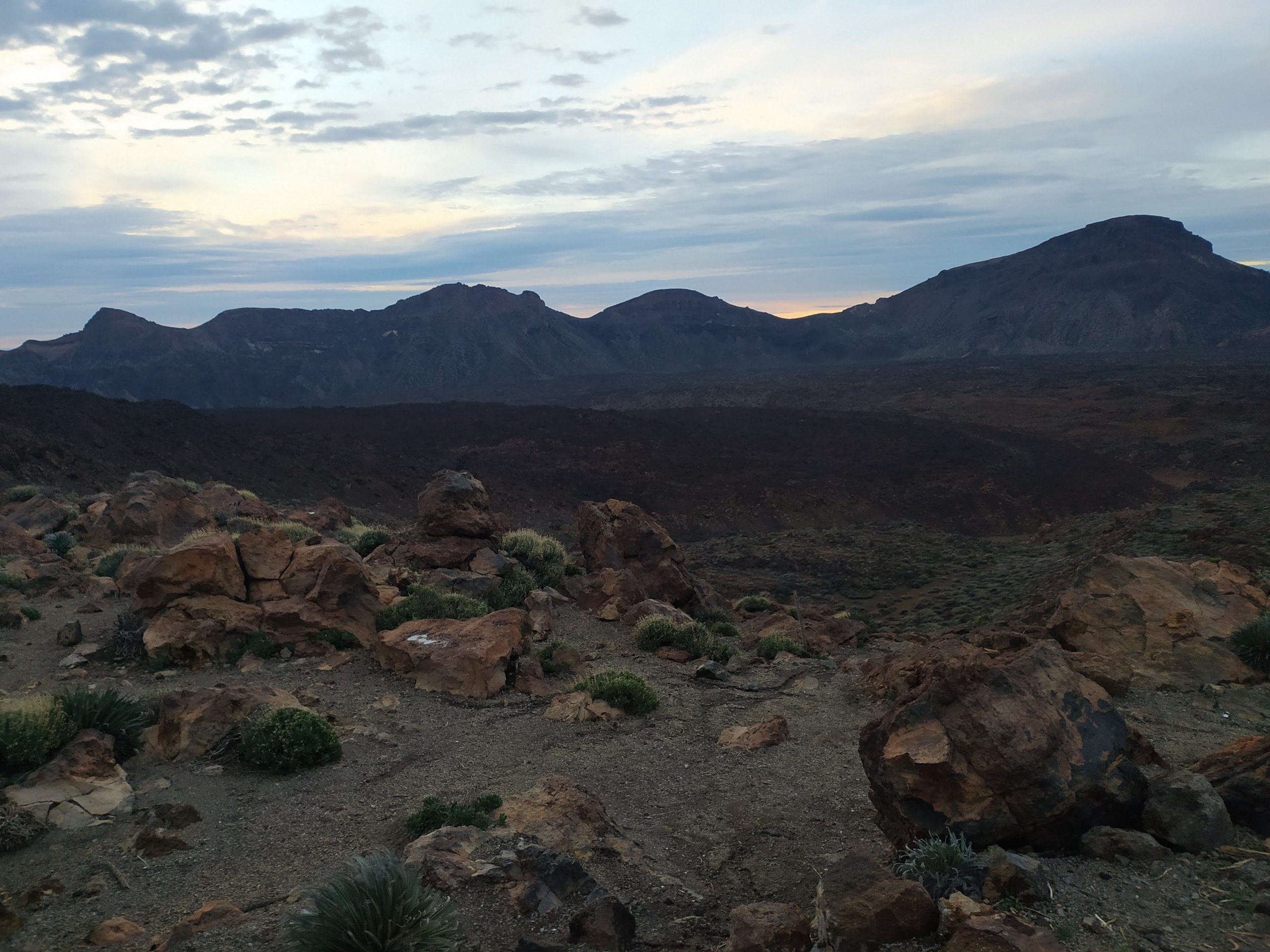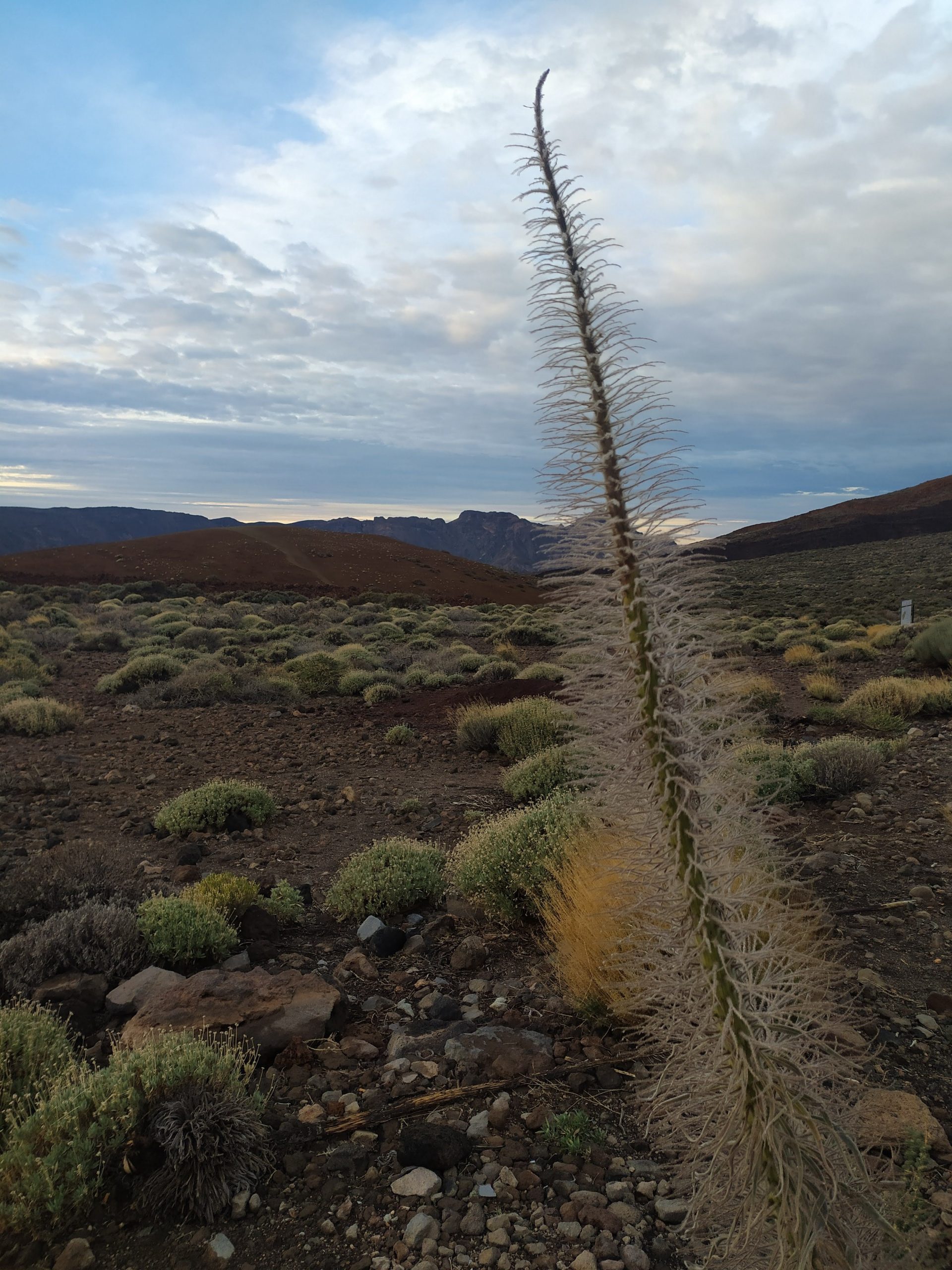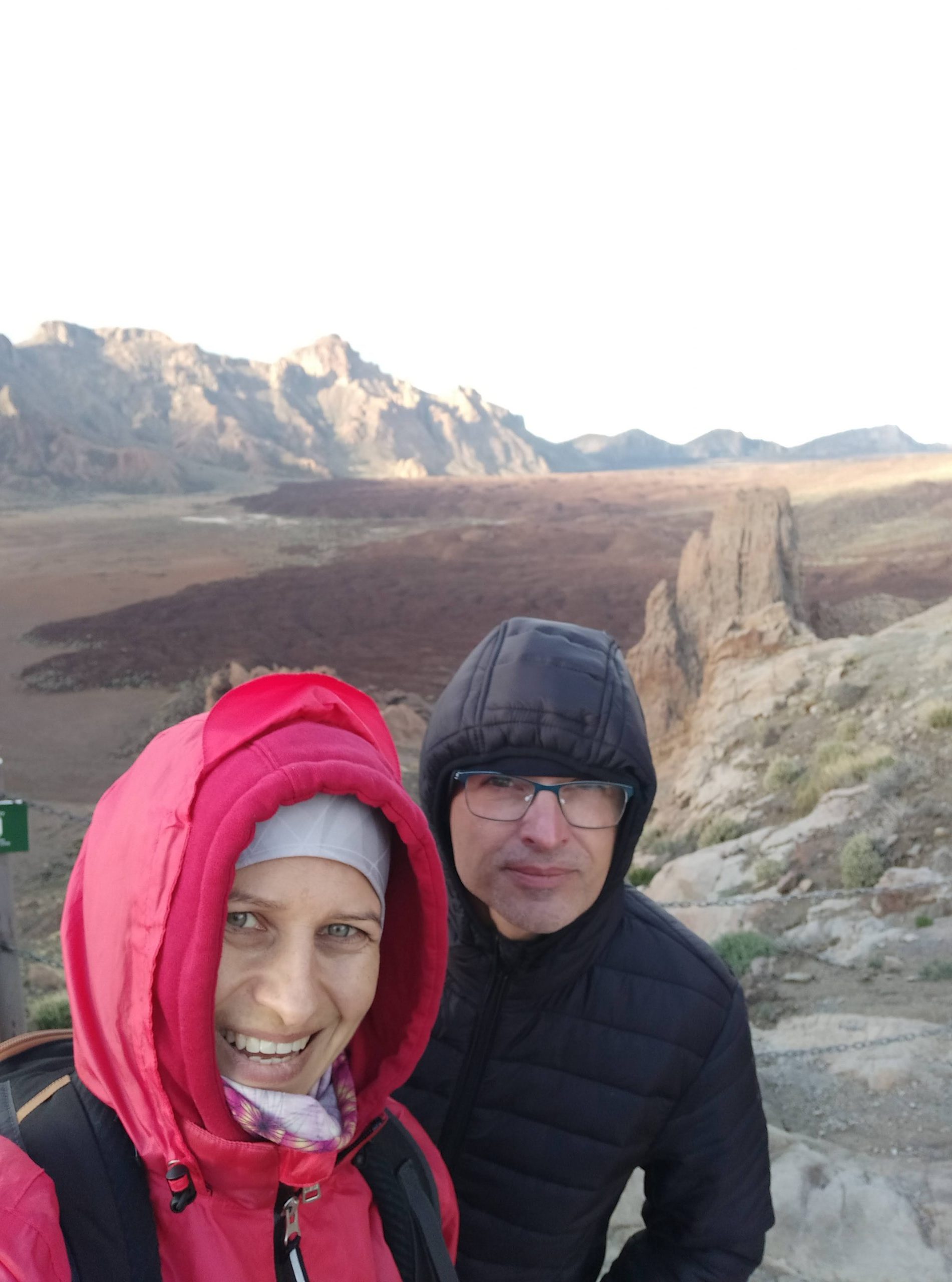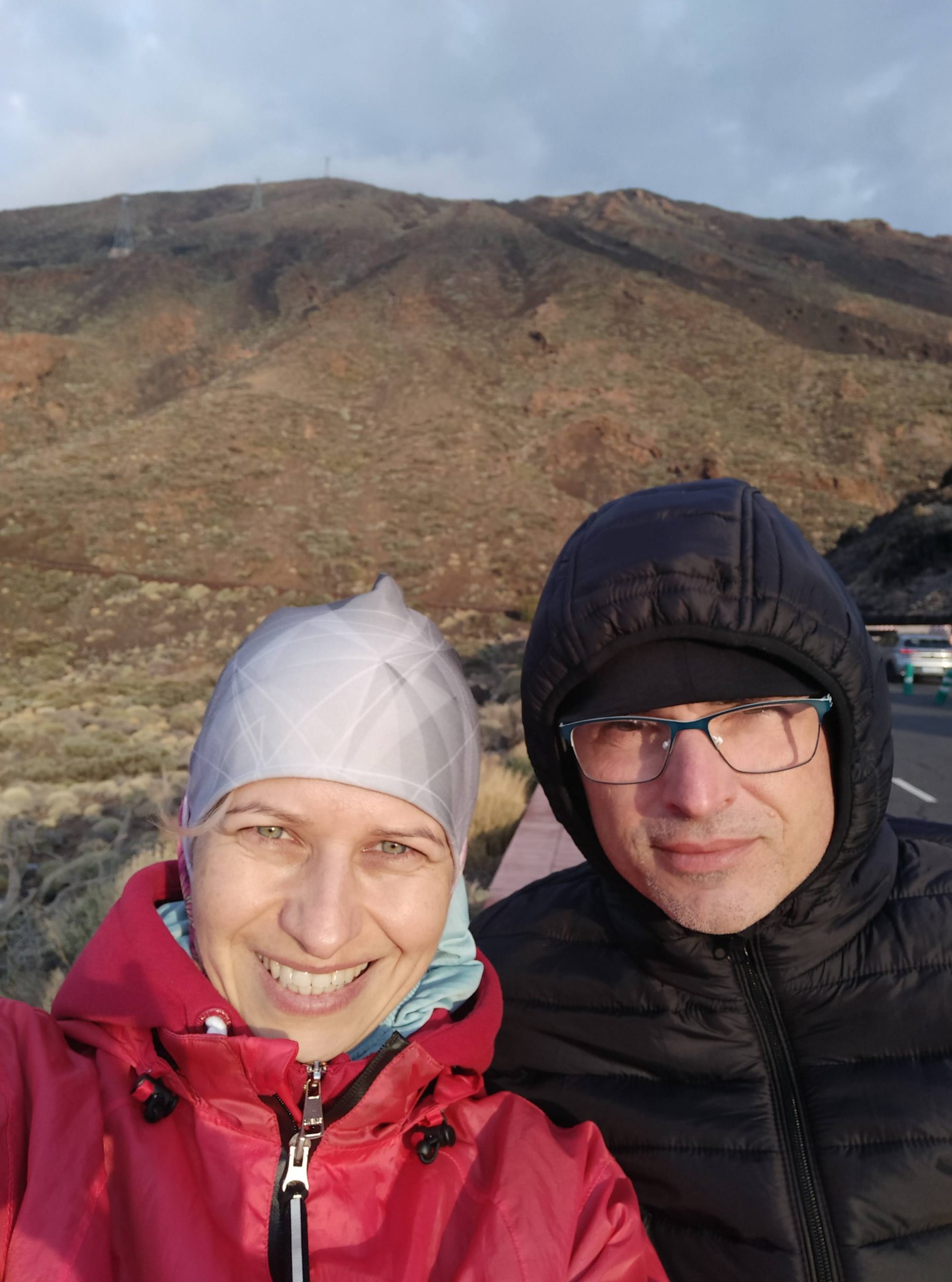 Tym razem wybraliśmy inną drogę, mniej stromą choć przez to z licznymi serpentynami. Dojazd z Icod pod wulkan zajął nam niecałe półtorej godziny. Dopiero na miejscu zaczęło trochę świtać. W takim półmroku zbocza wulkanu wyglądały bardzo złowrogo. Można było poczuć jego surowość i niewątpliwą siłę. Zatrzymaliśmy się na kilku punktach widokowych, mocno wiało i temperatura z 22 stopni na dole, tu spadła do 8.