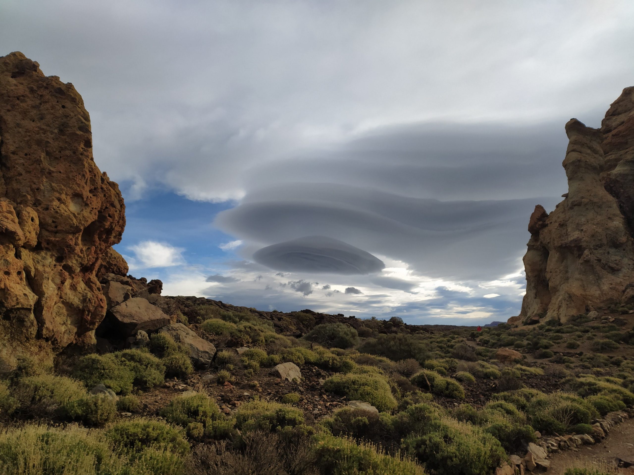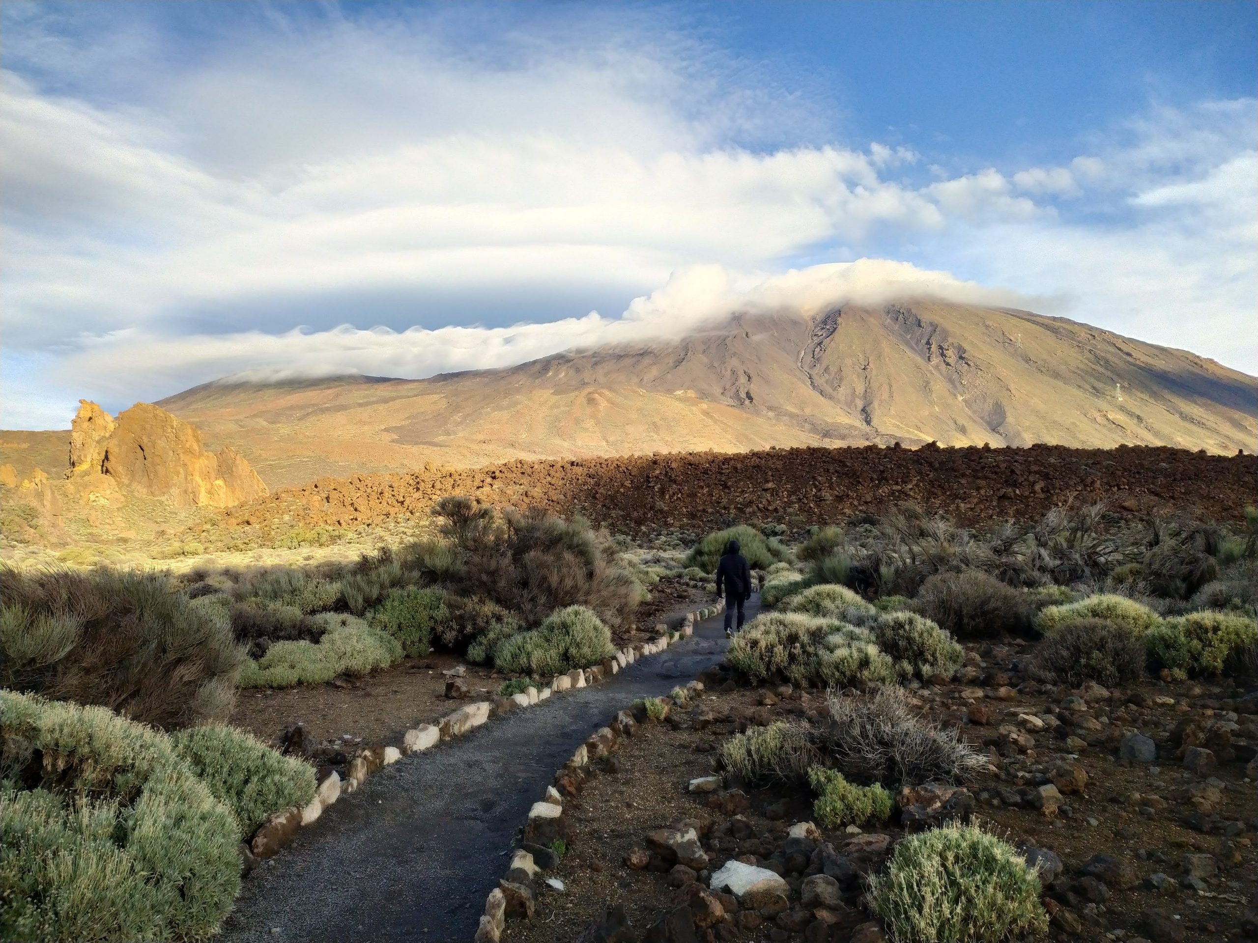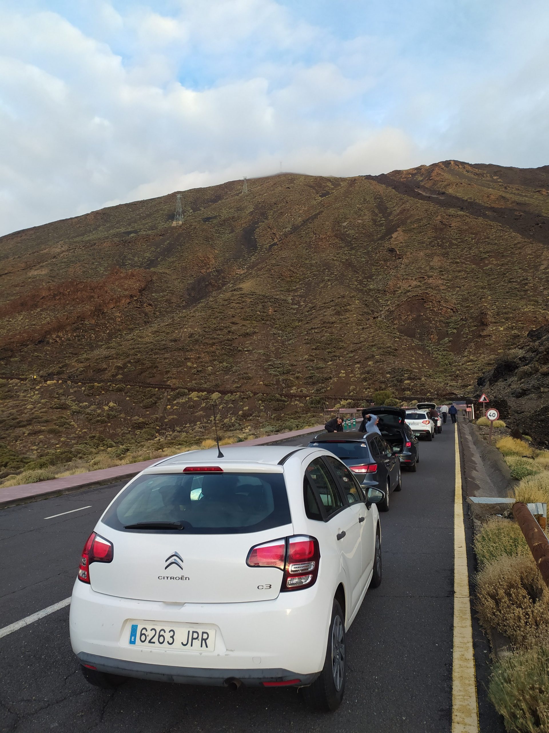 Zatrzymaliśmy się na parkingu niedaleko kolejki, bo szlabany by podjechać bliżej były zamknięte. Poszłam się zorientować co się dzieje, wisiał na nich napis, że droga ze względów bezpieczeństwa jest zamknięta zarówno dla pieszych jak i dla aut. Po chwili przyjechali inni turyści i ustawili się w kolejce pod szlabanem. To byli Hiszpanie, którzy od poniedziałku tu przyjeżdżają i próbują wjechać na wulkan, ale niestety ze względów pogodowych wciąż jest to niemożliwe. Tak było i dziś. Ponieważ miałam wcześniej wykupione bilety, dostałam smsa, w którym napisano, że dziś kolejka nie będzie działać. Mogę rezerwację przełożyć na inny dzień albo skasować. Pracownik parku powiedział, że teraz jest okres mocniejszych wiatrów w górach i trudno przewidzieć kiedy pogoda się poprawi. Dostałam od pana mapkę, na której zaznaczył mi kilka ciekawych szlaków i postanowiliśmy pochodzić po okolicy.