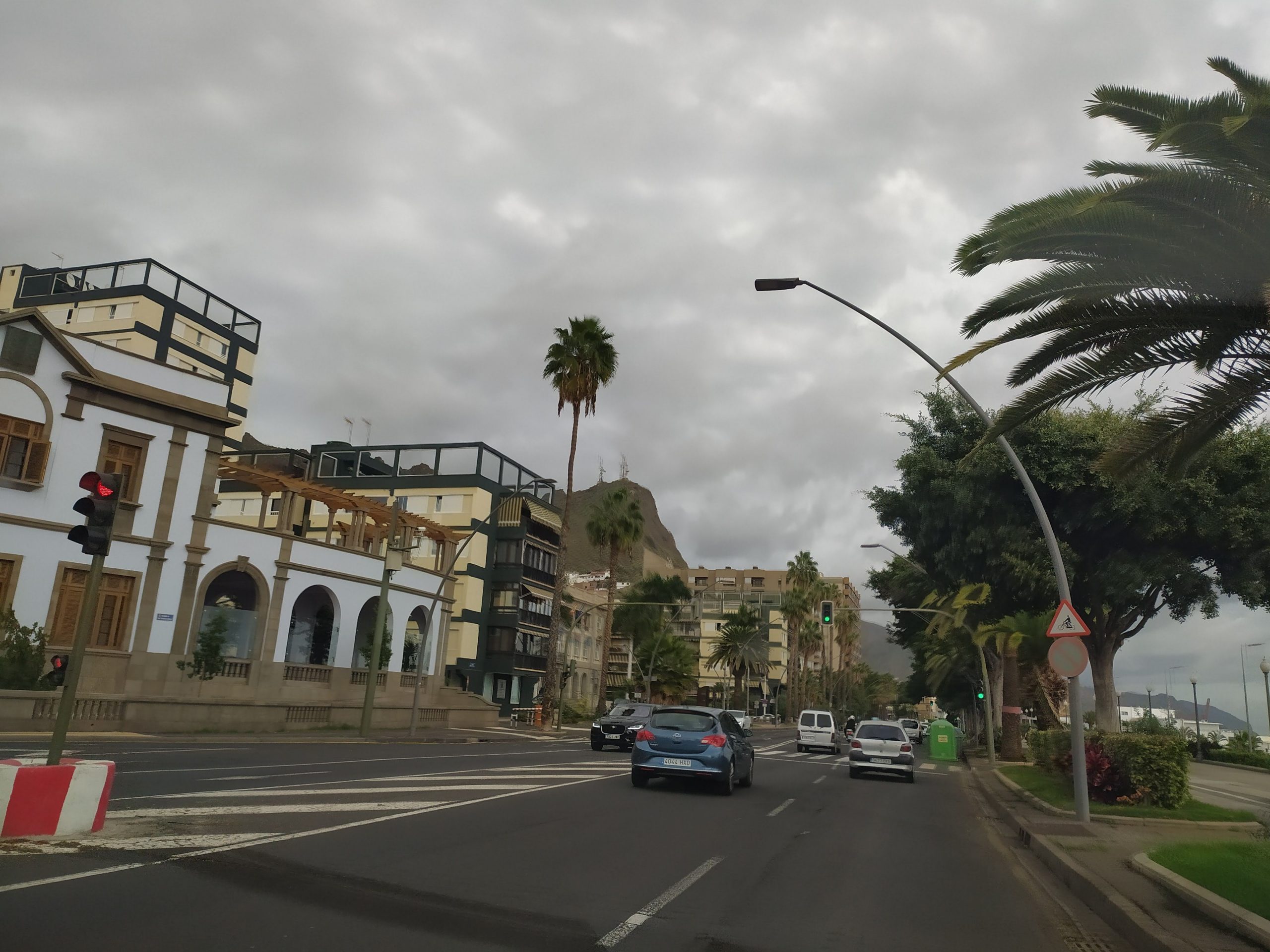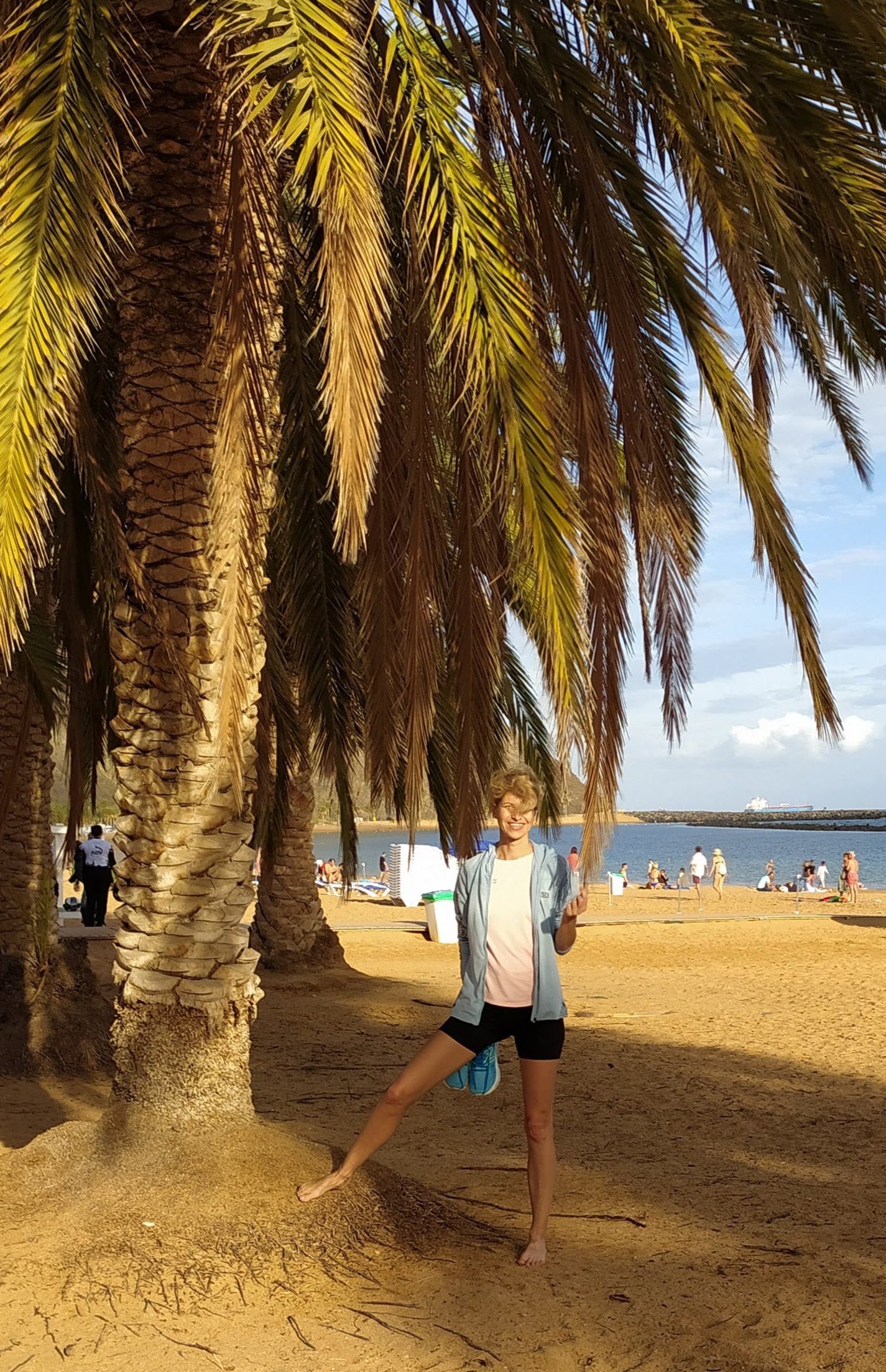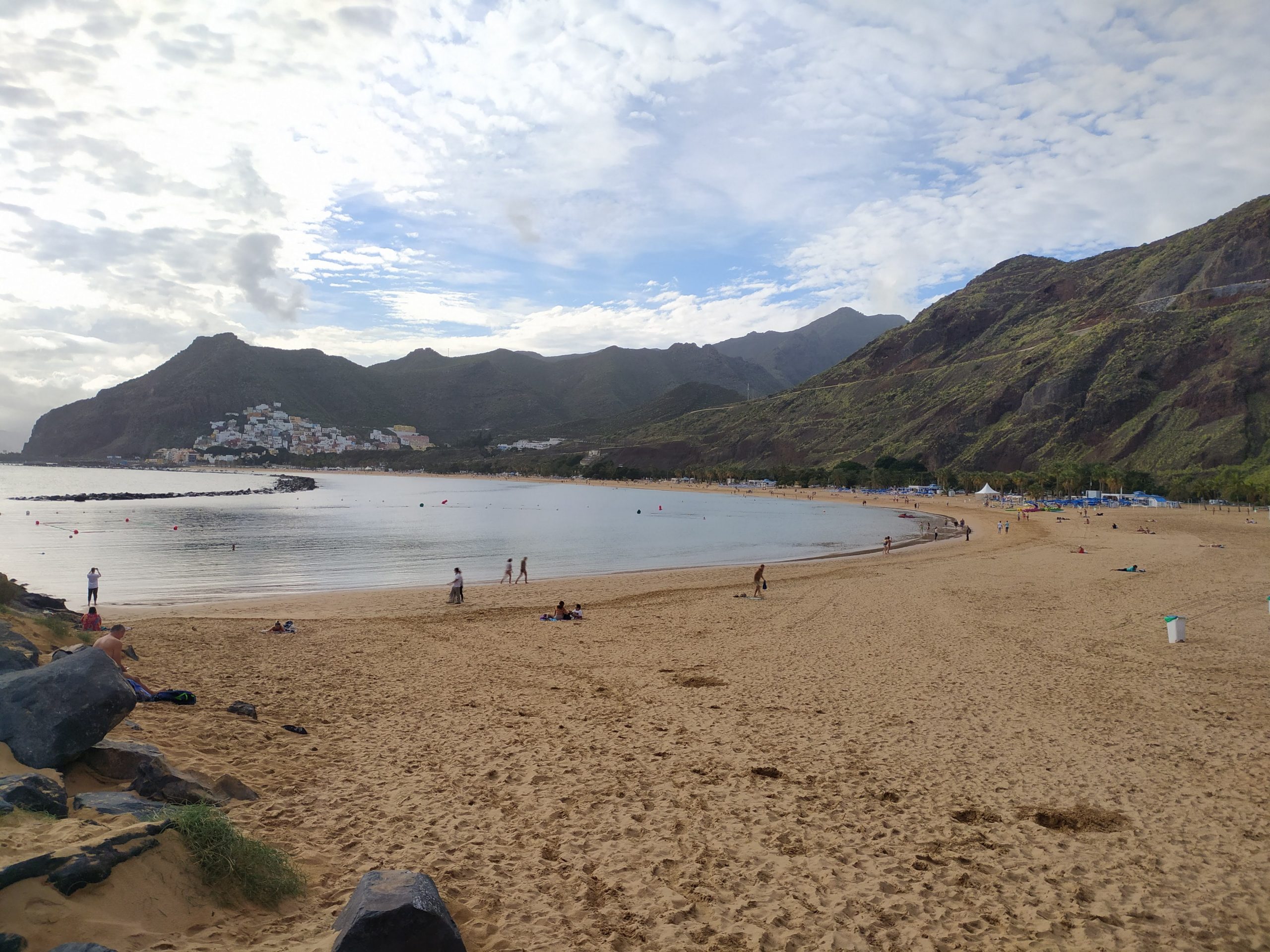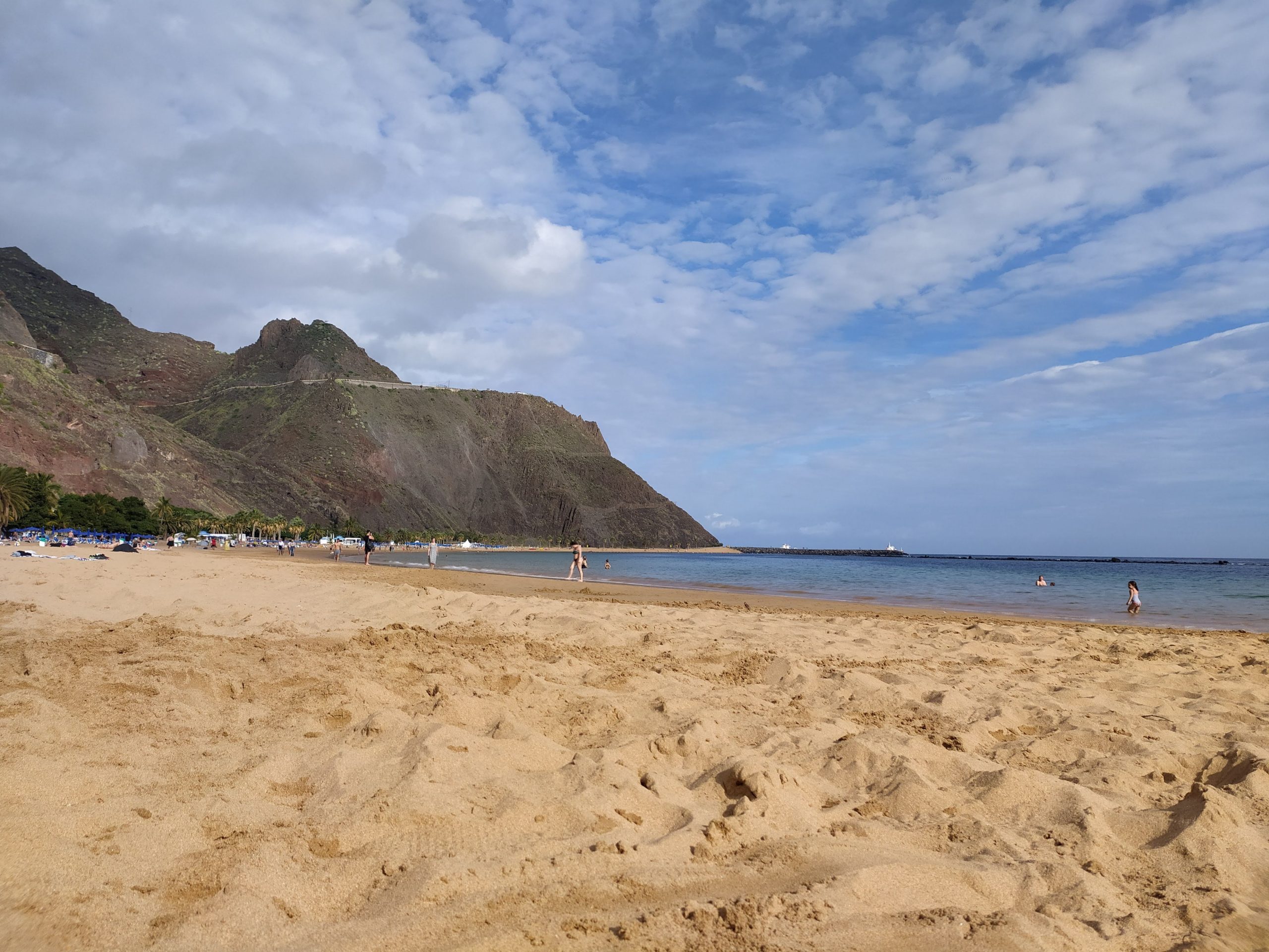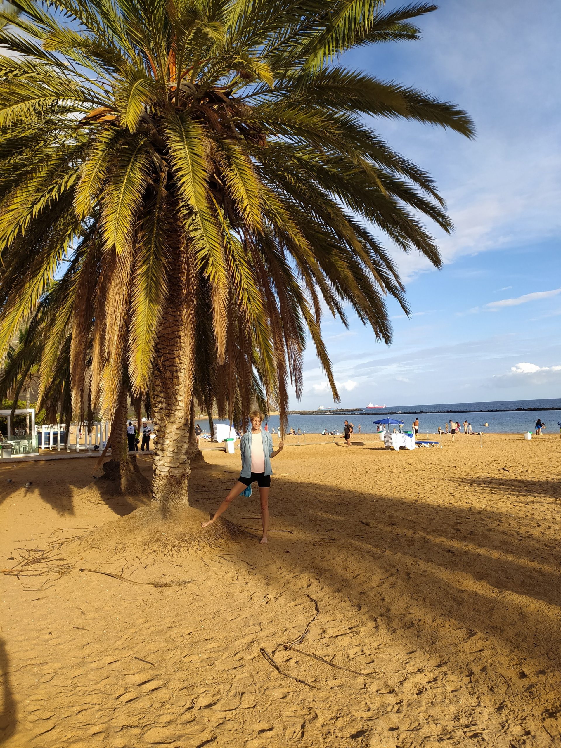 Mocno rozczarowani ruszyliśmy nad ocean, mieliśmy ochotę już tylko się położyć. Ta strona wyspy, wschodnia jest bardziej przemysłowa, pustynna, jak dla nas brzydsza. Dojechaliśmy do stolicy, Santa Cruz. Bardzo duże miasto i przynajmniej jego część nadmorska okropnie brzydka. Wielki port przeładunkowy, kontenery, wielkie żurawie, silosy z paliwem i inne industrialne ustrojstwa. Przy brzegu olbrzymie wycieczkowce. To zdecydowanie nie nasze klimaty. Za miastem znajduje się mniejsze miasteczko, wtopione w zbocza gór, San Andres. Tu jest też słynna złota plaża, Playa de Teresitas, z usypanym sztucznie piaskiem z Sahary. Wzdłuż plaży rosną palmy, na plaży sporo ludzi. Nas nie zachwyciła, dużo bardziej podobają nam się czarne małe plaże i zatoczki po wschodniej stronie. Ale byliśmy mocno zmęczeni jazdą więc chcieliśmy już odpocząć gdziekolwiek. Usypałam sobie starym zwyczajem poduszkę z piasku i zaległam. Miło było poleżeć trochę. Na kolację pojechaliśmy do Garachico. Super małe miasteczko niedaleko Icod. Knajpki nad brzegiem oceanu, wąskie uliczki, klimatyczna zabudowa. To jest to!