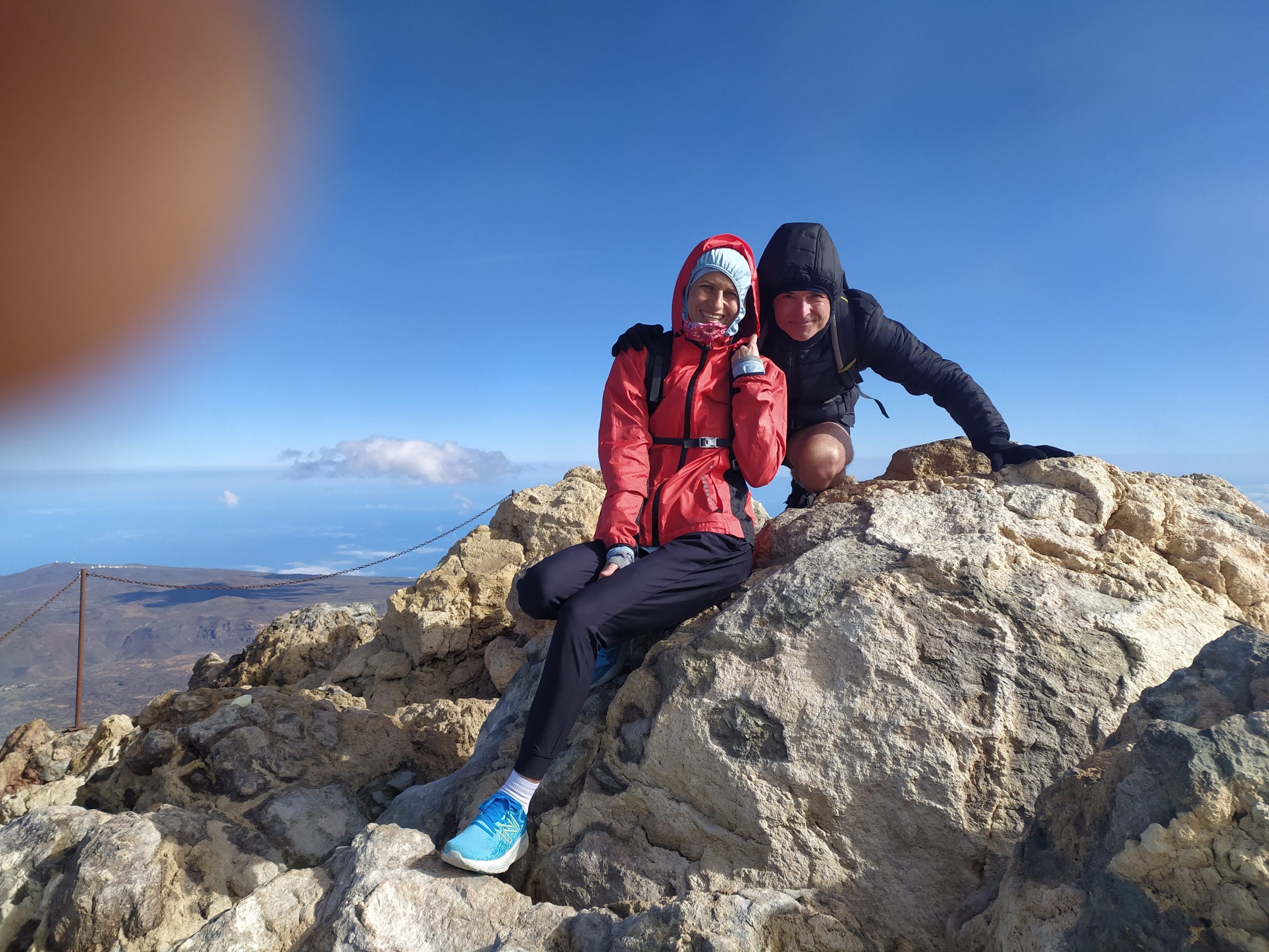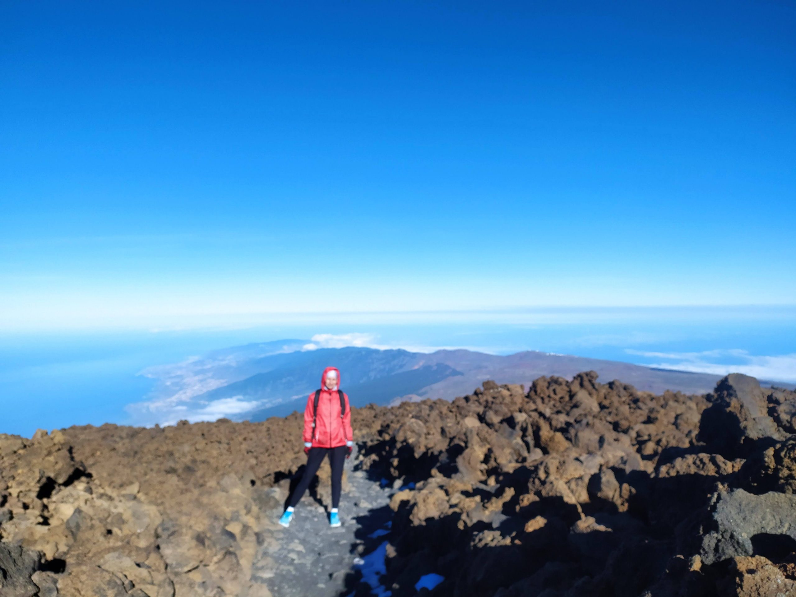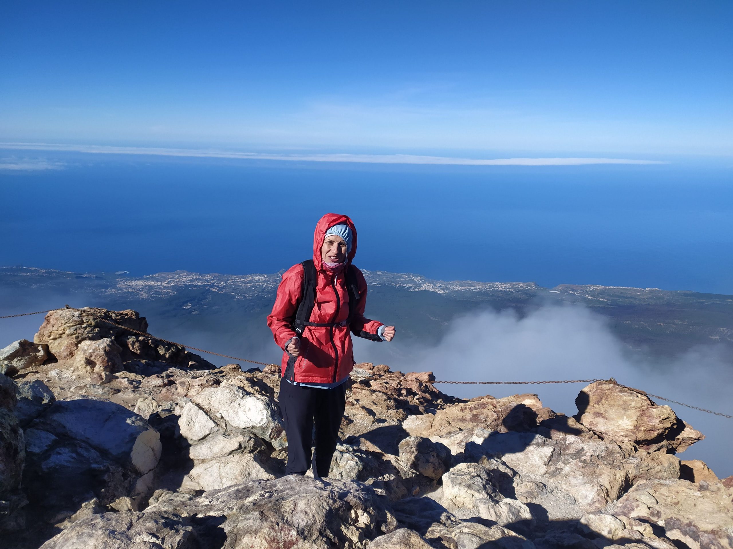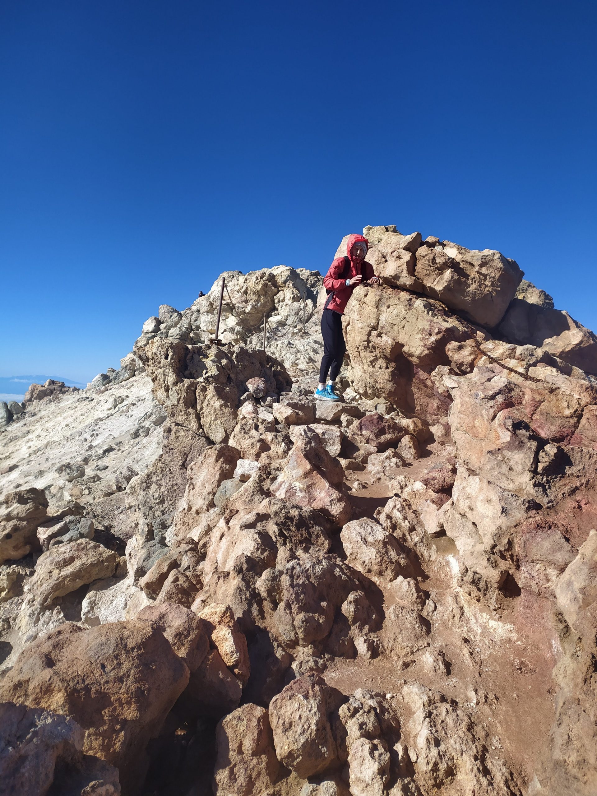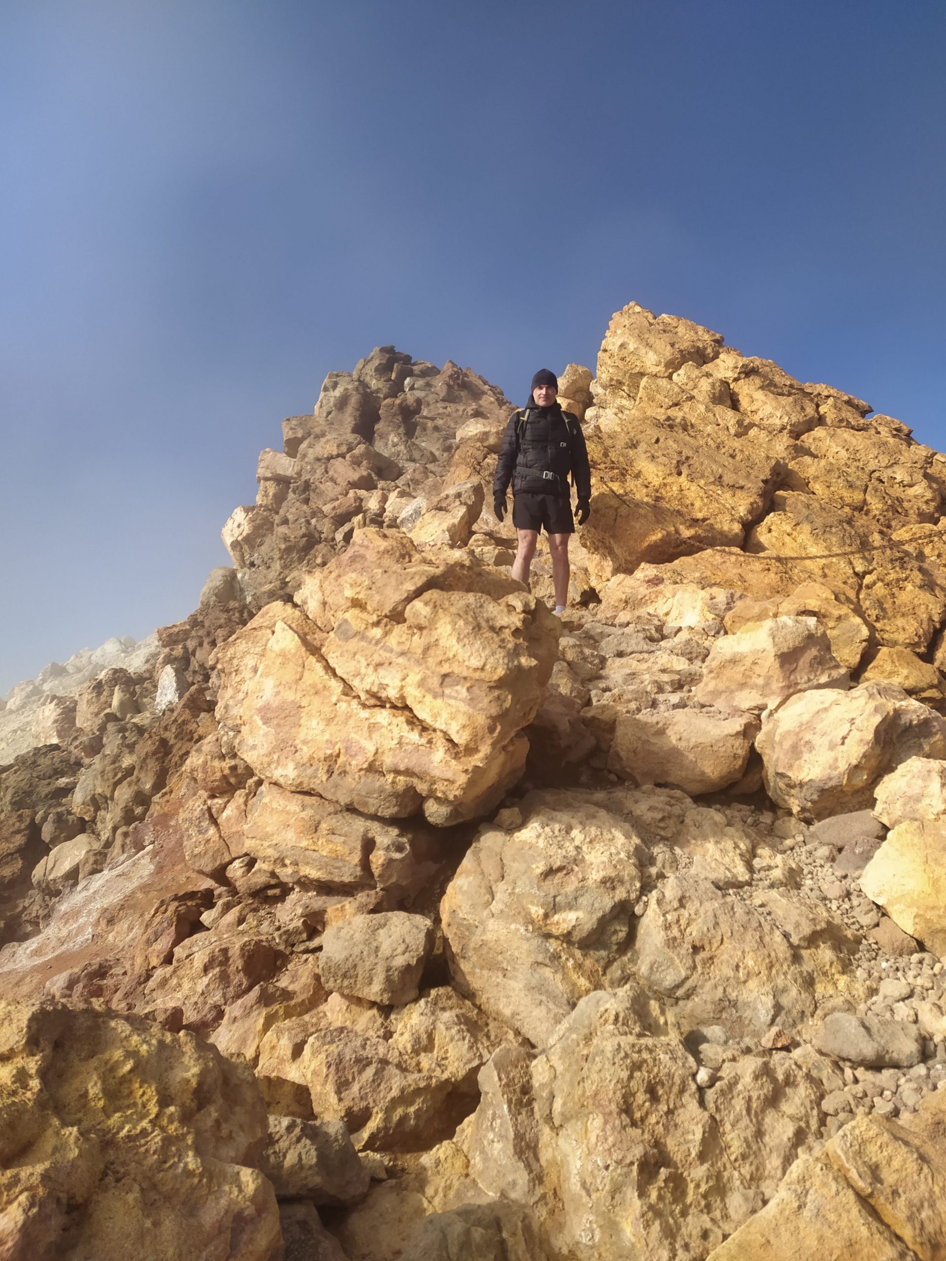 Gdy doszliśmy pod kolejkę, mimo zmęczenia żal było nie iść na sam szczyt. Ubraliśmy ciepłe ciuchy i momentami wspinaliśmy się na czworakach. Stawaliśmy co kilkadziesiąt metrów, by uspokoić oddech. Chodzenie po górach, to nie to samo co bieganie… Po 30 min byliśmy na samym czubku wulkanu! W sumie całość z poziomu parkingu zajęła nam 3,5h. Zapach siarki, szybko przelatujące chmury, widoki na ocean i zbocza wulkanu.