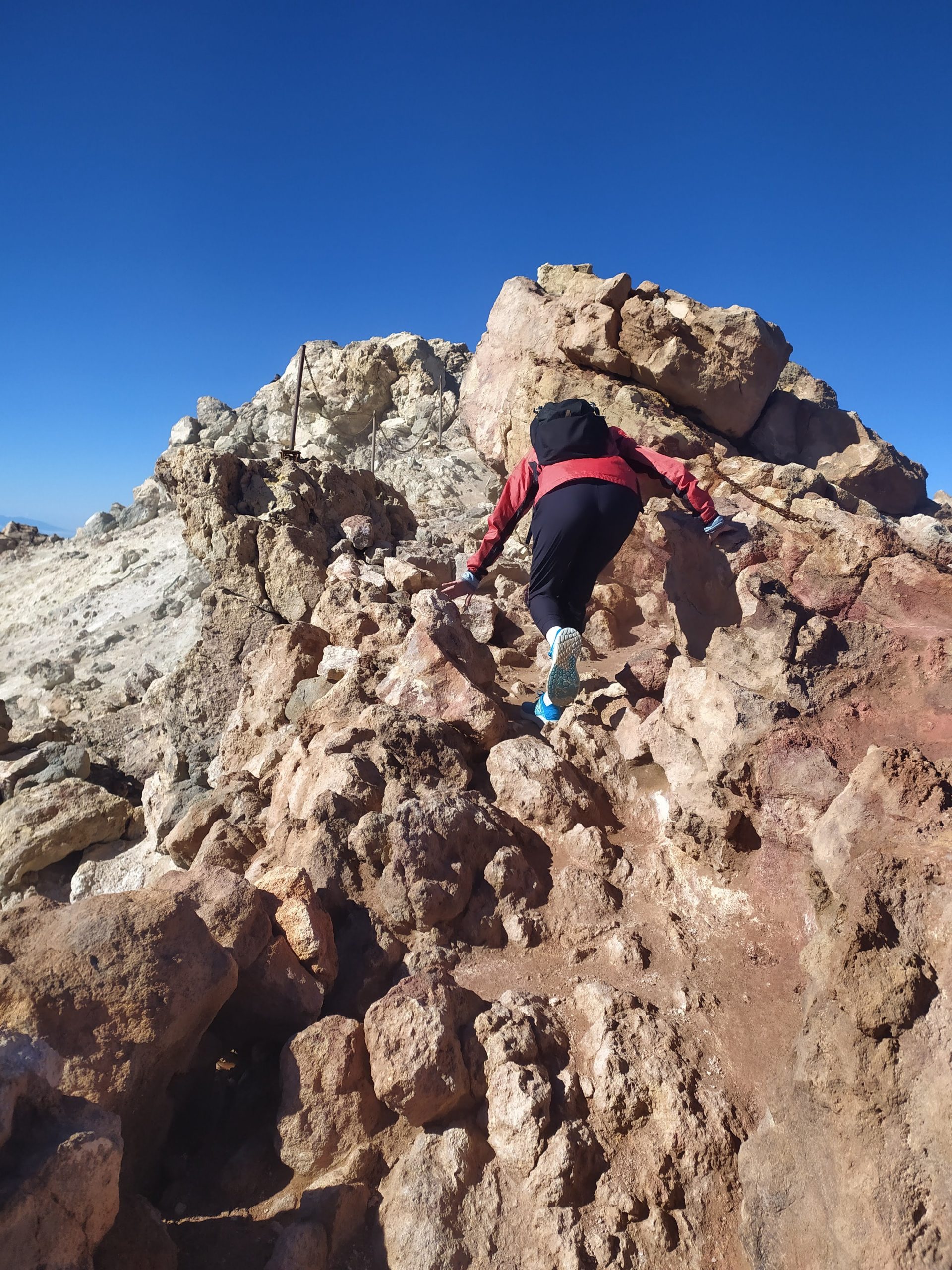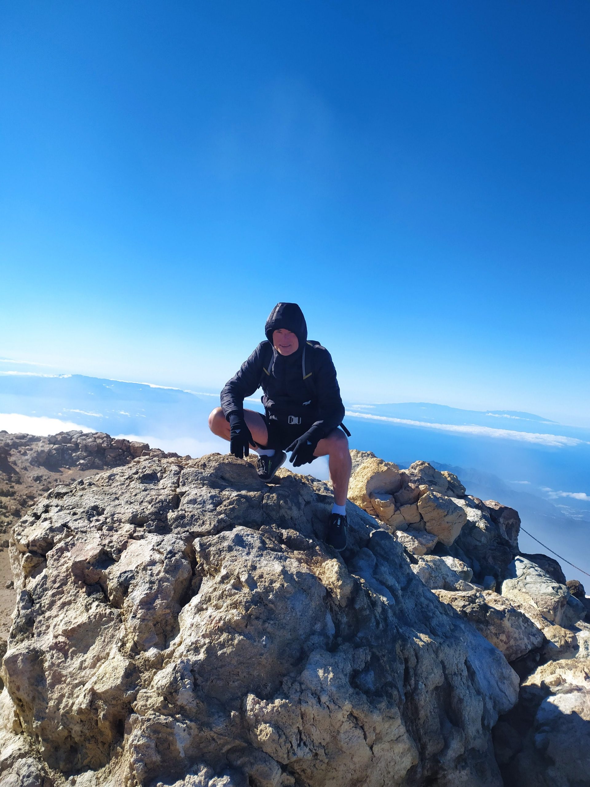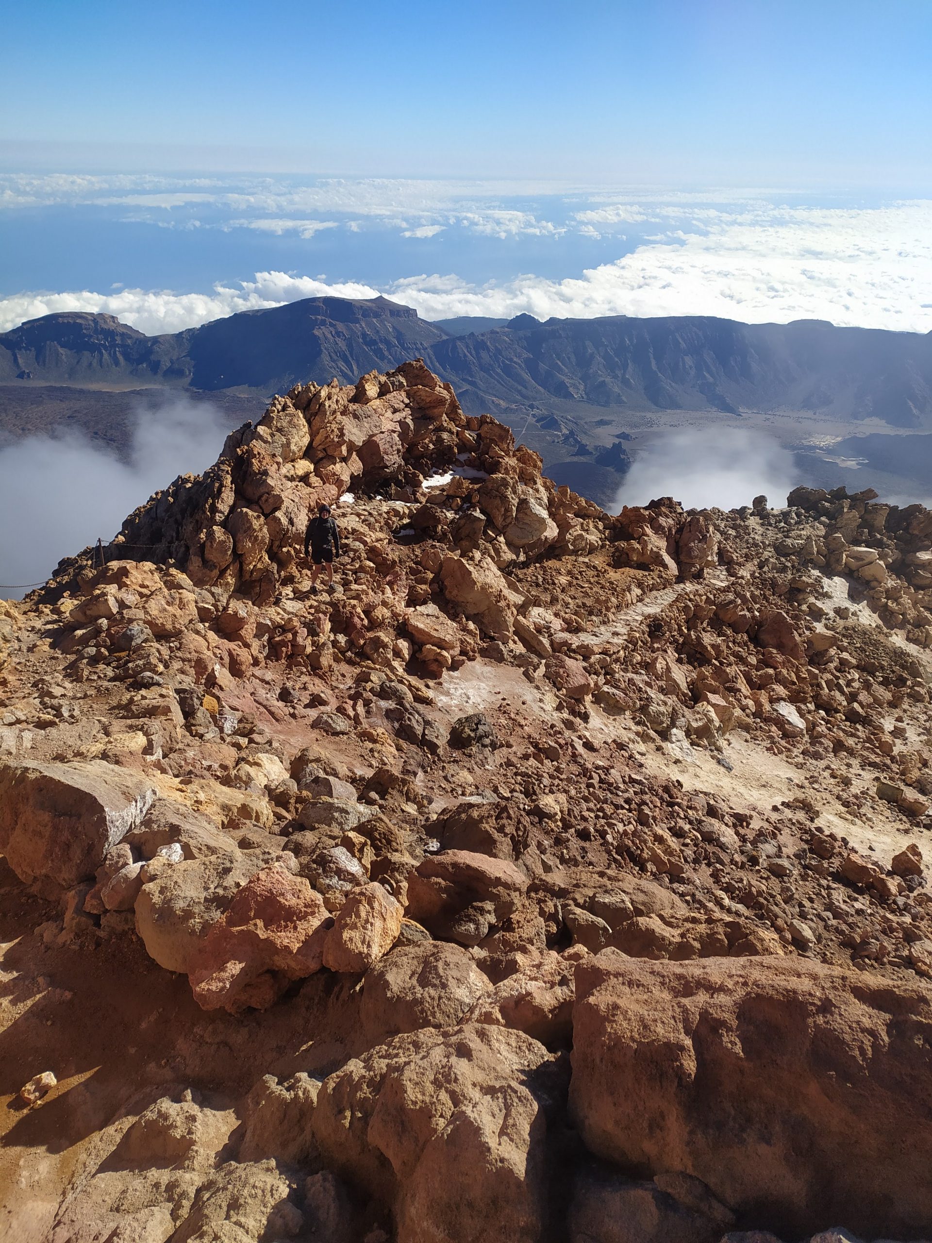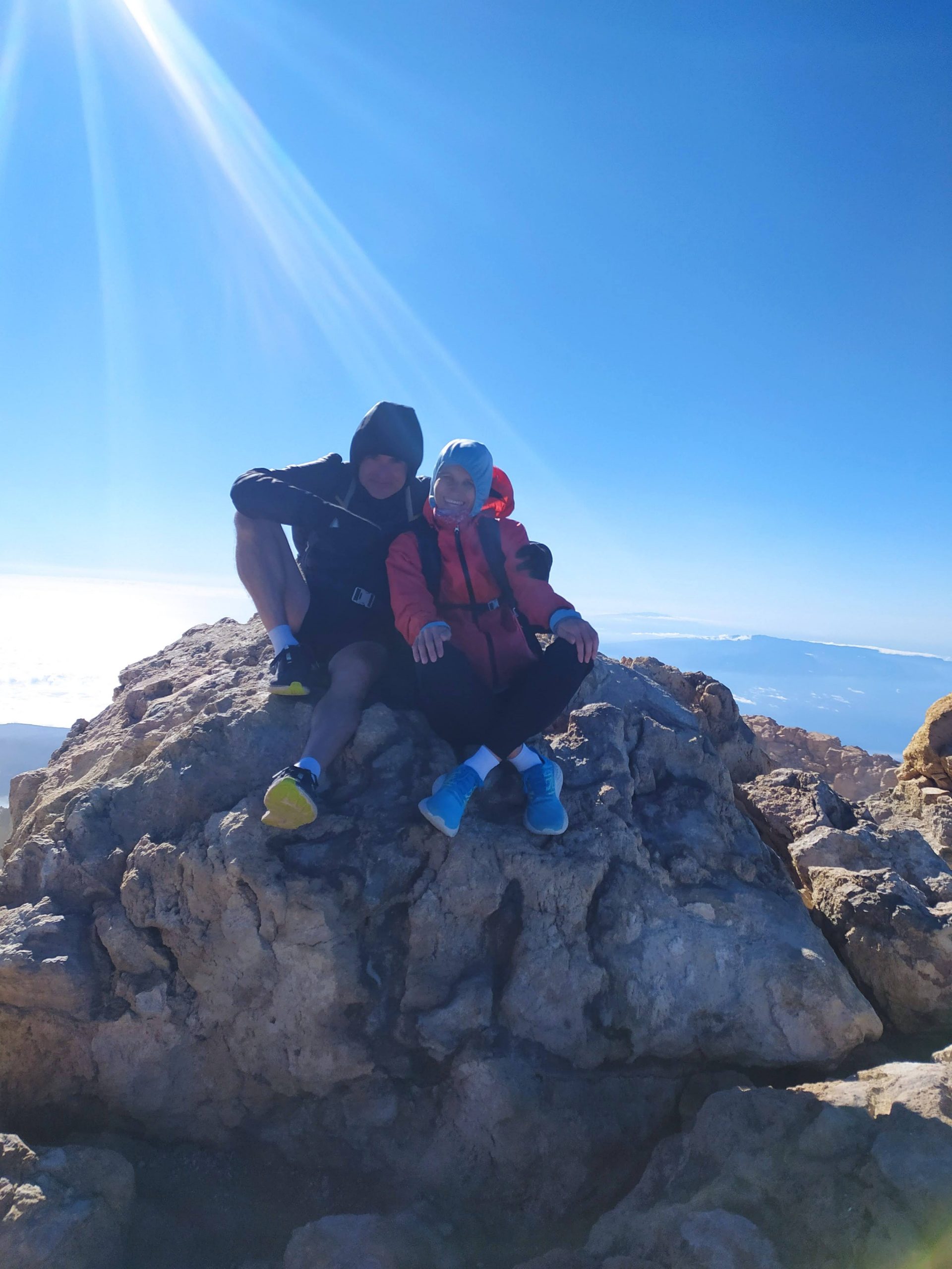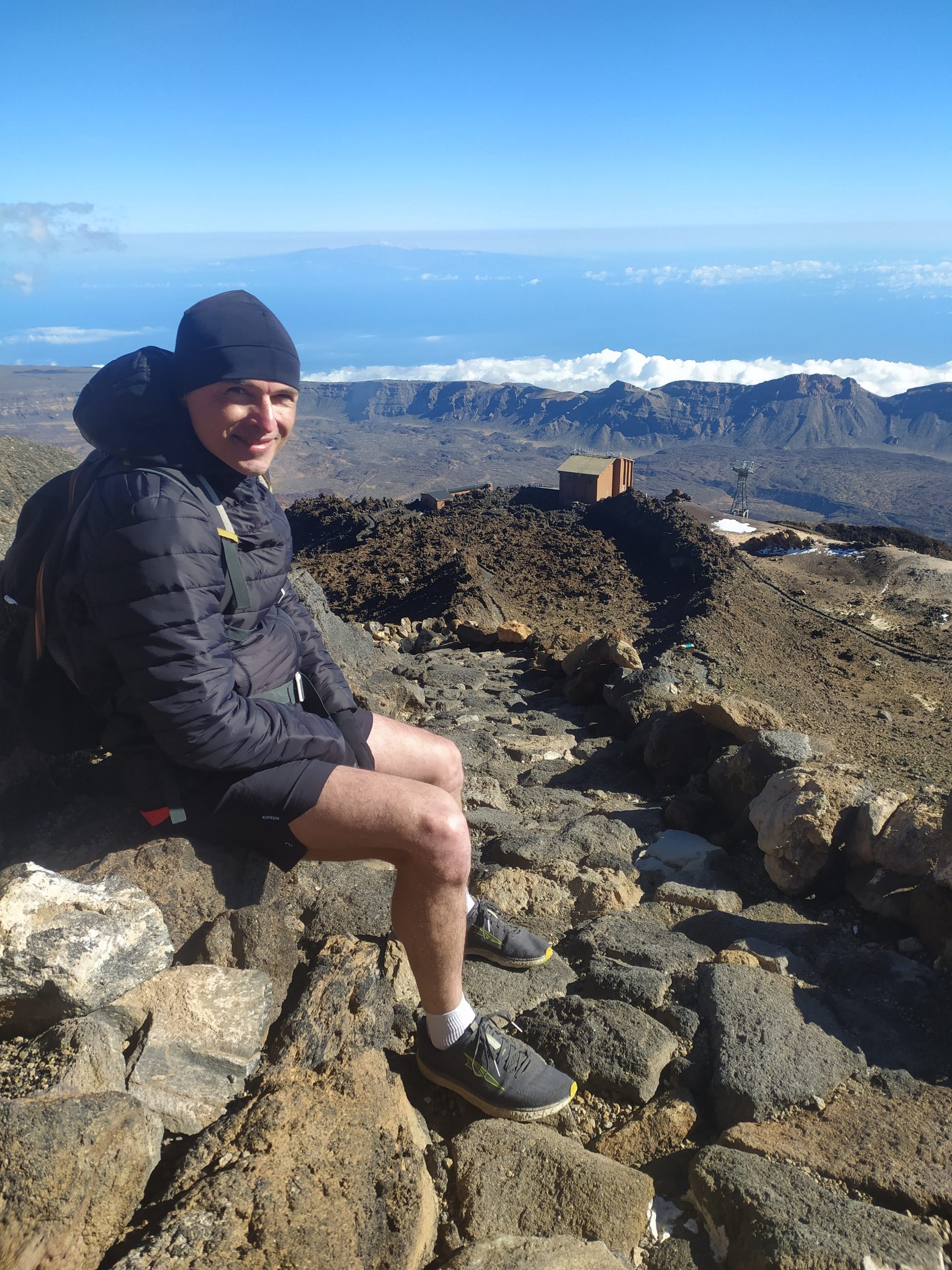 Gdy doszliśmy pod kolejkę, mimo zmęczenia żal było nie iść na sam szczyt. Ubraliśmy ciepłe ciuchy i momentami wspinaliśmy się na czworakach. Stawaliśmy co kilkadziesiąt metrów, by uspokoić oddech. Chodzenie po górach, to nie to samo co bieganie… Po 30 min byliśmy na samym czubku wulkanu! W sumie całość z poziomu parkingu zajęła nam 3,5h. Zapach siarki, szybko przelatujące chmury, widoki na ocean i zbocza wulkanu.