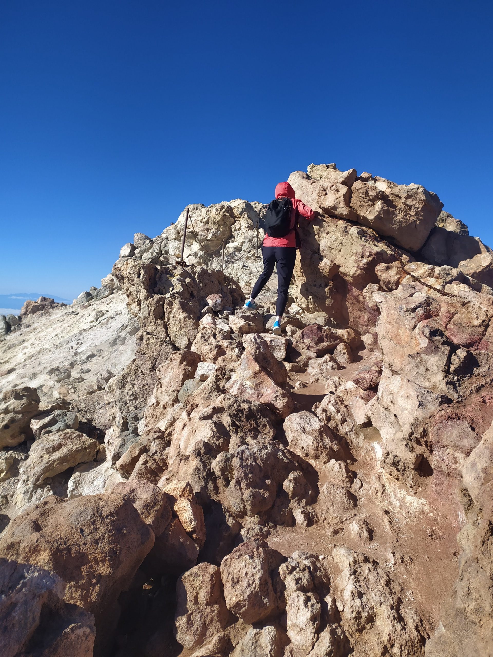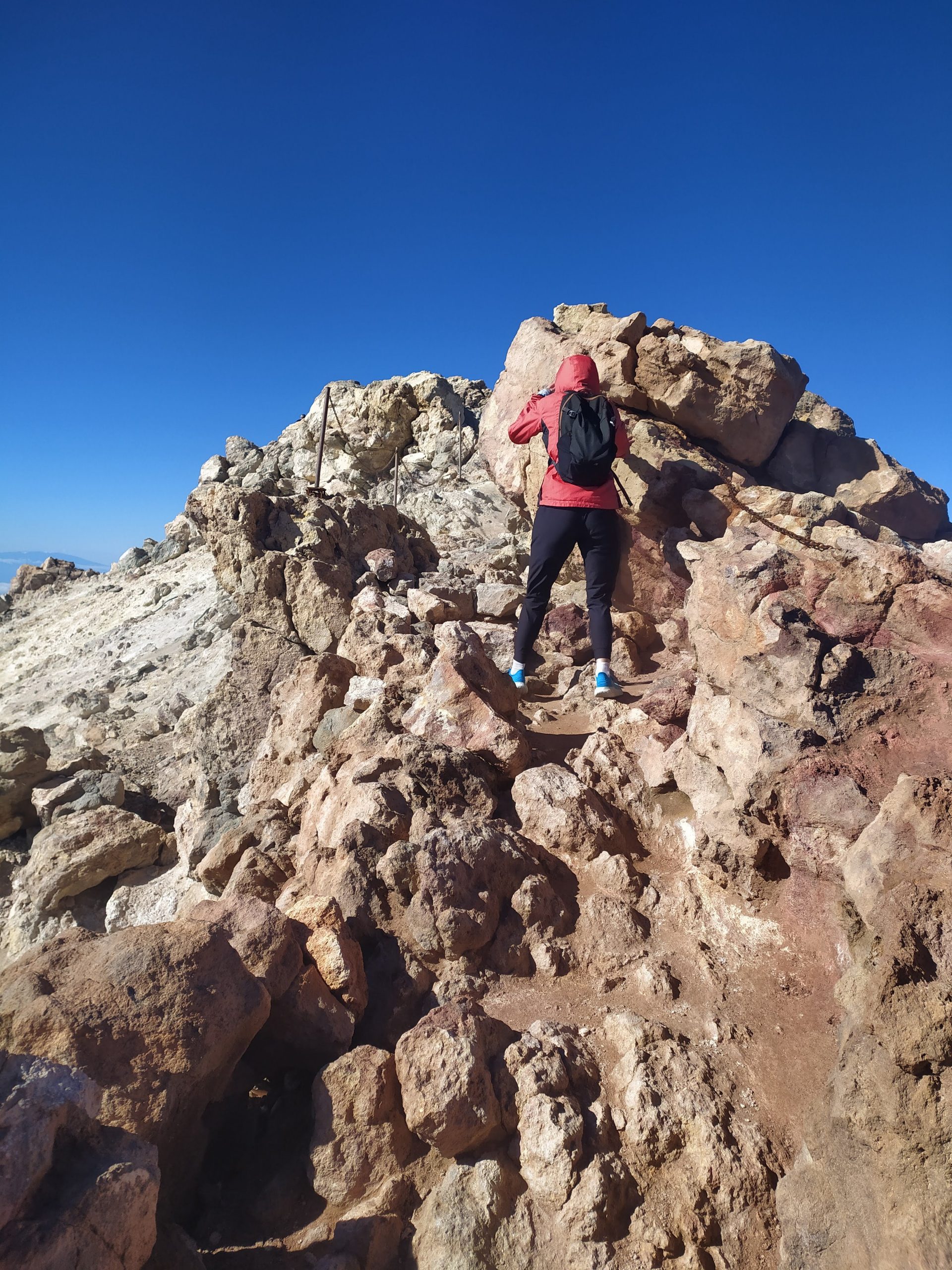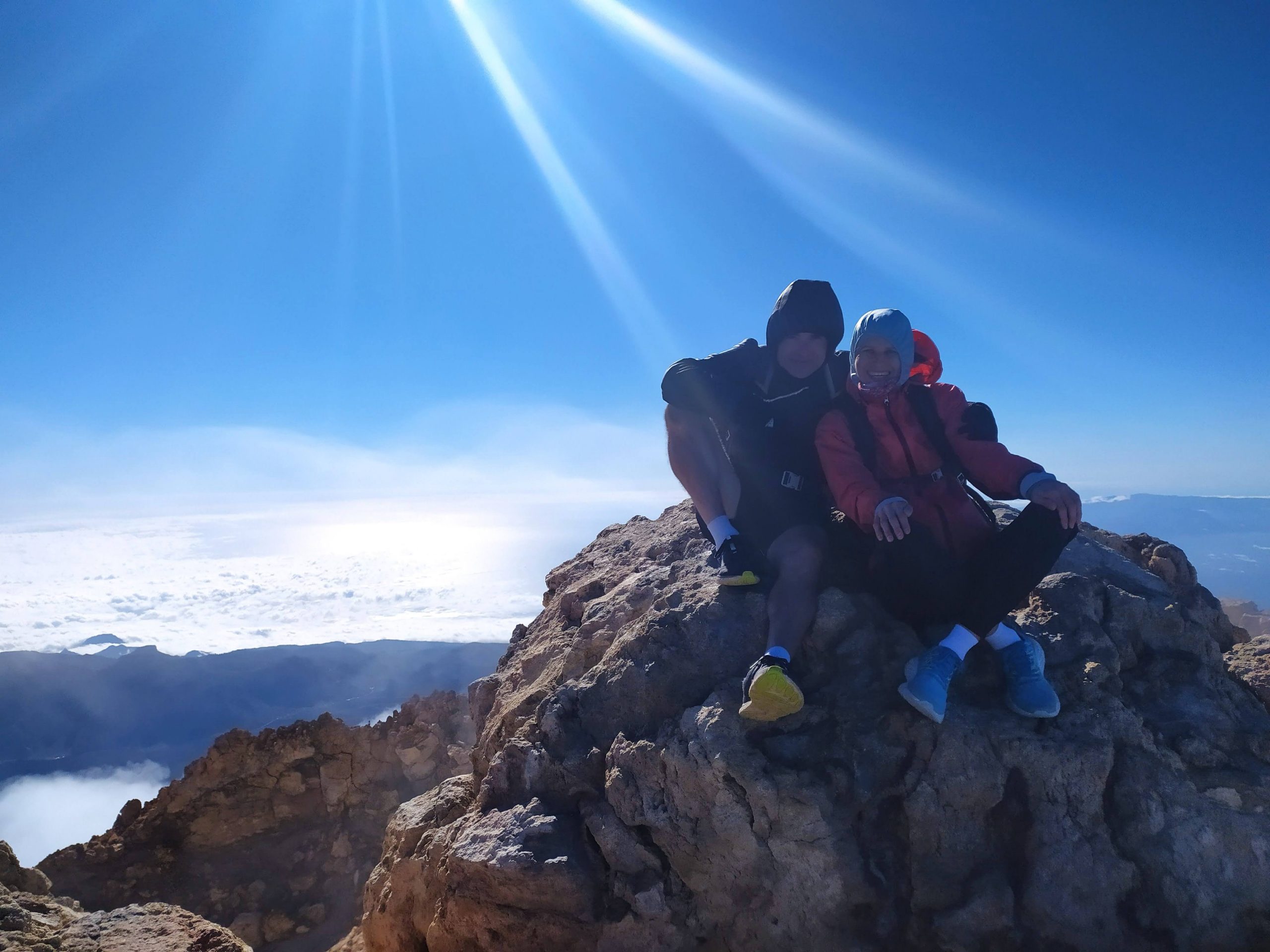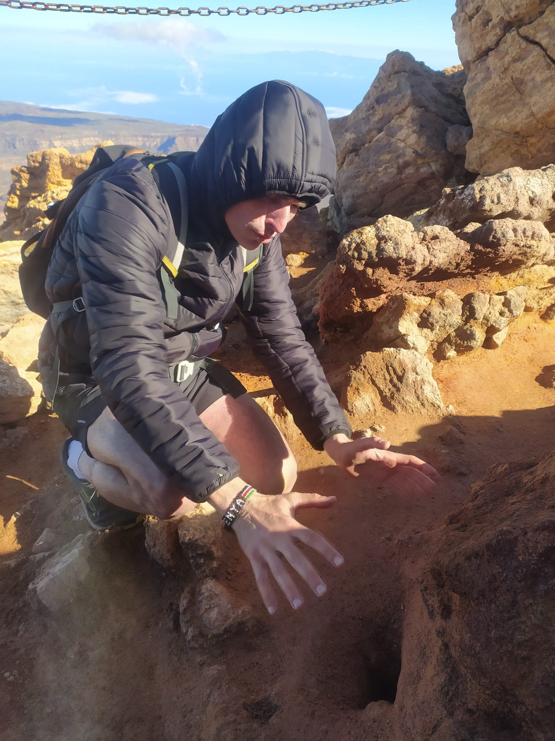 Gdy doszliśmy pod kolejkę, mimo zmęczenia żal było nie iść na sam szczyt. Ubraliśmy ciepłe ciuchy i momentami wspinaliśmy się na czworakach. Stawaliśmy co kilkadziesiąt metrów, by uspokoić oddech. Chodzenie po górach, to nie to samo co bieganie… Po 30 min byliśmy na samym czubku wulkanu! W sumie całość z poziomu parkingu zajęła nam 3,5h. Zapach siarki, szybko przelatujące chmury, widoki na ocean i zbocza wulkanu.