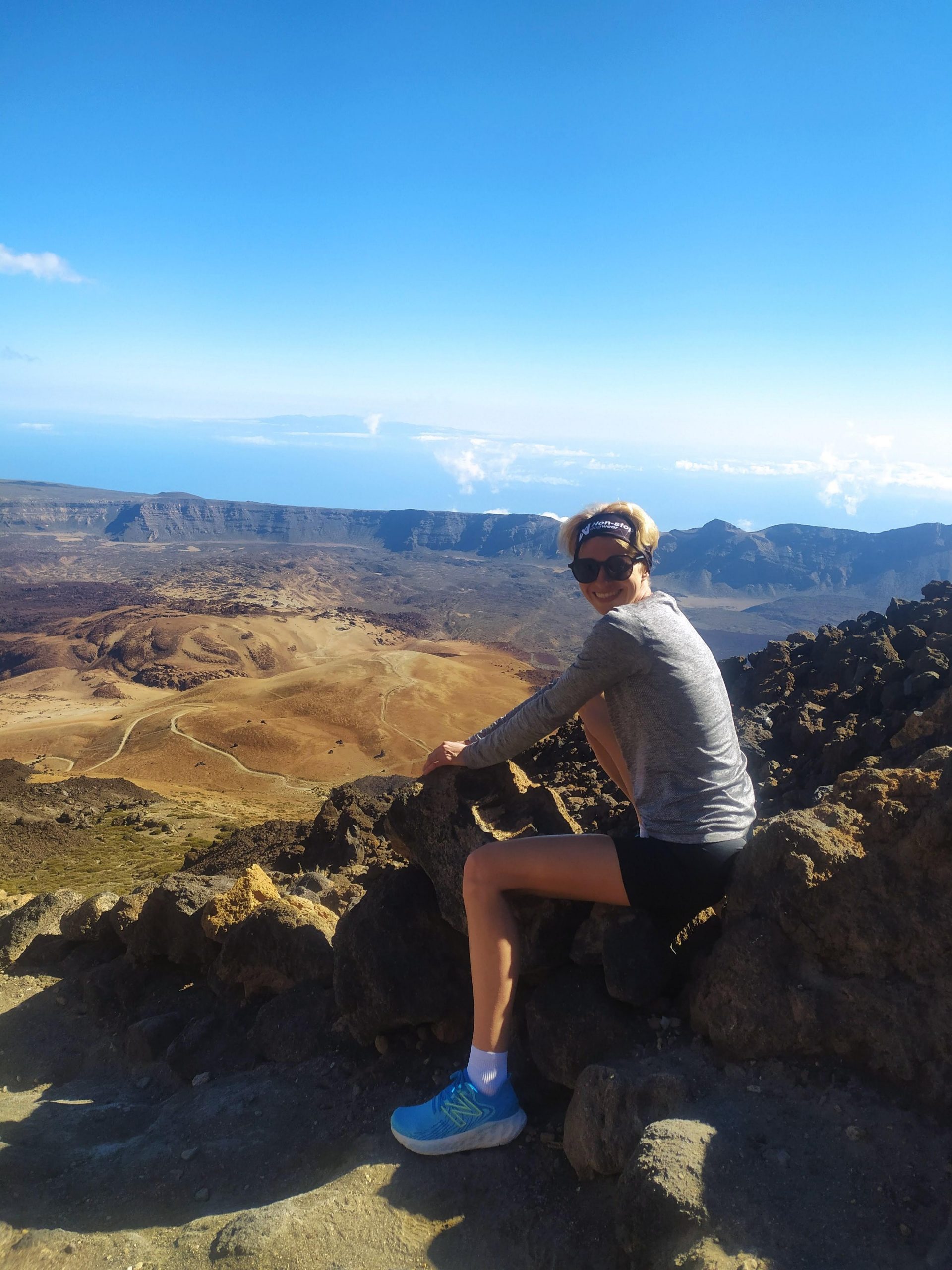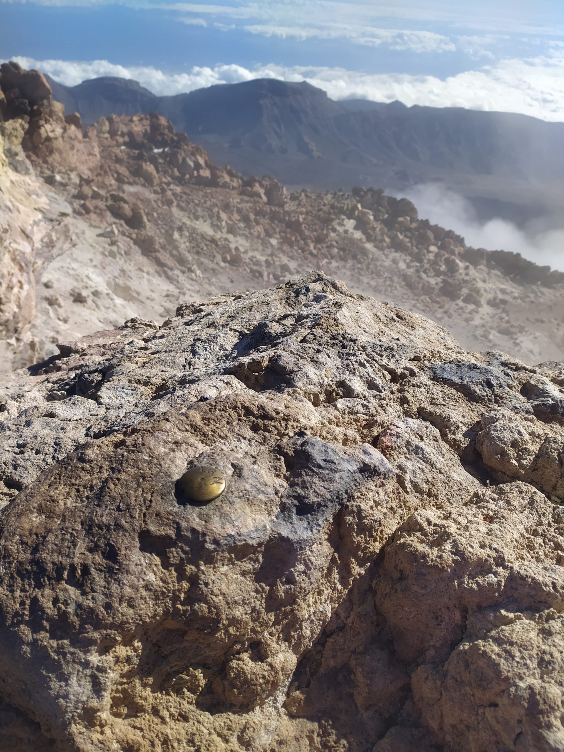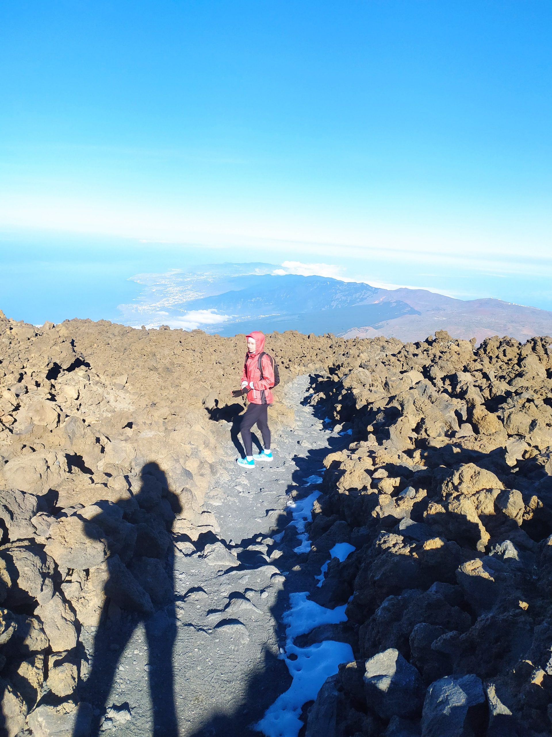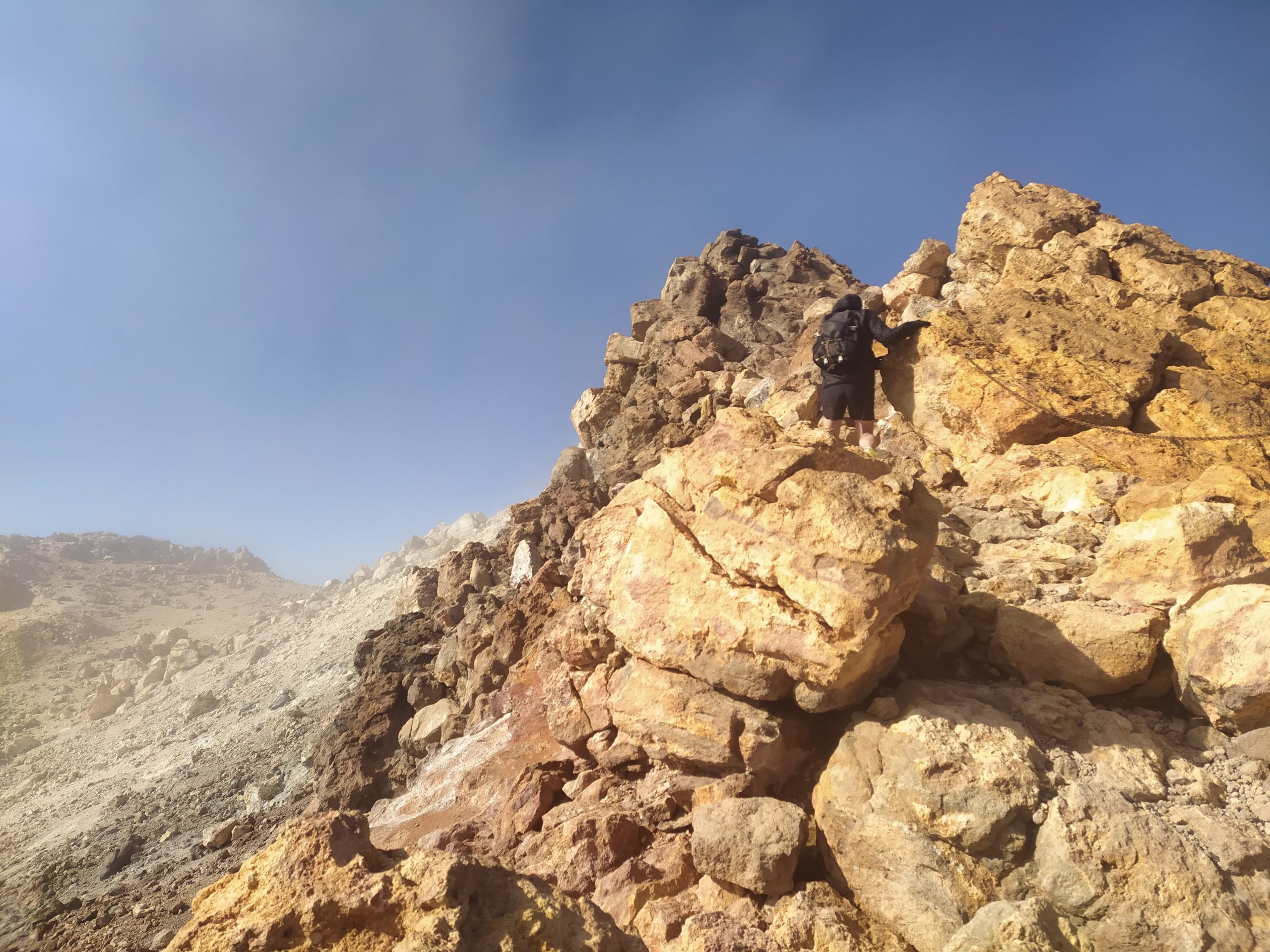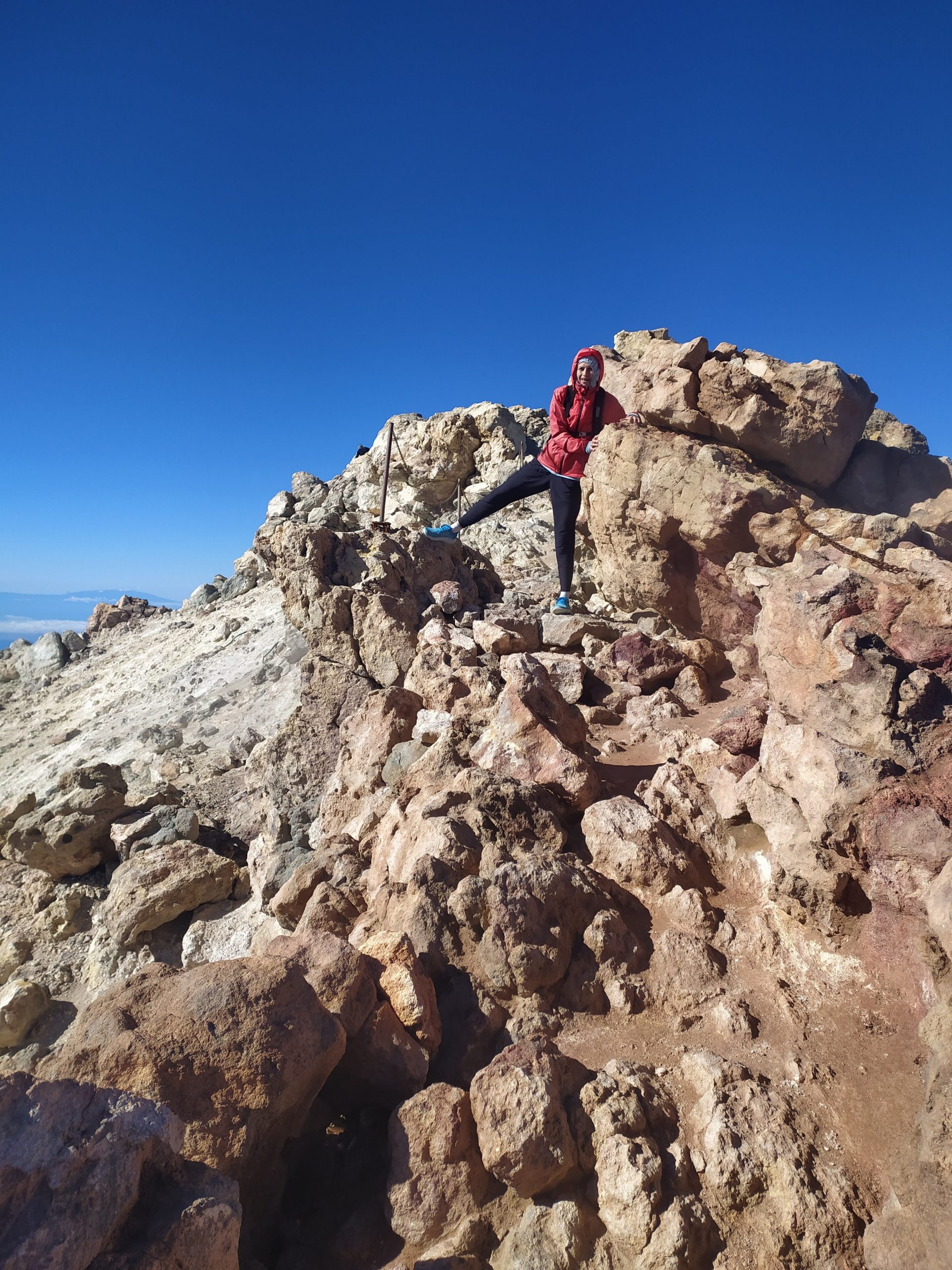 Gdy doszliśmy pod kolejkę, mimo zmęczenia żal było nie iść na sam szczyt. Ubraliśmy ciepłe ciuchy i momentami wspinaliśmy się na czworakach. Stawaliśmy co kilkadziesiąt metrów, by uspokoić oddech. Chodzenie po górach, to nie to samo co bieganie… Po 30 min byliśmy na samym czubku wulkanu! W sumie całość z poziomu parkingu zajęła nam 3,5h. Zapach siarki, szybko przelatujące chmury, widoki na ocean i zbocza wulkanu.