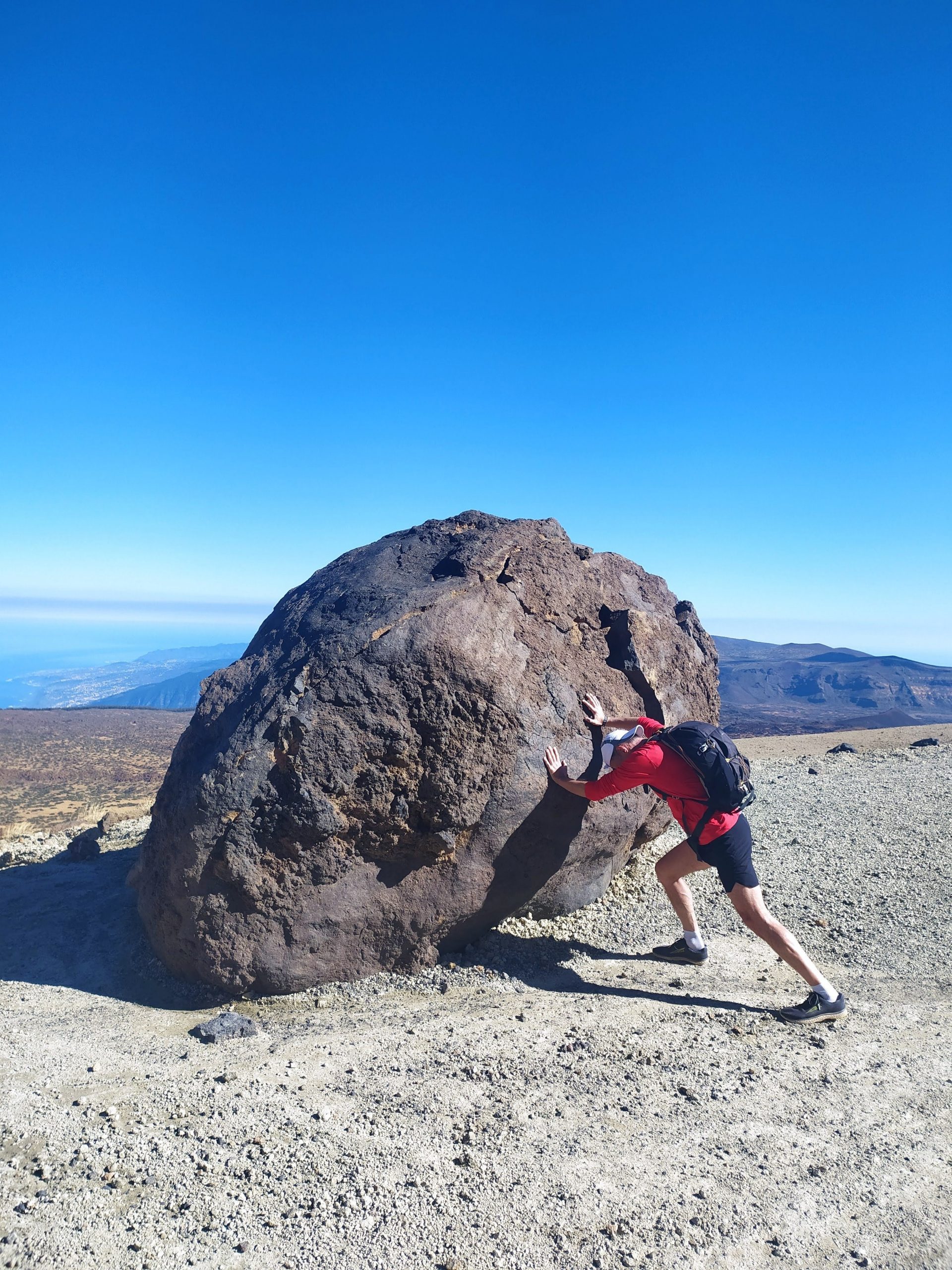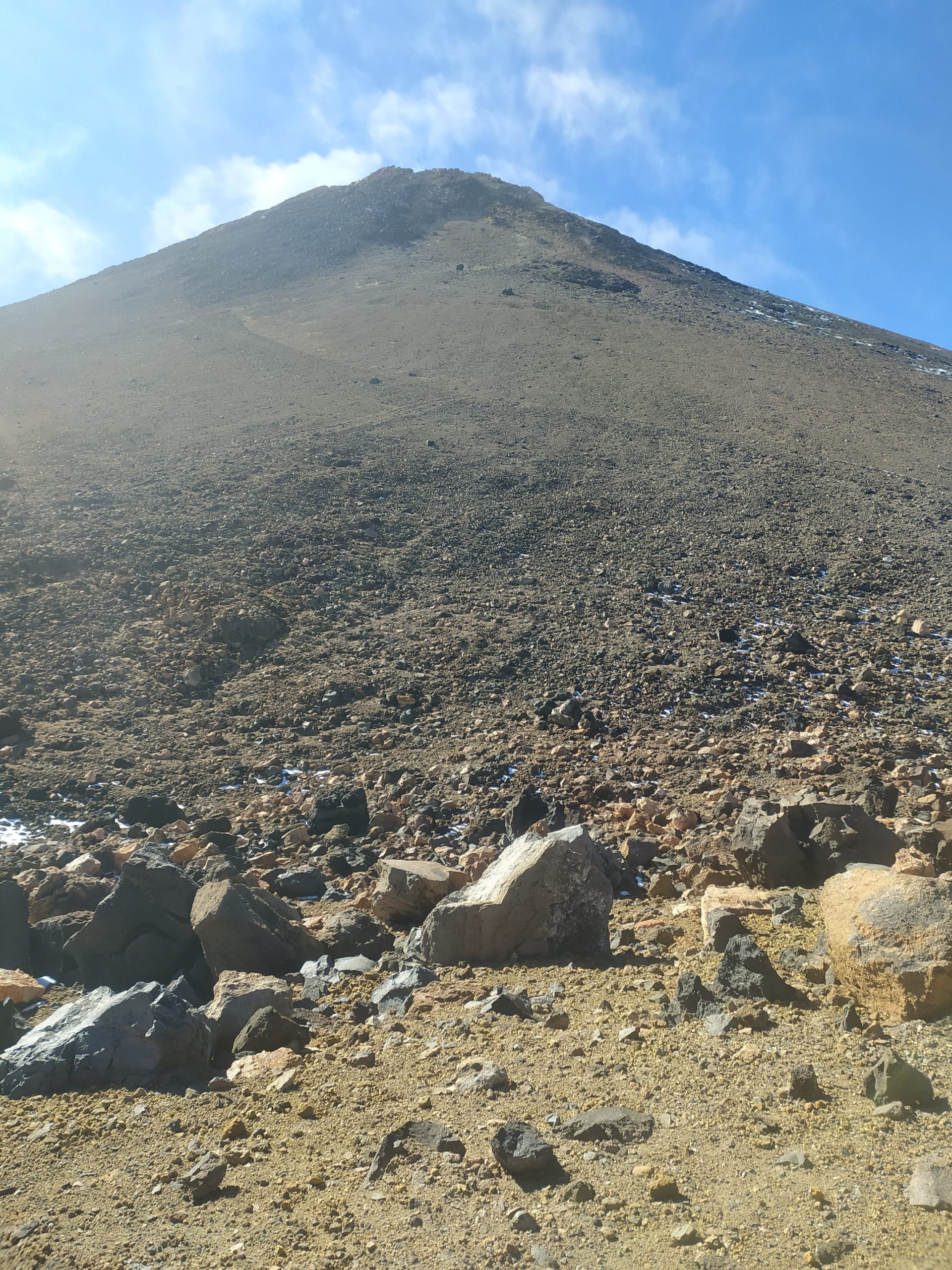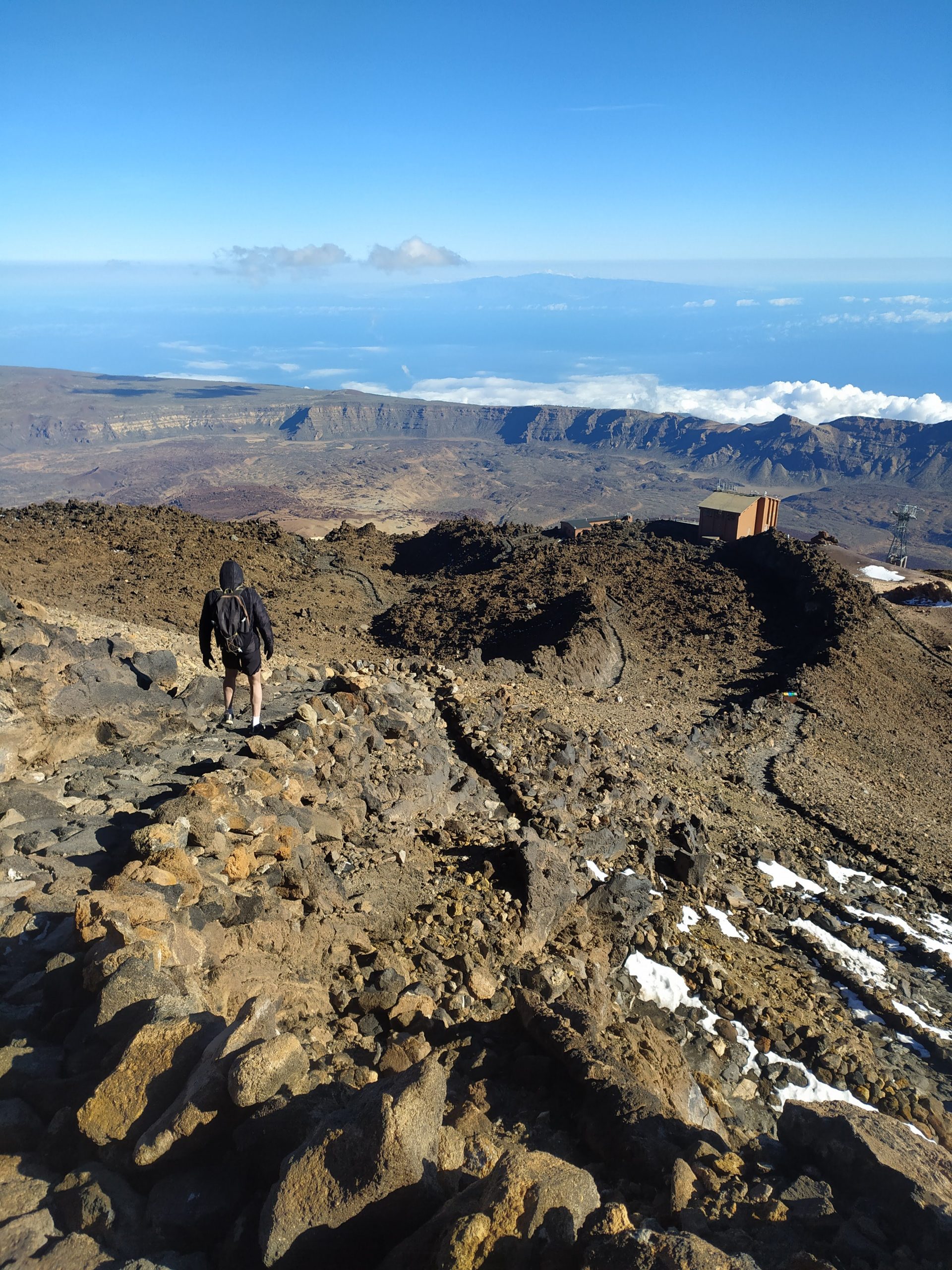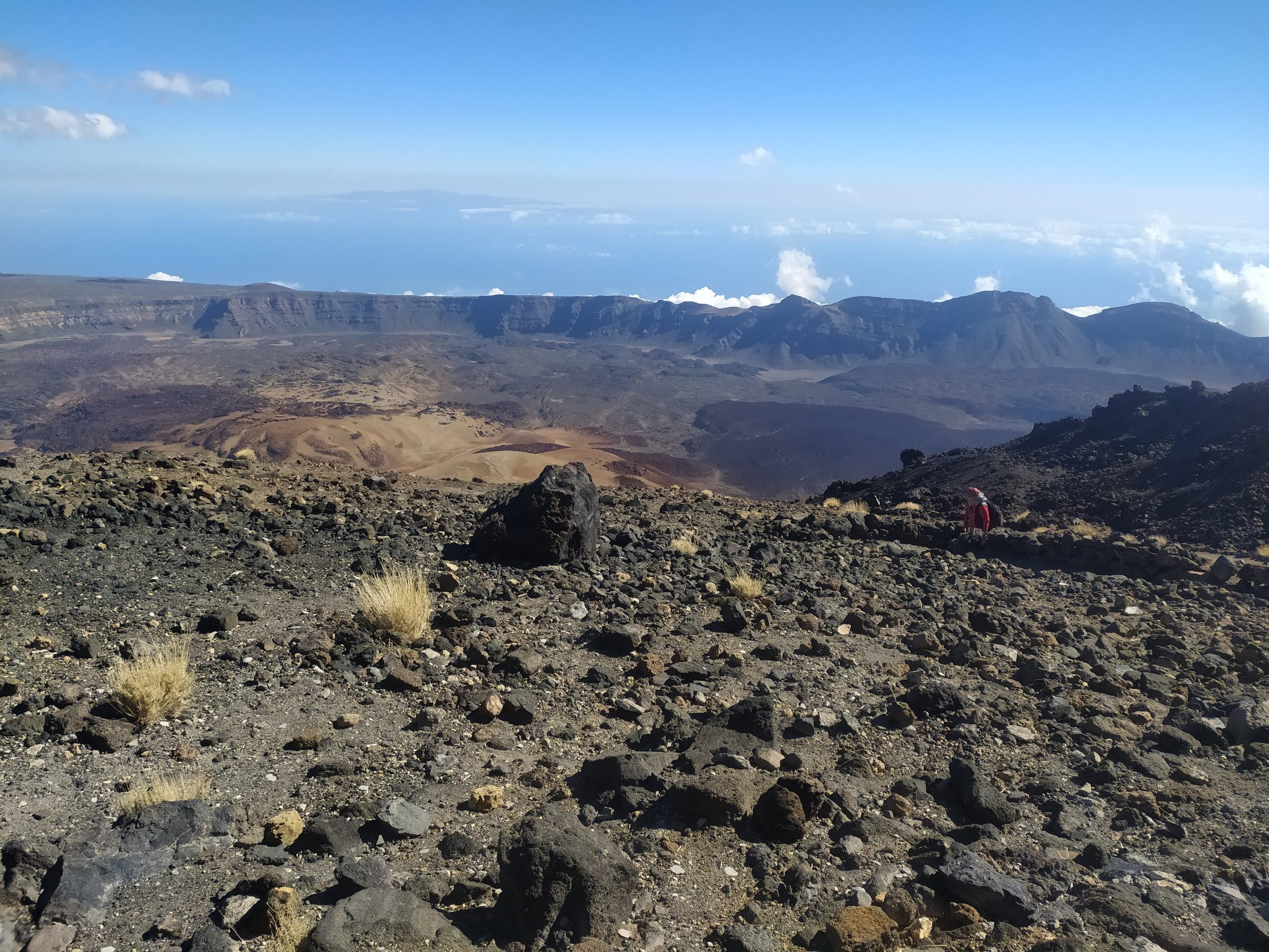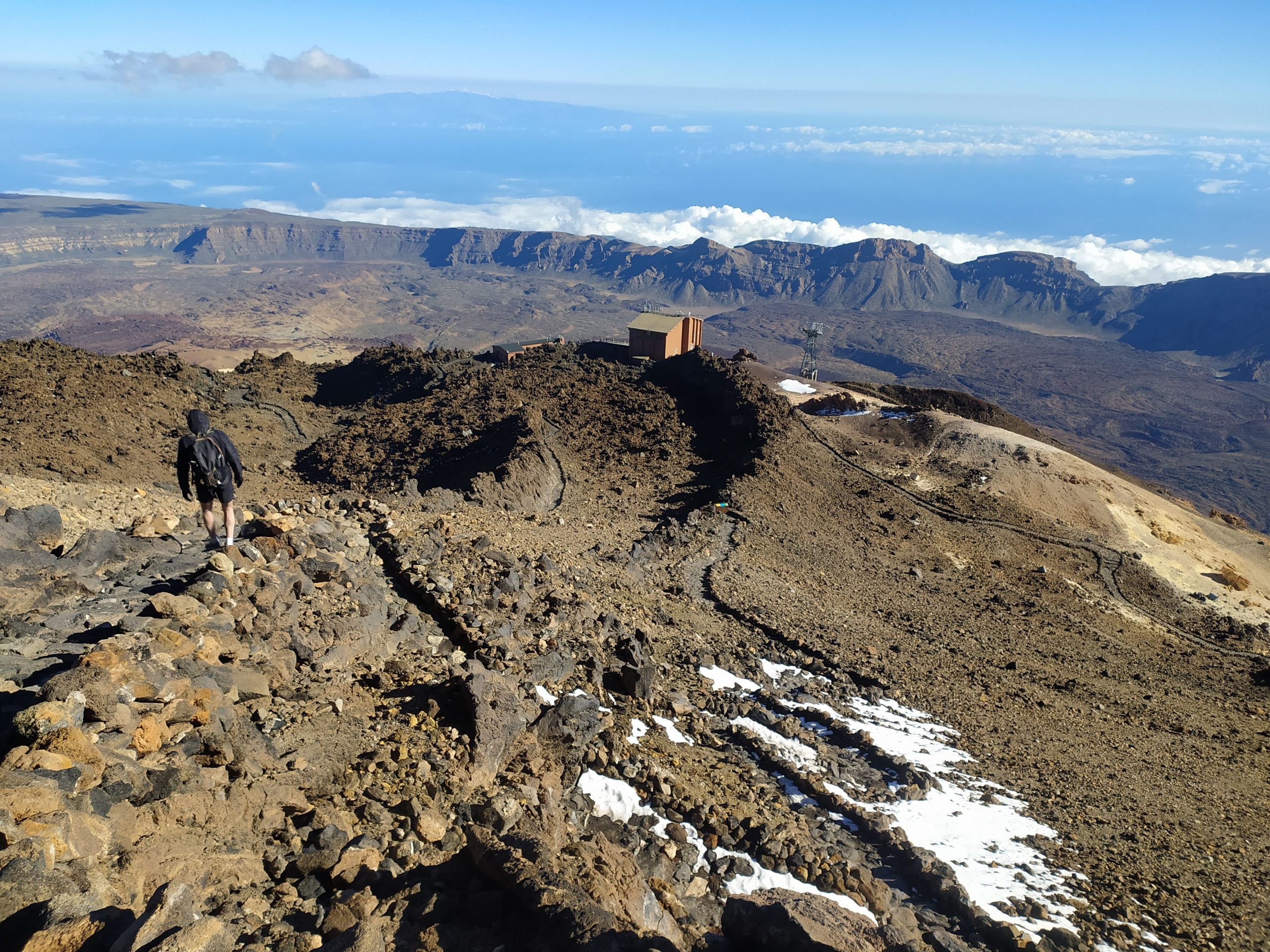 Gdy doszliśmy pod kolejkę, mimo zmęczenia żal było nie iść na sam szczyt. Ubraliśmy ciepłe ciuchy i momentami wspinaliśmy się na czworakach. Stawaliśmy co kilkadziesiąt metrów, by uspokoić oddech. Chodzenie po górach, to nie to samo co bieganie… Po 30 min byliśmy na samym czubku wulkanu! W sumie całość z poziomu parkingu zajęła nam 3,5h. Zapach siarki, szybko przelatujące chmury, widoki na ocean i zbocza wulkanu.