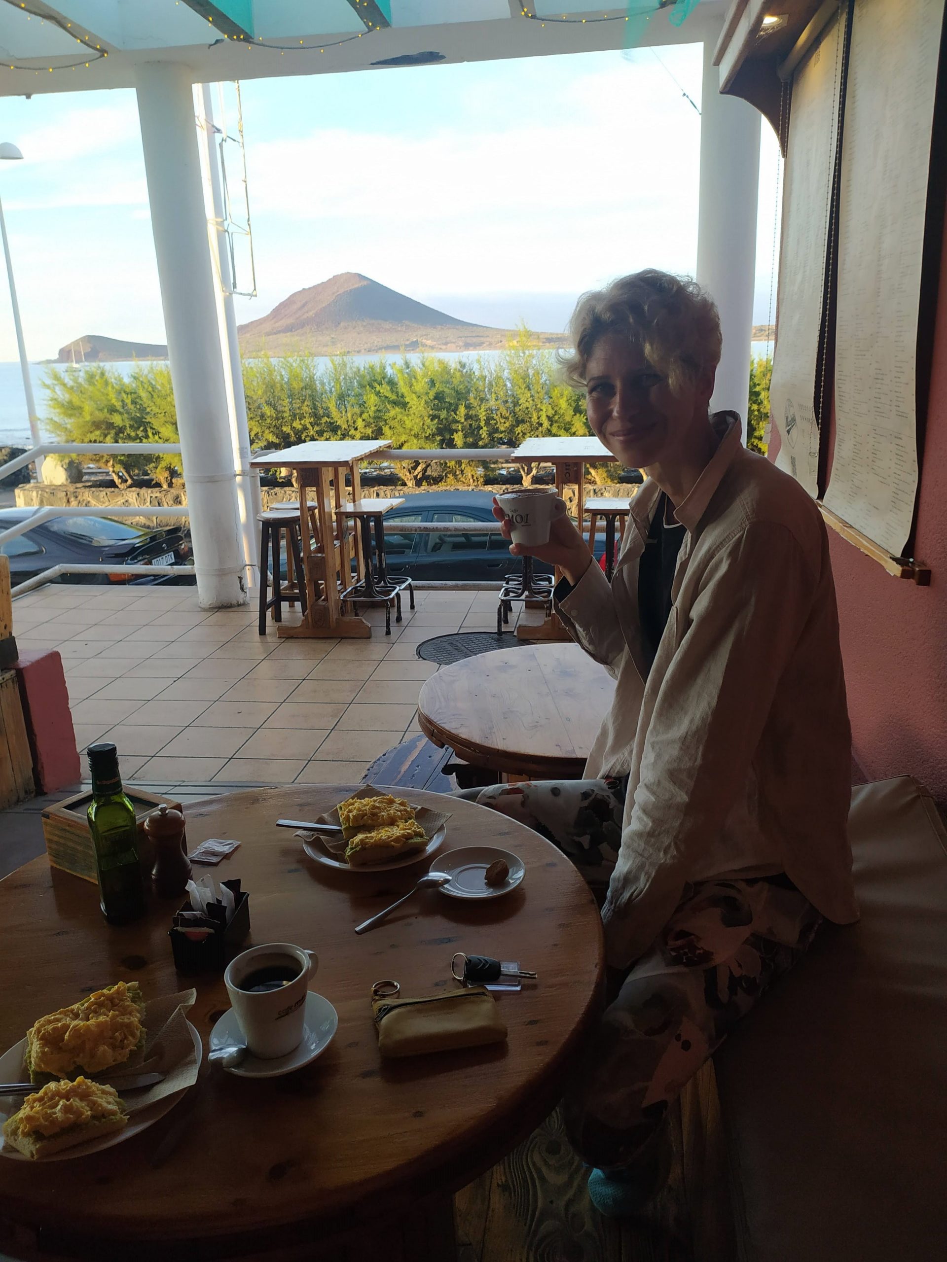 Dzień wylotu. Samolot mieliśmy o 11, postanowiliśmy więc zebrać się wcześniej i podjechać jeszcze zjeść śniadanie w El Medano, miasteczku niedaleko lotniska, nad oceanem. Nie spodziewaliśmy się tak dużych korków na autostradzie, jednej jedynej, która okala niemal całą wyspę. No ale była 7 rano, więc zapewne godzina, gdy miejscowi wyruszają do pracy… Straciliśmy trochę czasu w korkach, ale potem yacool docisnął gazu, ja patrzyłam w tym czasie w telefon, by się nie stresować i udało się nadrobić pół godziny. Medano o poranku było cudowne. Ciche, puste, z atmosferą wakacyjnego miasteczka po sezonie. Większość lokali jeszcze zamknięta. Znalazłam fajną kawiarenkę nad samym oceanem, nie mieliśmy pożegnalnej kolacji, ale udało się zjeść pożegnalne śniadanie. Też fajnie 🙂