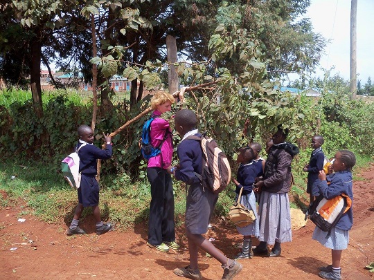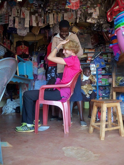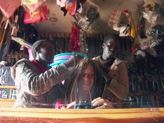 Po śniadaniu poszliśmy pochodzić po mieście, kupić owoce i zatyczki do uszu. Po drodze dzieciaki podskakiwały do drzewa, na którym rosły jakieś owoce. Nie mogły dosięgnąć gałęzi, by je zerwać. Pomogłam im. Kupiliśmy czerwone banany i pączusie. Chcieliśmy dojść do marketu, który prowadzą Hindusi, ale po drodze rzucił mi się w oczy salon kosmetyczny. Siedziały w nim dziewczyny i plotły sobie włosy. Weszłam zapytać czy zrobią mi warkoczyki. Trochę marudziły, że moje włosy są za miękkie, ale w końcu zgodziły się spróbować. Wybrałam sobie kolory, czarny i czerwony, ustaliłyśmy też cenę i czas operacyjny. Yacool poddał się i wrócił do hotelu. Posadziły mnie na plastikowym krześle i zaczęły zaplatać, we dwie, by było szybciej. Jedna z fryzjerek miała ze sobą około rocznego synka. Gdy zaczął się nudzić i marudzić zawiązała go sobie w chuście na plecach. Gdy mały zasnął po chwili, przełożyła go na podłogę, na której wcześniej rozłożyła karton i koc. Mimo, że było ciepło, mały był ubrany w wysokie za kostkę buciki, ciepłą kurtkę i czapkę. Dziewczyna położyła go na grubym kocu, przykryła chustą i dodatkowym kocem! Dla nich tu faktycznie jest teraz zima… Do salonu, który był jednocześnie sklepem z ciuchami i kosmetykami co chwila zaglądał ktoś znajomy.