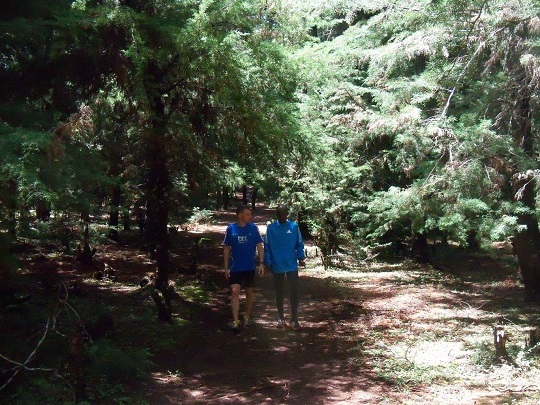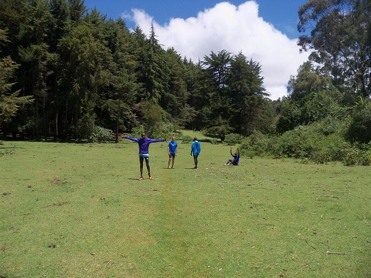 Droga do lasu zajęła nam dobre pół godziny. Ale warto było! Las był bajeczny! Najpierw szliśmy przez iglastą jego część, ściółka była wyjątkowo miękka, to jak chodzenie po mchu. Dużo drzew było wyciętych, bo mieszkający w pobliżu ludzie kradną drzewa. Ale dzięki temu las był rzadszy i było w nim jasno. Potem wyszliśmy na soczyście zieloną polanę. Otaczały ją olbrzymie drzewa, śpiewały ptaki, podobno można tam też spotkać małpy. To miejsce totalnie mnie zauroczyło! Zaczęliśmy nasze ćwiczenia. Tak jak wczoraj najpierw koordynacja w statyce, potem marszu i truchcie. Z przyjemnością zdjęłam buty i ćwiczyłam na boso. Chłopaki pytali zdziwieni czy nie uwierają mnie drobne gałązki leżące gdzieniegdzie. Zza zarośli wybiegły owce, wyglądały na zdziwione, gdy na nas wpadły. Idący za nimi pasterz podobnie, przystanął z boku i przez dłuższy czas przyglądał się naszym wygibasom. Pewnie byliśmy dla niego niezłą atrakcją. Chłopaki robią postępy. Rueben nadal jest tłumaczem technicznym, on najlepiej wszystko łapie. Po treningu yacool zrobił Meshackowi masaż, ten z kolei wydaje się najsztywniejszy z całej grupy. Potem zrobiliśmy chłopakom pulsing. Podobał im się, ale mamy wrażenie, że nie do końca się przy nim wyluzowali. Nie udało nam się ich uśpić.
