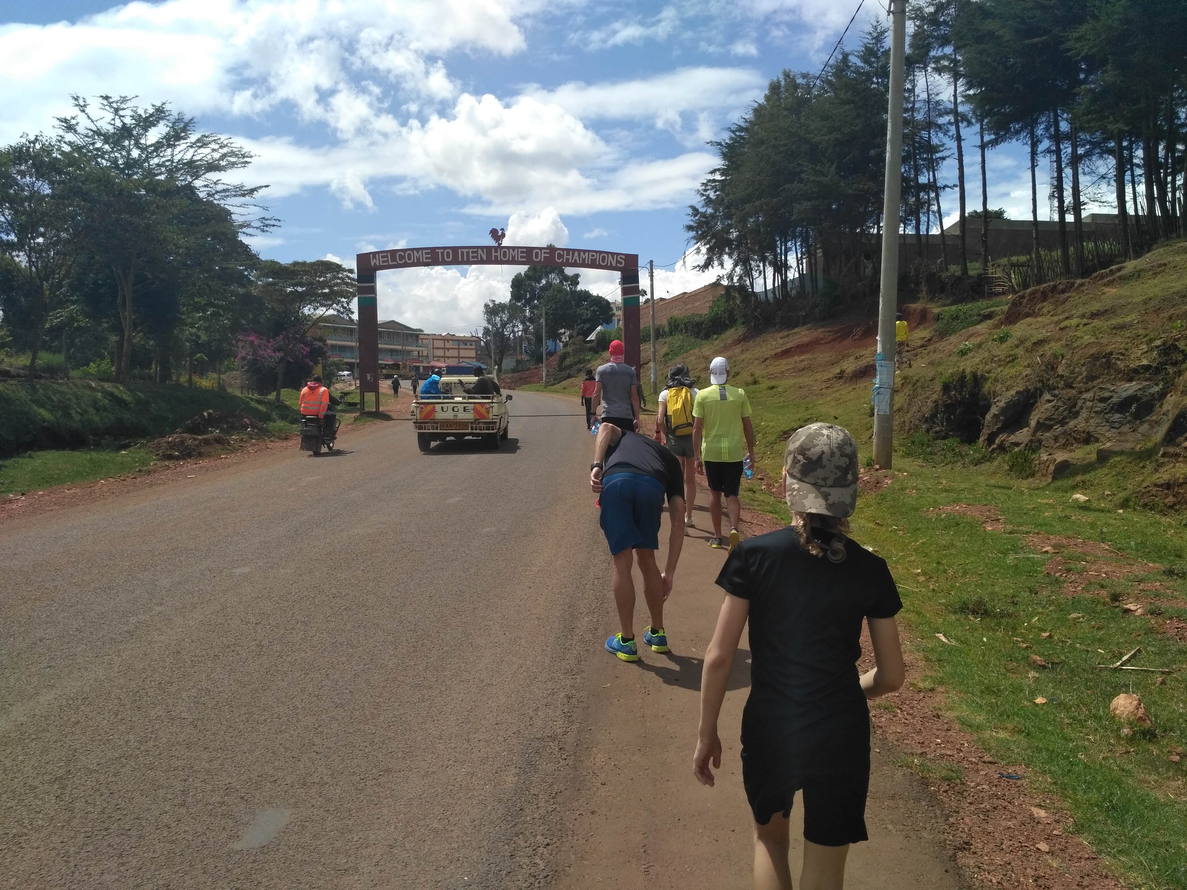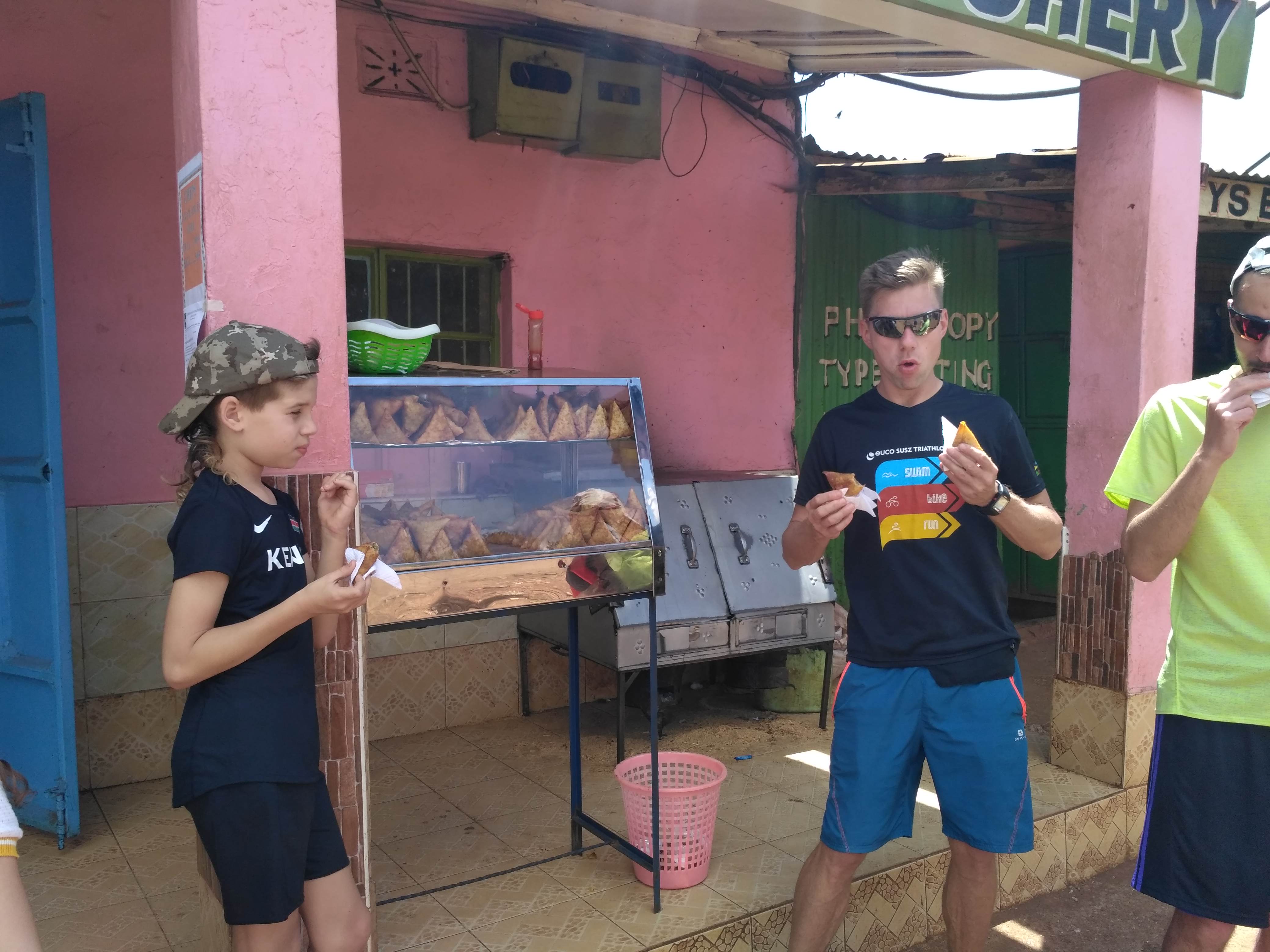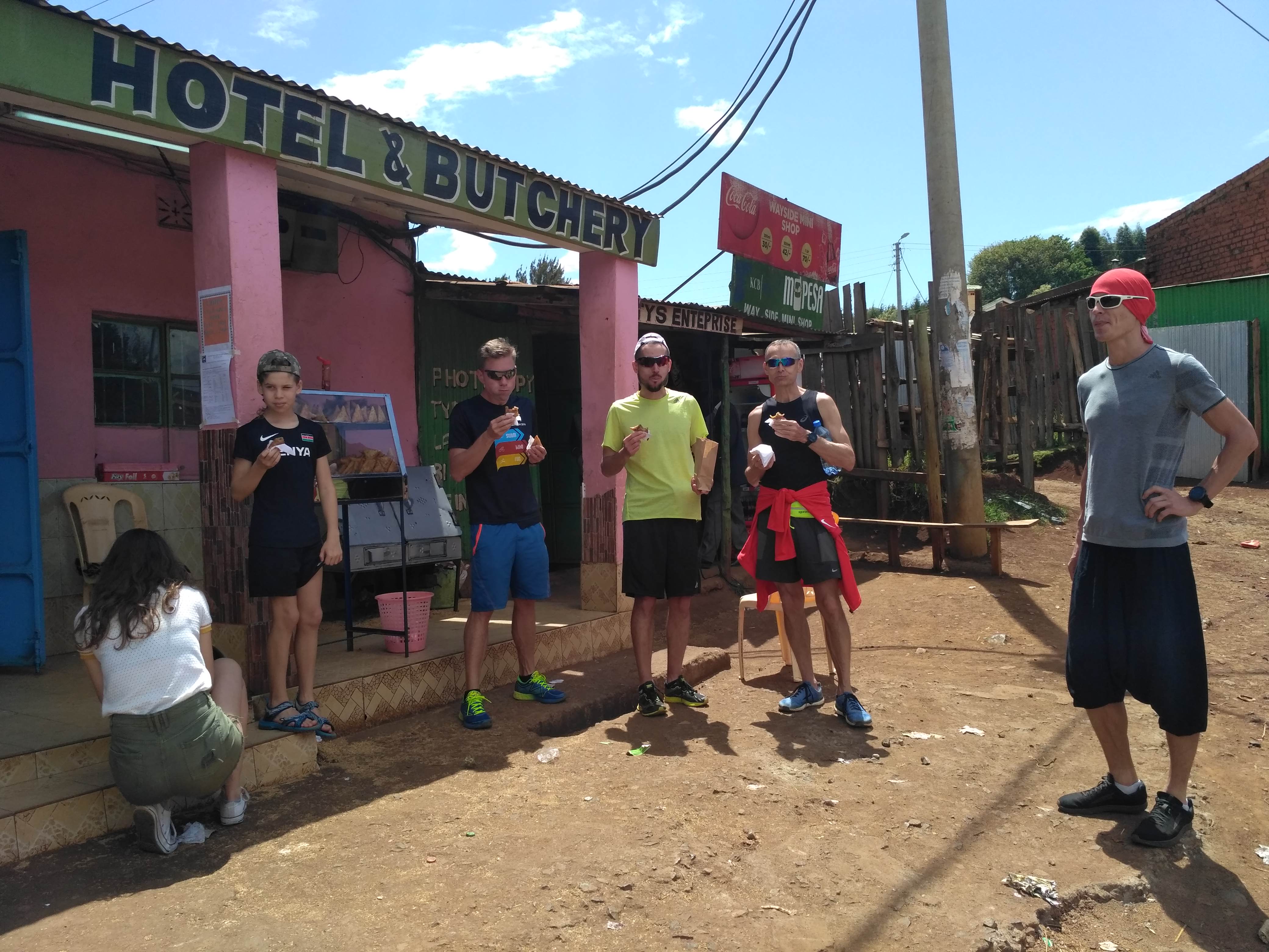 Po drodze kupiliśmy sobie samosę, rodzaj pierożka z mięsem, smakuje trochę jak sajgonki. Poszliśmy do drugiej bramy wjazdowo/wyjazdowej (słynne bramy z napisem „Welcome to Iten, home of champions”/”Thanks for visiting home of champions”) i dalej na punkt widokowy, który leży na wyjeździe z Iten. Jeden z siedzących tam Kenijczyków zaoferował się, że zrobi nam wspólne zdjęcie. Pstryknął ich chyba z dziesięć, ale na każdym jest jego palec, którym zasłonił pół grupy.