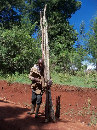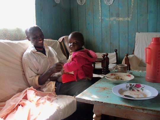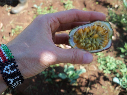 Po chwili miałam nowe towarzystwo, mężczyzny, który niósł na ramionach wycięte z lasu drzewa. Zaczepił mnie typowym powitaniem: hi, how are you? Po czym się rozgadał. Po kilku minutach dotarliśmy do jego domu, zaprosił mnie ma herbatę. Byłam ciekawa jak mieszka, chciałam też poznać jego żonę i piątkę dzieci. Miał na imię Kipet, 41 lat i spory kawałek ziemi. Byłam pod wrażeniem tego w jaki sposób zagospodarował każdy jej skrawek. Na większości uprawia niczym winogrona owoce passion fruit. Mają kwaskowy smak, wnętrze podobne do owocu granatu. Pod nimi rosną już małe sadzonki kolejnych roślin, między nimi była posadzona fasola i kapusta. Ostrożnie szłam za nim, by niczego nie podeptać. W ogródku rosły drzewka pomarańczy. Miał też miejsce, w którym posadził iglaki, służą mu na opał i do budowania. Wyraźnie był dumny ze swojego lasu. Potem usiedliśmy na polanie i razem z jego sąsiadką, która przyszła na łąkę po swoje owce rozmawialiśmy o podobieństwach między Kenią, a Polską, byli ciekawi systemu edukacji, rodzaju wykonywanych przez nas prac, sposobu życia. Kipet zapytał czy, gdyby dał mi teraz motykę, to czy bym umiała pielić ziemię. Przytaknęłam, że jak chce to mogę mu pomóc. Śmiał się zdziwiony. Przyznał, że jestem inna, bo dla nich biały człowiek to taki, który nie umie fizycznie pracować i jedynie przyjeżdża tu do hoteli. Jakiś czas temu spotkał Niemca, ale ten nie dał się mu zaprosić do domu. Przyszedł po nas jego syn mówiąc, że mama woła na herbatę. Wreszcie miałam okazję z bliska zobaczyć prawdziwą murzyńską lepiankę. Weszłam do środka, żona Kipeta zanosiła się od śmiechu, gdy robiłam zdjęcia. Lepianka służy im za kuchnię, wewnątrz było chłodno i mocno nadymione.