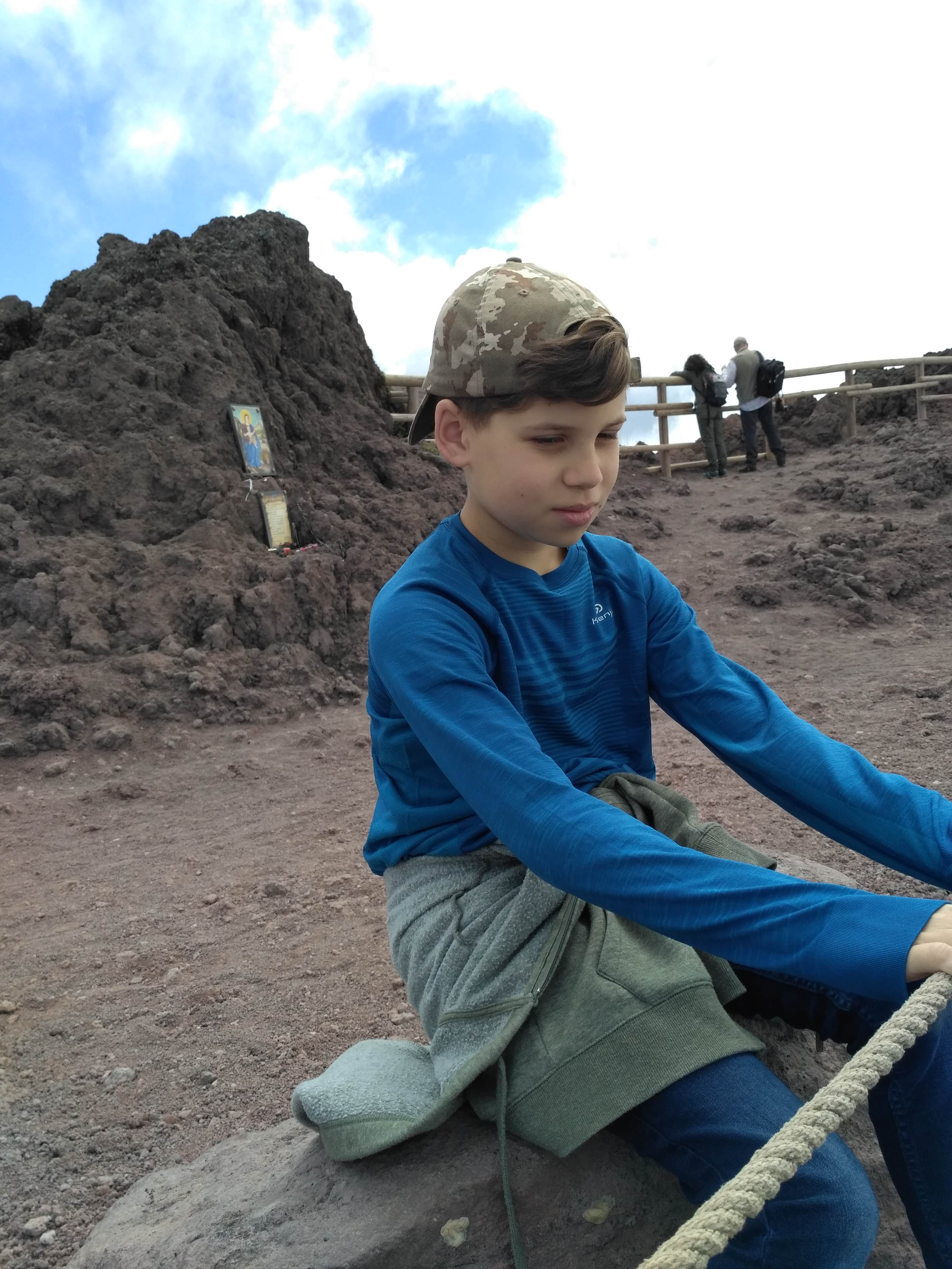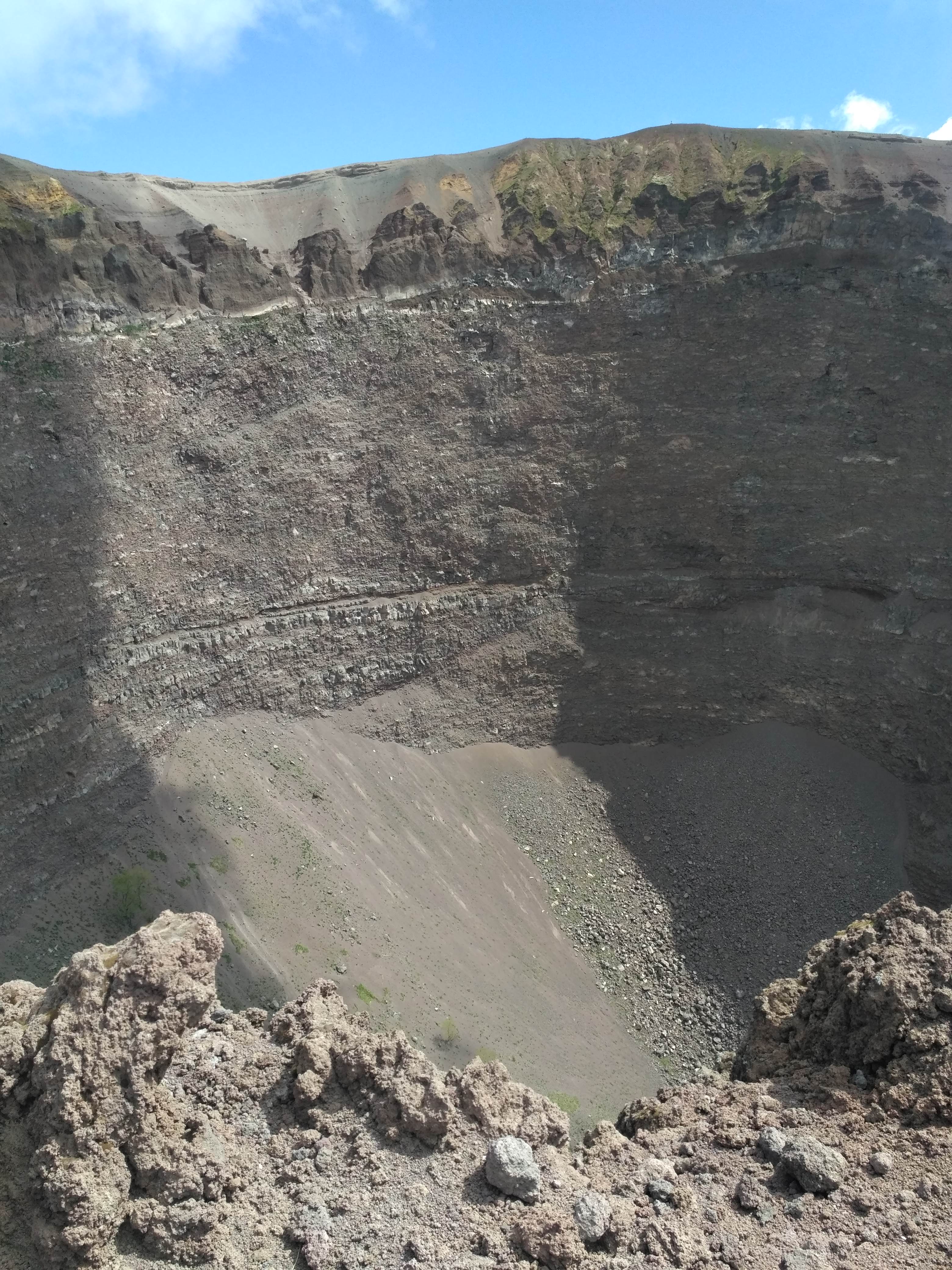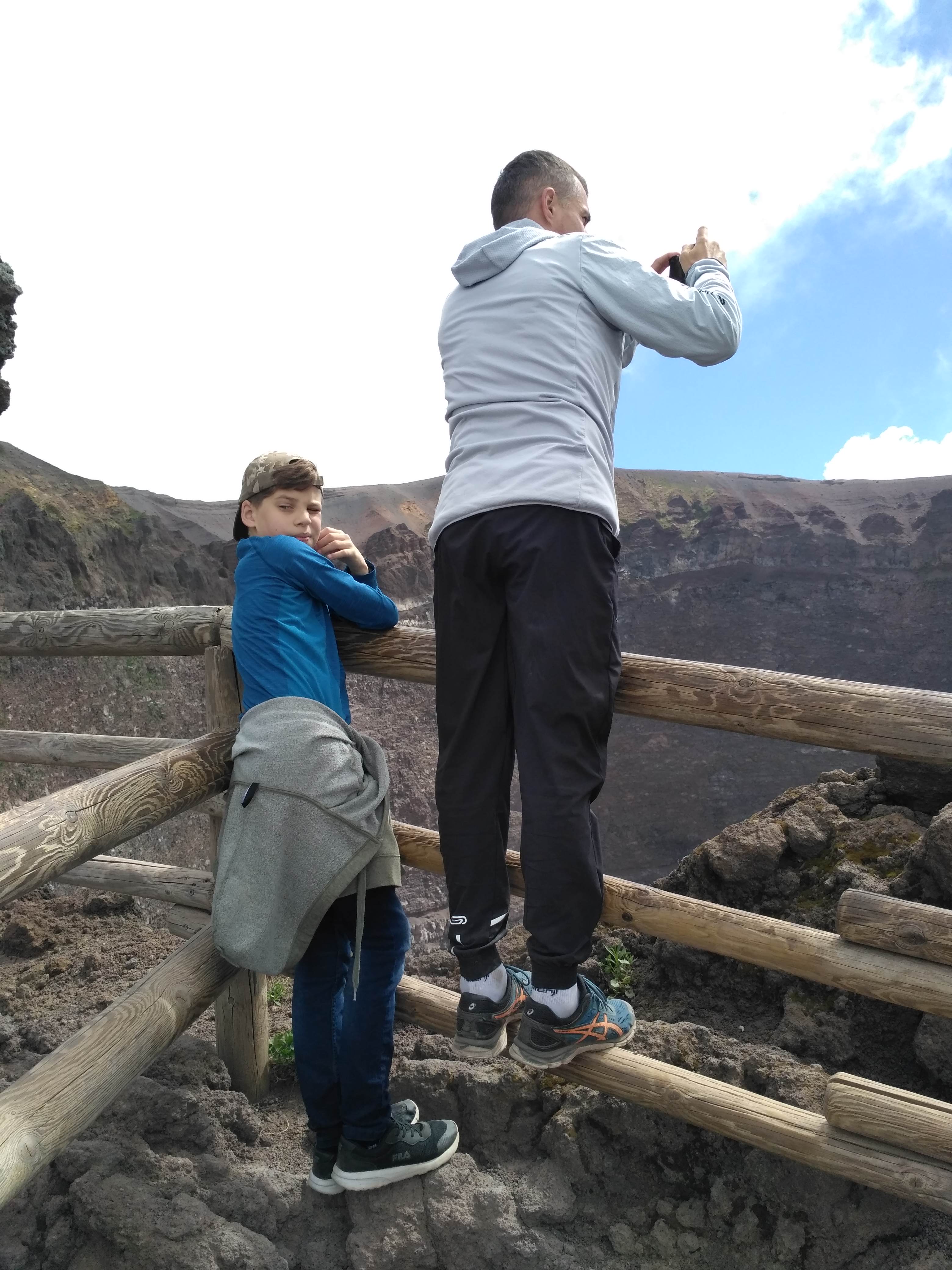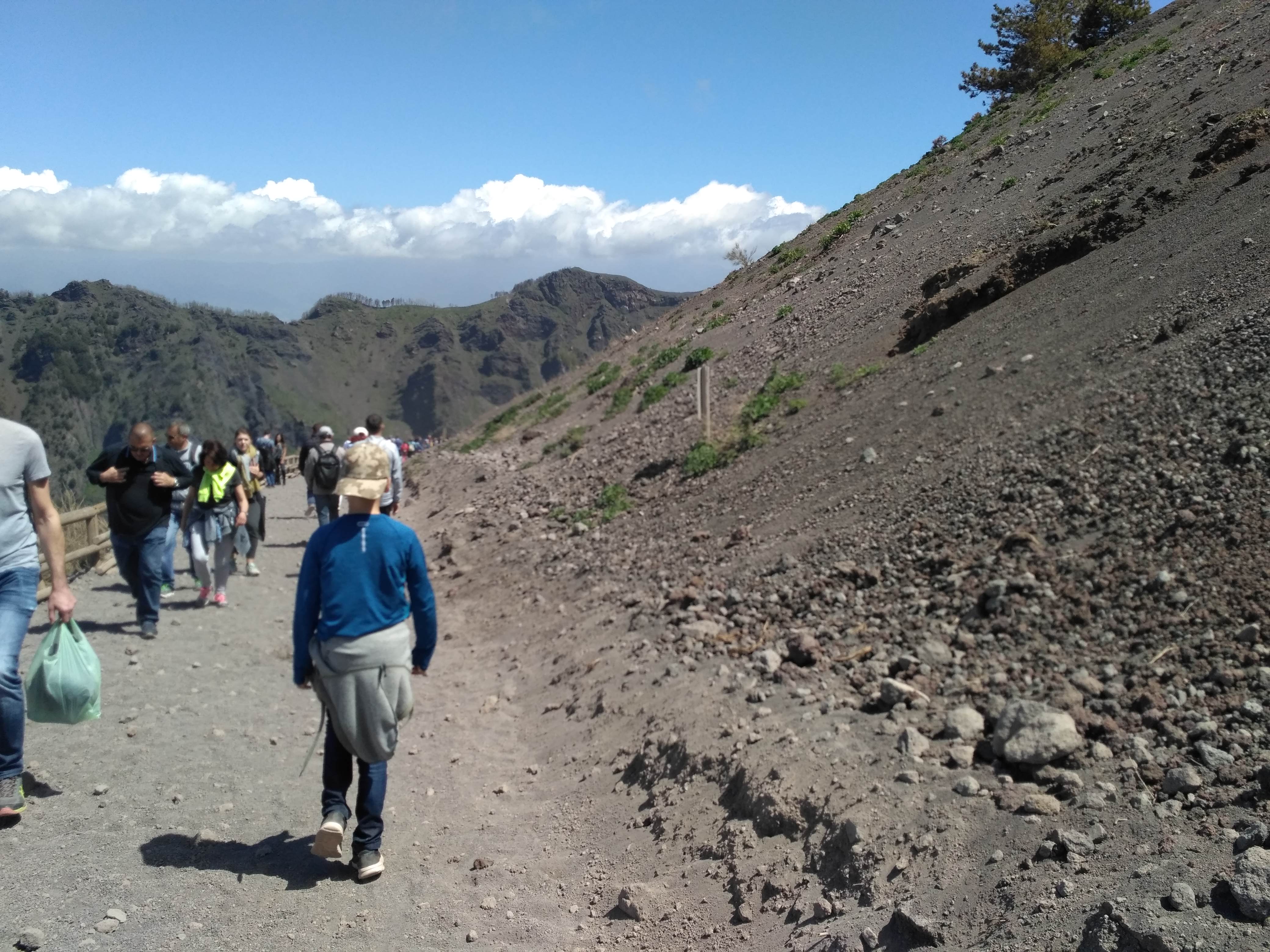 Krater ma średnicę 500 m i jest głęboki na 230 m. Sam Wezuwiusz ma wysokość niemal 1300 m n.p.m. Krater można obejść w połowie i z różnych perspektyw zajrzeć do niego. Niestety naszły chmury, które ograniczyły widok na zatokę neapolitańską. Z wewnętrznych ścian krateru wydobywały się siarkowe wywiewy. Wulkan jest cały czas aktywny i bacznie badany na okoliczność kolejnego wybuchu. Ostatni miał miejsce w czasie II wojny światowej, w 1944 r. Na szczęście nie był tak potężny jak ten z 79 roku naszej ery, który na wiele stuleci przykrył popiołem Pompeje i Herkulanum.