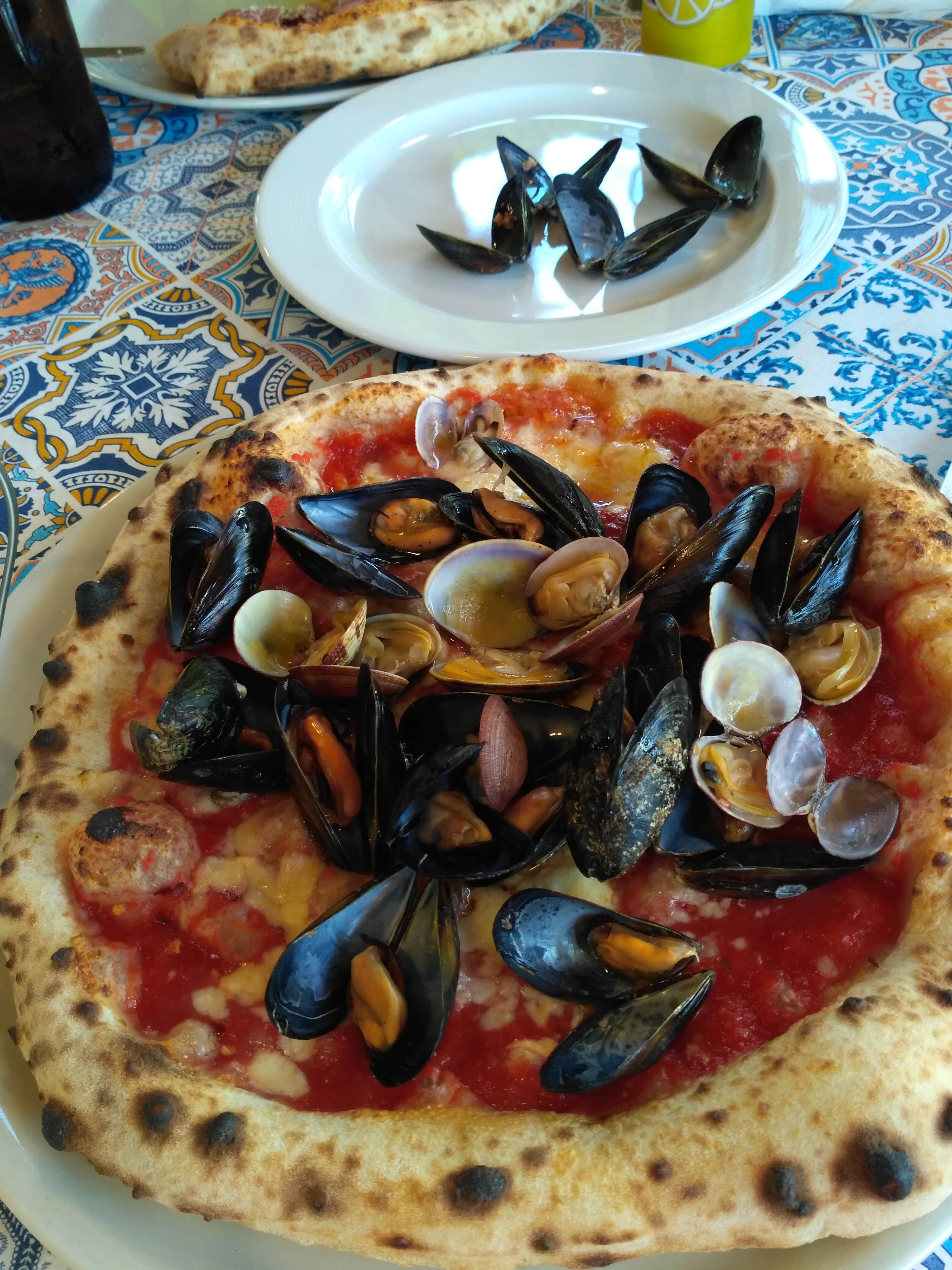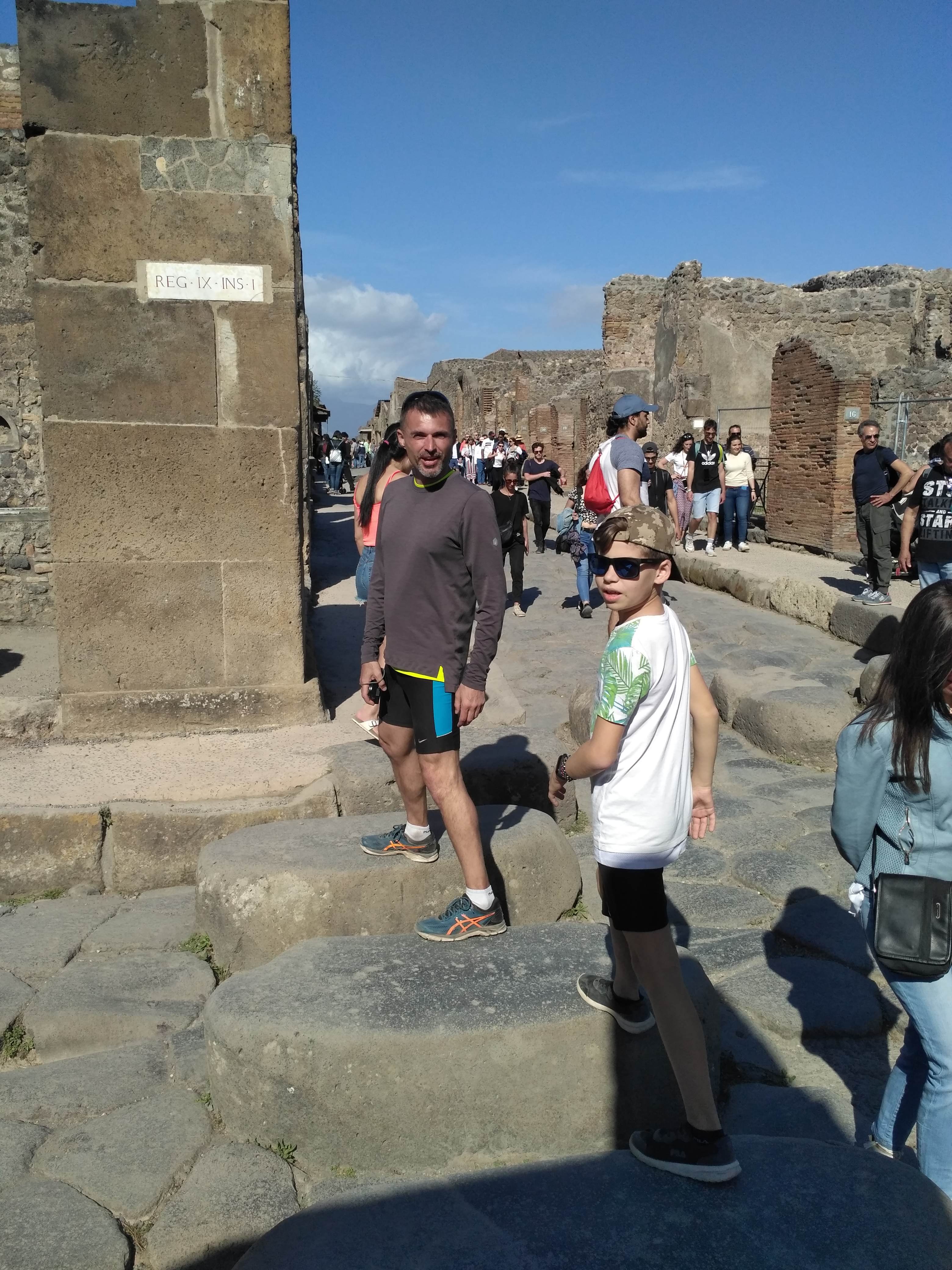 Z Wezuwiusza pojechaliśmy do pobliskich Pompei. Zanim udaliśmy się na zwiedzanie weszliśmy do restauracji na obiad. My z Jackiem tradycyjnie wzięliśmy pizzę, Janek spróbował dziś lasagne. Wybór nas nie rozczarował.