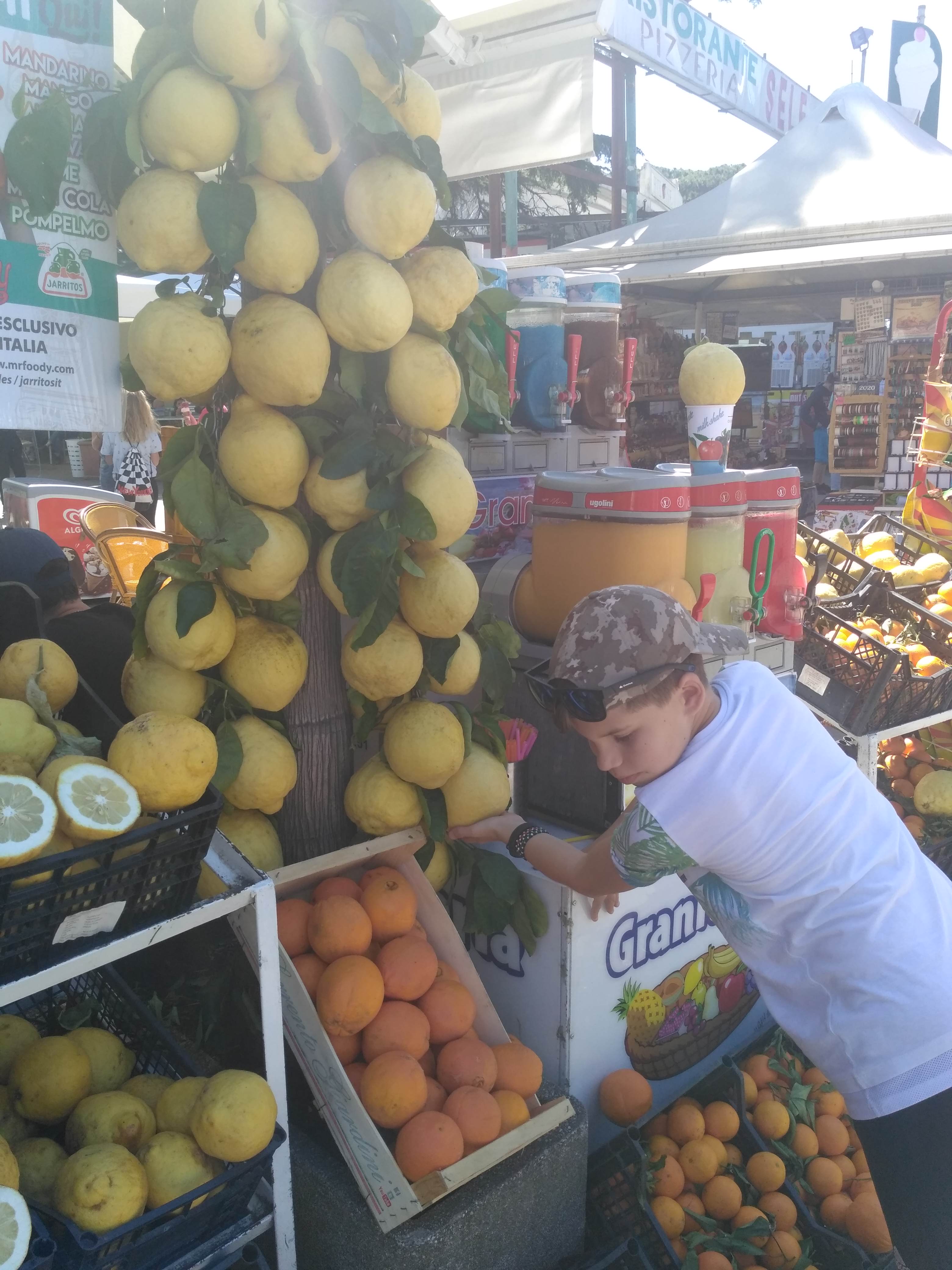 Spacer skończyliśmy chwilę przed 19. Zjedliśmy jeszcze po lodzie, ja wypiłam świeży sok z pomarańczy. Wrażenie zrobiły na nas olbrzymie cytryny wiszące na straganach. Ten rejon Włoch słynie z cytryn, niektóre są wielkości melona. Wyrabia się z nich bardzo popularny tu likier limonczello.