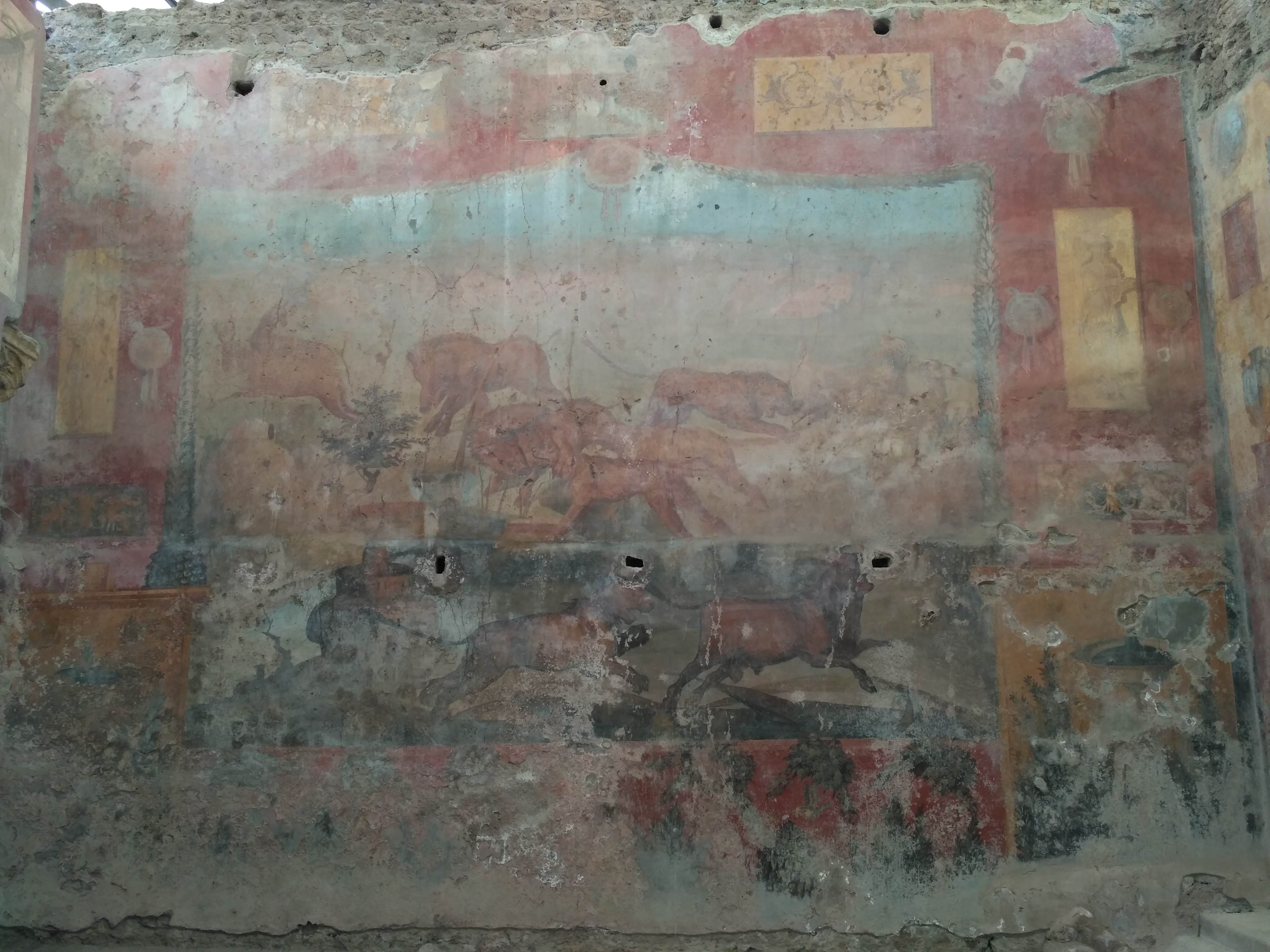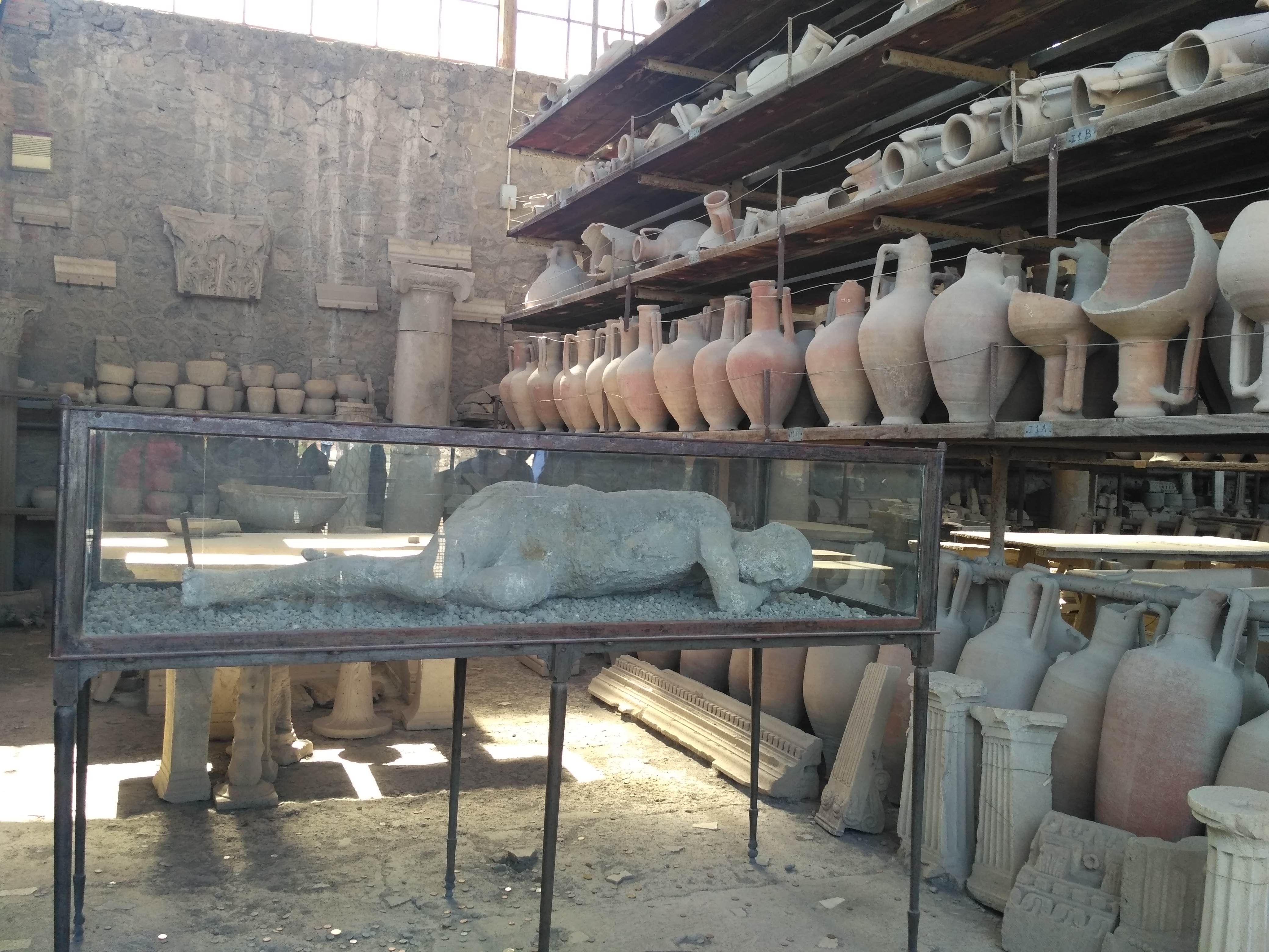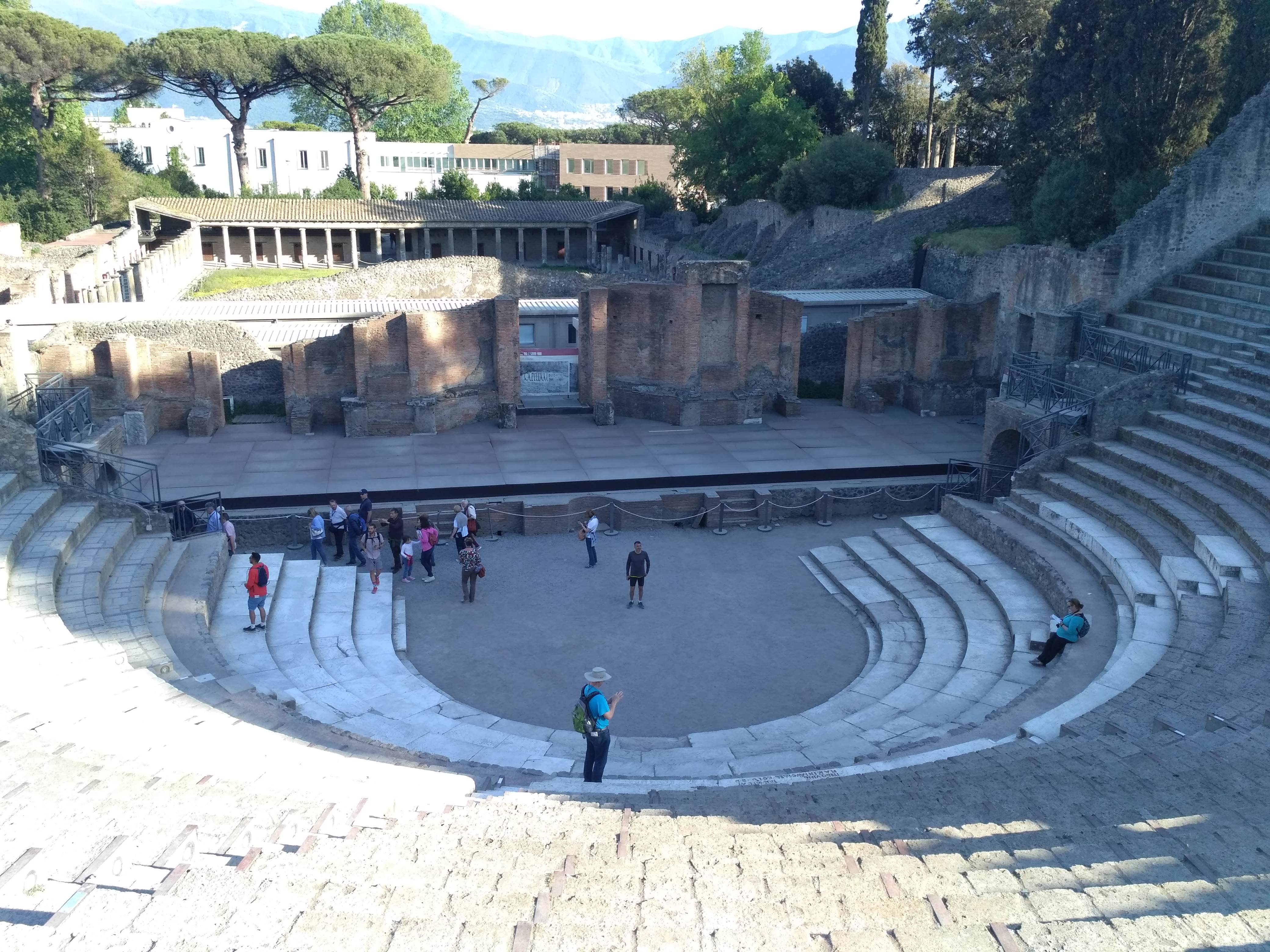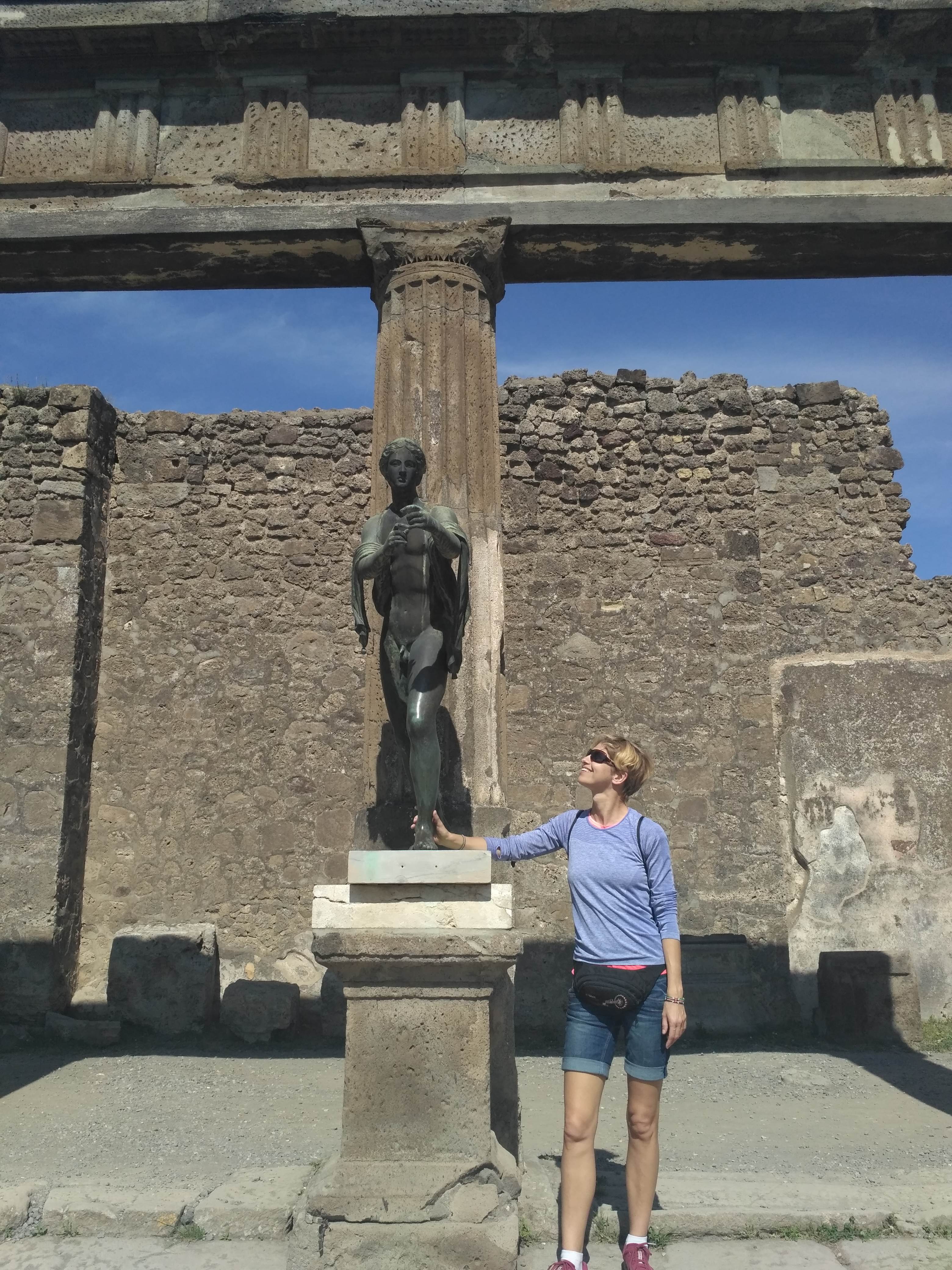 Najedzeni ruszyliśmy na zwiedzanie. Odkopane starożytne miasto zrobiło na mnie olbrzymie wrażenie. Przez kilka godzin chodziliśmy wybrukowanymi uliczkami, zaglądając do wnętrza dawnych domów. Teren Pompei jest olbrzymi i można tu spędzić cały dzień, zwłaszcza jeśli ktoś tak jak ja lubi takie starożytne klimaty. Podzielony jest na kilka sektorów – z domami ówczesnej elity, z niegdyś pięknymi mozaikami i malowidłami ściennymi ( dziś można podziwiać ich resztki lub reprodukcje), z obiektami użyteczności publicznej jak łaźnie, baseny czy siłownia, są też dwa teatry mały i wielki, świątynie, rynek główny (forum) i domy rozpusty. Jest też duży dobrze zachowany amfiteatr. Całe miasto otoczone jest murem.