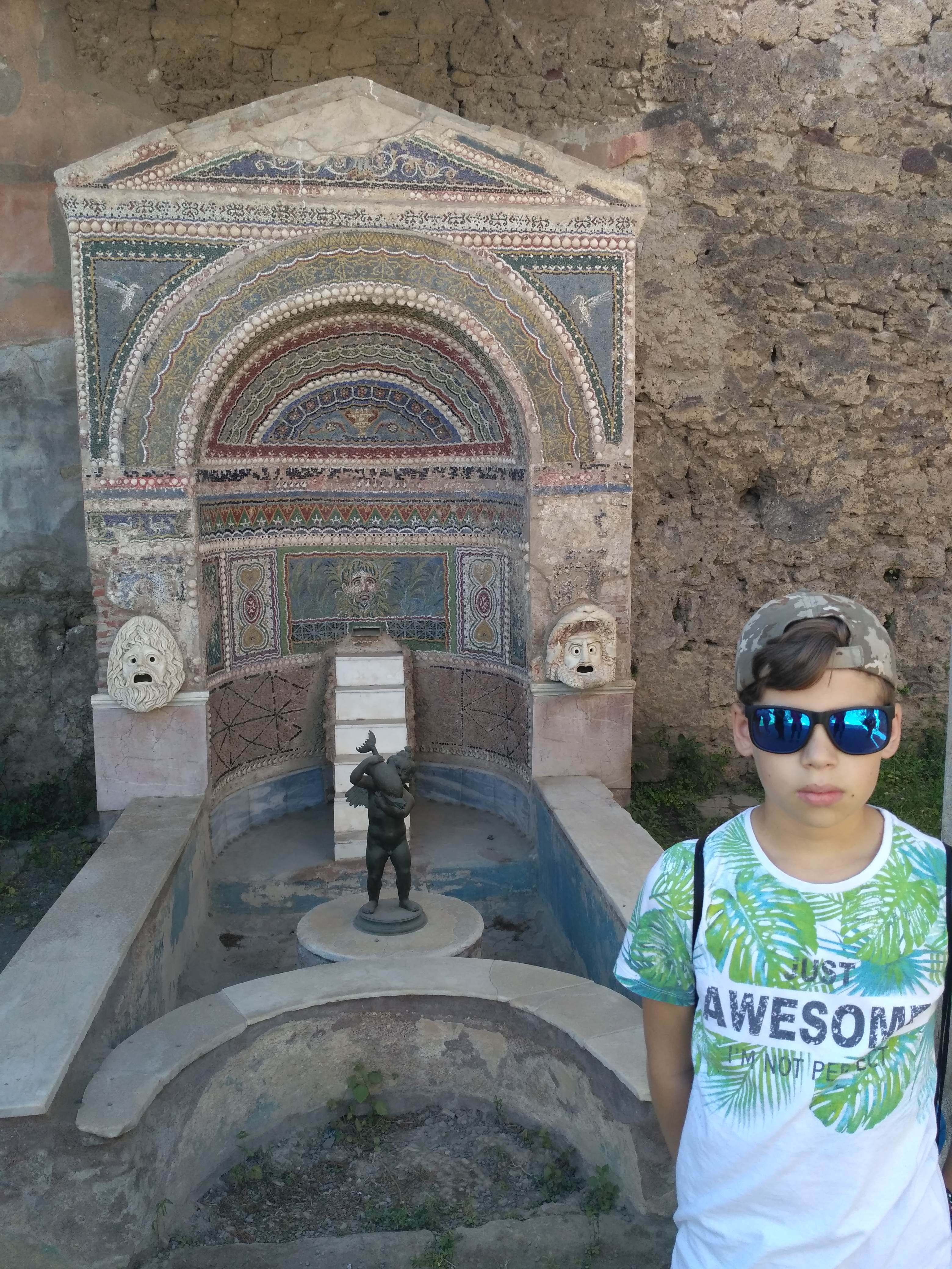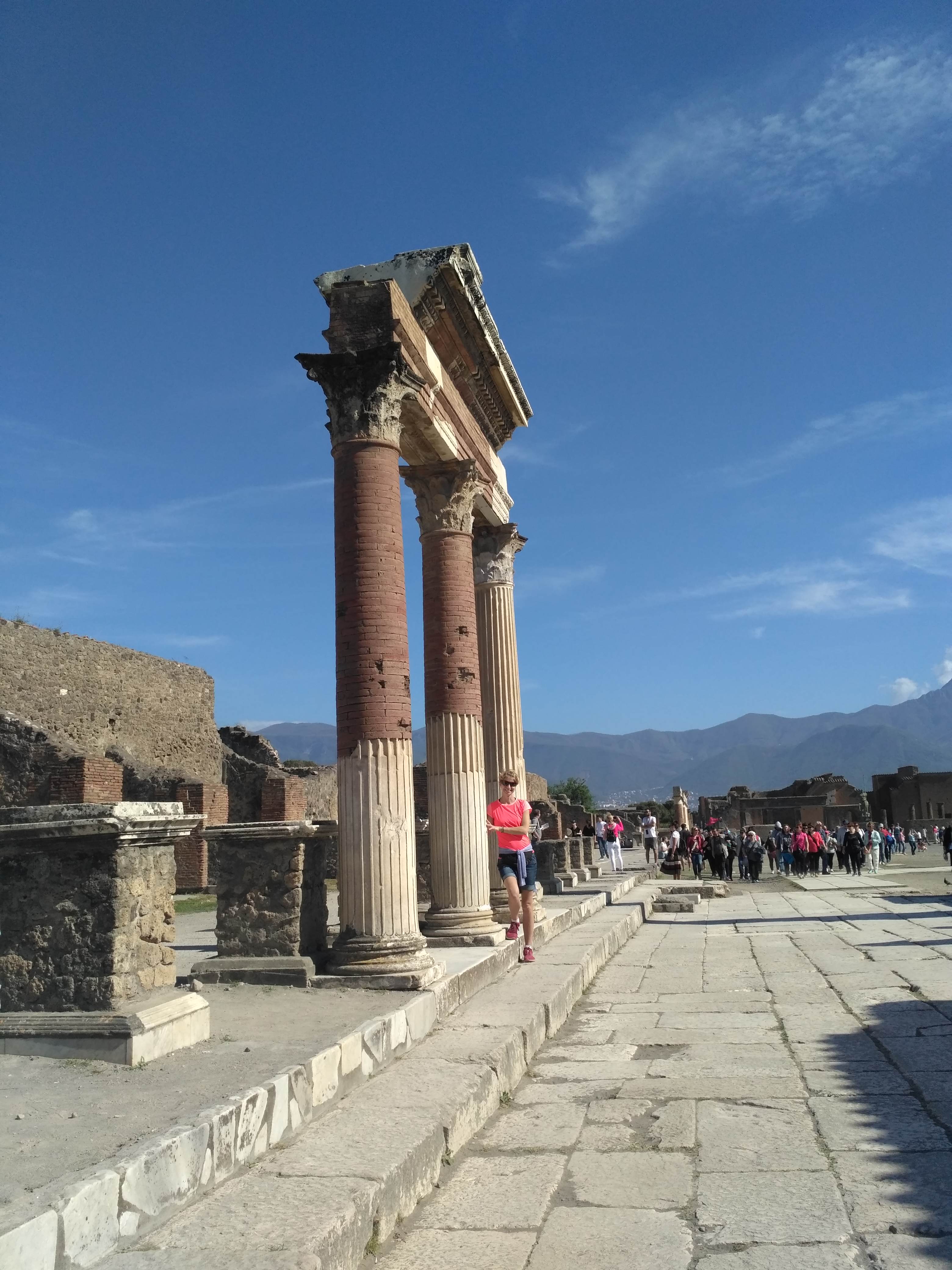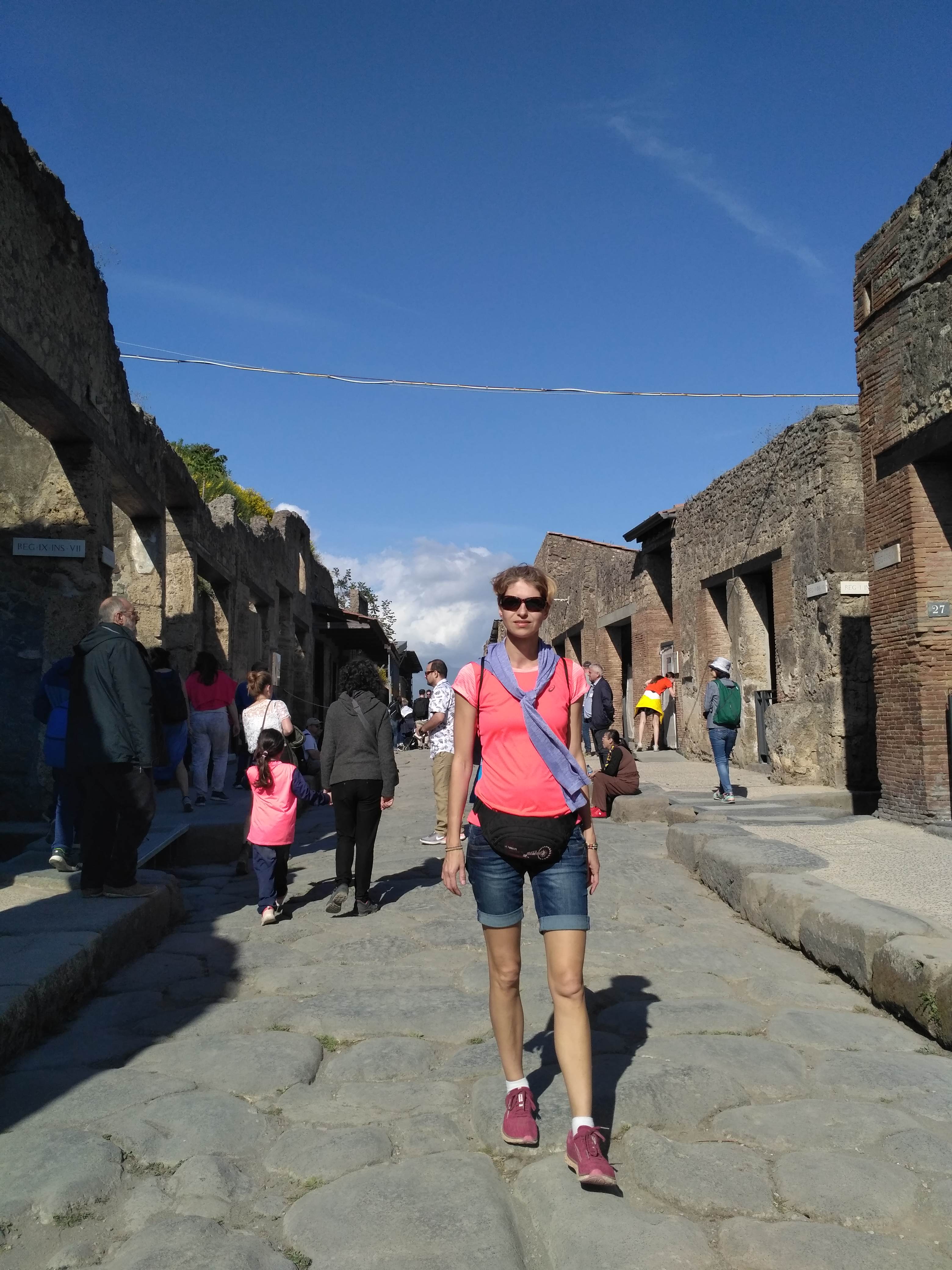 Na kamiennych ulicach widać ślady odciśniętych kół od jeżdżących kiedyś po nich wozach. Są też wielkie głazy, ułożone w poprzek, podobno to pierwowzór naszych dzisiejszych przejść dla pieszych. Z wielu miejsc można podziwiać górujący nad miastem wulkan. Pompeje są pięknie położone. Z jednej strony potężny i majestatyczny Wezuwiusz, z drugiej strony pasmo górskie oddzielające Pompeje od wybrzeża amalfijskiego. Absolutnie zakochałam się w tym miejscu. Mogłabym tu spędzić cały dzień włócząc się po tych uliczkach i zaglądając w każdy kąt. W zasadzie chłopacy byli cierpliwi i obeszliśmy większość miasta.
