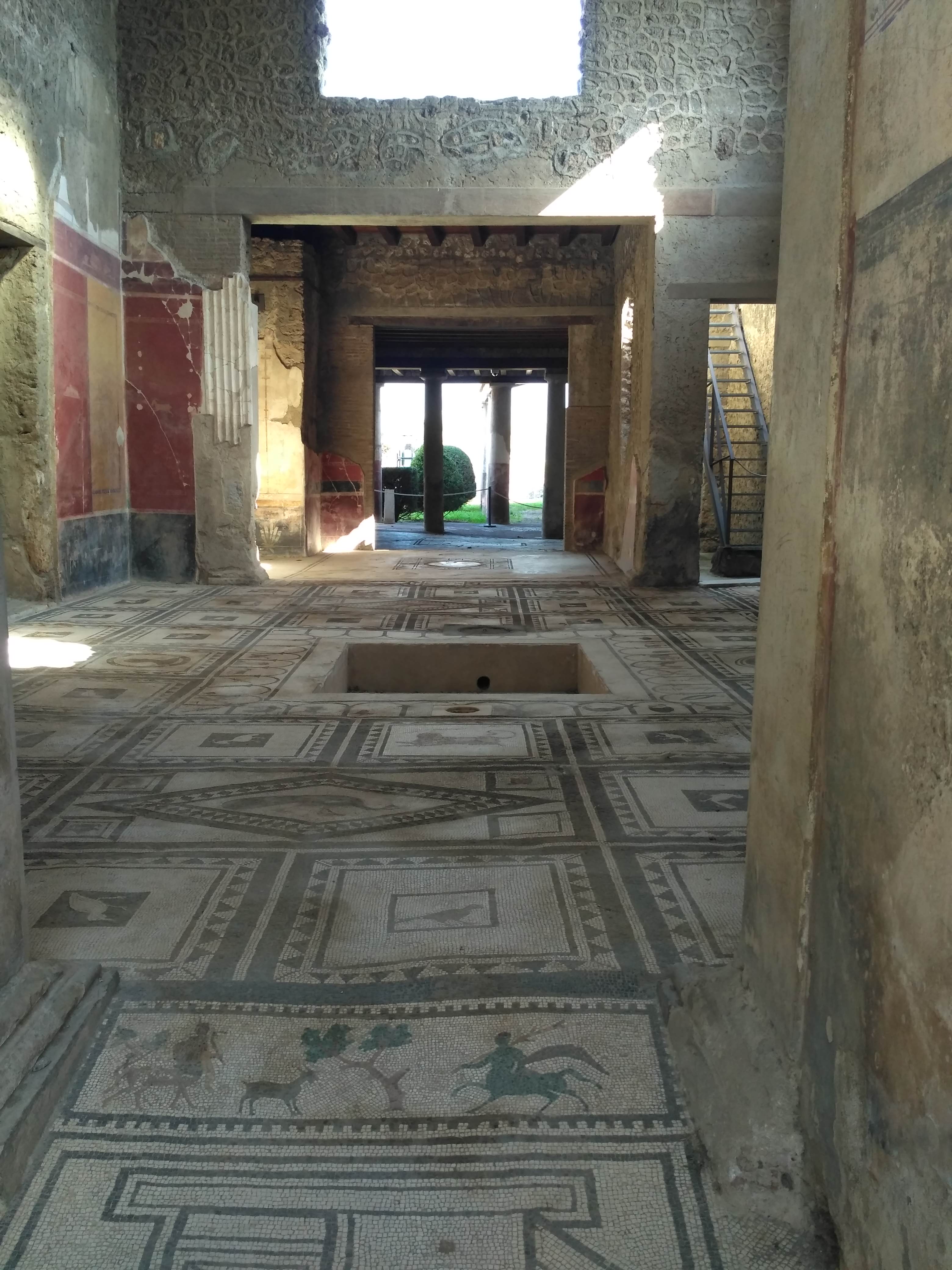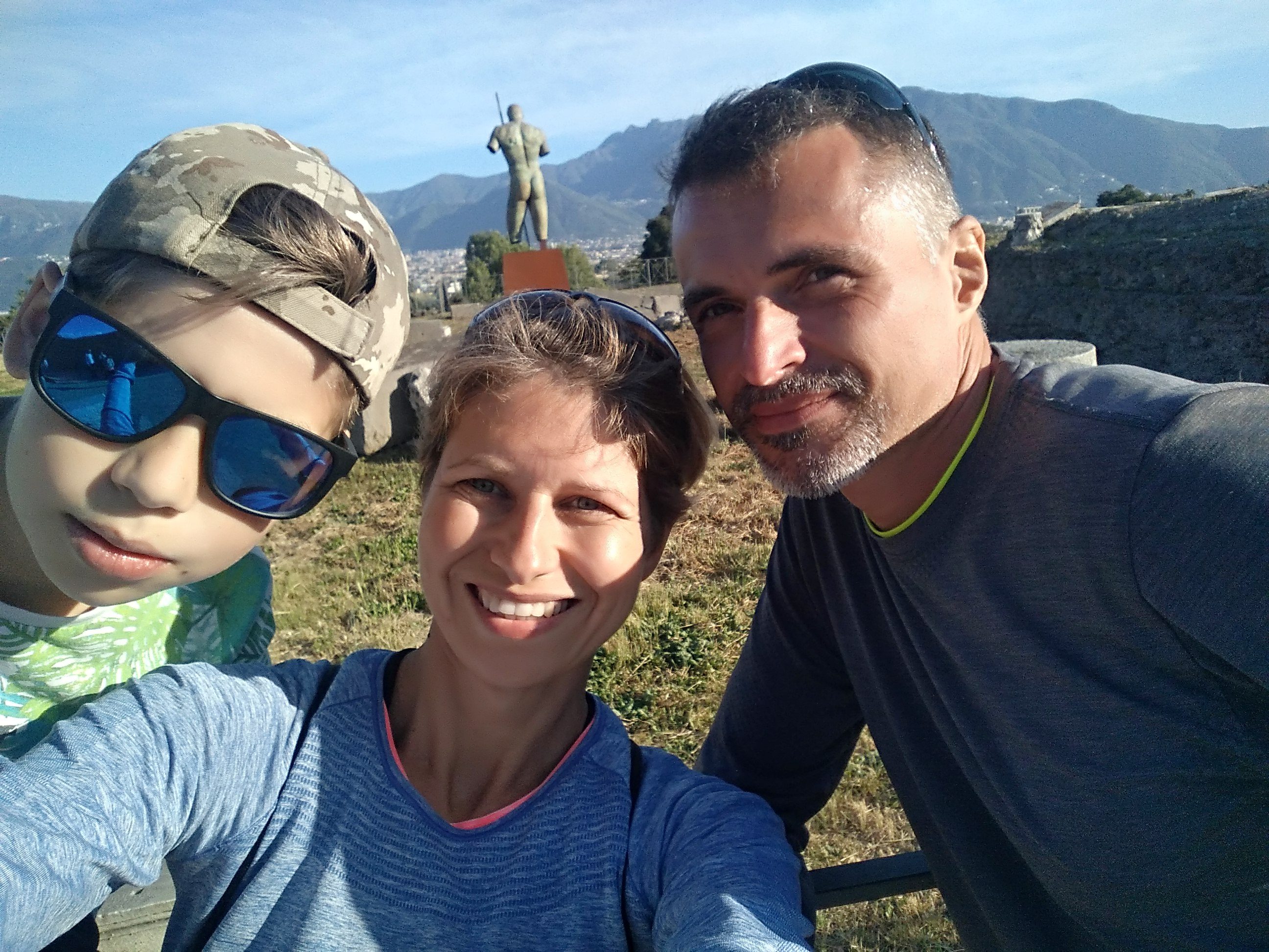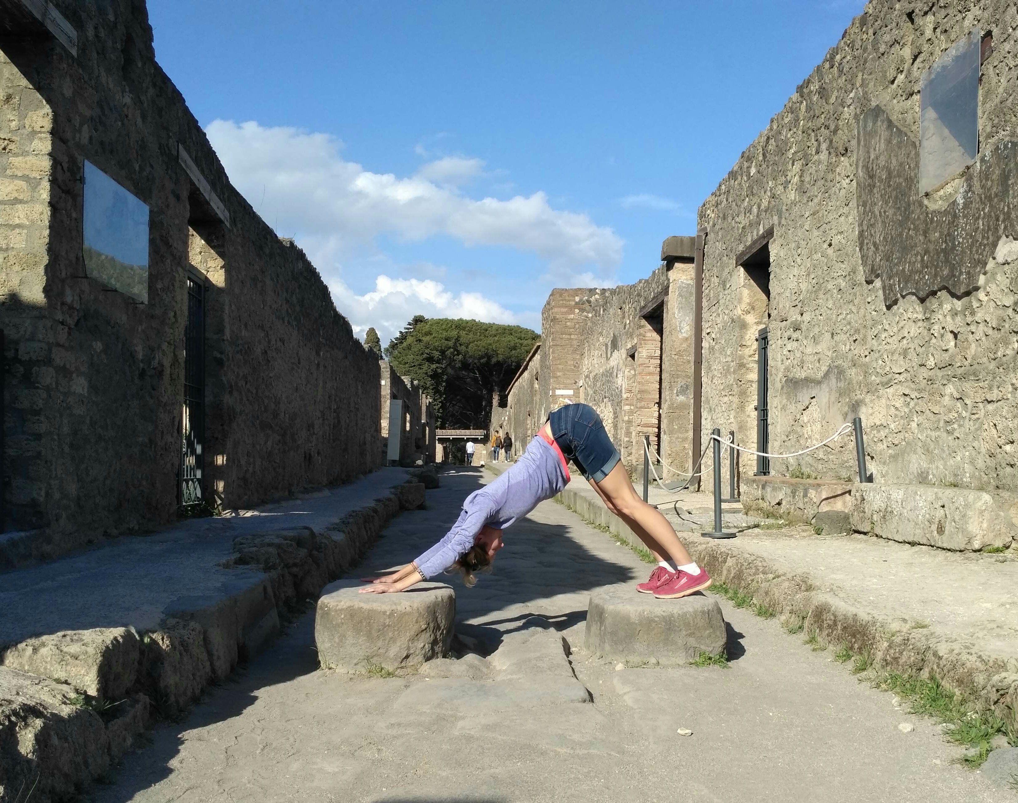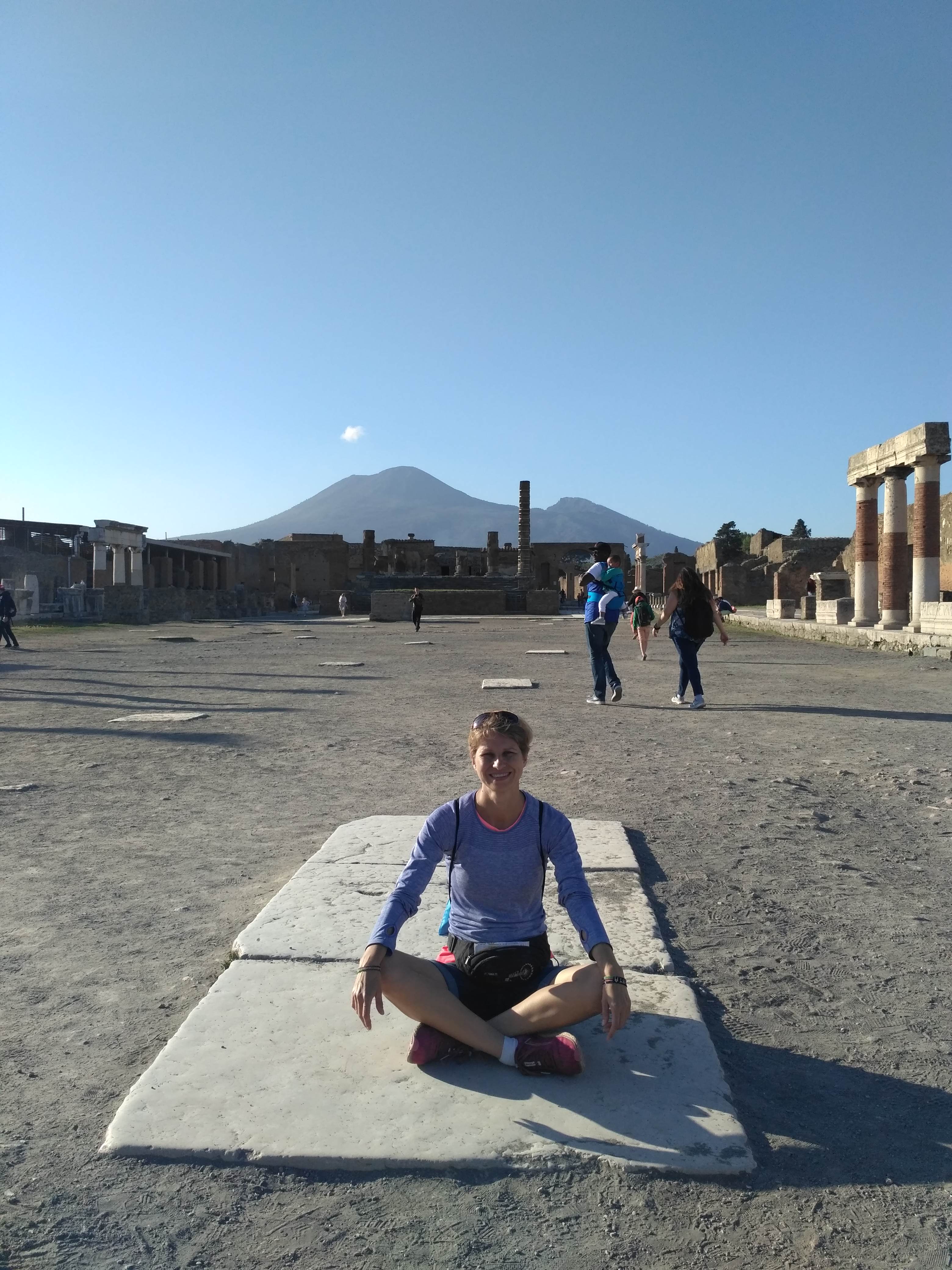 Na kamiennych ulicach widać ślady odciśniętych kół od jeżdżących kiedyś po nich wozach. Są też wielkie głazy, ułożone w poprzek, podobno to pierwowzór naszych dzisiejszych przejść dla pieszych. Z wielu miejsc można podziwiać górujący nad miastem wulkan. Pompeje są pięknie położone. Z jednej strony potężny i majestatyczny Wezuwiusz, z drugiej strony pasmo górskie oddzielające Pompeje od wybrzeża amalfijskiego. Absolutnie zakochałam się w tym miejscu. Mogłabym tu spędzić cały dzień włócząc się po tych uliczkach i zaglądając w każdy kąt. W zasadzie chłopacy byli cierpliwi i obeszliśmy większość miasta.