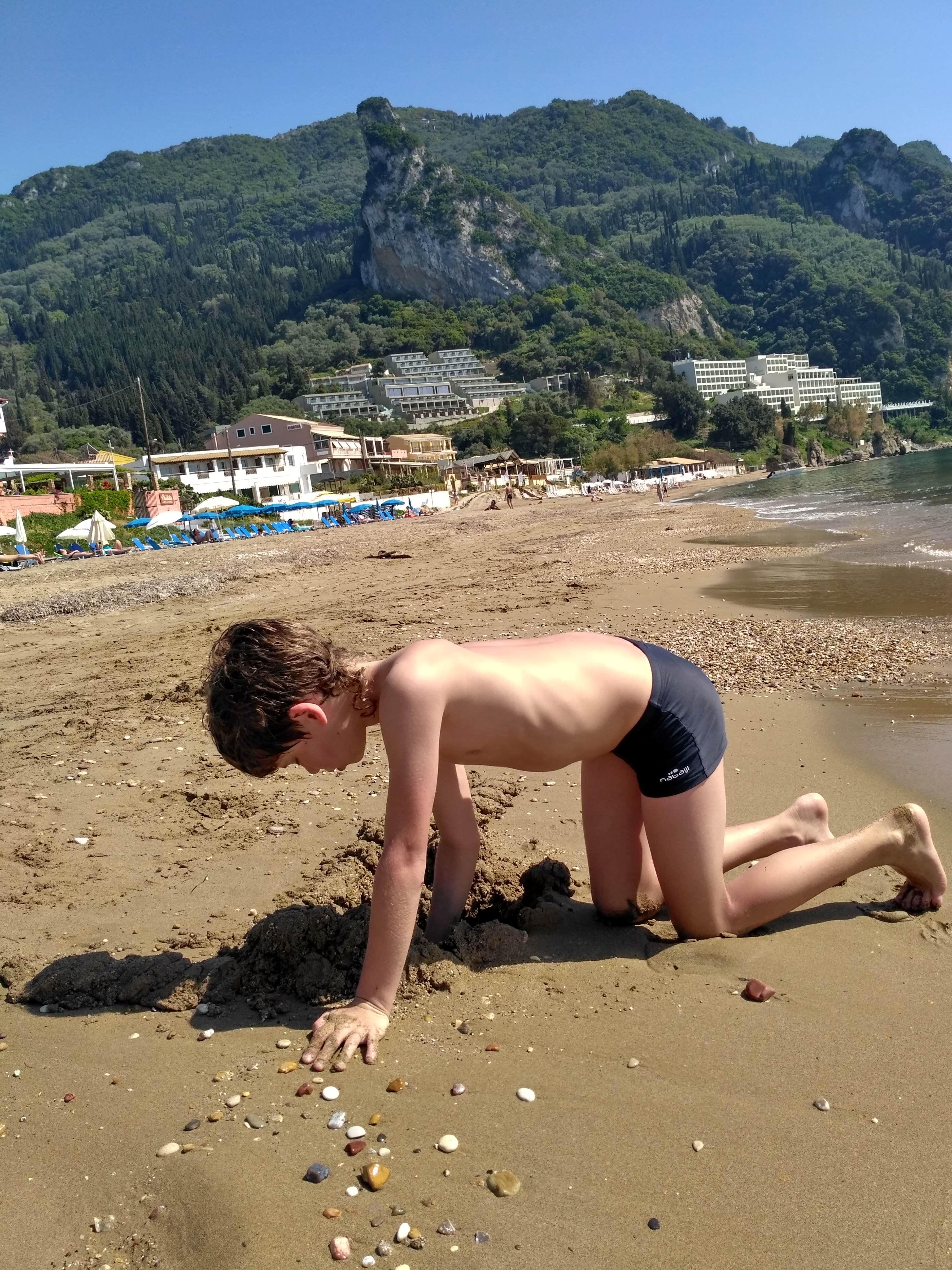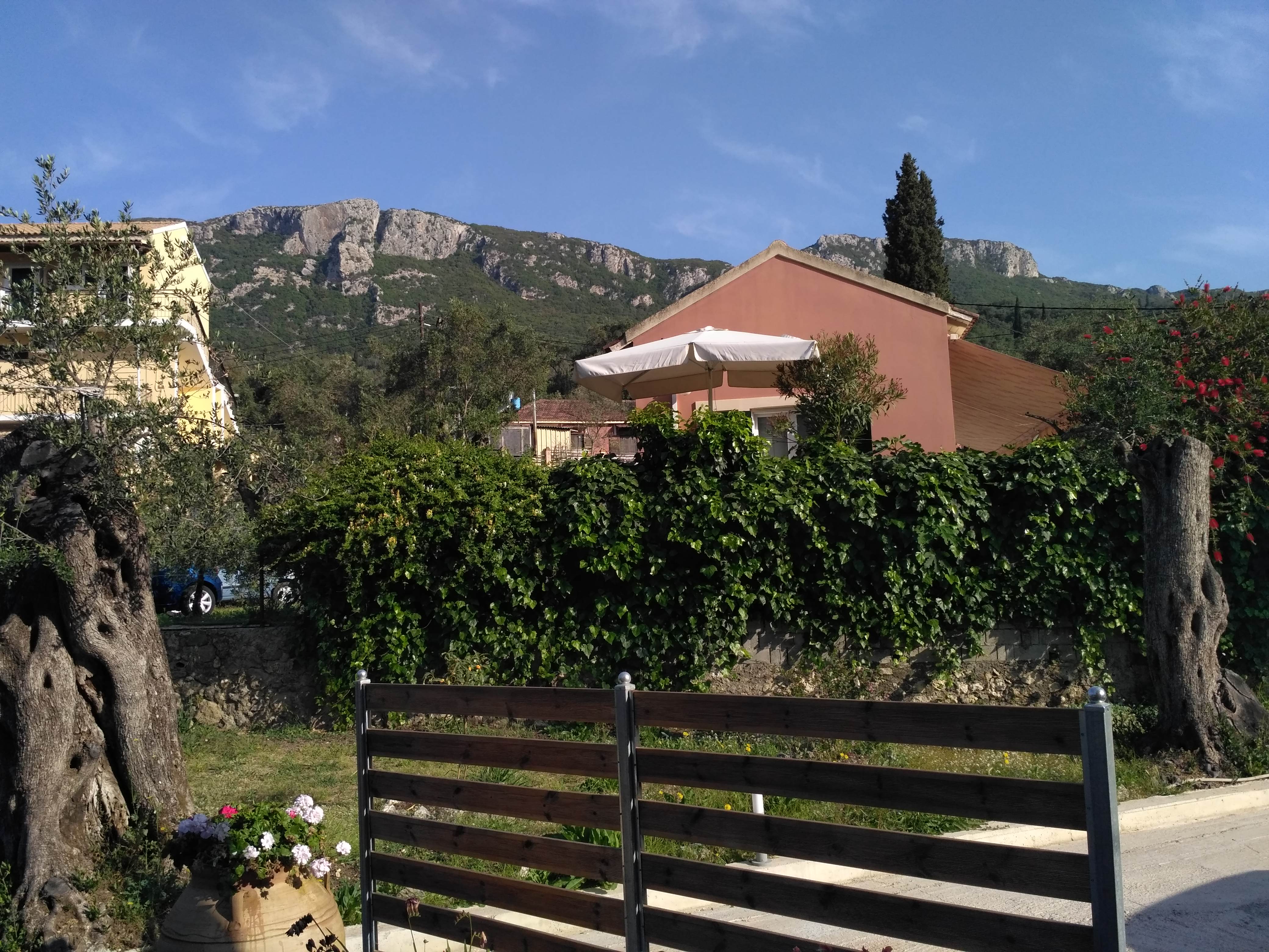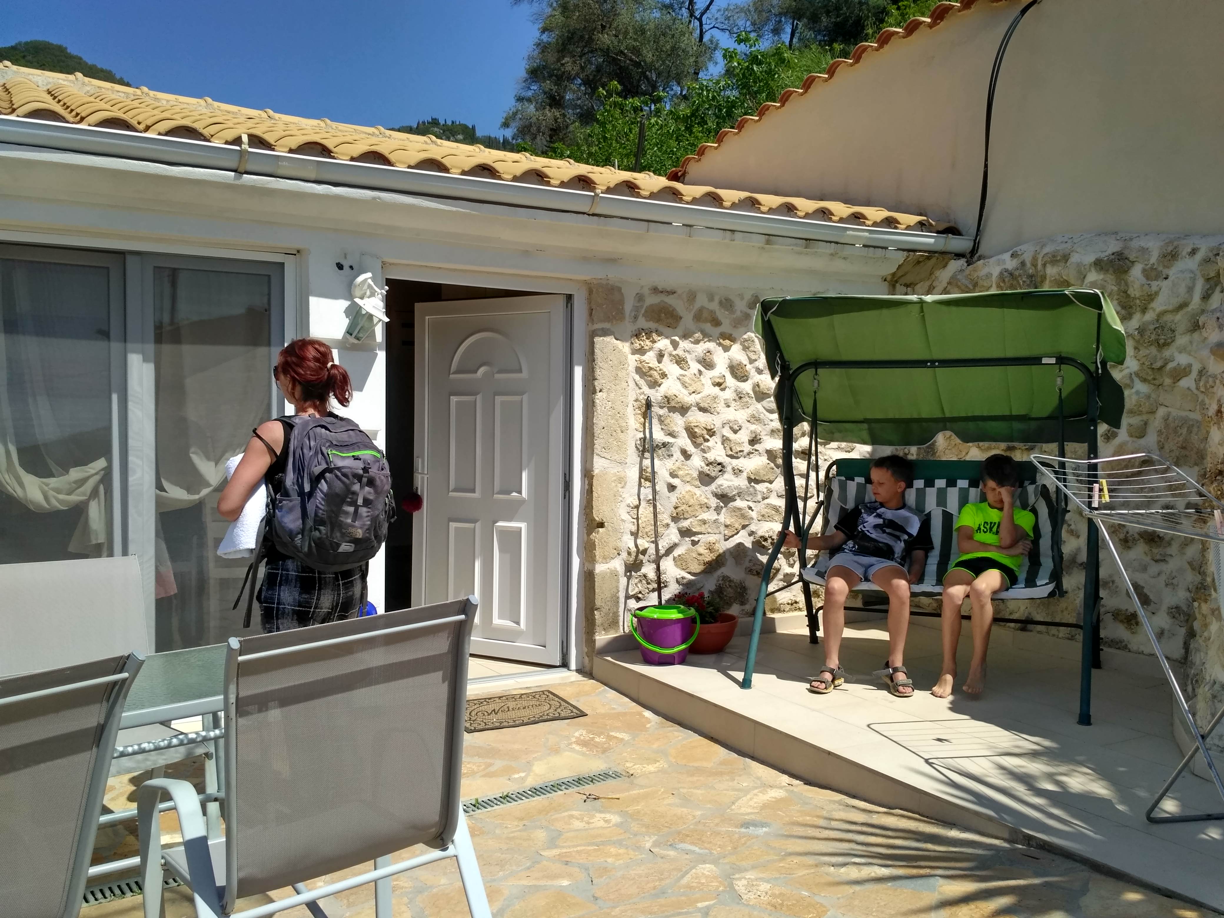 Dalej pojechaliśmy już bezpośrednio do Agios Gordios. Zgodnie z wcześniej wyczytanymi informacjami znajduje się tu duża zatoka i piaszczysta, dość szeroka plaża. Nasz kolejny gospodarz stwierdził, że skoro jest nas piątka nie da nam standardowego apartamentu, a cały nowo wybudowany domek. Cena nie uległa zmianie, a domek jest uroczy, z widokiem na leżące niżej zabudowania i morze. Rozpakowaliśmy się i spacerem poszliśmy na plażę. Zaskoczyła nas wyjątkowo ciepła woda. Najcieplejsza ze wszystkich dotychczas odwiedzonych przez nas miejsc. Yacool popływał dziś 1,5h i wyszedł bez drgawek z zimna jak wcześniej. Późnym popołudniem wracając do domku wstąpiliśmy na pitę i sałatkę, no i lody.