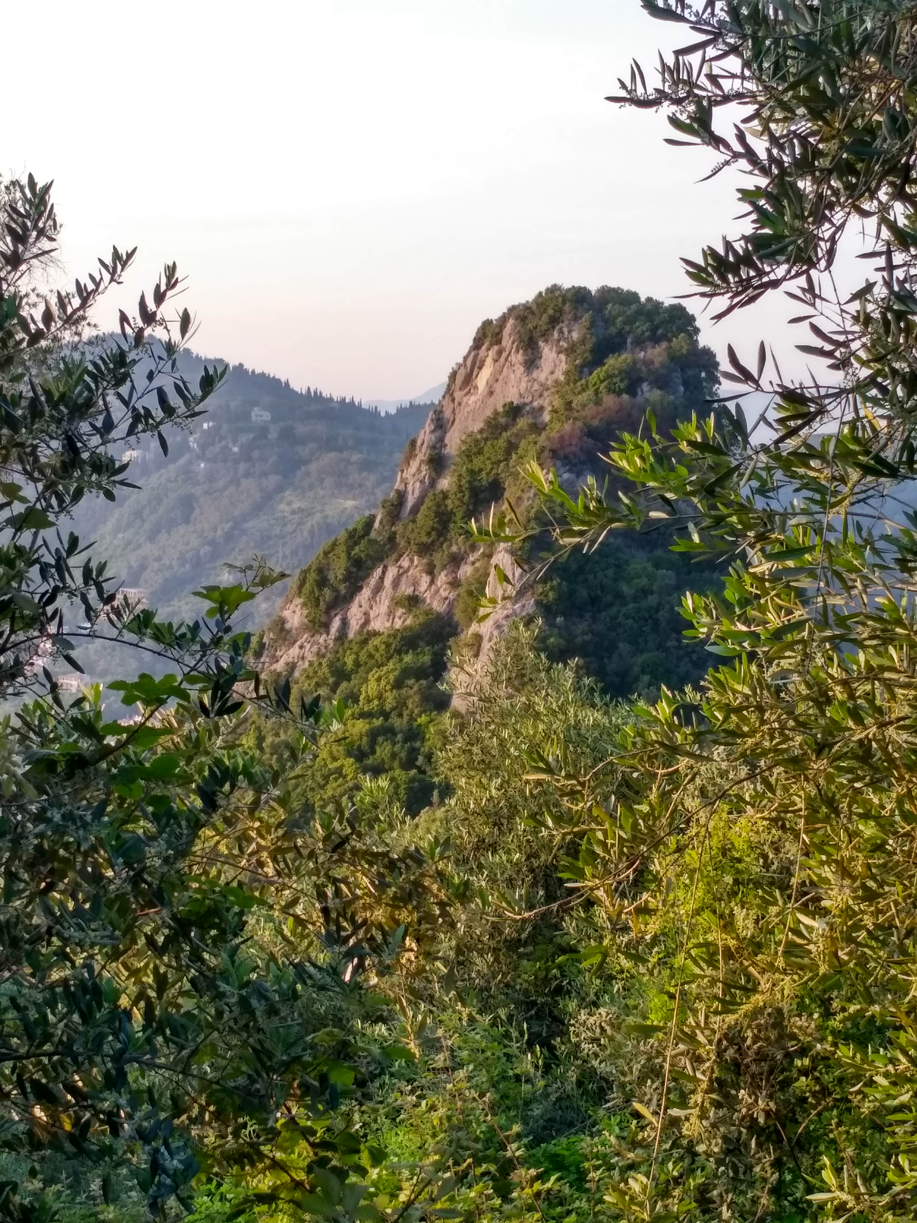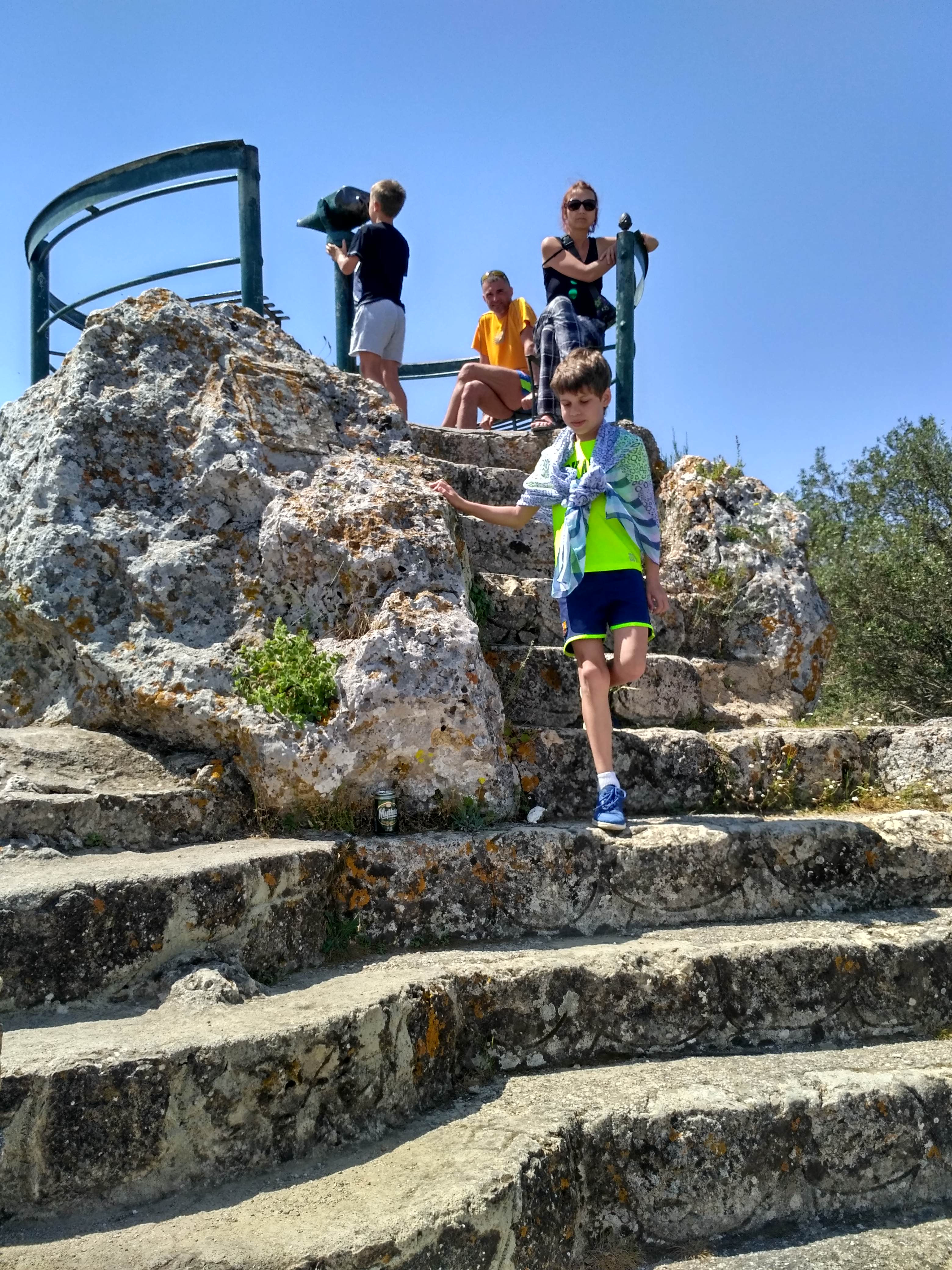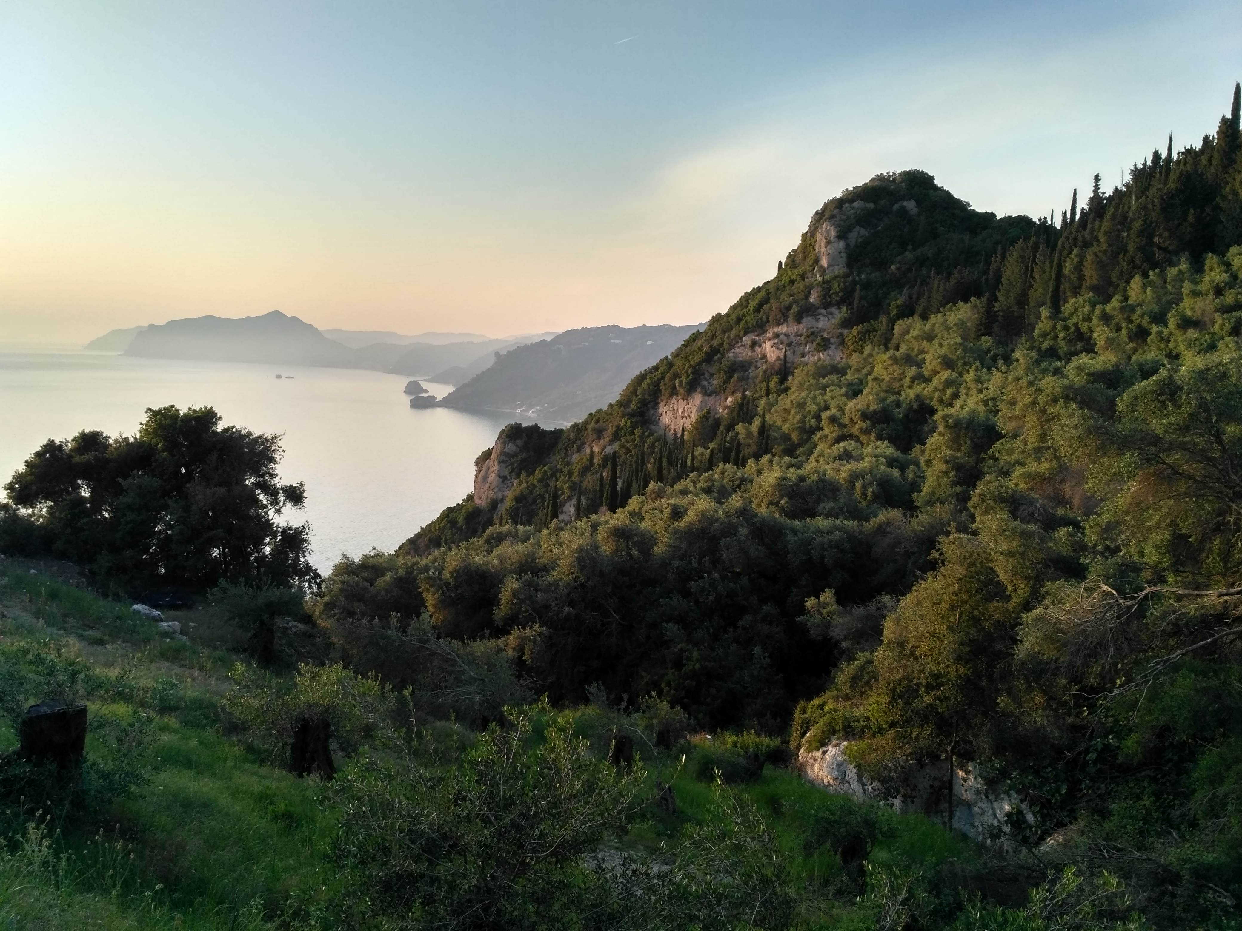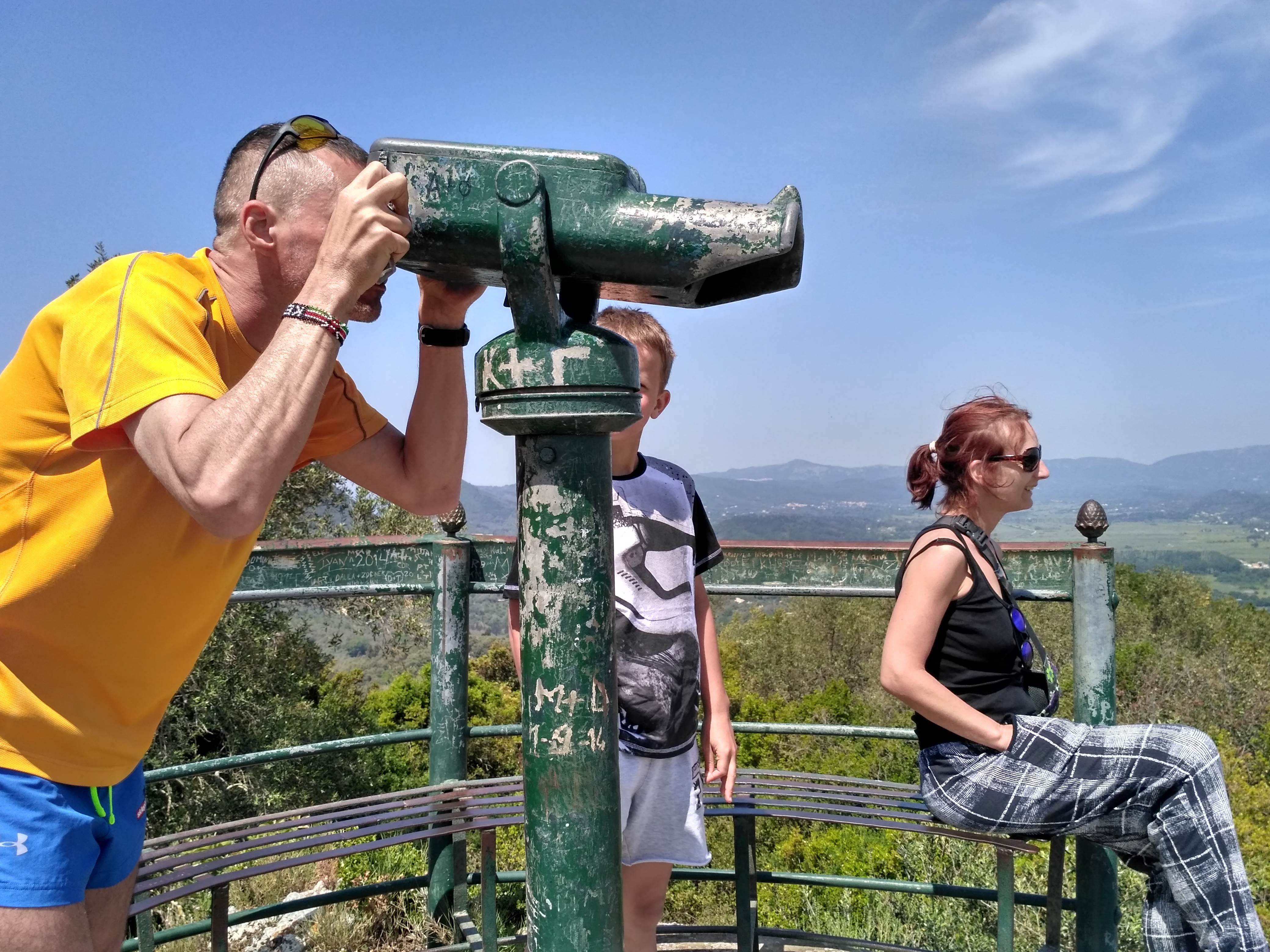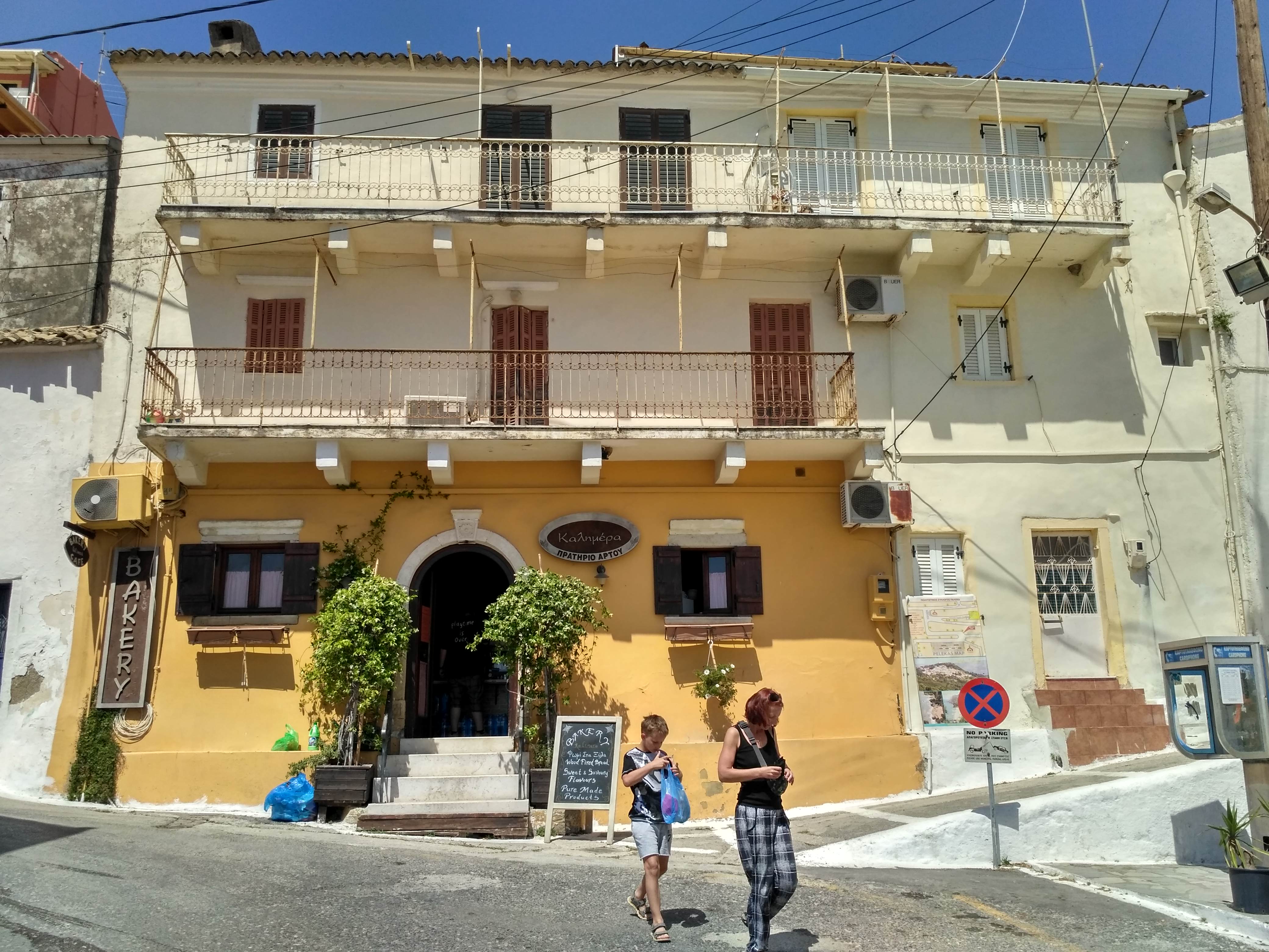 W drodze do naszej kolejnej kwatery zatrzymaliśmy się w miejscowości Pelakes, na zachodzie wyspy. Na jednym ze wzgórz w pobliżu jest punkt widokowy nazywany „tronem cesarza”. Podobno zachody słońca podziwiał z tego miejsca cesarz niemiecki Wilhelm II. Widać stąd między innymi stolicę Korfu, leżącą na wschodzie. Zjeżdżając z góry zahaczyliśmy o lokalną piekarnię. Kupiliśmy kilka lokalnych ciastek, większość strasznie słodka i tłusta.