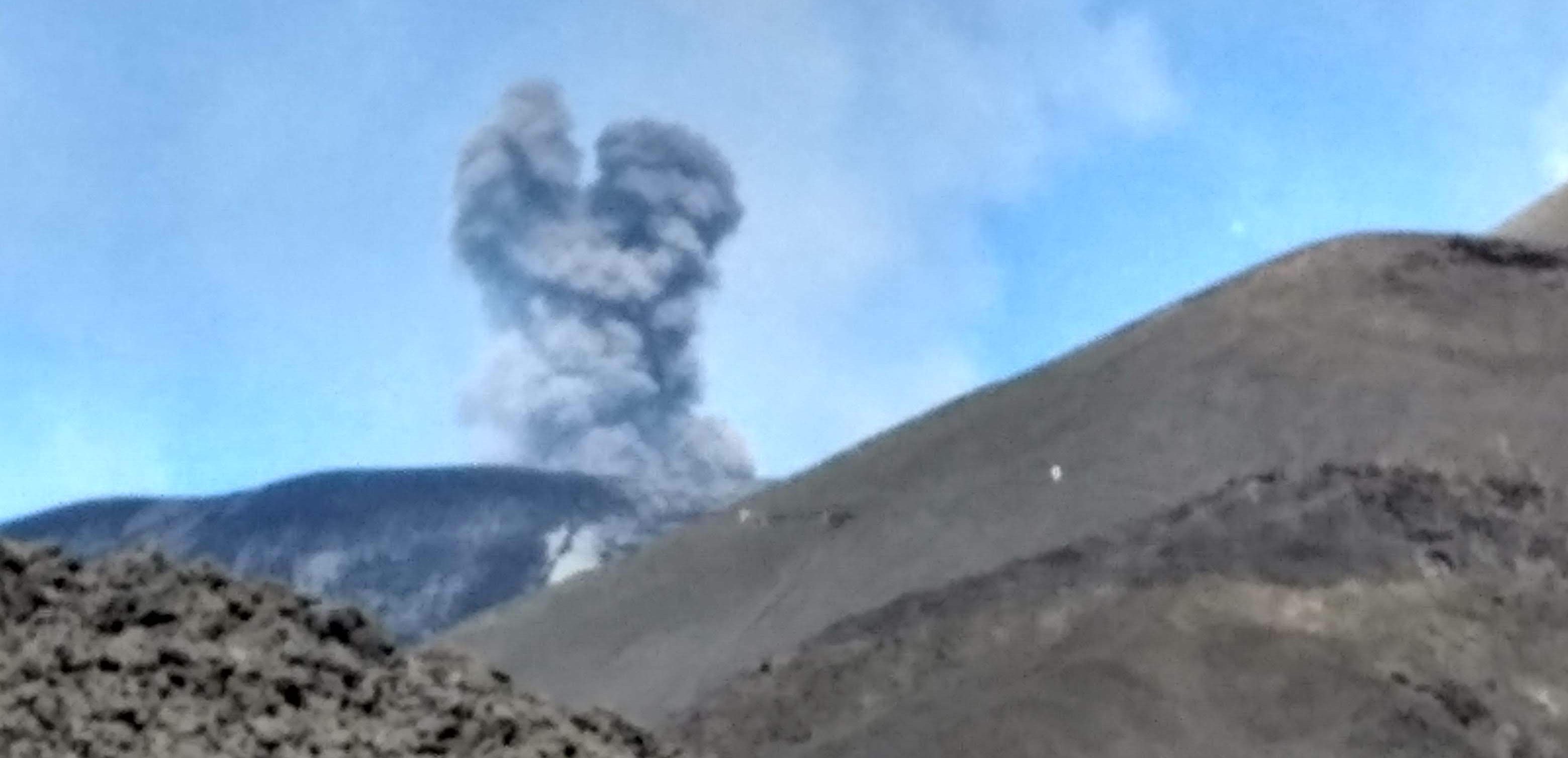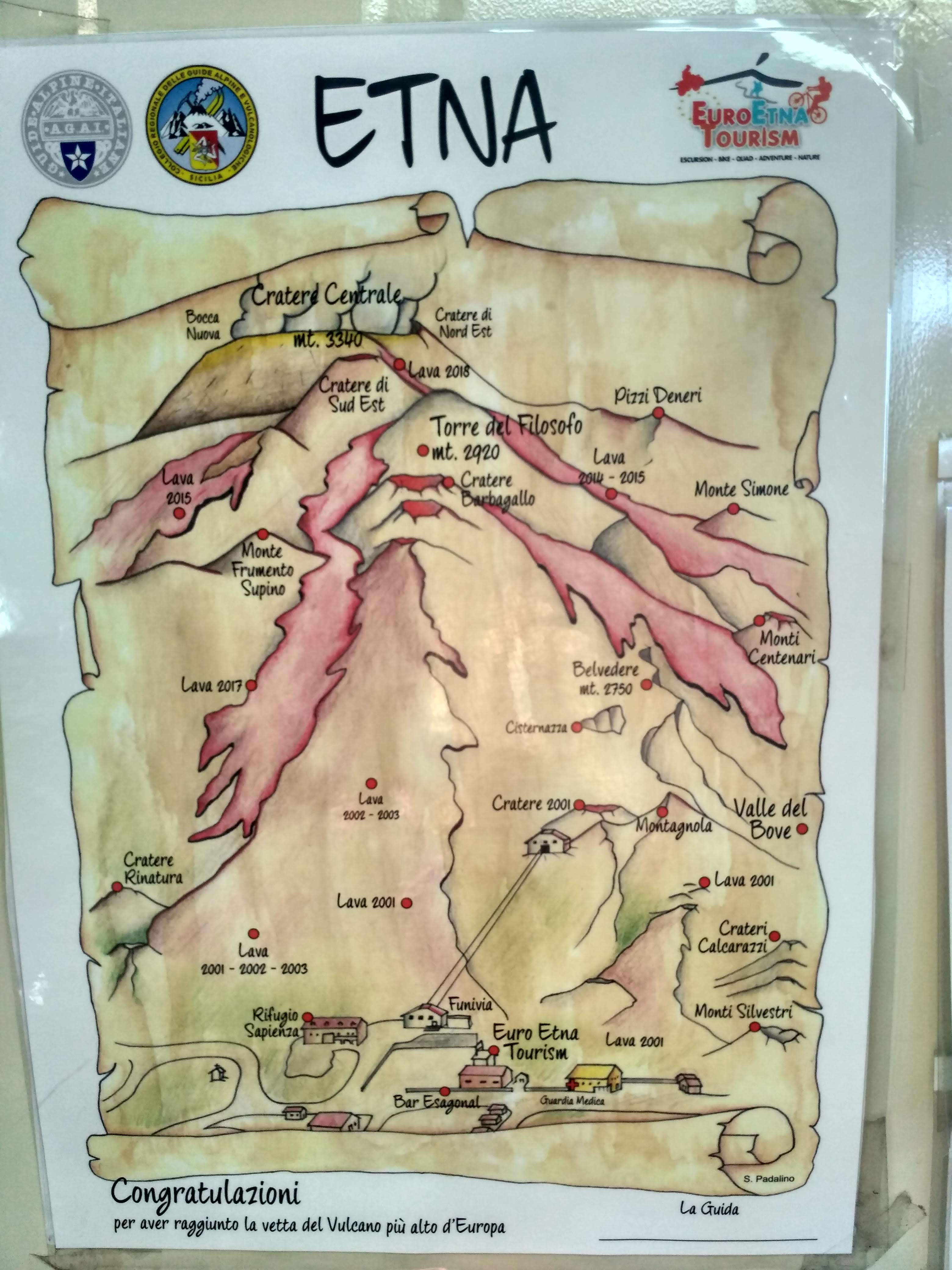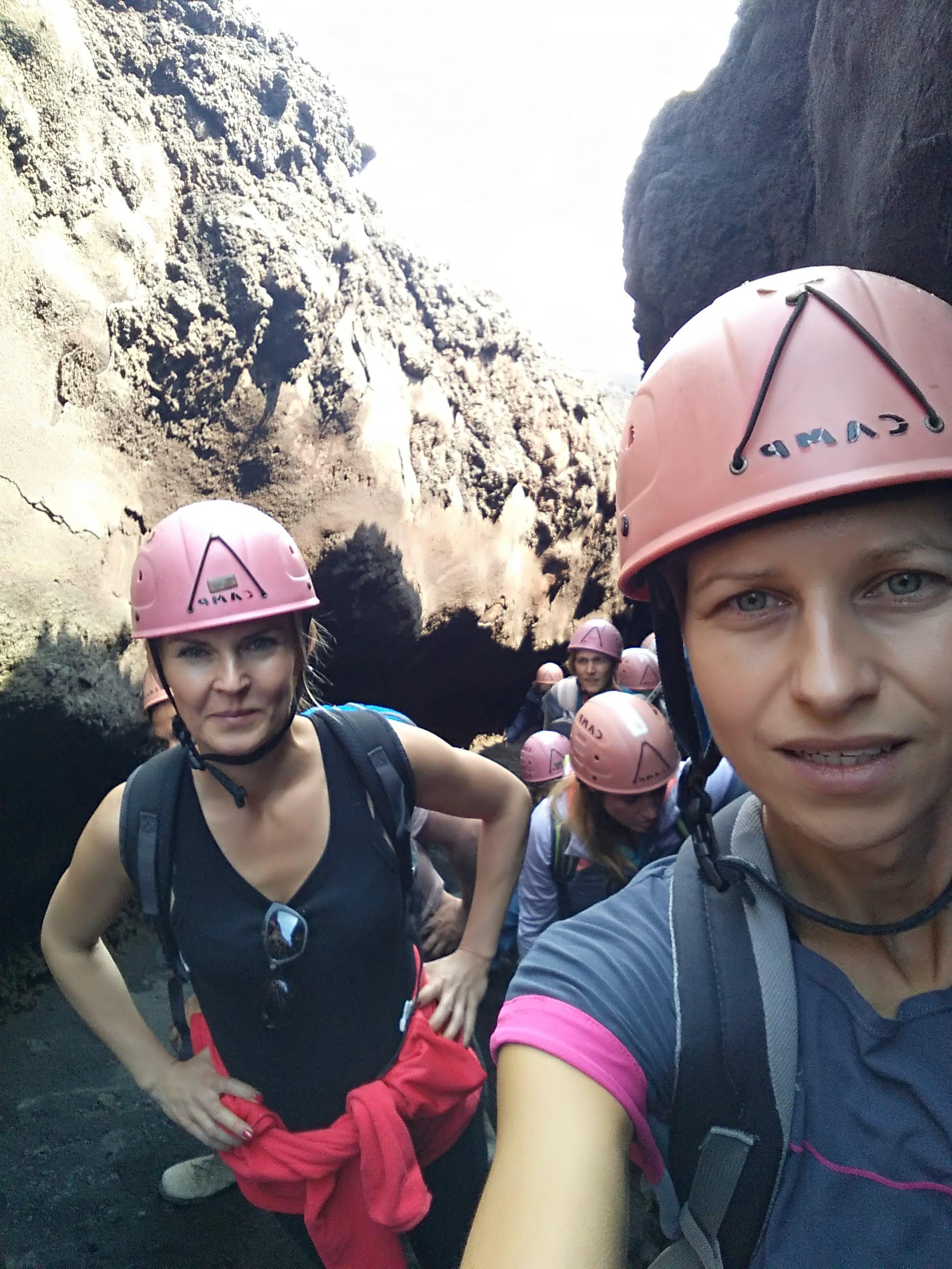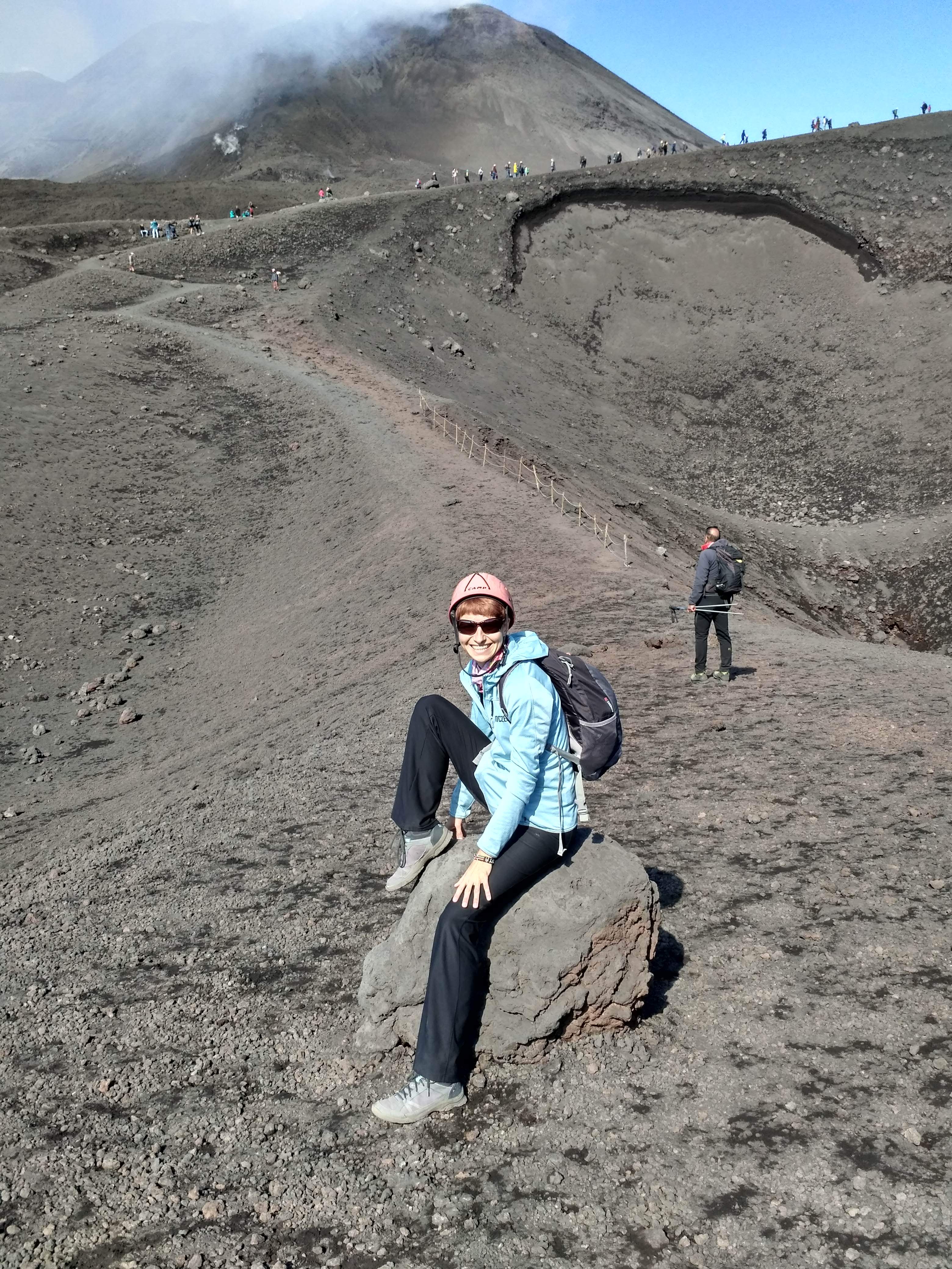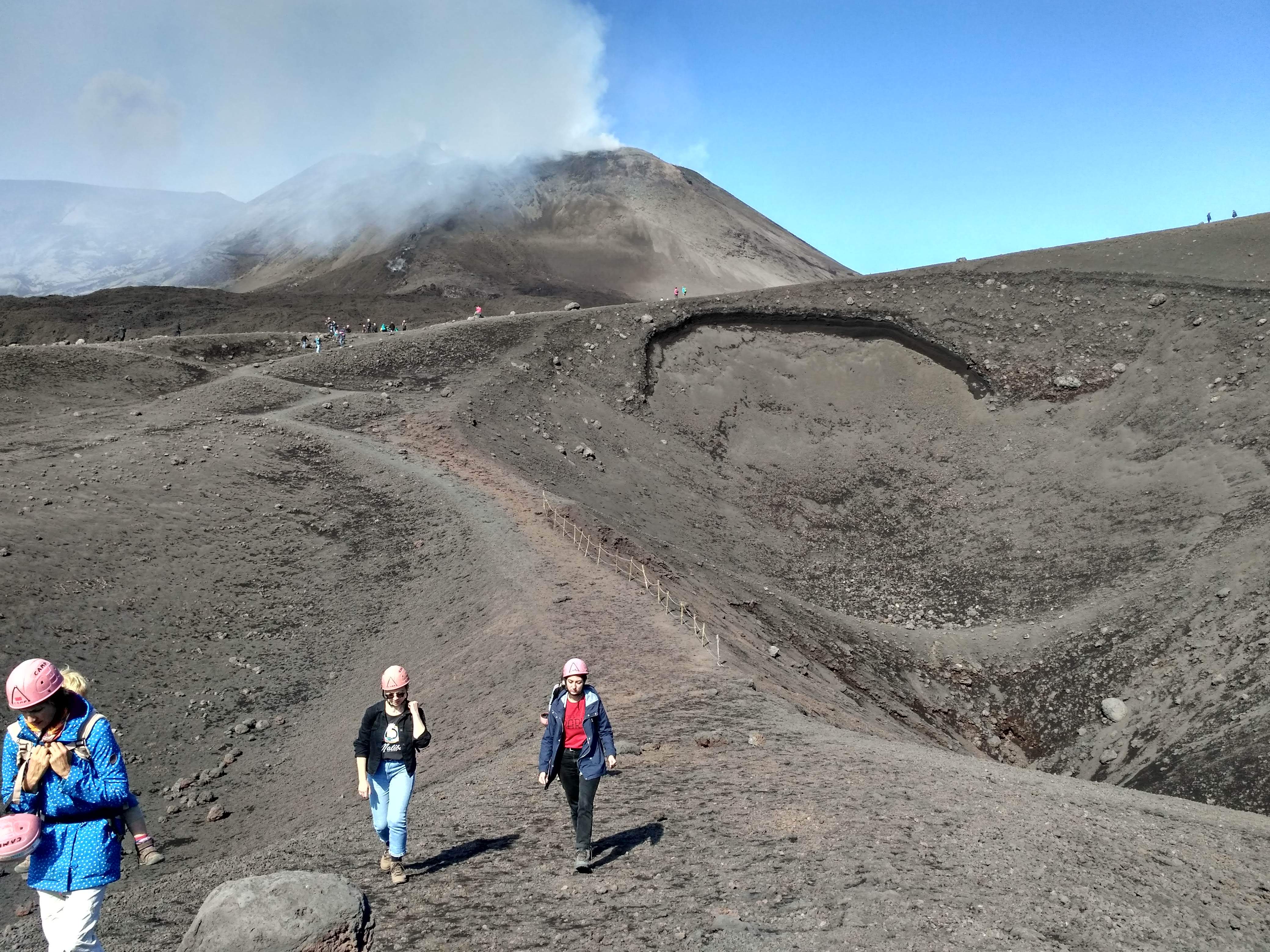 Guide bardzo dużo opowiadał nam o Etnie – czym było podłoże, po którym aktualnie szliśmy i o ostatnich erupcjach. Pokazał nam korytarz, głęboki i szeroki na około 3-4 metry, którym latem płynęła lawa. Lawa miała prędkość płynącej rzeki, ok 2-3 km/h i temperaturę bliską 1000 stopni C. Widziałyśmy także mniejsze kratery, skąd nadal zionął żar, ale które były już nieczynne. Podobno na Etnie jest aż 270 kraterów! Na szczęście miejsce, z którego raz nastąpi wybuch zamyka się raz na zawsze i więcej erupcji z niego już nie będzie. Dlatego najbezpieczniejszym miejscem na wulkanie jest jego wygasły krater. Po około 2 godzinach zatrzymaliśmy się na odpoczynek. Byliśmy na wysokości ok 3 000 m n.p.m. Przy szybkim marszu dało się odczuć niedobór tlenu. W najwyższym punkcie Etna ma wysokość 3 340 m n.p.m. Na sam szczyt wejść nie można, jest to rejon niebezpieczny. Etna cały czas jest czynnym wulkanem. Podczas naszego spaceru następowały małe erupcje w zasadzie co kilkanaście minut. Przewodnicy na bieżąco kontaktowali się z sobą poprzez walkie-talkie. Pytanie czy w przypadku nagłego większego wybuchu zdołalibyśmy szybko oddalić się na bezpieczną odległość…Urządziliśmy sobie mały lunch, a w tle mieliśmy widok na dymiącą Etnę. Problemem był jedynie brak toalet, czy choćby drzewka/ krzaka, za którym można by było zrobić siku.