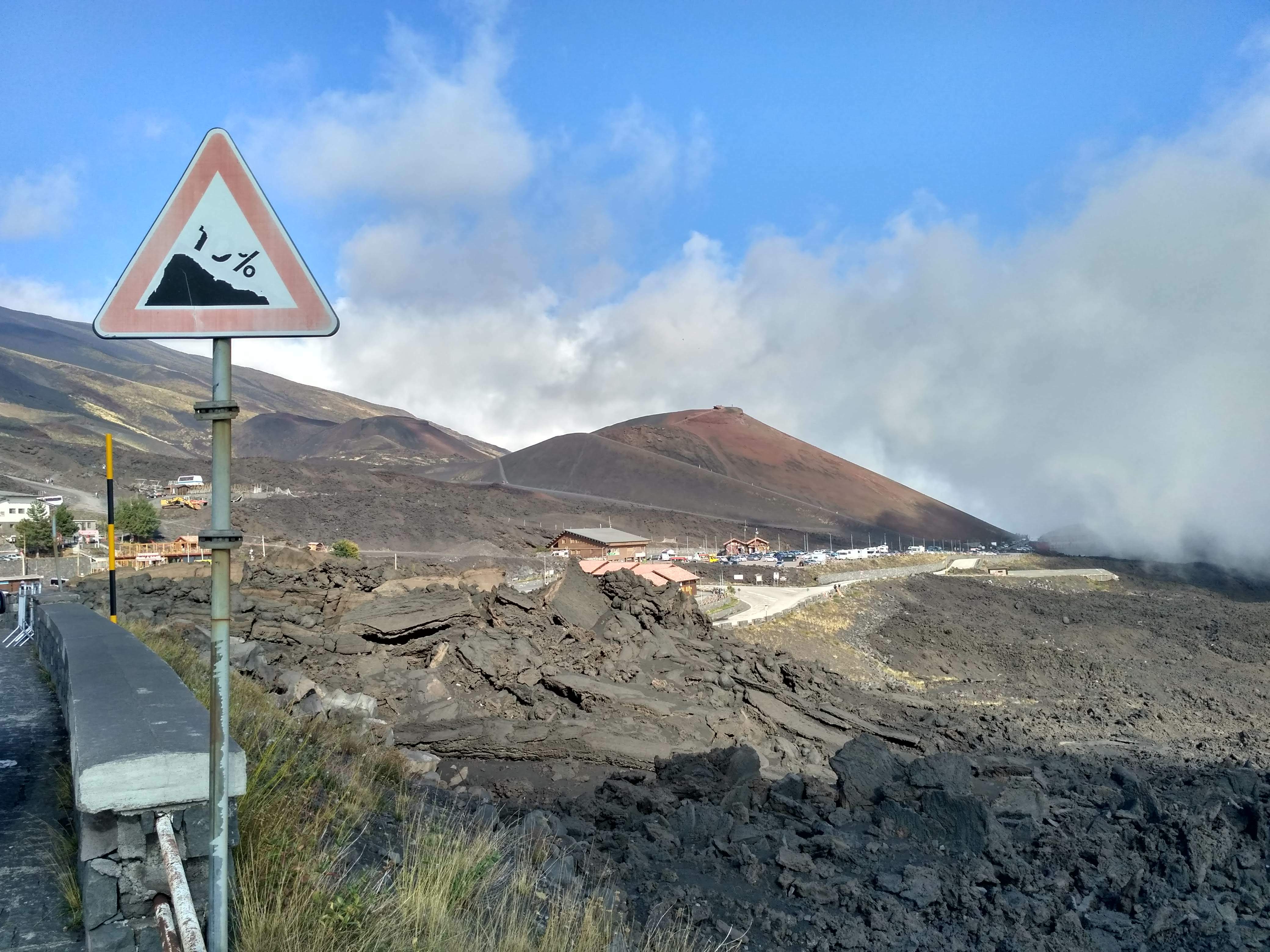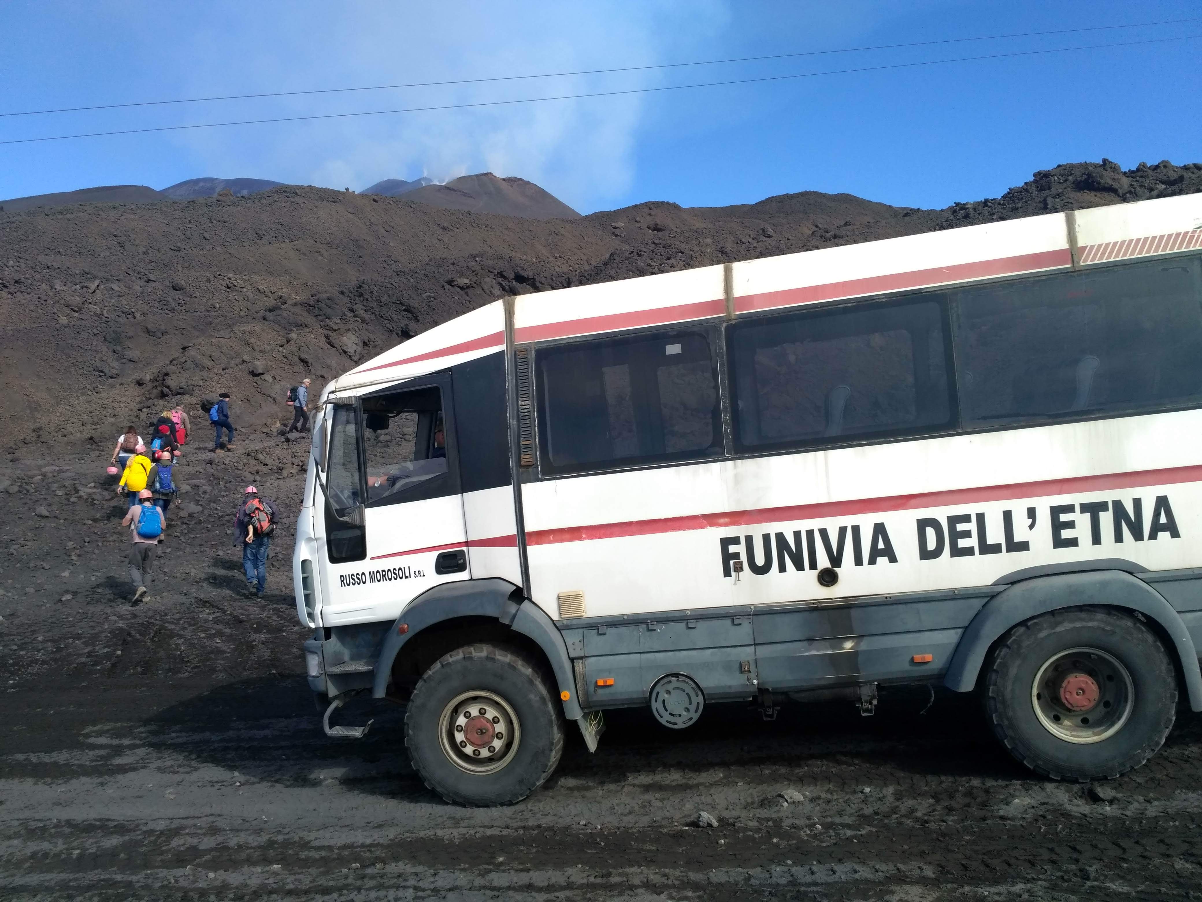 Z samego rana udałyśmy się na Piazza Pappa Giovanni XXIII skąd odjeżdżał autobus na Etnę. Byłyśmy przekonane, że tak jak ostatnio bilet kupimy u kierowcy. Do stojącego na przystanku autobusu ustawiła się już długa kolejka turystów. Autobus odjeżdża na Etnę tylko raz dziennie. Spanikowałyśmy, gdy okazało się, że bilet należy kupić w kasie. Niestety takowej nigdzie nie było w zasięgu wzroku. W końcu ktoś wskazał nam uliczkę odchodzącą od placu, gdzie w mało oznakowanym lokalu mieściła się kasa tego przewoźnika. Kupiłyśmy bilet w dwie strony i biegam wróciłyśmy na przystanek. Na szczęście okazało się, że były podstawione dwa autobusy. Zajęłyśmy więc miejsca i po chwili ruszyłyśmy. Podróż trwa ok 2 godzin. Autobus po wyjechaniu z Katanii pnie się pod górę stromymi serpentynami. Drzewa z czasem ustępują krzewom, a potem krajobraz staje się istnie księżycowy.