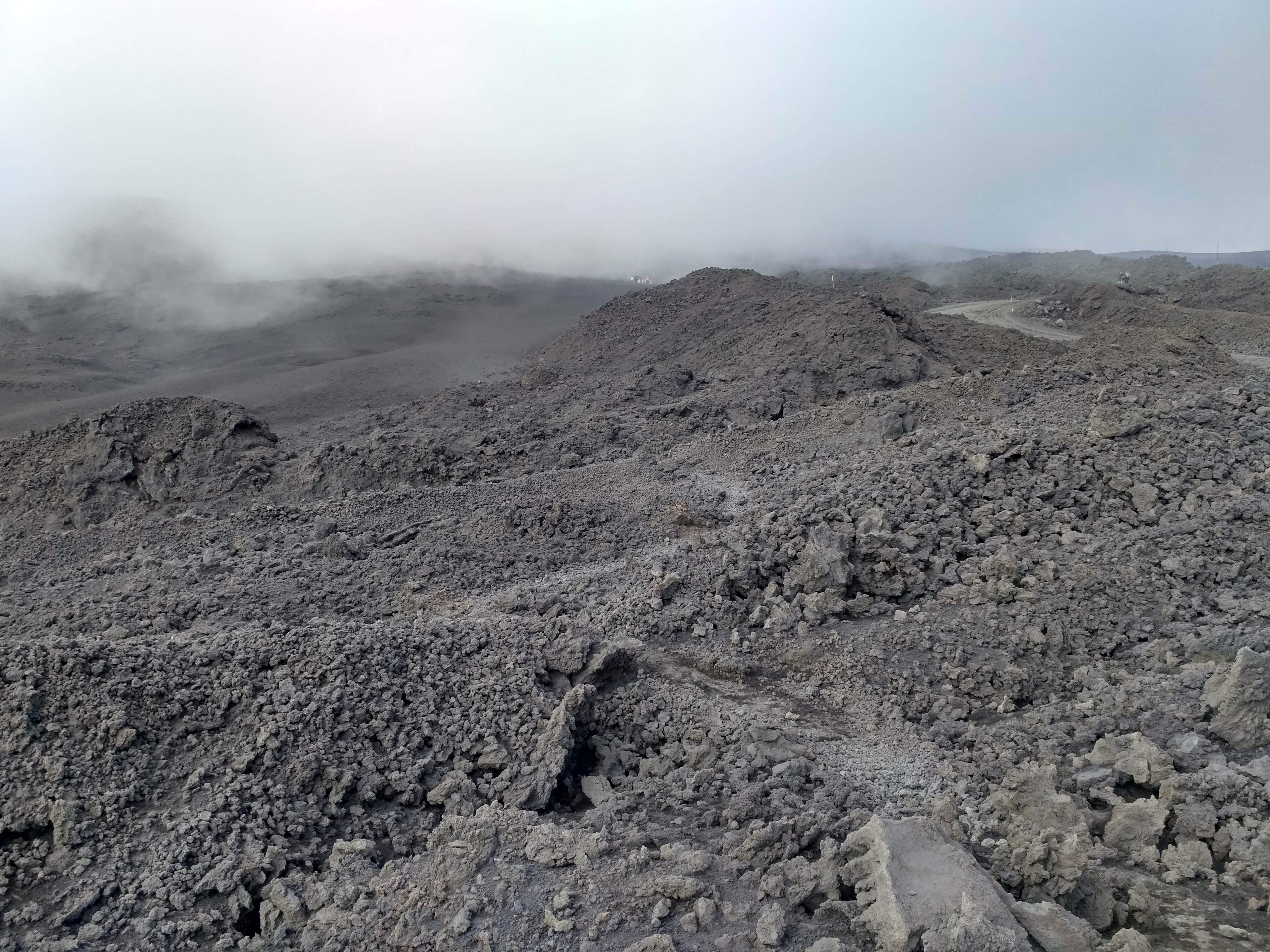 Po chwili podjechał po nas mniejszy busik, którym osoby zdeklarowane na wycieczkę z przewodnikiem zostały przewiezione na inny parking. Mieściła się tu mała budka, w której należało podpisać oświadczenie i zapłacić. Każdy z uczestników dostał kask, dodatkowo osoby, które nie miały górskiego obuwia obowiązkowo musiały założyć buty organizatora. Były to używane buty za kostkę/ trapery, do których dostałyśmy po parze nowych skarpet. Później w sumie ucieszyłyśmy się z tego rozwiązania, bo nasze sportowe buty z pewnością mocno by ucierpiały, a dodatkowo byłoby to ryzykowne dla kostek. Nasza grupa licząca kilkanaście osób dostała swojego przewodnika, który kilkukrotnie nas policzył po czym udaliśmy się wszyscy do kolejki wyciągu. Stacja początkowa kolejki znajduje się na wysokości 1900 m n.p.m. Początkowo miałyśmy ochotę wspinać się na piechotę do wysokości 2500 m n.p.m. i tam zacząć właściwe oglądanie wulkanu. Ale zorganizowana wycieczka nie przewidywała takiej opcji. Z perspektywy czasu myślę, że to dobrze. Z okien wagonika widziałam mozolnie pnących się pod górę pojedynczych ludzi. Trasa nie jest łatwa, bo idzie się po usypującym się spod nóg żwirze i piasku wulkanicznym. Do tego jest się poniżej poziomu chmur i nie ma widoku na szczyt Etny.