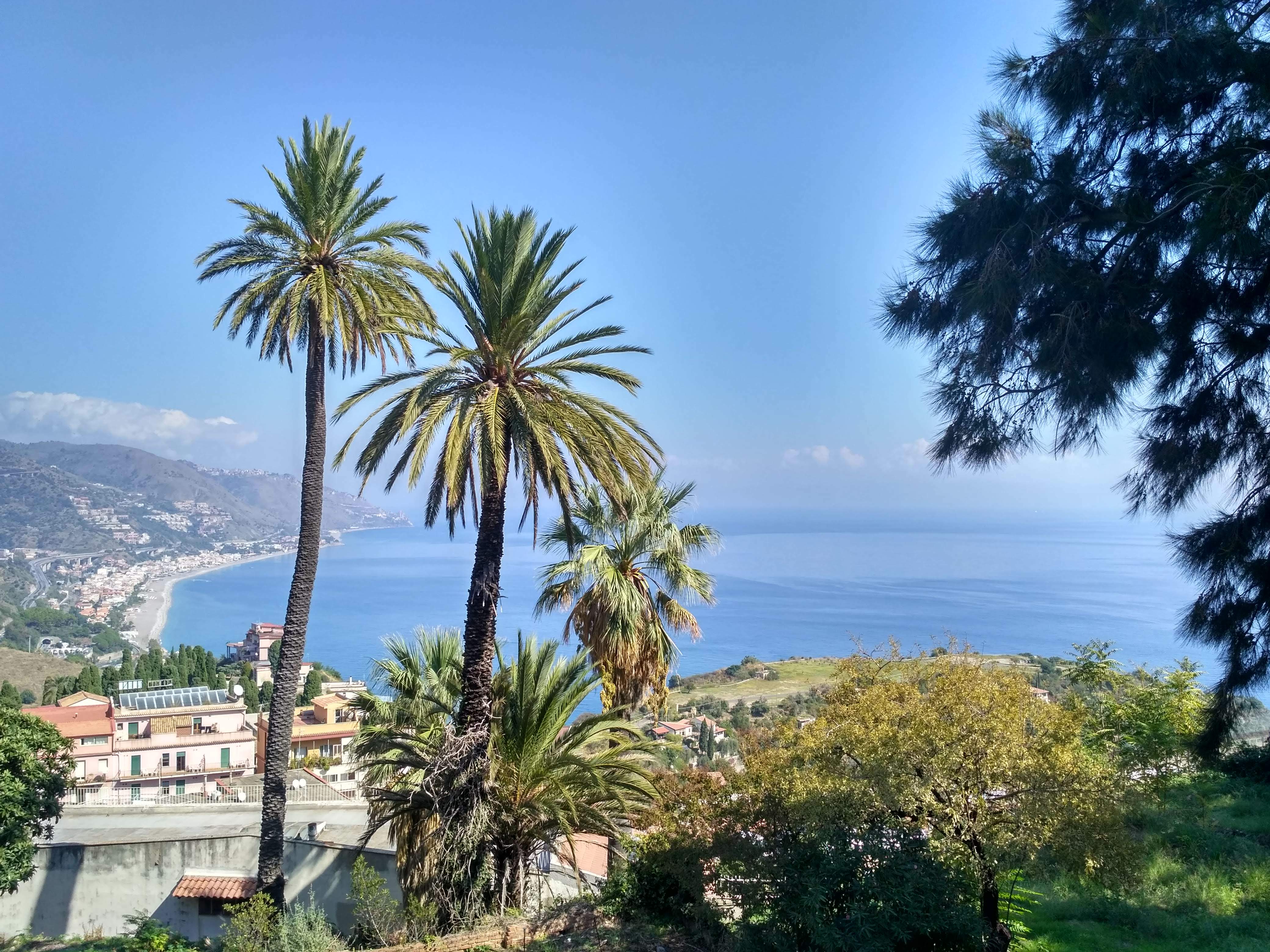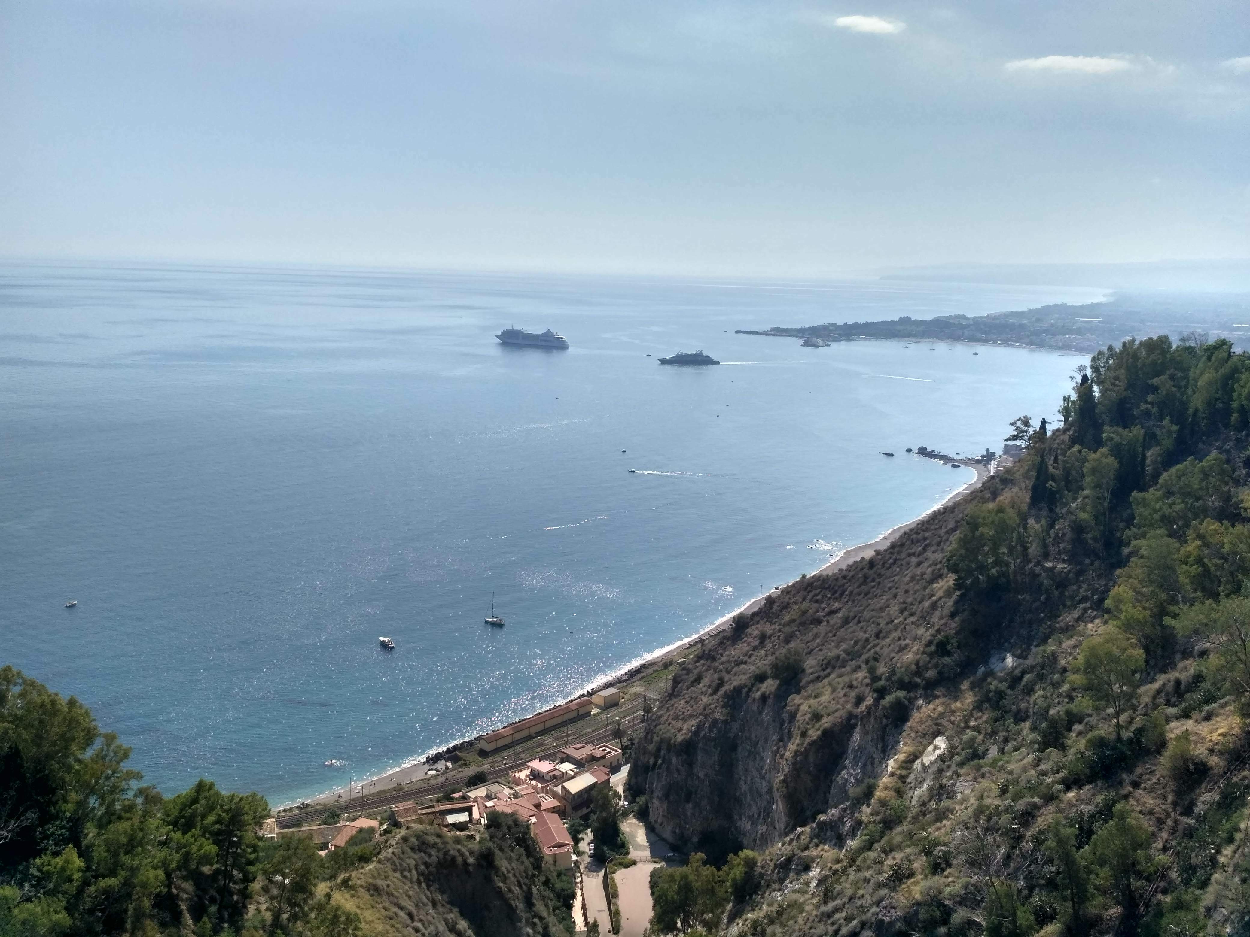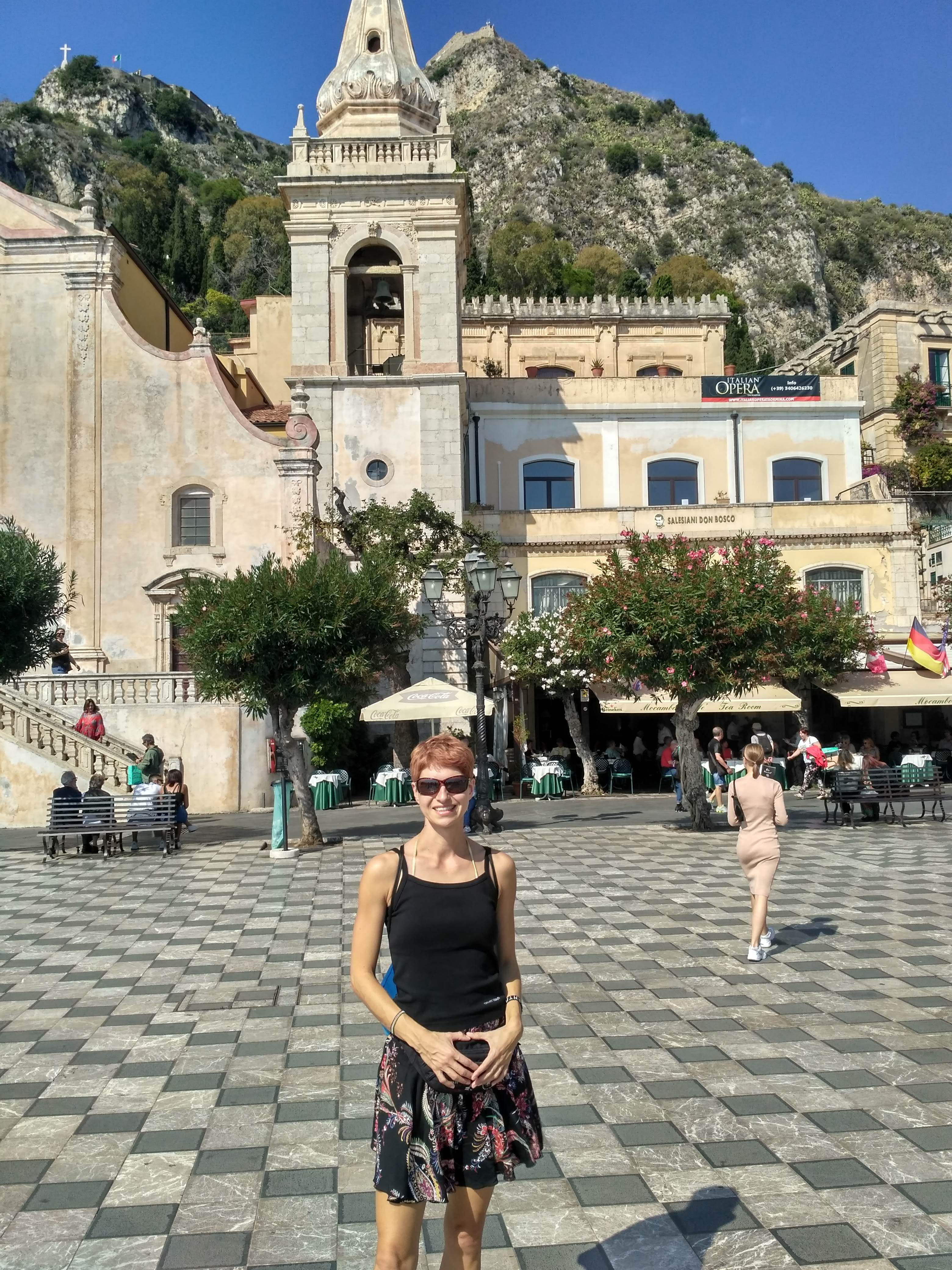 Ostatnim punktem naszego citybreak na Sycylii była Taormina. To nieduże miasteczko położone około godziny jazdy na północ od Katanii. Słynie z malowniczych uliczek, pięknych widoków na zatokę i dwóch niedużych plaż. Tam również dotarłyśmy bezpośrednim autobusem za niecałe 9 EUR/ w dwie strony. Problem miałyśmy ponownie ze znalezieniem budki, gdzie można by było kupić bilety. Bo tu także nie było opcji kupienia biletu u kierowcy, ani nie było punktu ich sprzedaży na sporym placu, stanowiącym zajezdnię. Swoją drogą miejsce to było otoczone betonowym murem i nigdzie nie dojrzałyśmy informacji, że mieszczą się tu przystanki autobusów rejsowych. Wydaje mi się, że Sycylijczycy nie przywiązują zbyt dużej wagi do czytelnych informacji turystycznych.