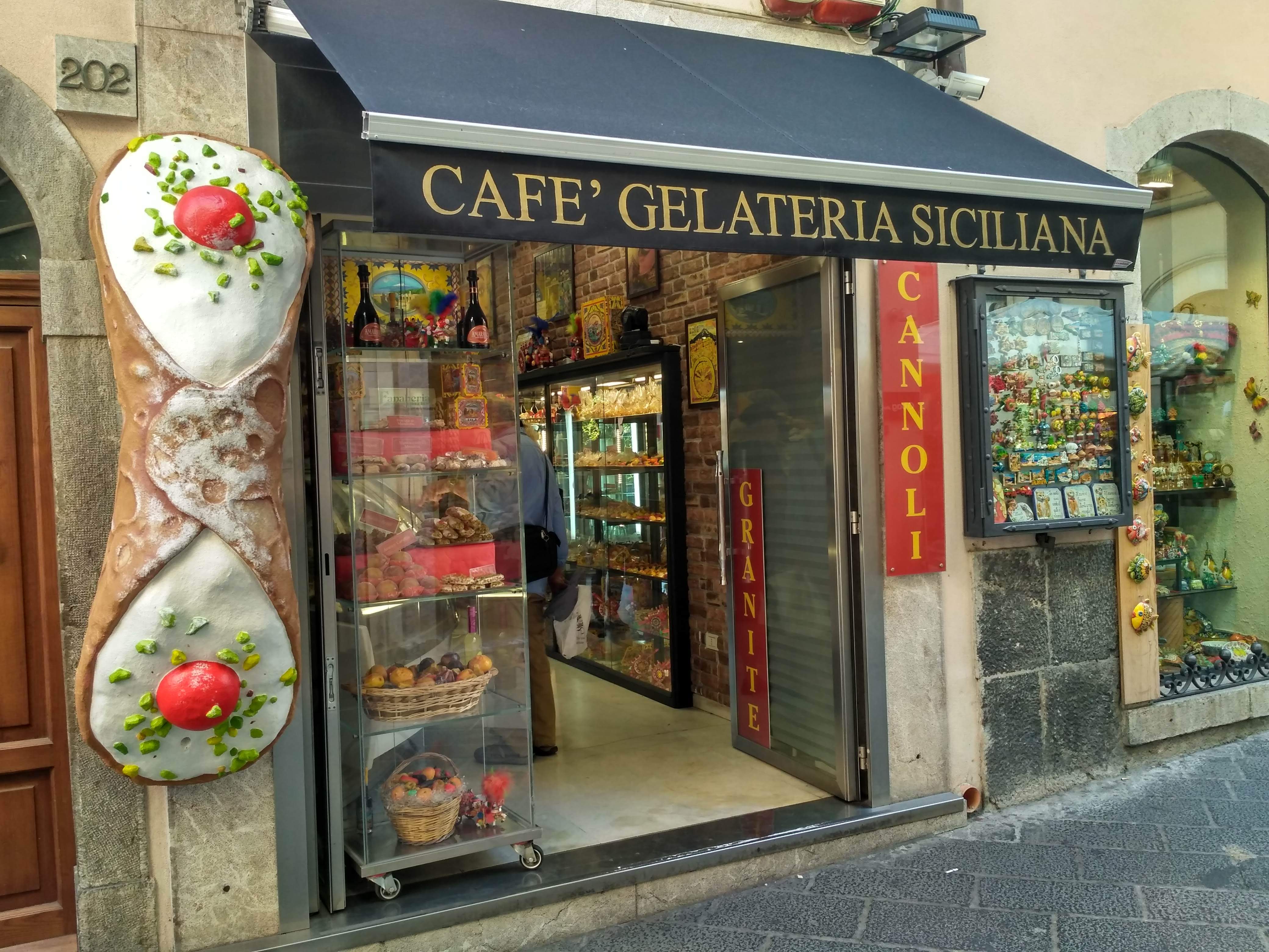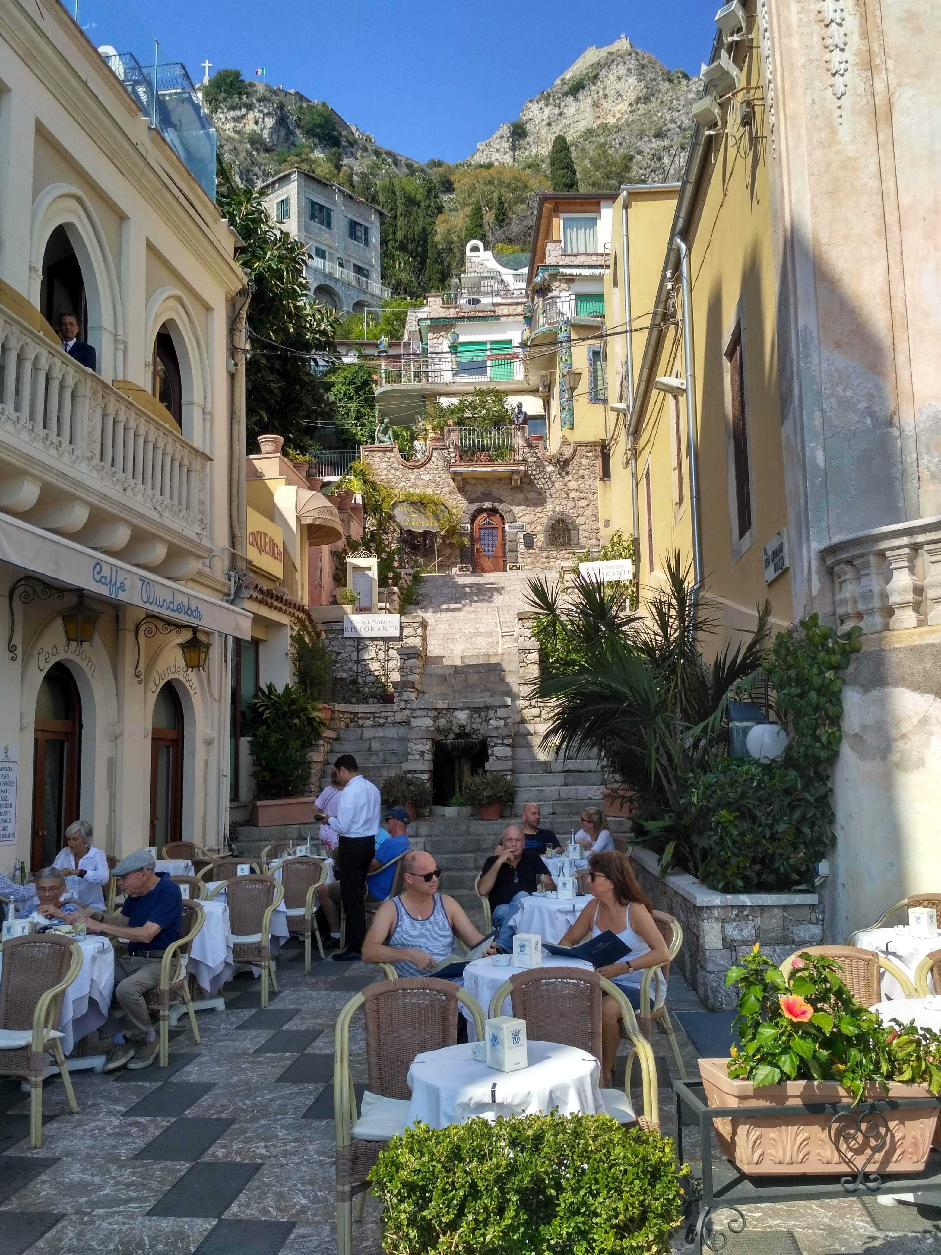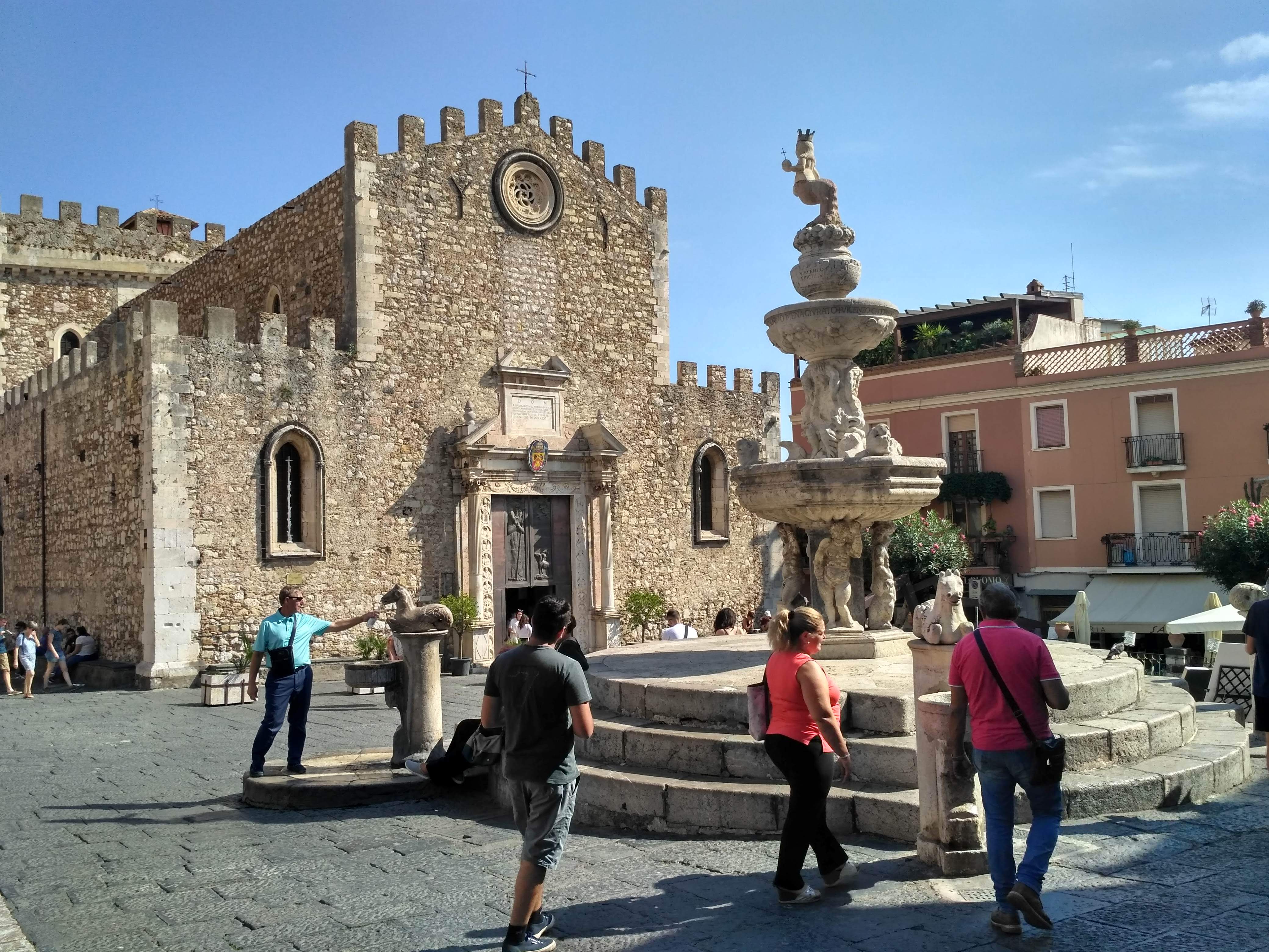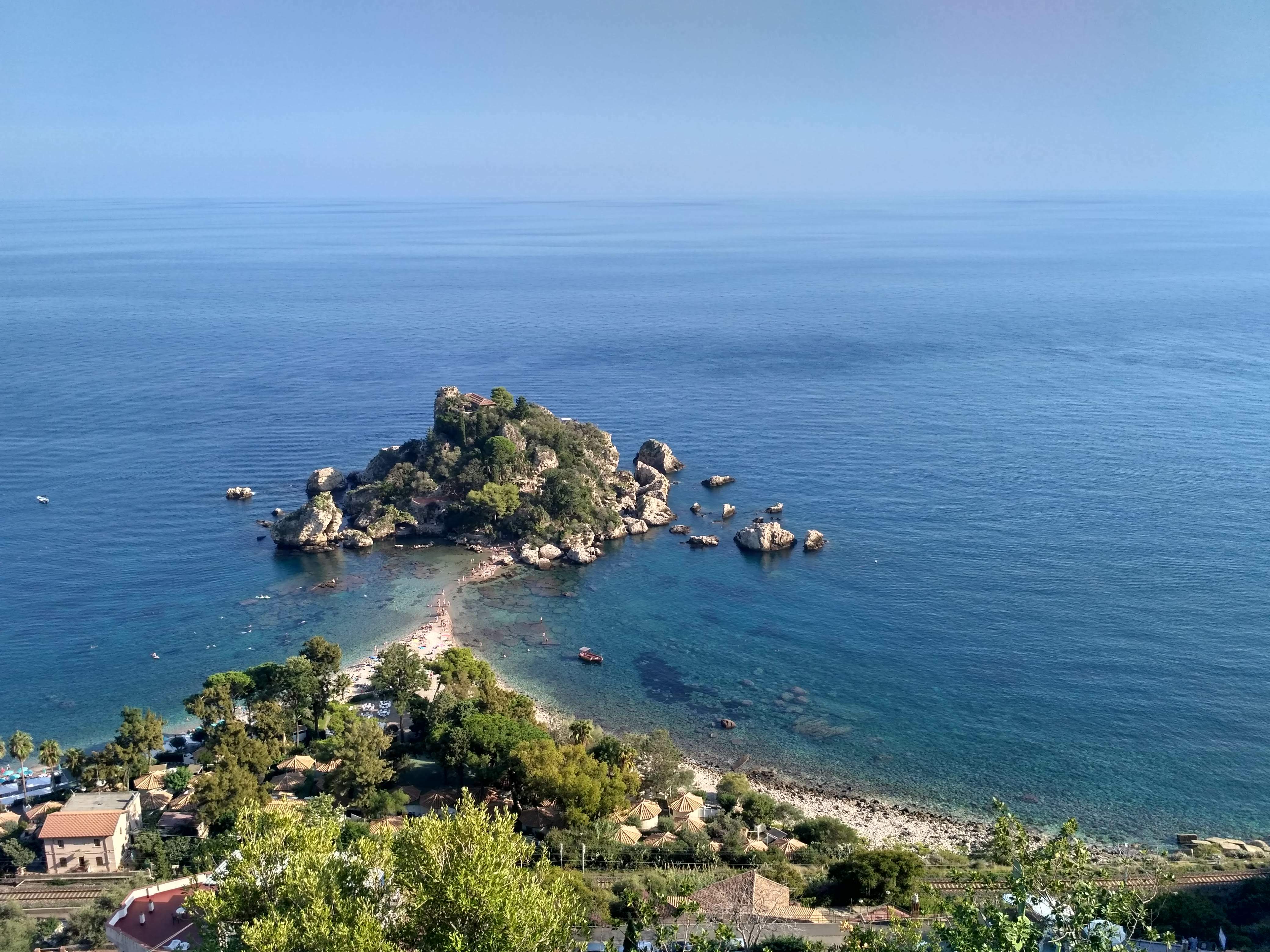 Ostatnim punktem naszego citybreak na Sycylii była Taormina. To nieduże miasteczko położone około godziny jazdy na północ od Katanii. Słynie z malowniczych uliczek, pięknych widoków na zatokę i dwóch niedużych plaż. Tam również dotarłyśmy bezpośrednim autobusem za niecałe 9 EUR/ w dwie strony. Problem miałyśmy ponownie ze znalezieniem budki, gdzie można by było kupić bilety. Bo tu także nie było opcji kupienia biletu u kierowcy, ani nie było punktu ich sprzedaży na sporym placu, stanowiącym zajezdnię. Swoją drogą miejsce to było otoczone betonowym murem i nigdzie nie dojrzałyśmy informacji, że mieszczą się tu przystanki autobusów rejsowych. Wydaje mi się, że Sycylijczycy nie przywiązują zbyt dużej wagi do czytelnych informacji turystycznych.